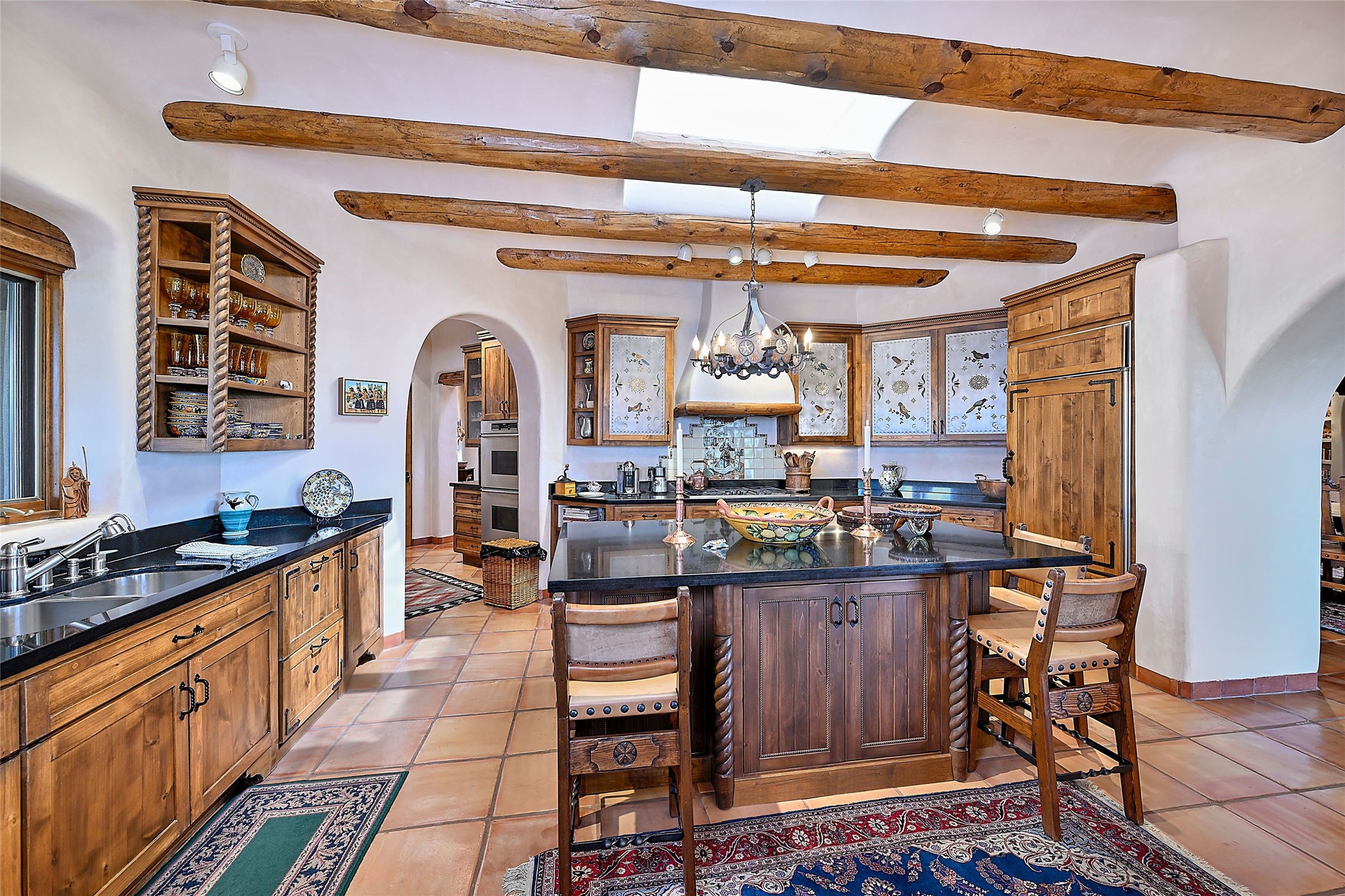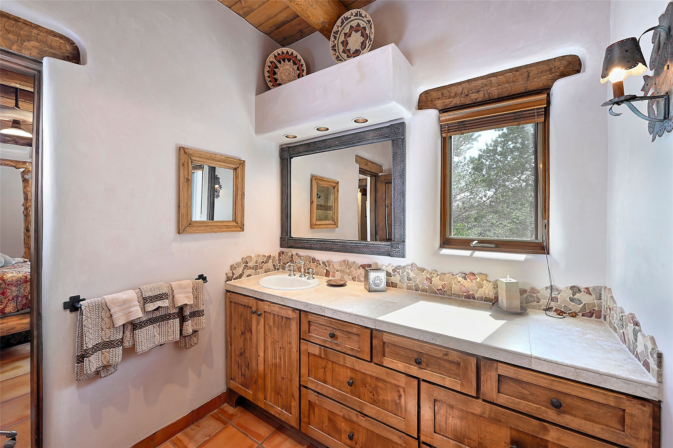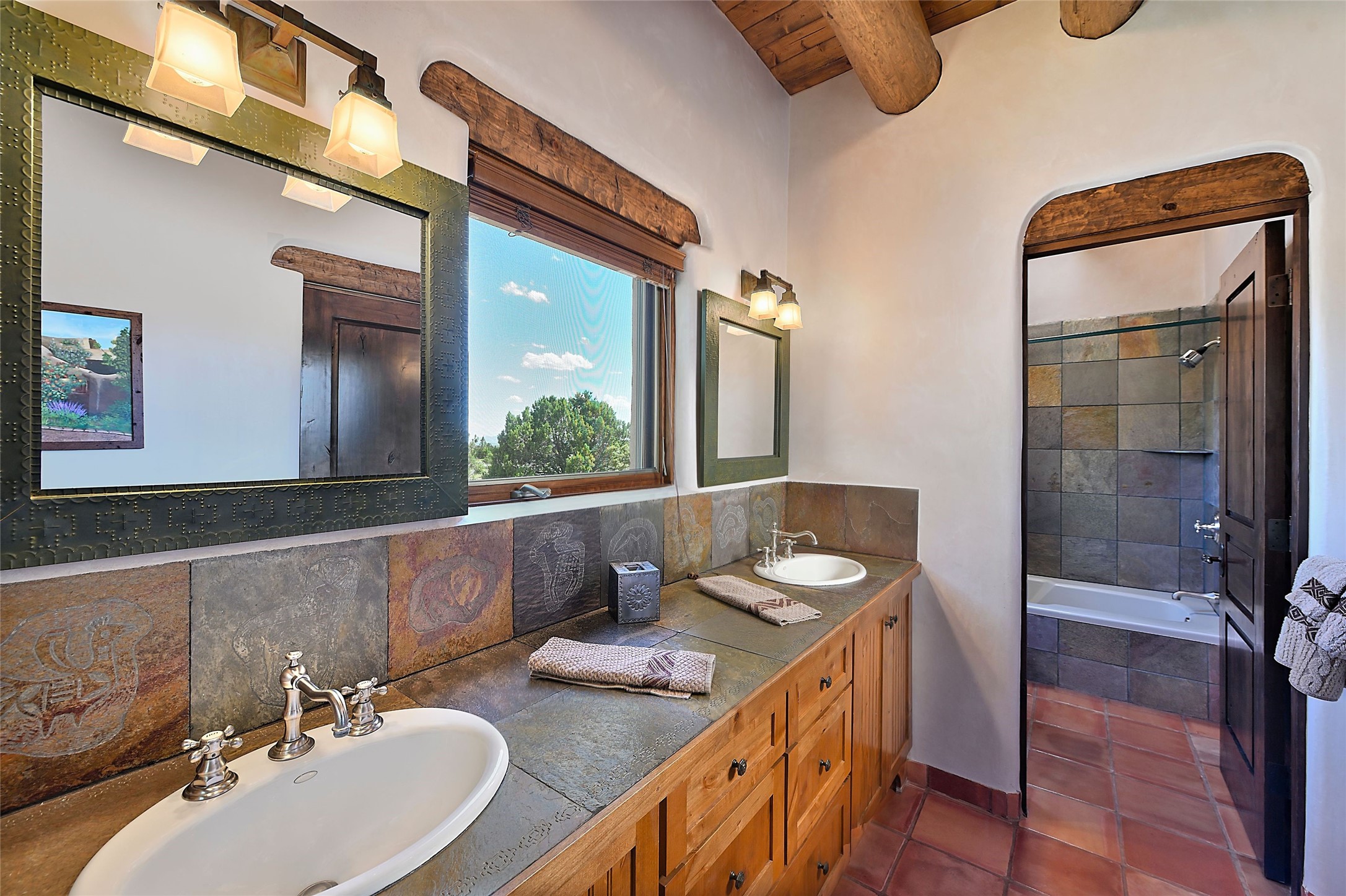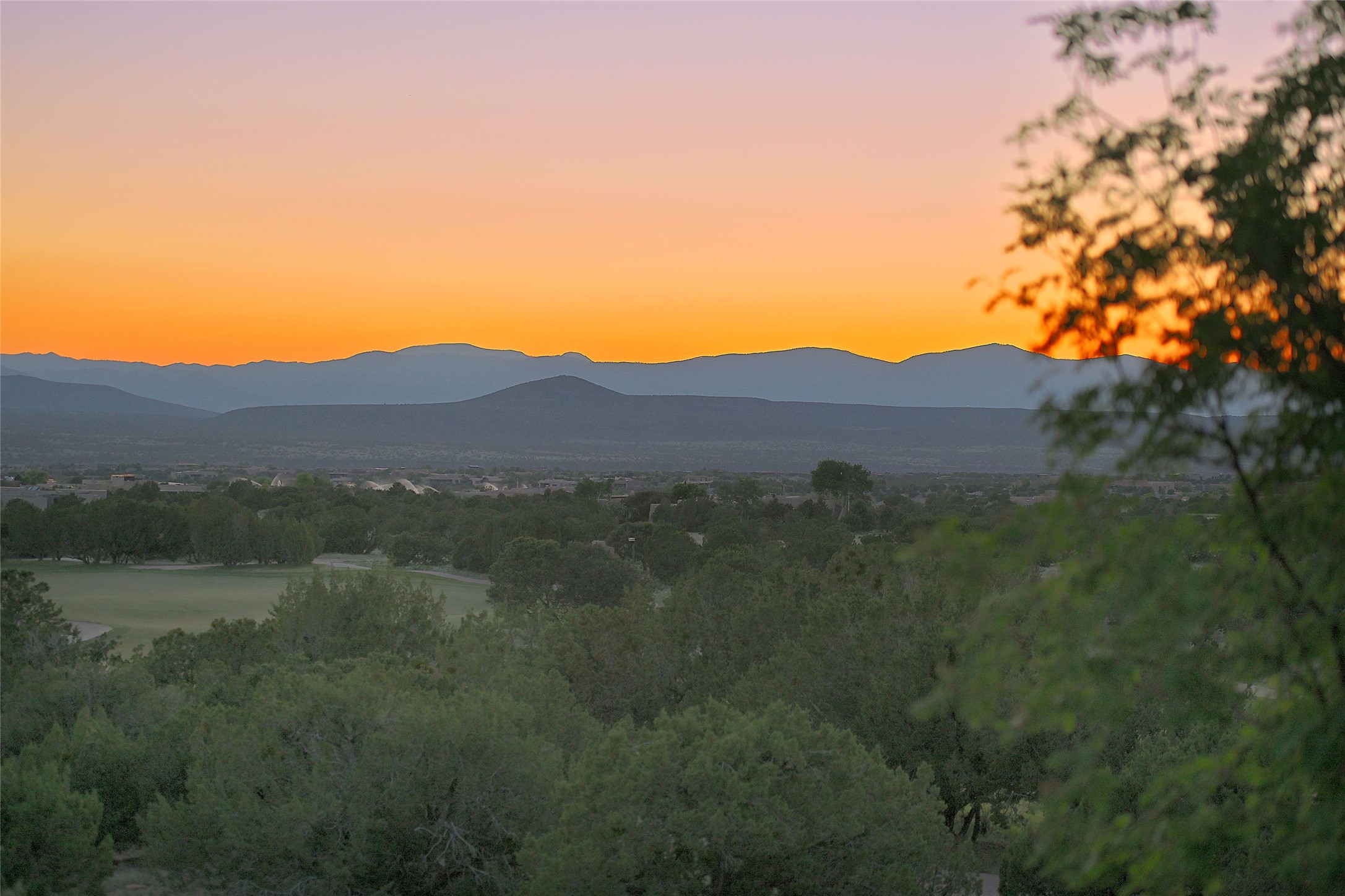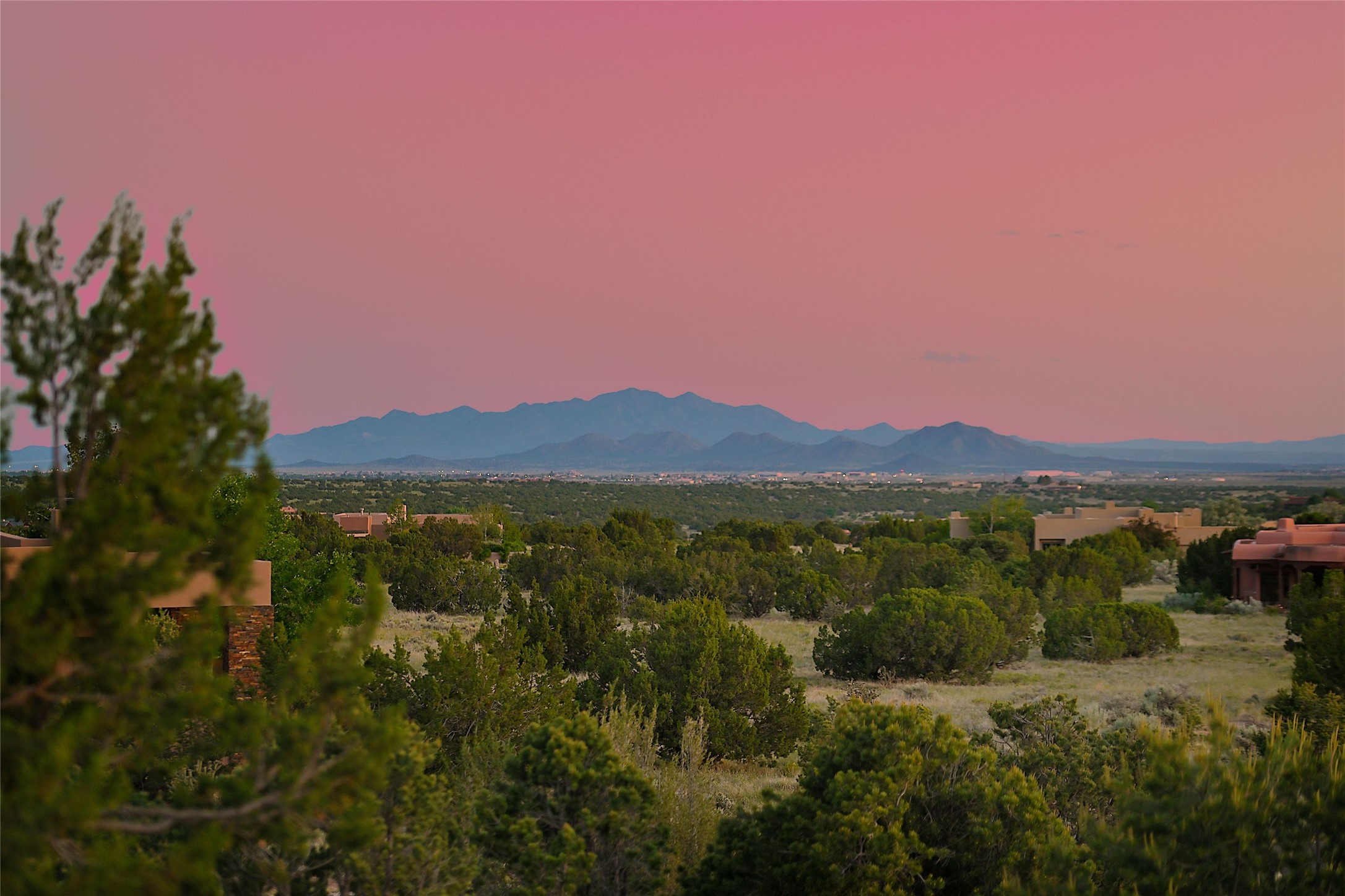 Nestled in a prime location on the Sunrise Golf Course, this exceptional adobe residence invites you into a lifestyle defined by comfort, artistry, and connection to the outdoors. A stunning portal wraps around the entire back of the home, framing expansive views of both the Jemez and Sangre de Cristo Mountains. Overlooking lush gardens and a beautifully landscaped backyard, this outdoor space is a favorite spot for outdoor dining, relaxing with a book, or simply enjoying the peaceful and quiet. Inside, the great room welcomes you with warmth and grandeur. A unique entryway, curved walls, artful niches, and a substantial fireplace create a space that feels both impressive and intimate. Just beyond, the warm and cheerful kitchen draws everyone in--anchored by a cozy fireplace and defined by handcrafted tin and tile accents, custom cabinetry, and inviting seating areas. The primary suite is a spacious retreat with a beautifully designed bathroom and a generous double shower. A separate wing of the house holds three self-contained guest bedrooms, each with its own distinctive bath, offering privacy and comfort to family and visitors alike. A charming library, currently used as an office, is accompanied by a finely finished guest bath. Throughout the home, attention to detail abounds--from hand-carved wooden doors to vigas and latillas that lend warmth and texture to every room. Thick adobe walls offer natural insulation year-round, while gently curved interior walls contribute to the home's organic flow. Multiple fireplaces throughout the home and portal provide both ambiance and warmth. This is a home filled with light, character, and soul--whether strolling near the golf course at sunset or savoring the serenity of the gardens, every space offers something truly special. Above all, it is simply a wonderful home to live in and love.