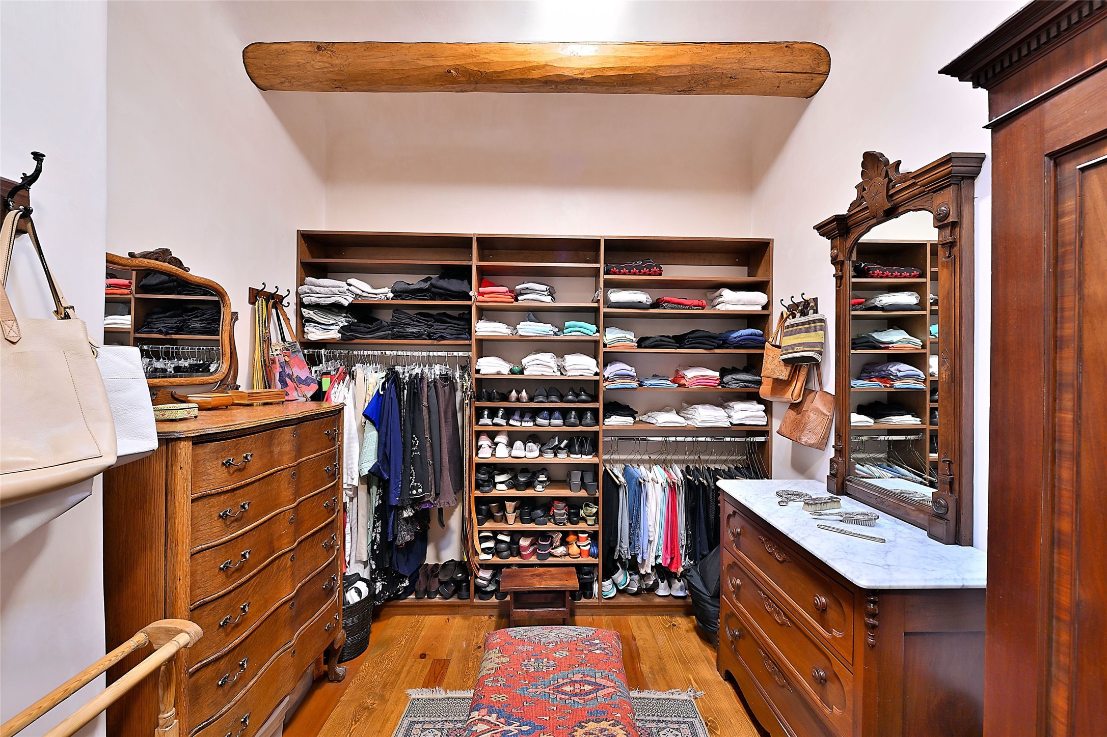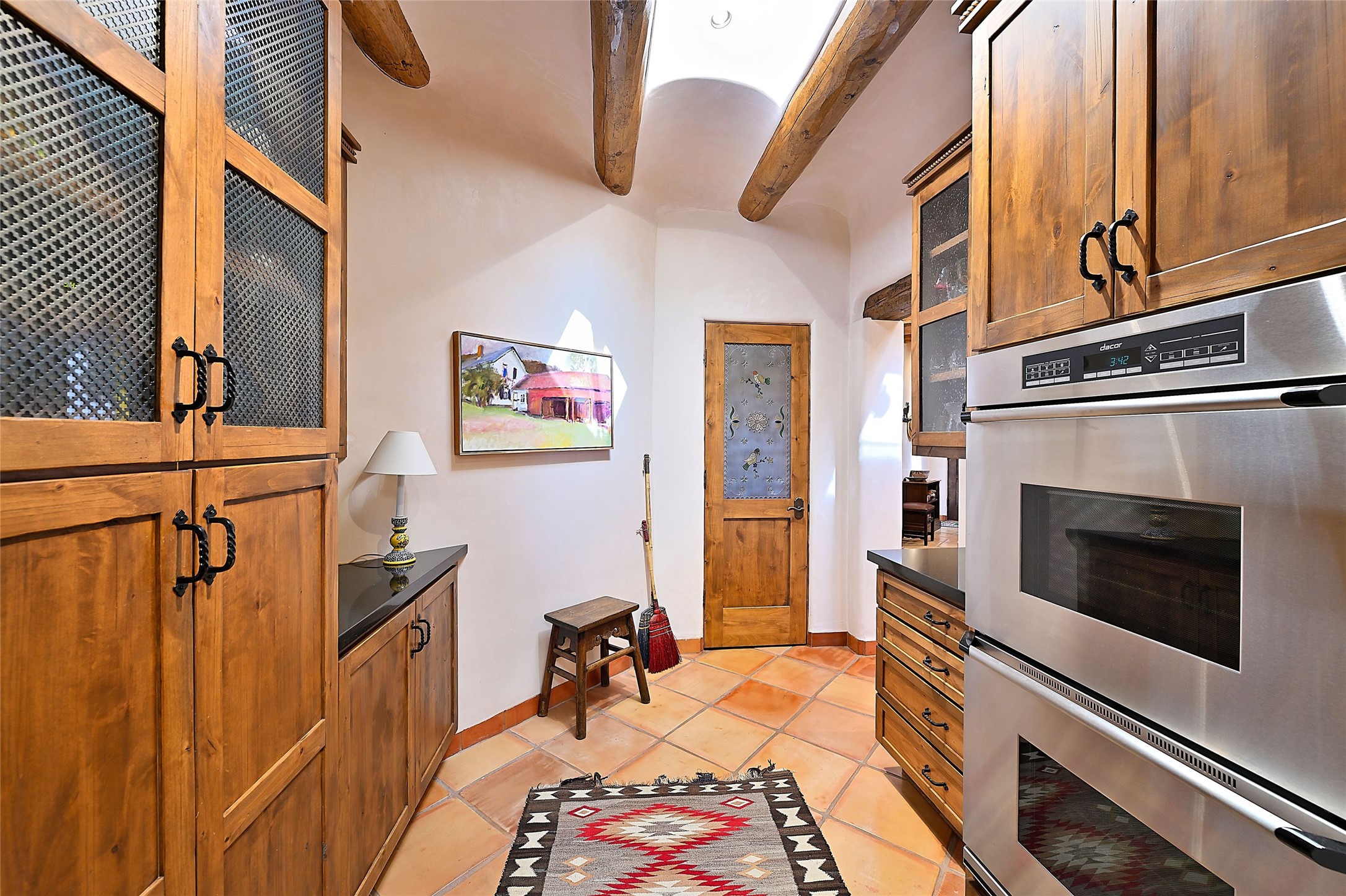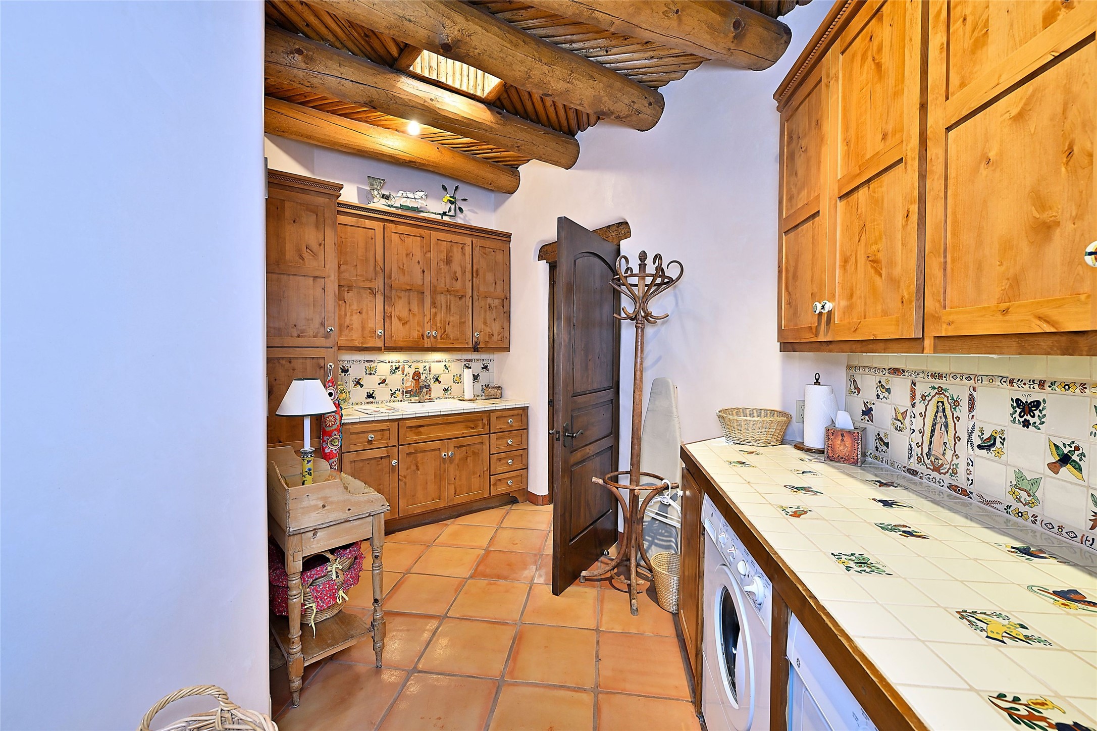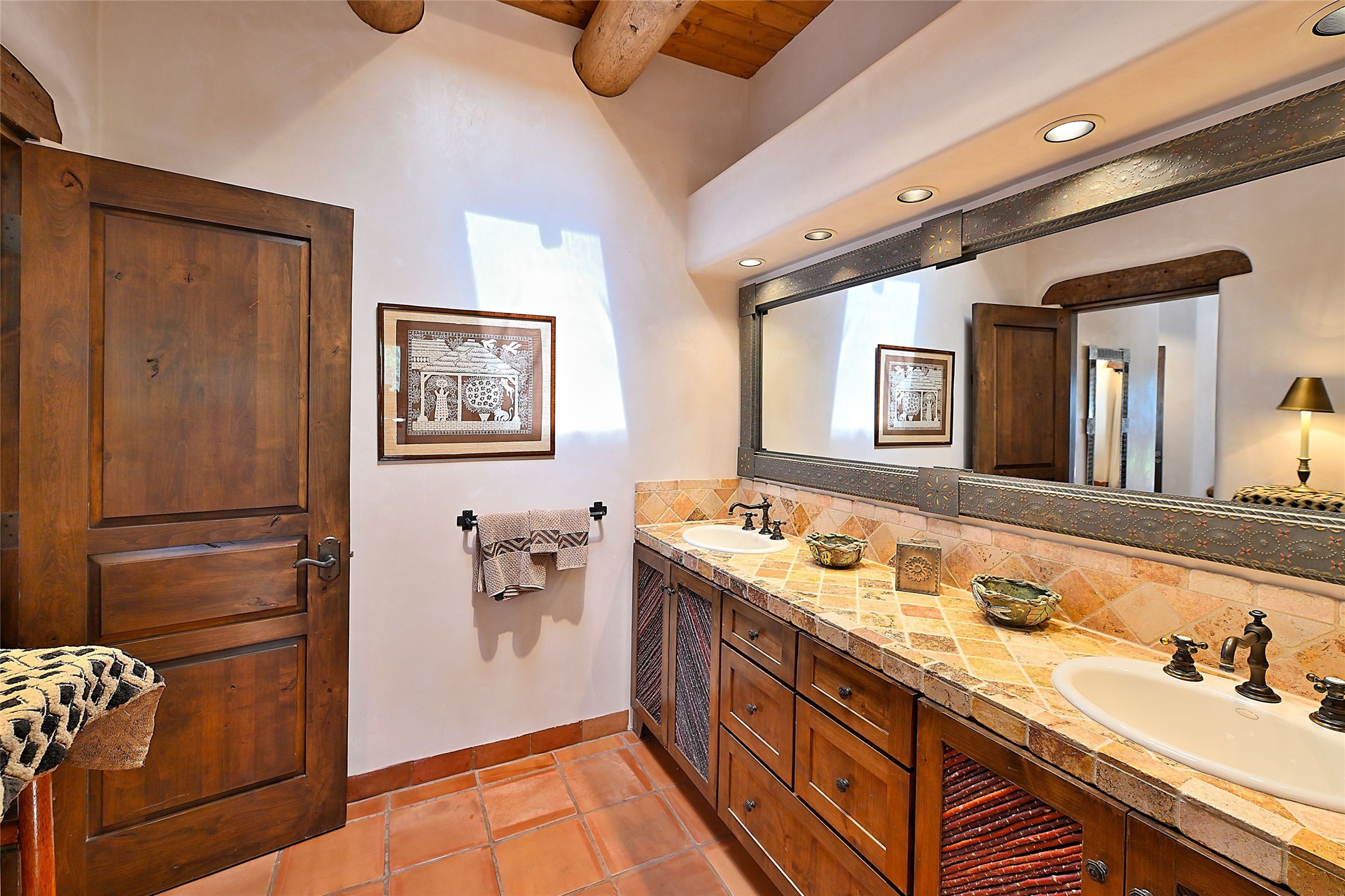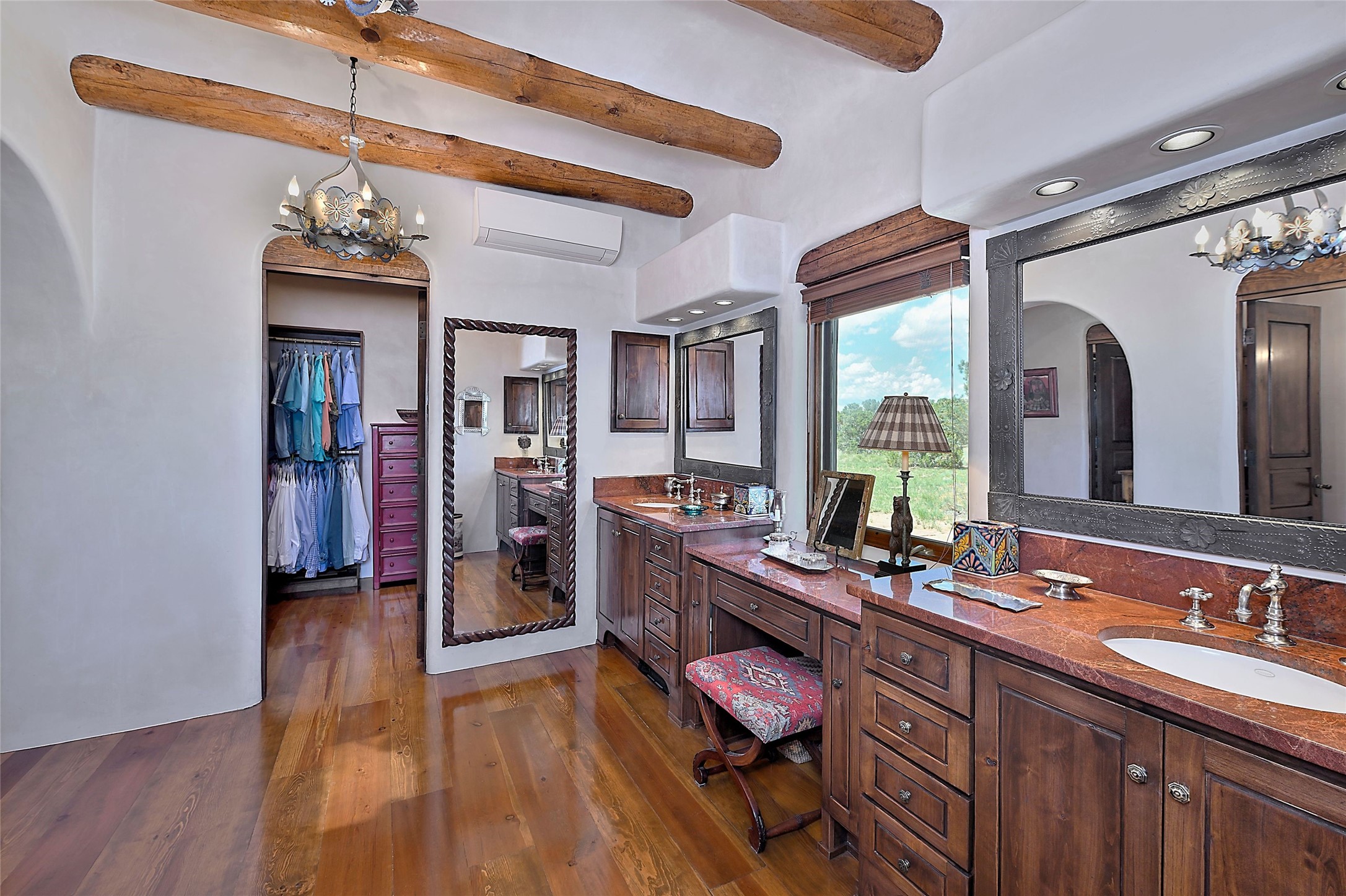Nestled in a prime location on the Sunrise Golf Course, this exceptional adobe residence invites you into a lifestyle defined by comfort, artistry, and connection to the outdoors. A stunning portal wraps around the entire back of the home, framing expansive views of both the Jemez and Sangre de Cristo Mountains. Overlooking lush gardens and a beautifully landscaped backyard, this outdoor space is a favorite spot for outdoor dining, relaxing with a book, or simply enjoying the peaceful and quiet. Inside, the great room welcomes you with warmth and grandeur. A unique entryway, curved walls, artful niches, and a substantial fireplace create a space that feels both impressive and intimate. Just beyond, the warm and cheerful kitchen draws everyone in--anchored by a cozy fireplace and defined by handcrafted tin and tile accents, custom cabinetry, and inviting seating areas. The primary suite is a spacious retreat with a beautifully designed bathroom and a generous double shower. A separate wing of the house holds three self-contained guest bedrooms, each with its own distinctive bath, offering privacy and comfort to family and visitors alike. A charming library, currently used as an office, is accompanied by a finely finished guest bath. Throughout the home, attention to detail abounds--from hand-carved wooden doors to vigas and latillas that lend warmth and texture to every room. Thick adobe walls offer natural insulation year-round, while gently curved interior walls contribute to the home's organic flow. Multiple fireplaces throughout the home and portal provide both ambiance and warmth. This is a home filled with light, character, and soul--whether strolling near the golf course at sunset or savoring the serenity of the gardens, every space offers something truly special. Above all, it is simply a wonderful home to live in and love.