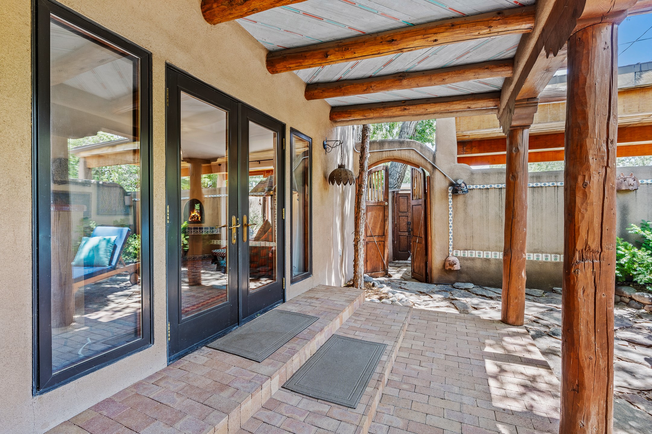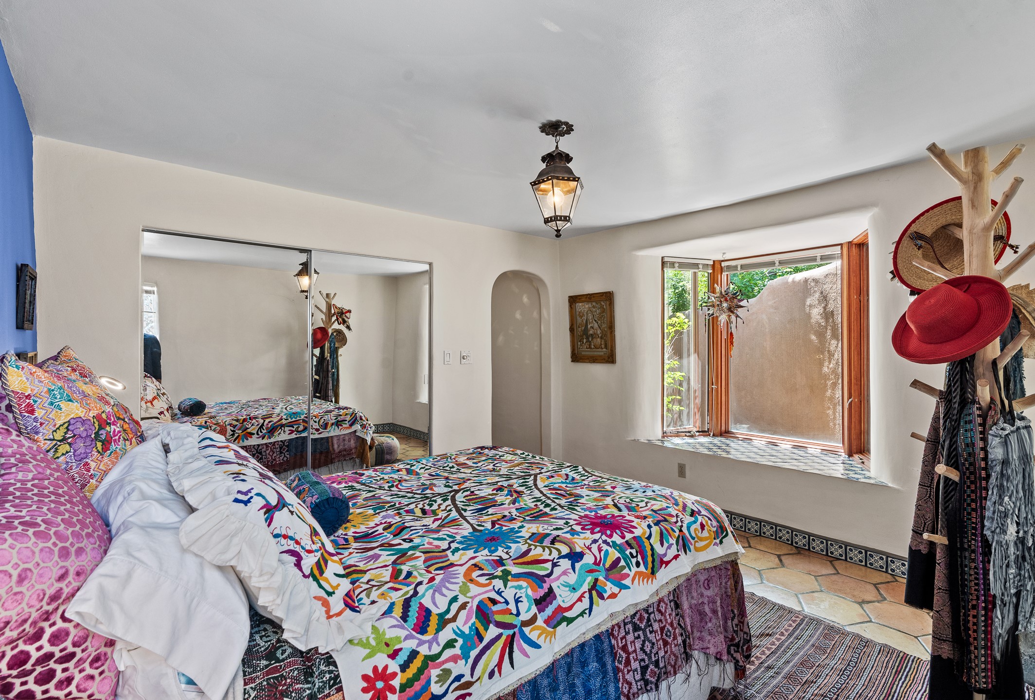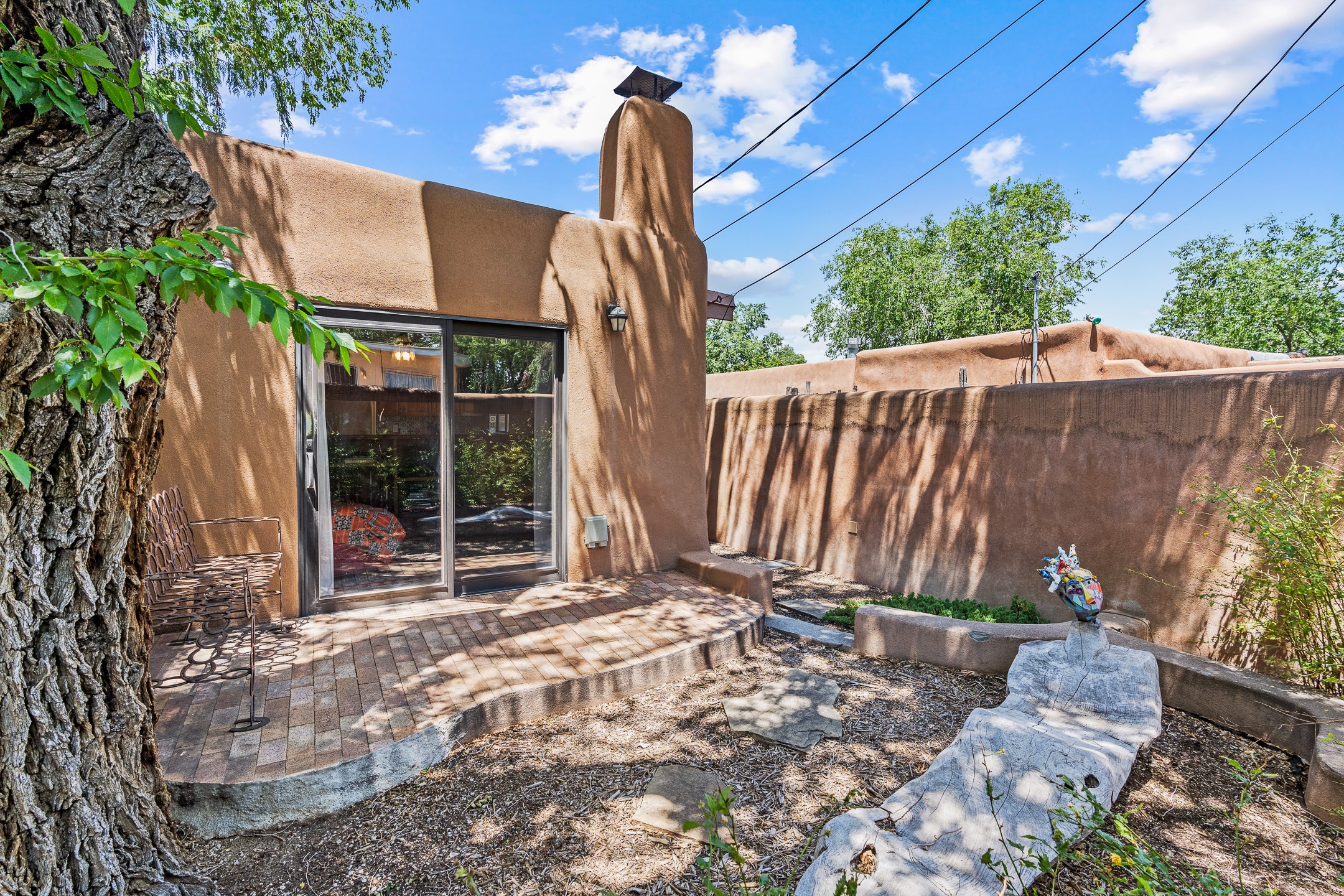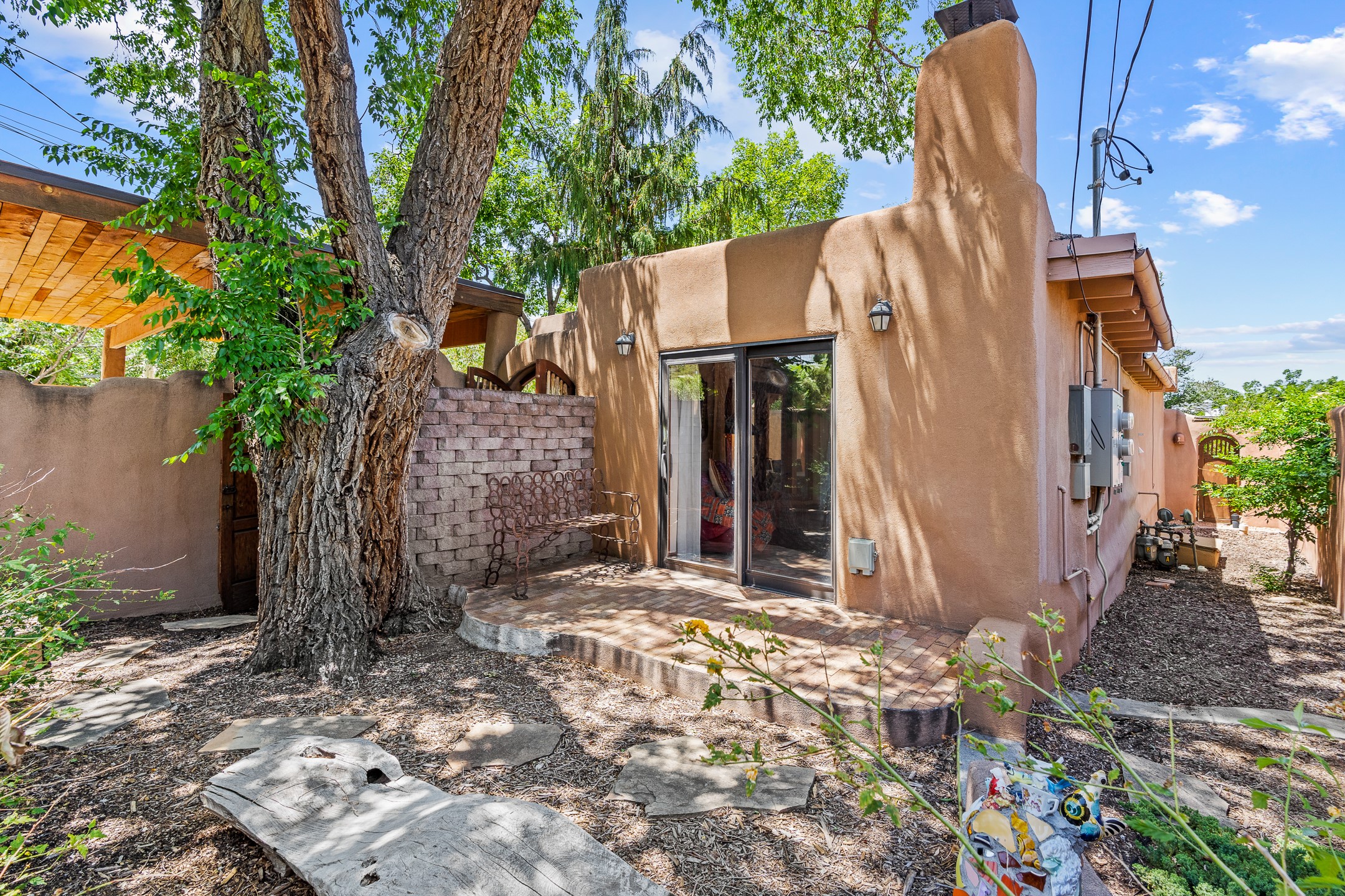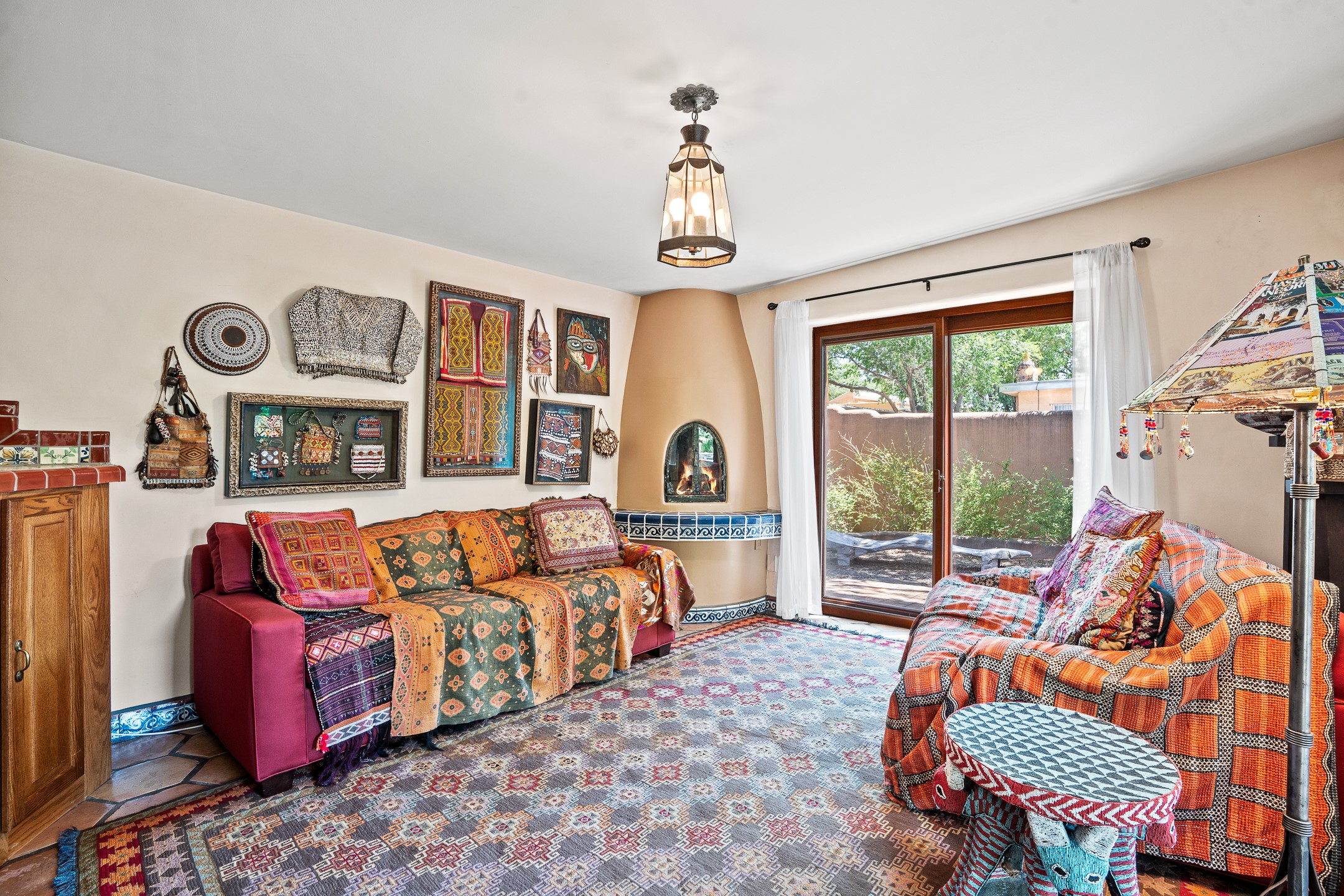 A magical cottage. Tucked away behind adobe walls and under the shade of mature trees, this vibrant and artfully curated home is a true Santa Fe gem. The residence exudes warmth and character with its vigas and iconic kiva fireplace. Step inside to discover colorful Talavera tile countertops and backsplashes in the kitchen, blending seamlessly with rich wood cabinetry. The home's interior flows effortlessly to a lush, private courtyard -- an outdoor sanctuary complete with flagstone pathways, a shaded dining patio, sculptural garden elements, and a lounge area ideal for relaxing under New Mexico's blue skies. A serene bedroom and an inviting living area that opens to the outdoors, this home offers both comfort and inspiration. Whether you're seeking a soulful retreat, an artist's haven, or a charming place to entertain, this property is a rare find that captures the spirit of Santa Fe living.