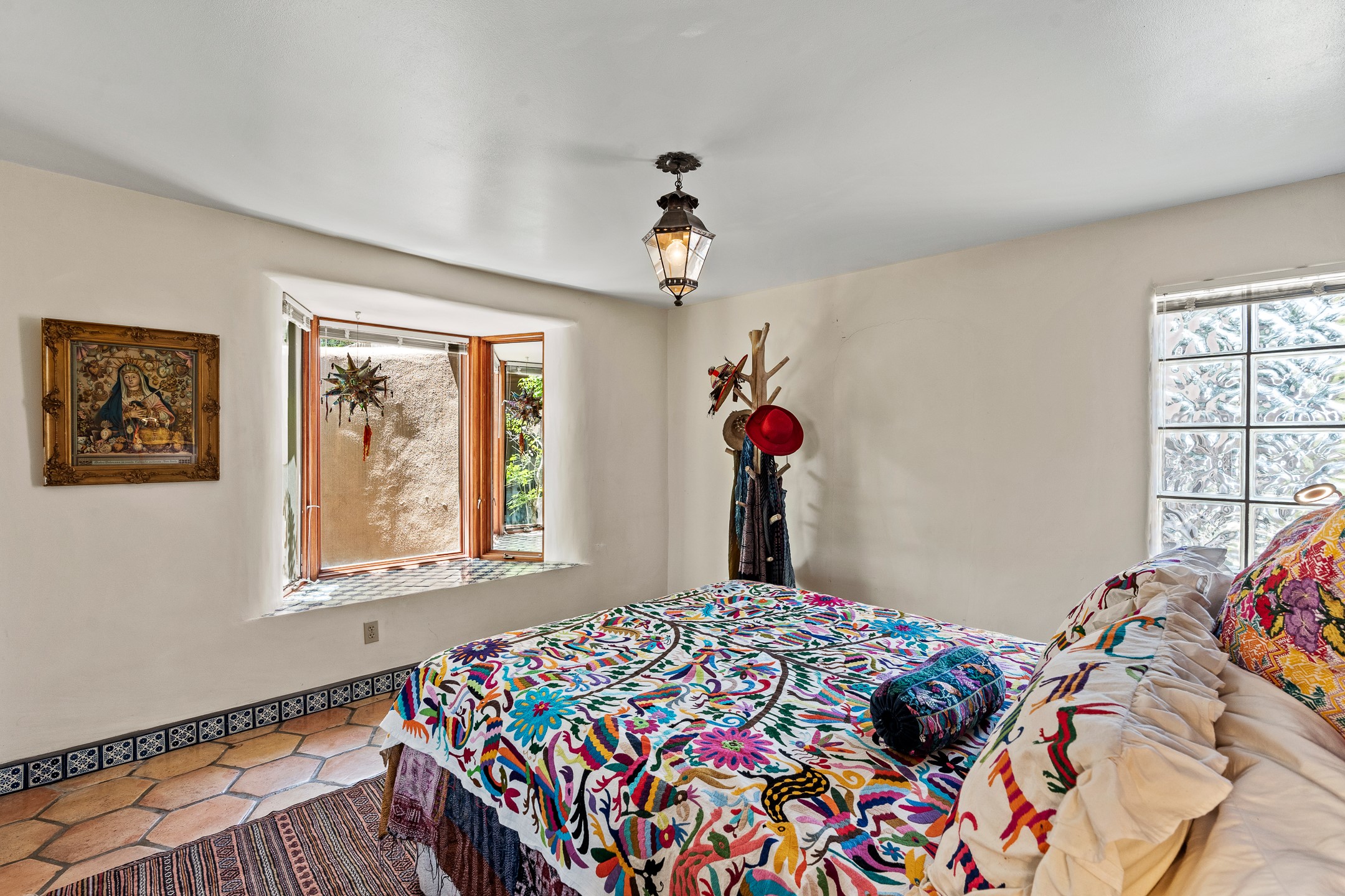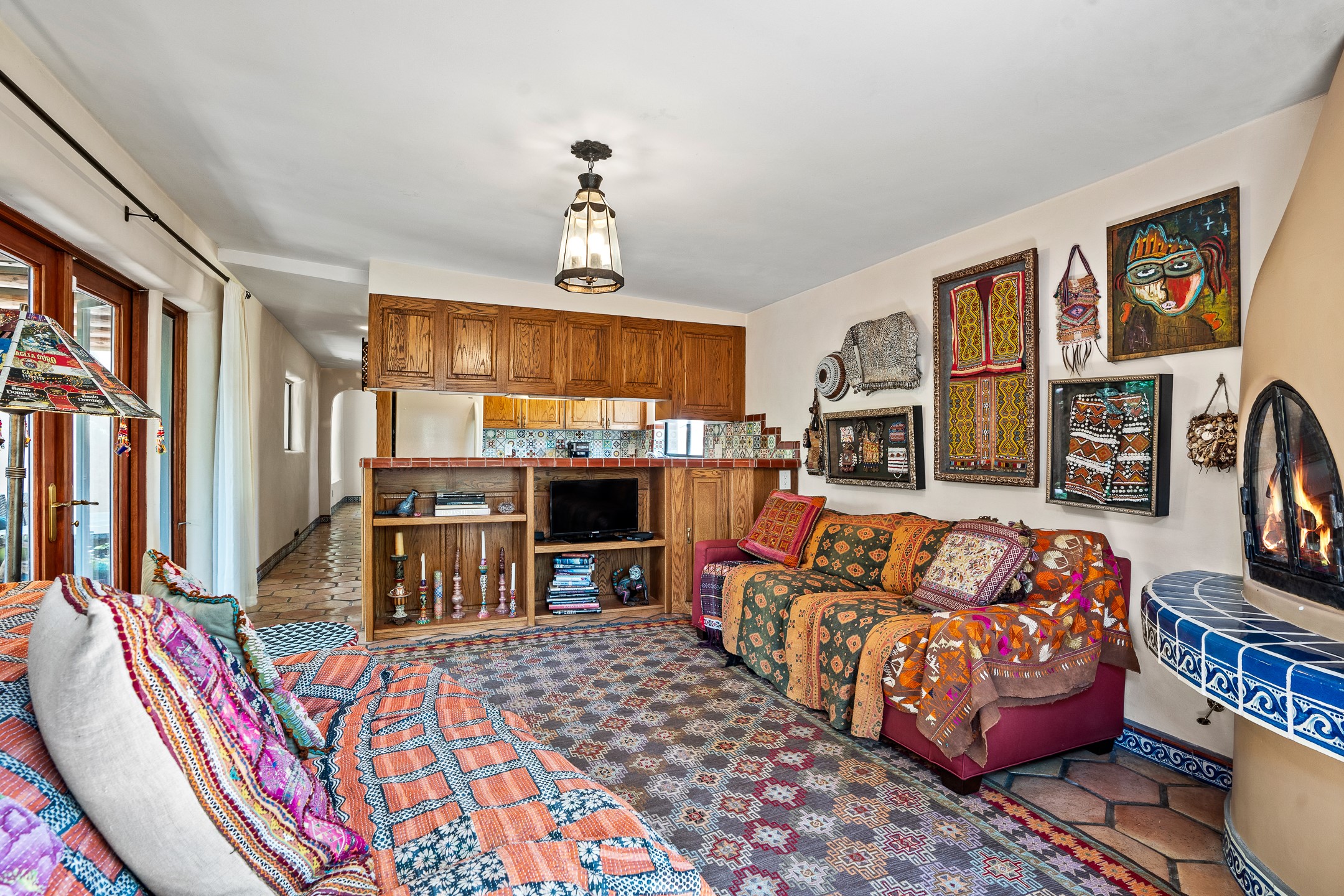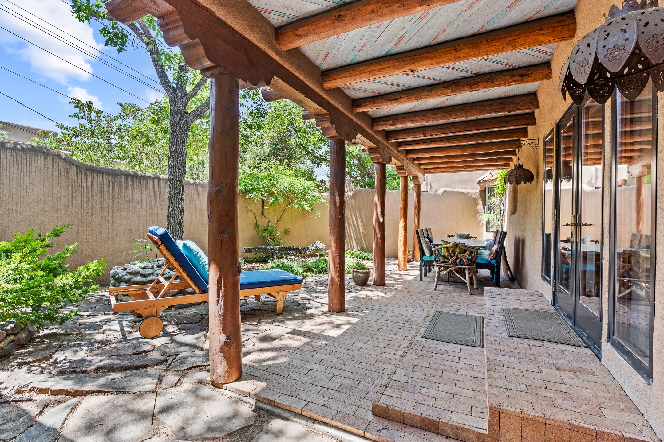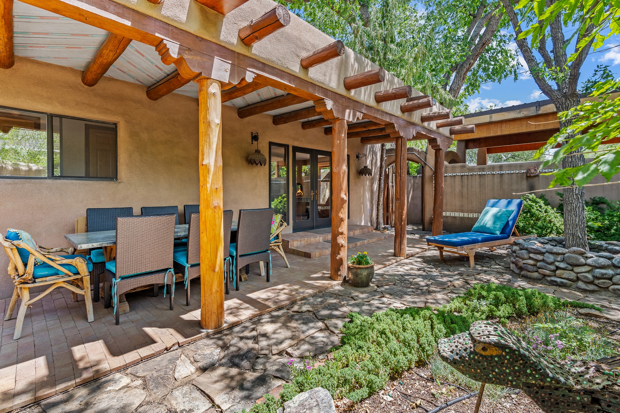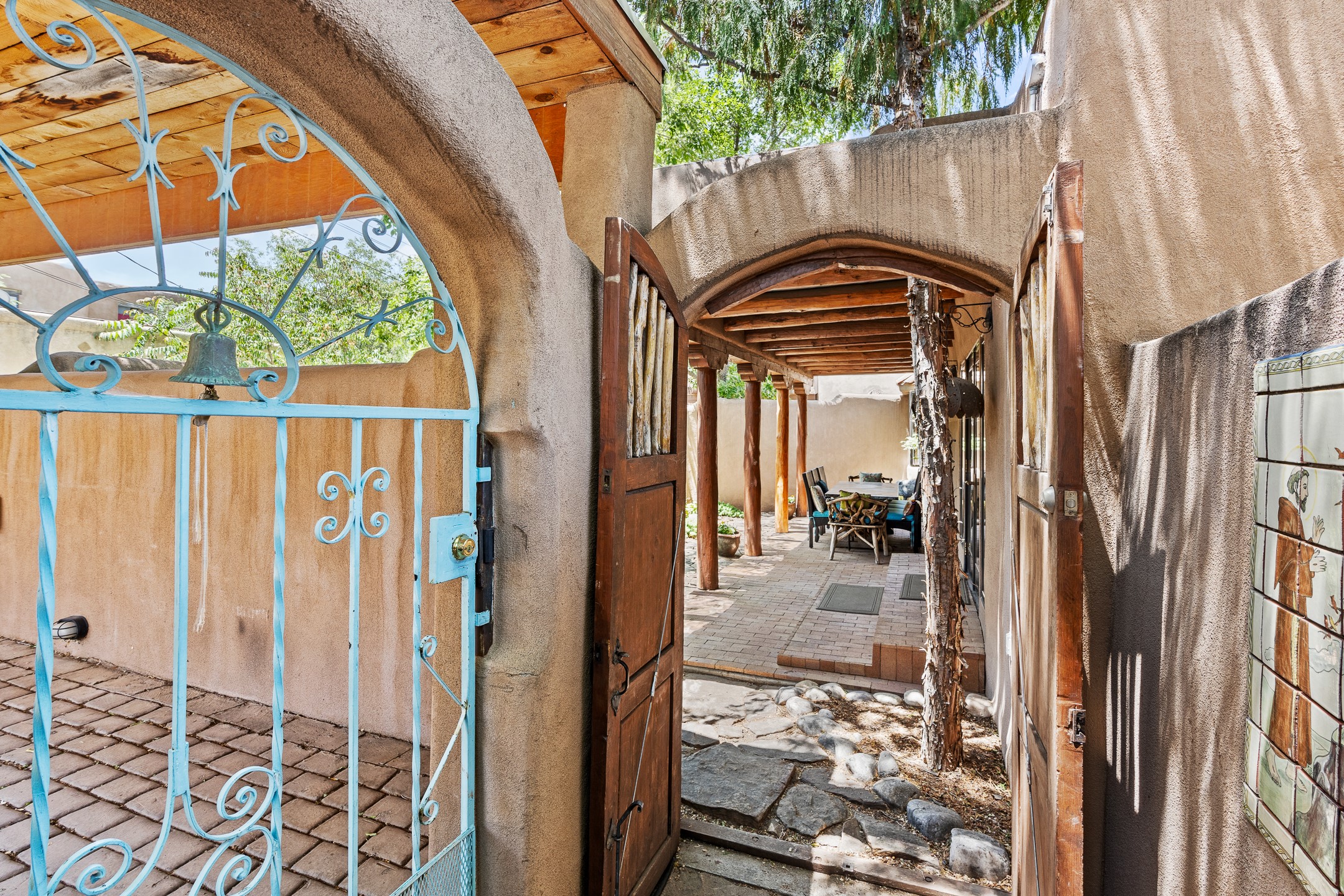 A magical cottage. Tucked away behind adobe walls and under the shade of mature trees, this vibrant and artfully curated home is a true Santa Fe gem. The residence exudes warmth and character with its vigas and iconic kiva fireplace. Step inside to discover colorful Talavera tile countertops and backsplashes in the kitchen, blending seamlessly with rich wood cabinetry. The home's interior flows effortlessly to a lush, private courtyard -- an outdoor sanctuary complete with flagstone pathways, a shaded dining patio, sculptural garden elements, and a lounge area ideal for relaxing under New Mexico's blue skies. A serene bedroom and an inviting living area that opens to the outdoors, this home offers both comfort and inspiration. Whether you're seeking a soulful retreat, an artist's haven, or a charming place to entertain, this property is a rare find that captures the spirit of Santa Fe living.