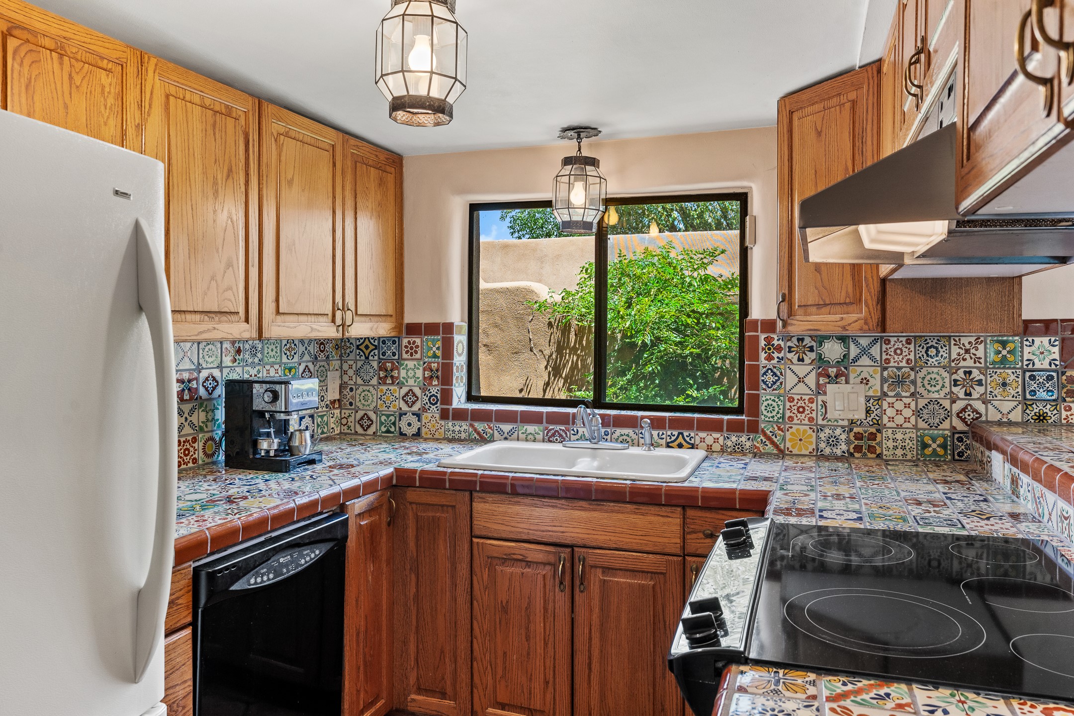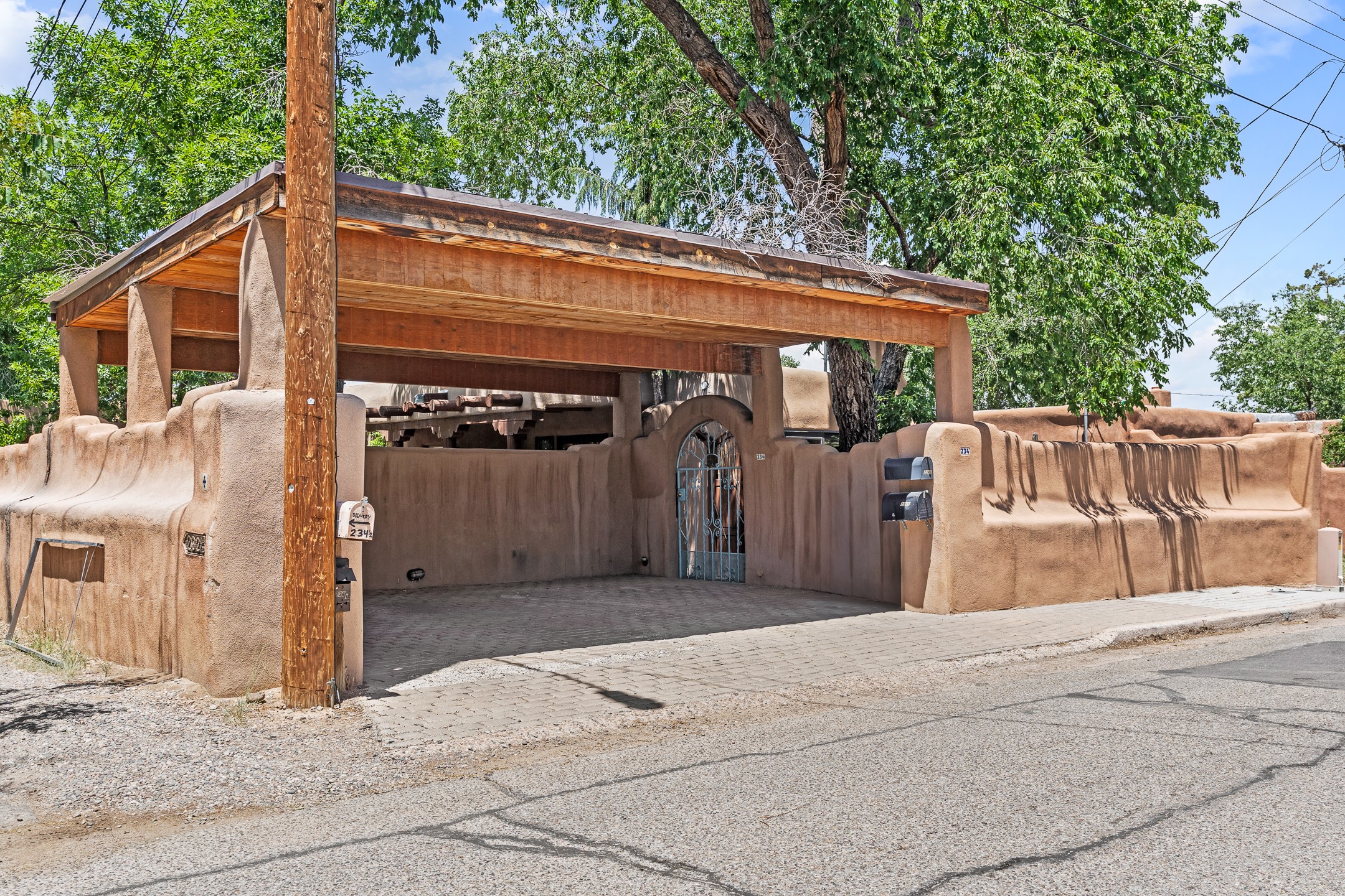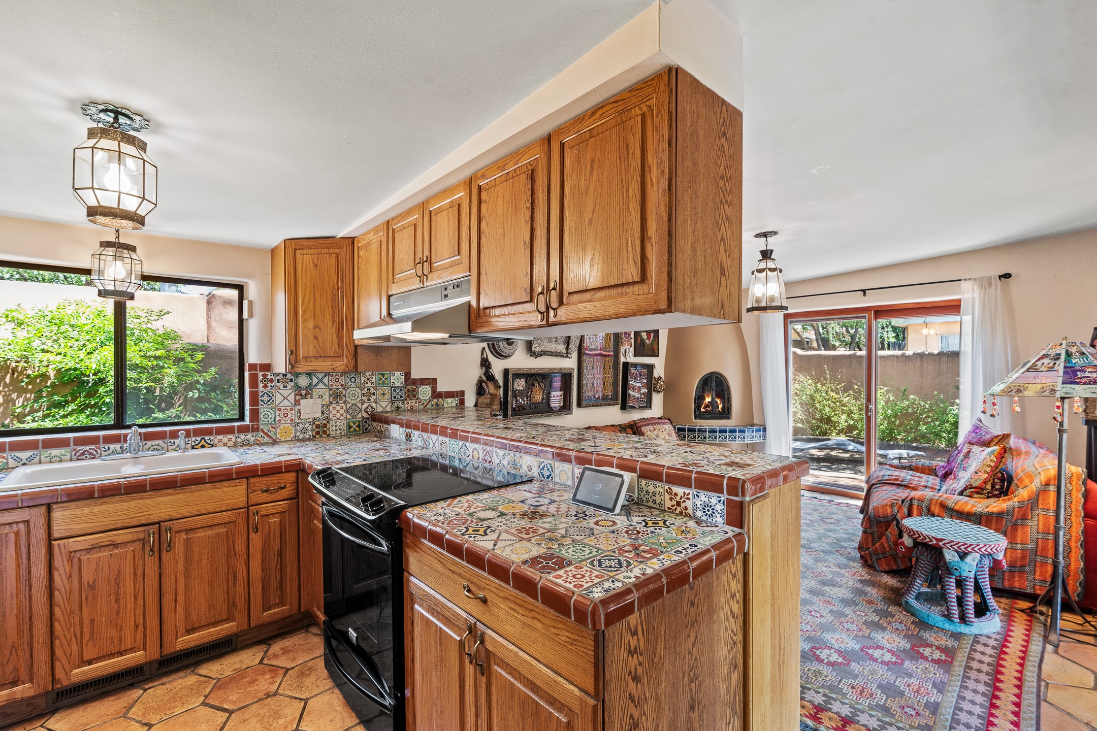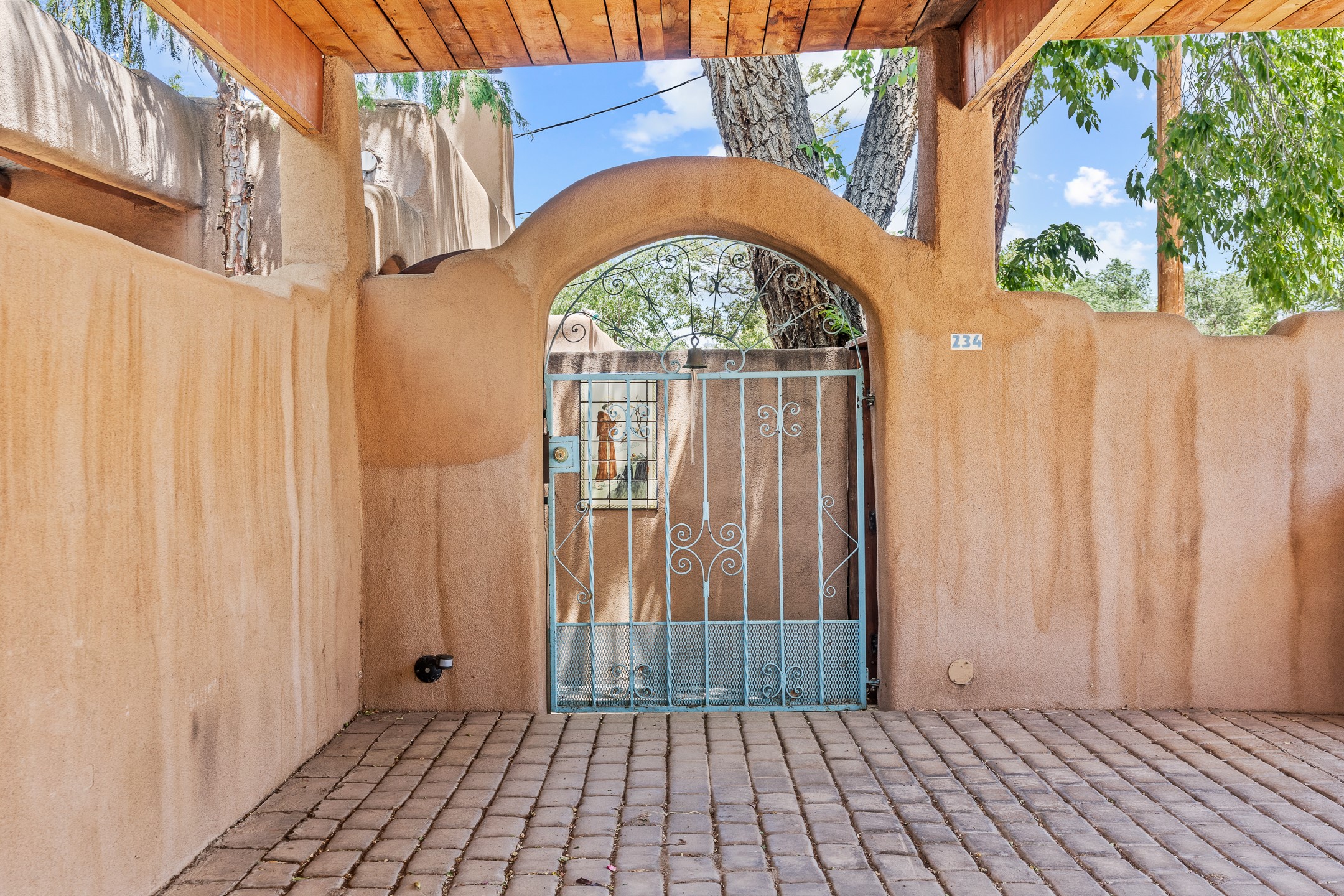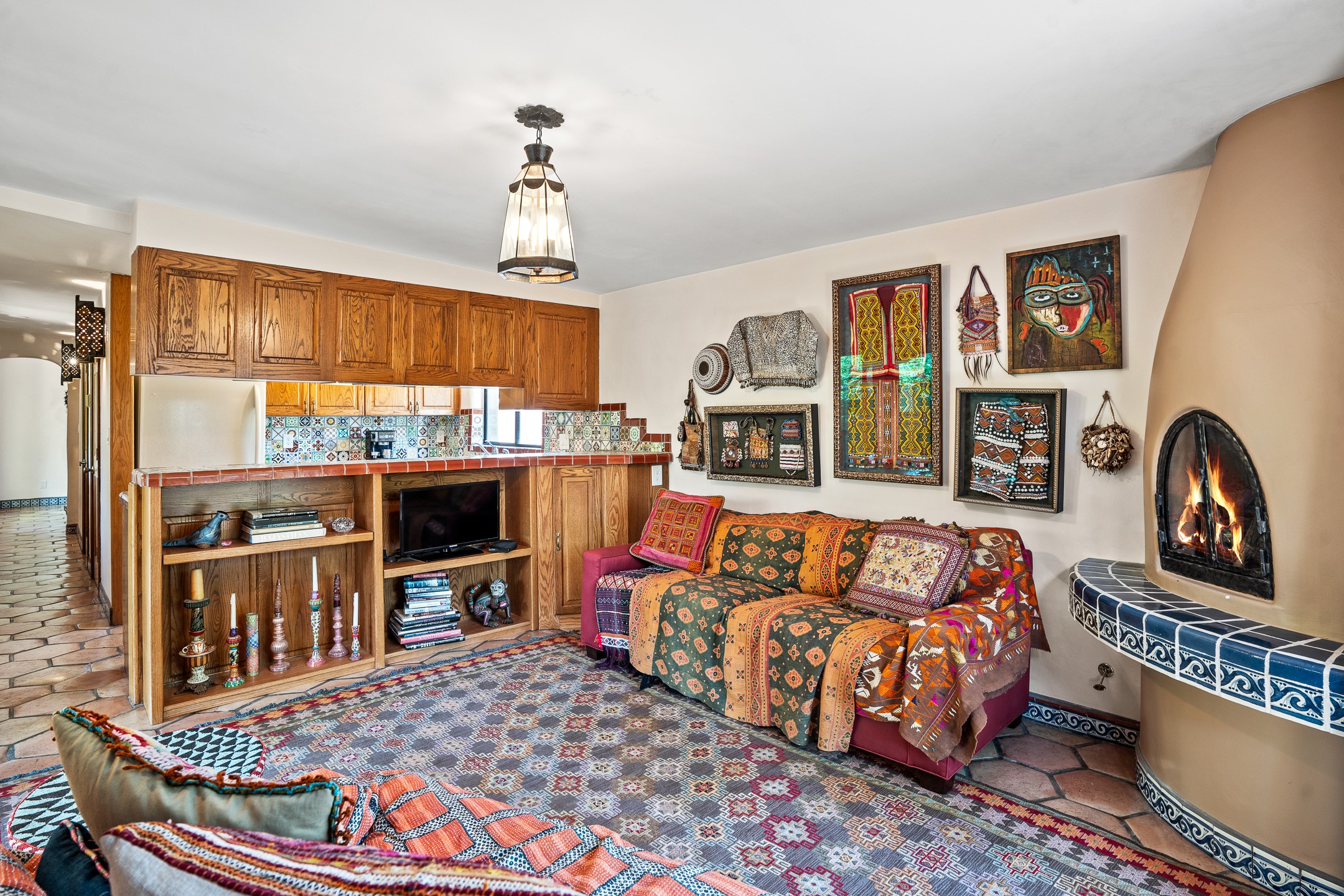A magical cottage. Tucked away behind adobe walls and under the shade of mature trees, this vibrant and artfully curated home is a true Santa Fe gem. The residence exudes warmth and character with its vigas and iconic kiva fireplace. Step inside to discover colorful Talavera tile countertops and backsplashes in the kitchen, blending seamlessly with rich wood cabinetry. The home's interior flows effortlessly to a lush, private courtyard -- an outdoor sanctuary complete with flagstone pathways, a shaded dining patio, sculptural garden elements, and a lounge area ideal for relaxing under New Mexico's blue skies. A serene bedroom and an inviting living area that opens to the outdoors, this home offers both comfort and inspiration. Whether you're seeking a soulful retreat, an artist's haven, or a charming place to entertain, this property is a rare find that captures the spirit of Santa Fe living.