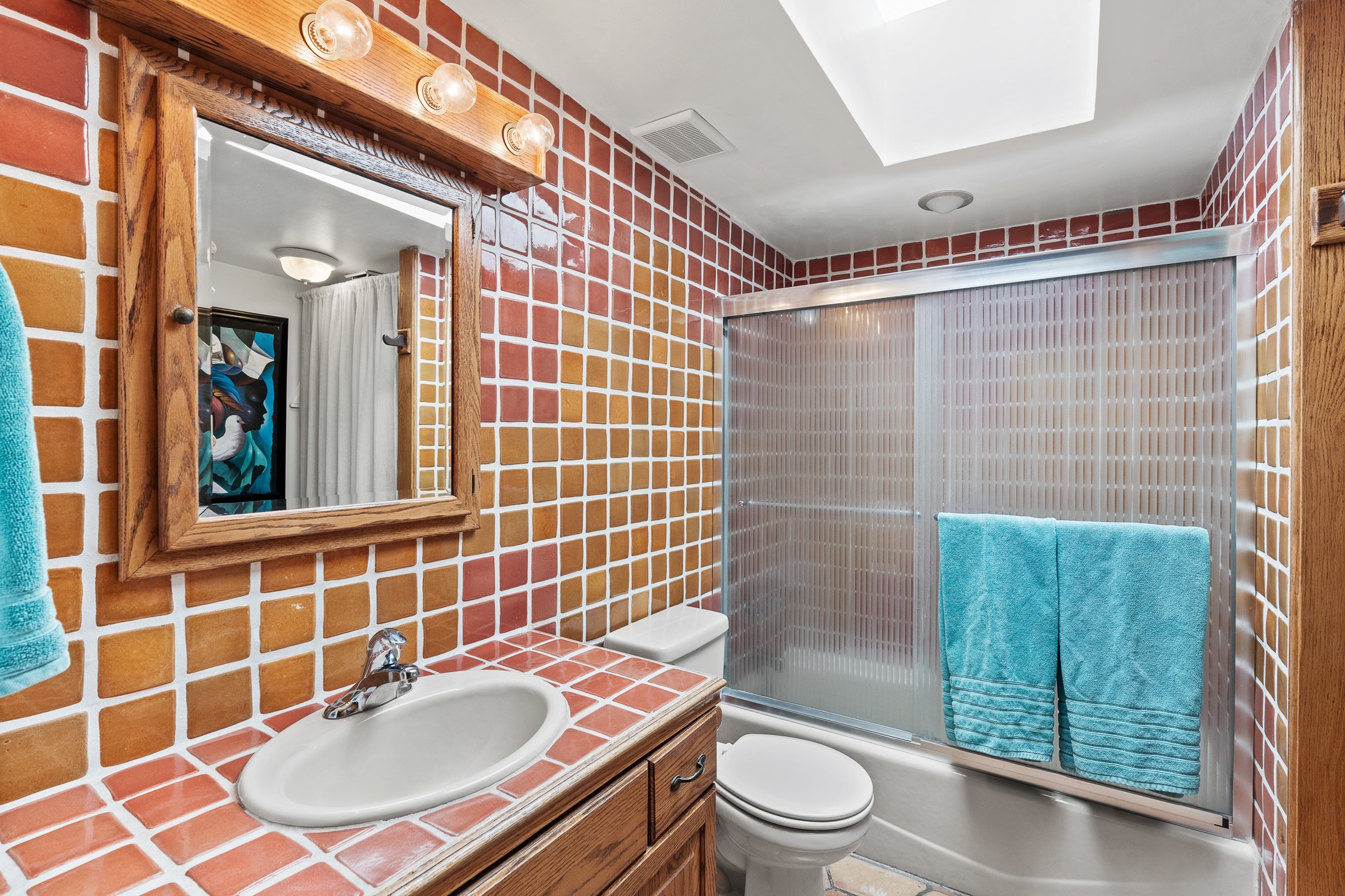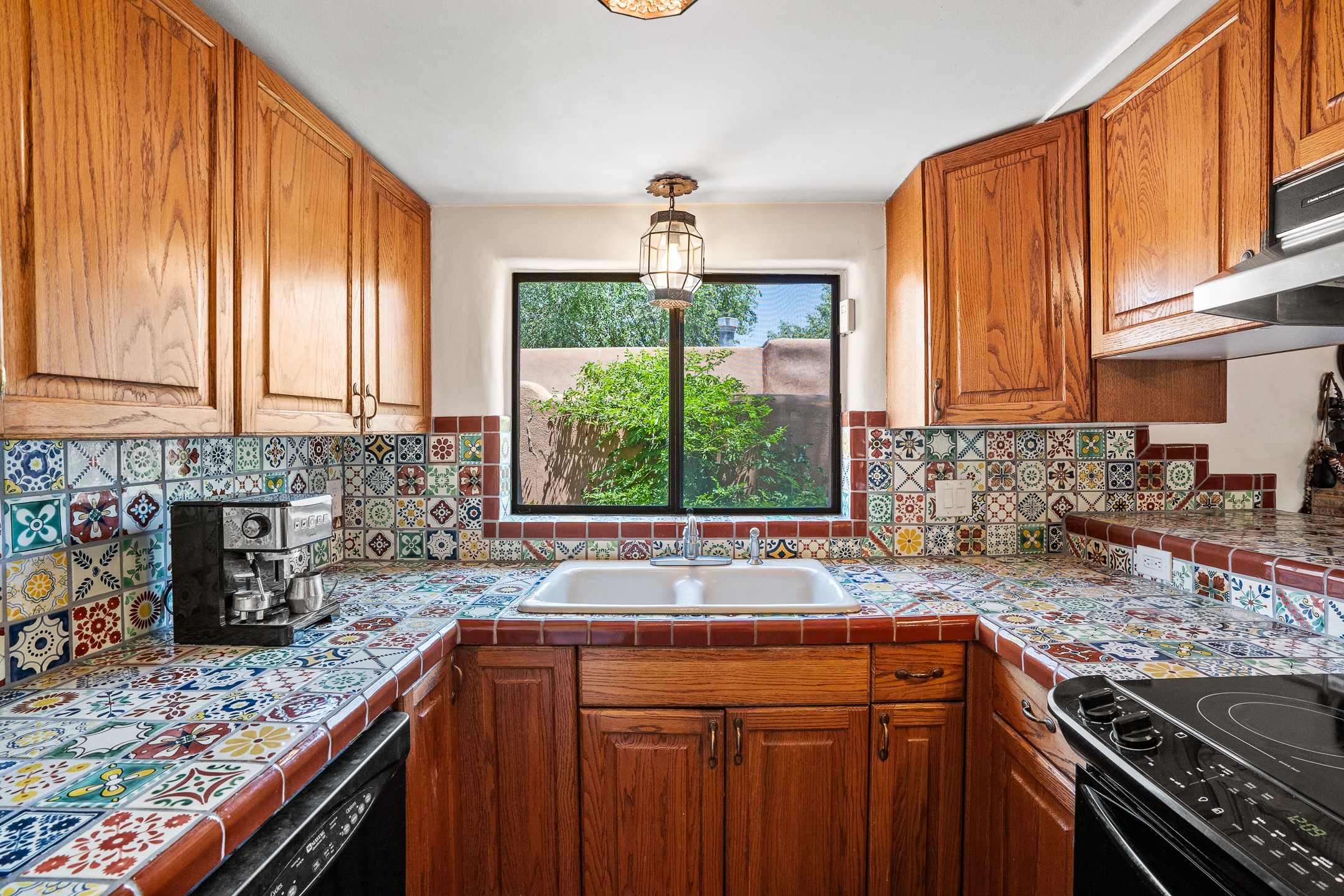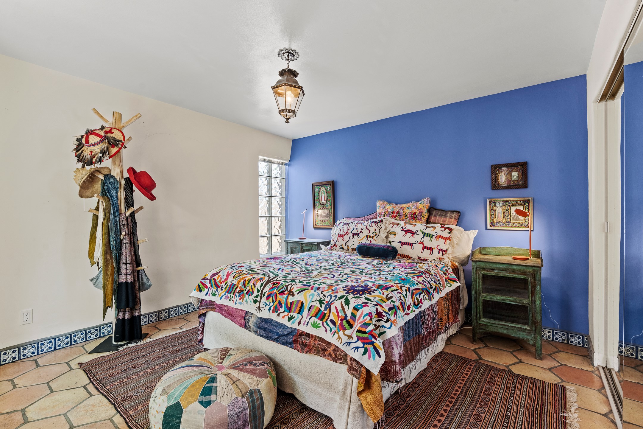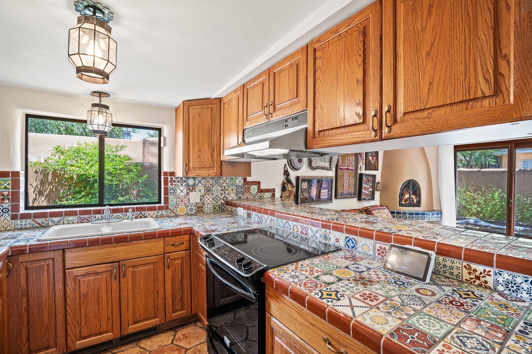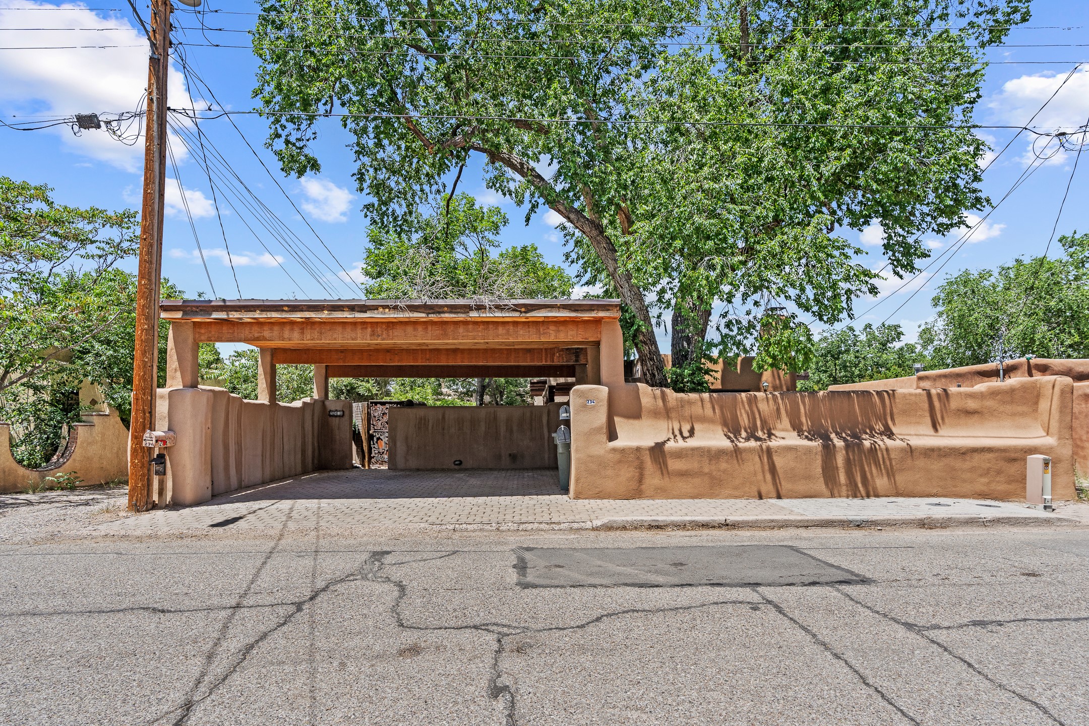 A magical cottage. Tucked away behind adobe walls and under the shade of mature trees, this vibrant and artfully curated home is a true Santa Fe gem. The residence exudes warmth and character with its vigas and iconic kiva fireplace. Step inside to discover colorful Talavera tile countertops and backsplashes in the kitchen, blending seamlessly with rich wood cabinetry. The home's interior flows effortlessly to a lush, private courtyard -- an outdoor sanctuary complete with flagstone pathways, a shaded dining patio, sculptural garden elements, and a lounge area ideal for relaxing under New Mexico's blue skies. A serene bedroom and an inviting living area that opens to the outdoors, this home offers both comfort and inspiration. Whether you're seeking a soulful retreat, an artist's haven, or a charming place to entertain, this property is a rare find that captures the spirit of Santa Fe living.