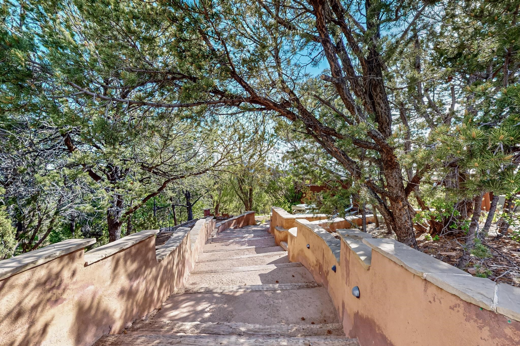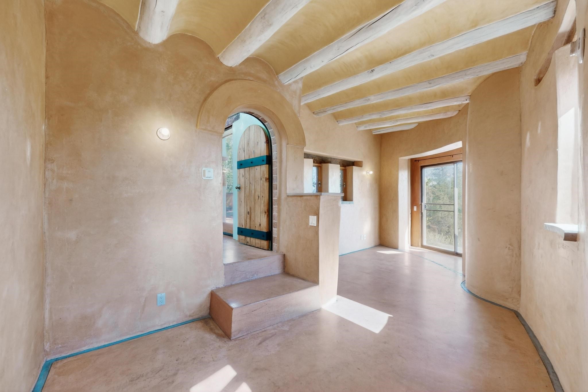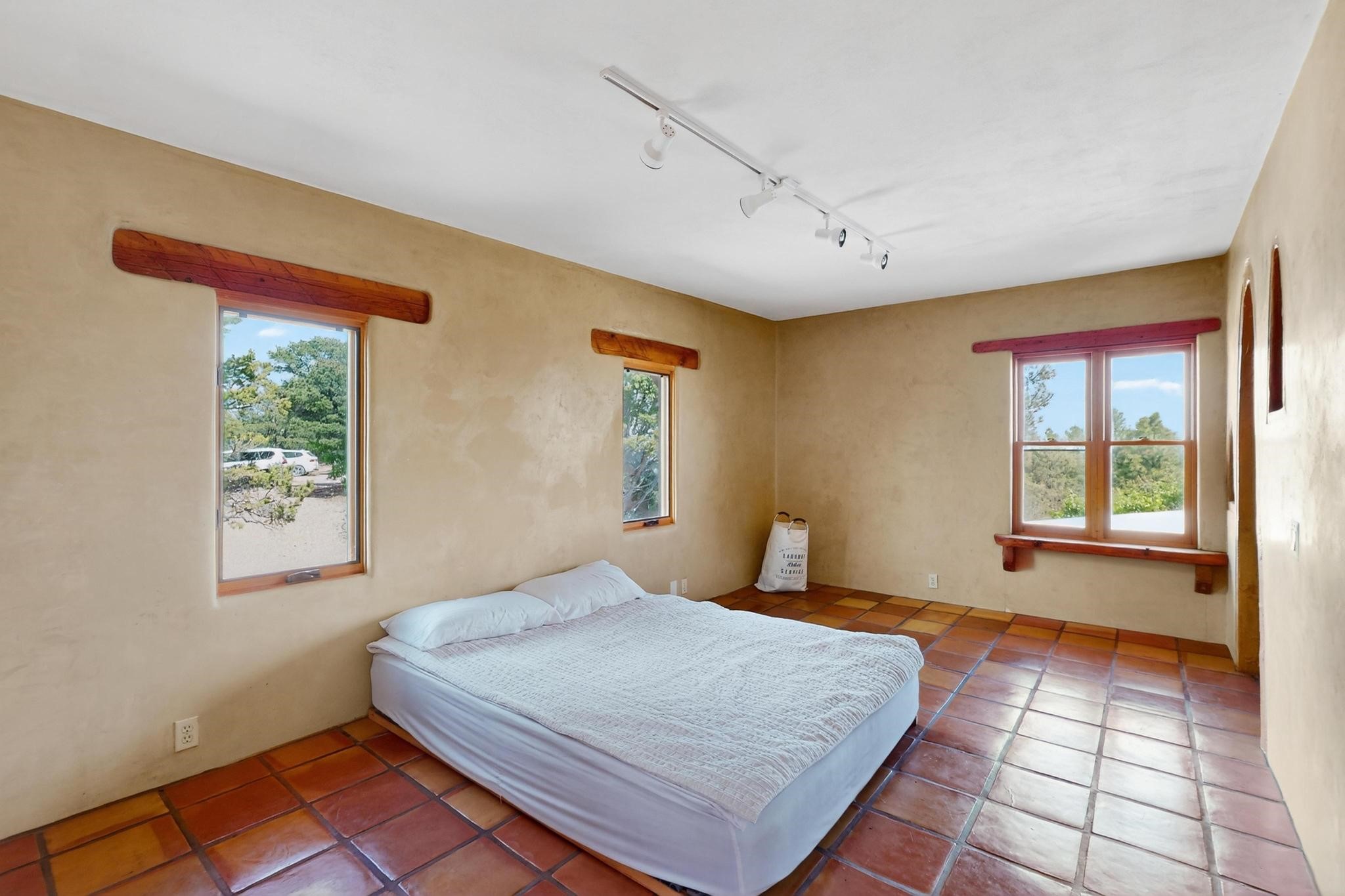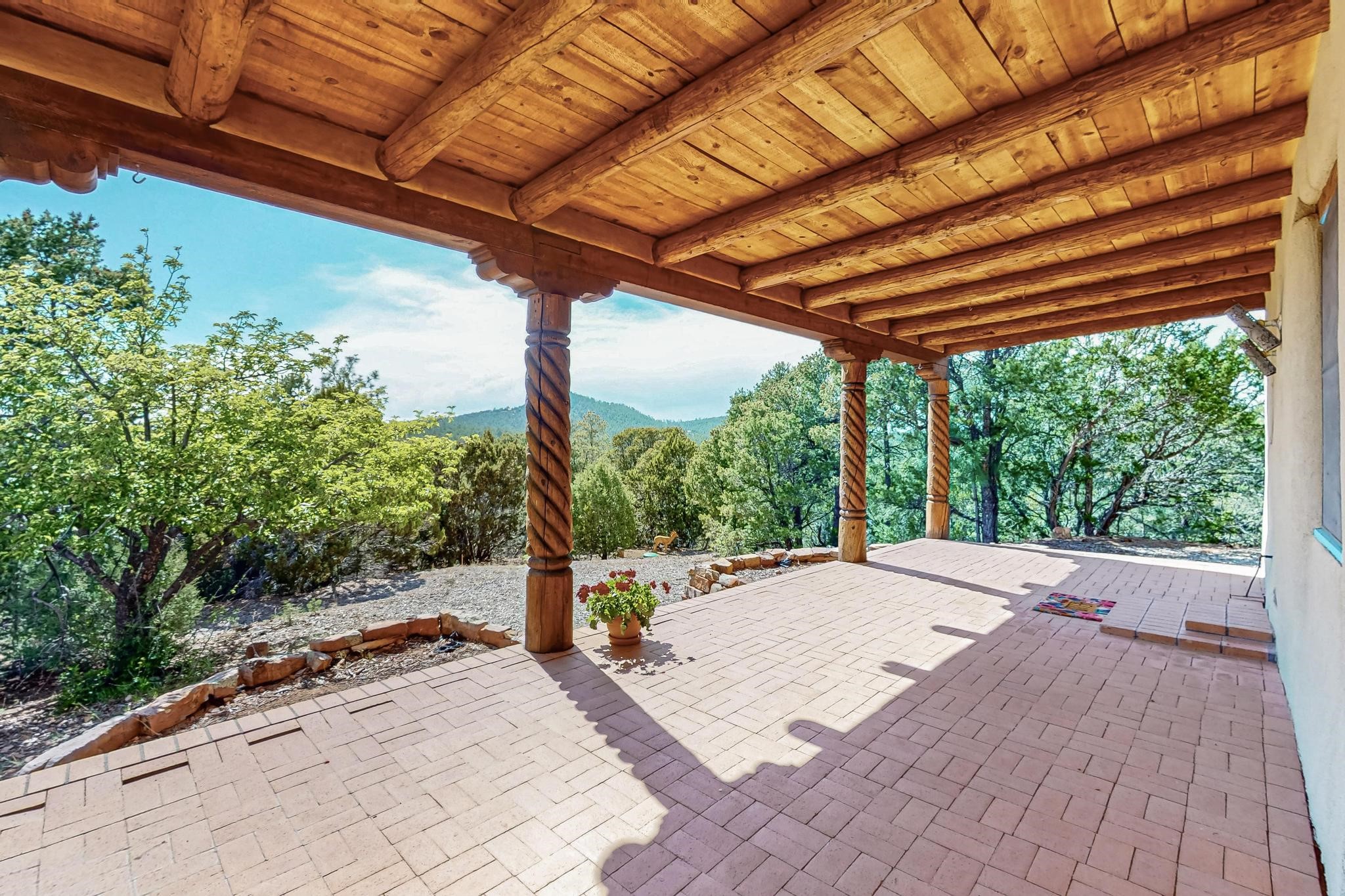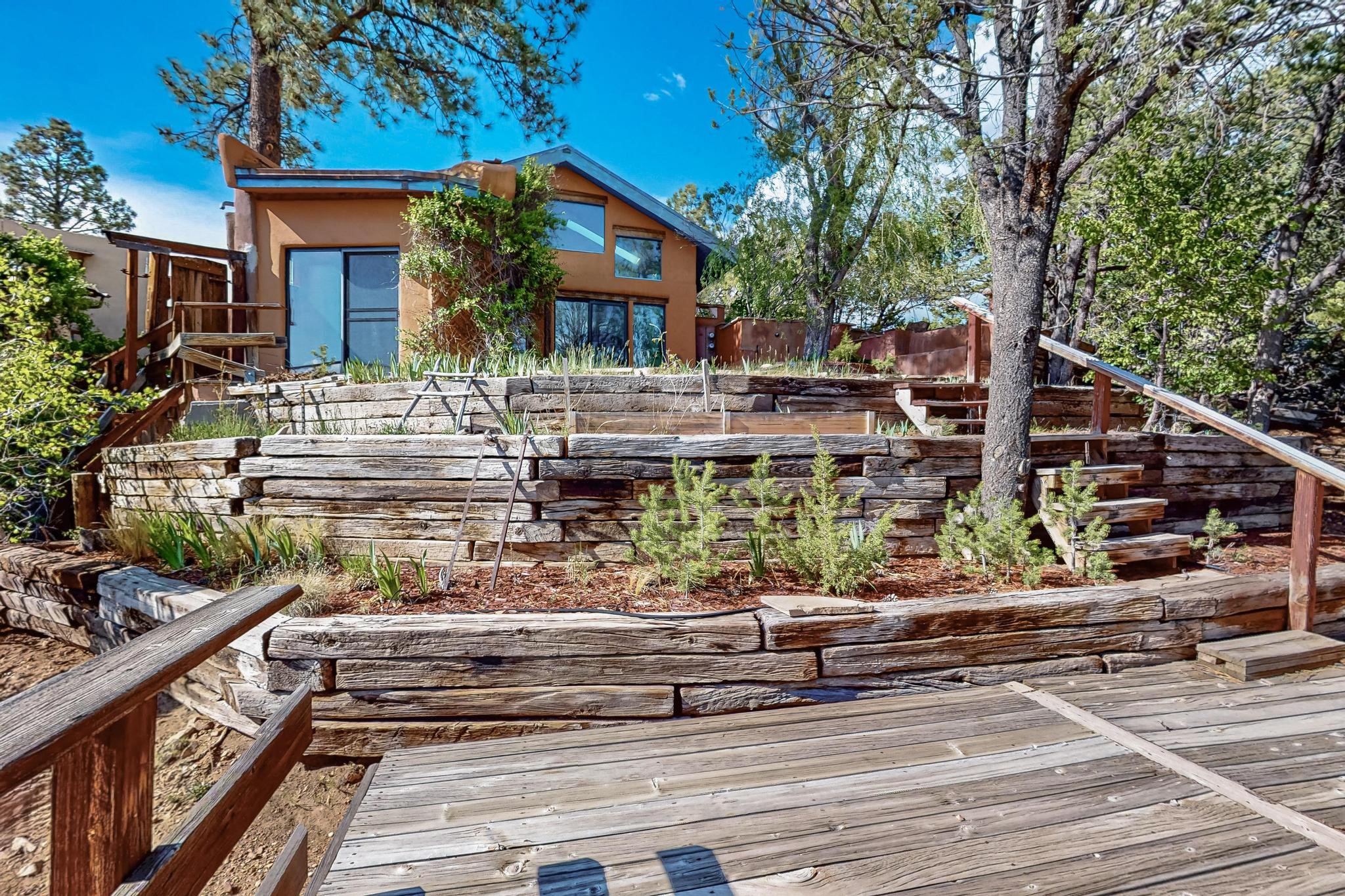 Two houses reside on this beautiful 5 Acre property that is nestled among old growth pine trees, offering numerous possibilities and conveniently located about 20 minutes from town The property features two distinct homes and a studio/workshop, all within a peaceful natural environment. House #A includes 2 bedrooms, 1 bath, fireplace, stained concrete floors, hard trowel plaster walls, radiant heat, a loft, and vigas, and a private deck. House #B known as the "Lily Pad House" offers 3 bedrooms, 2 baths, fireplace, saltillo tiles, vigas, radiant heat, hard trowel plaster, wood floors, vigas, spacious kitchen, portal, and delightful koi pond with lilies. Additionally, there is a versatile studio/workshop, consisting of an enclosed vintage travel trailer perfect for guests, and an attached site-built studio/workshop, providing multiple potential uses. The property also benefits from a private well, storage sheds, and no Homeowners Association.