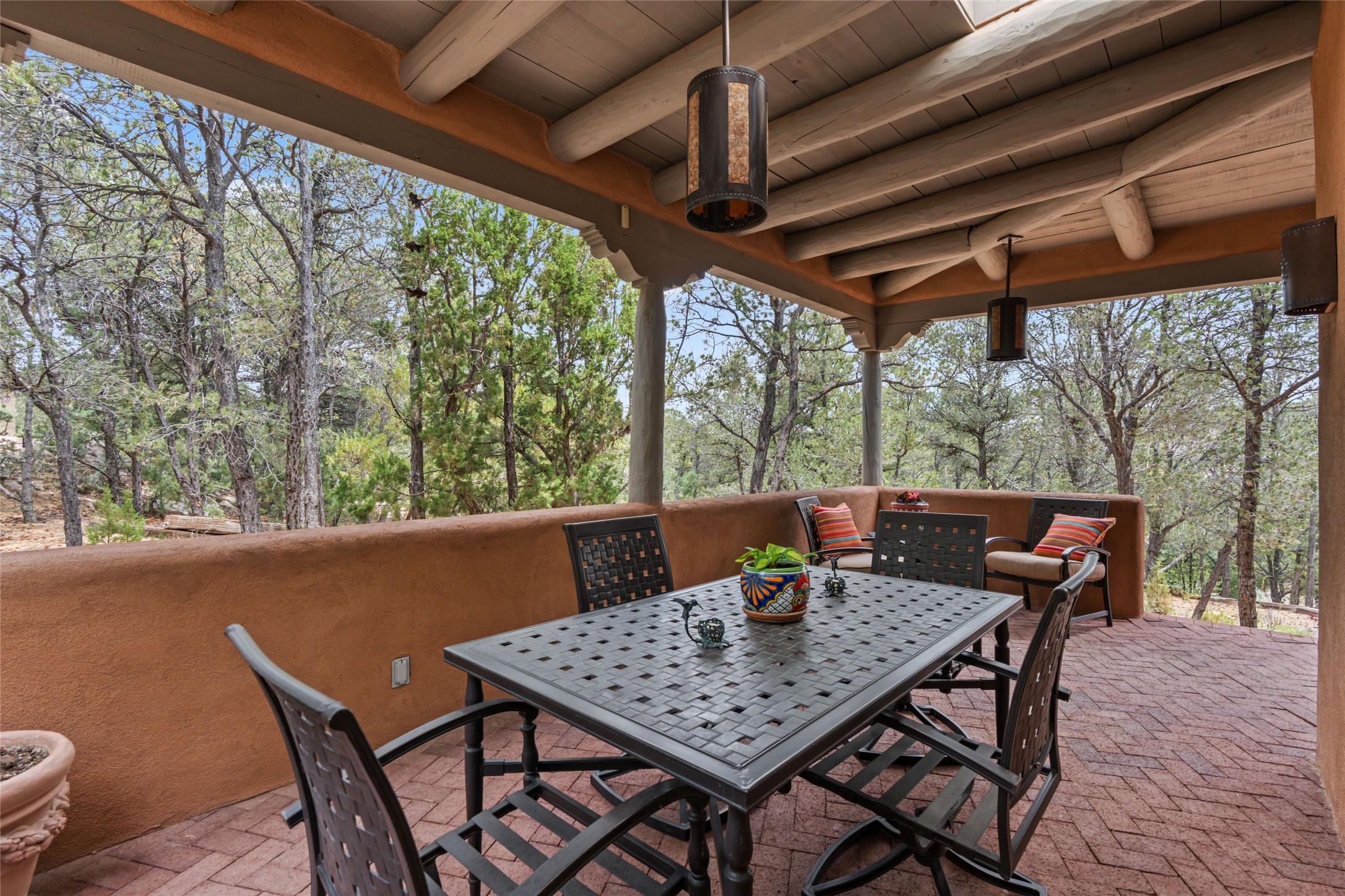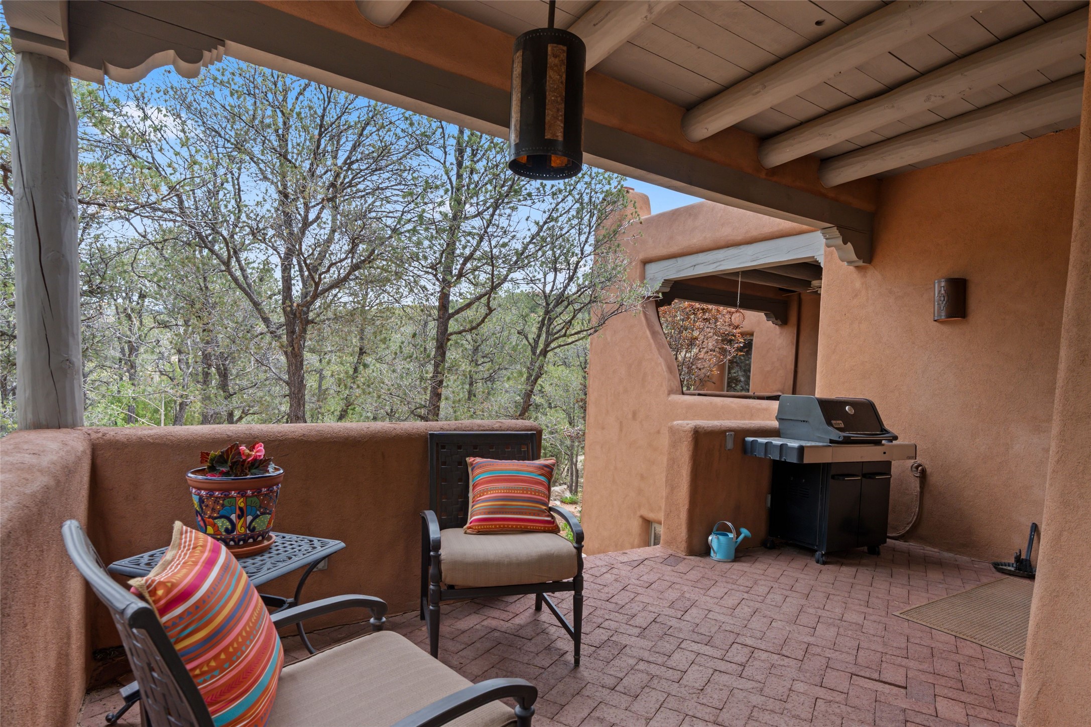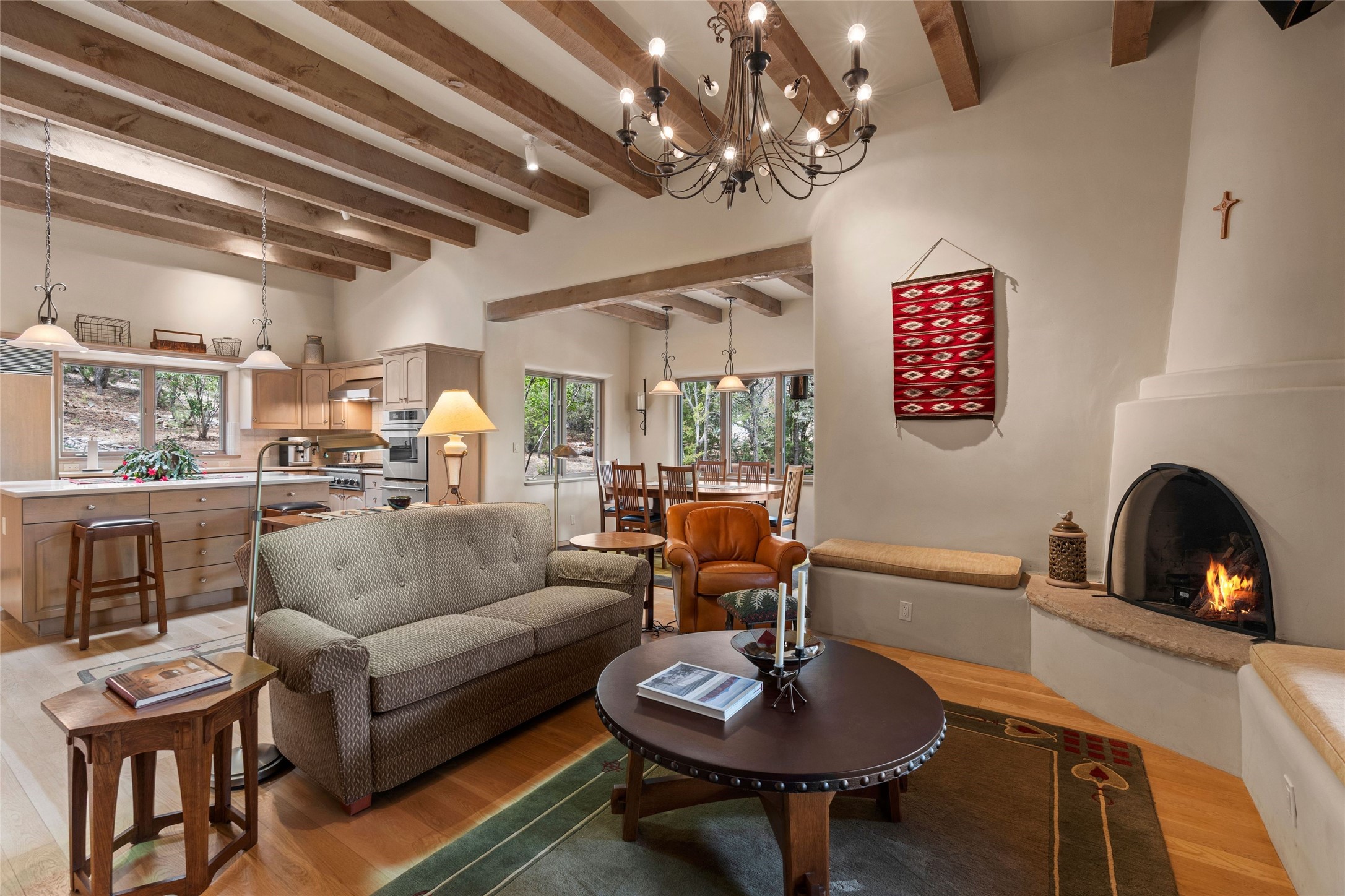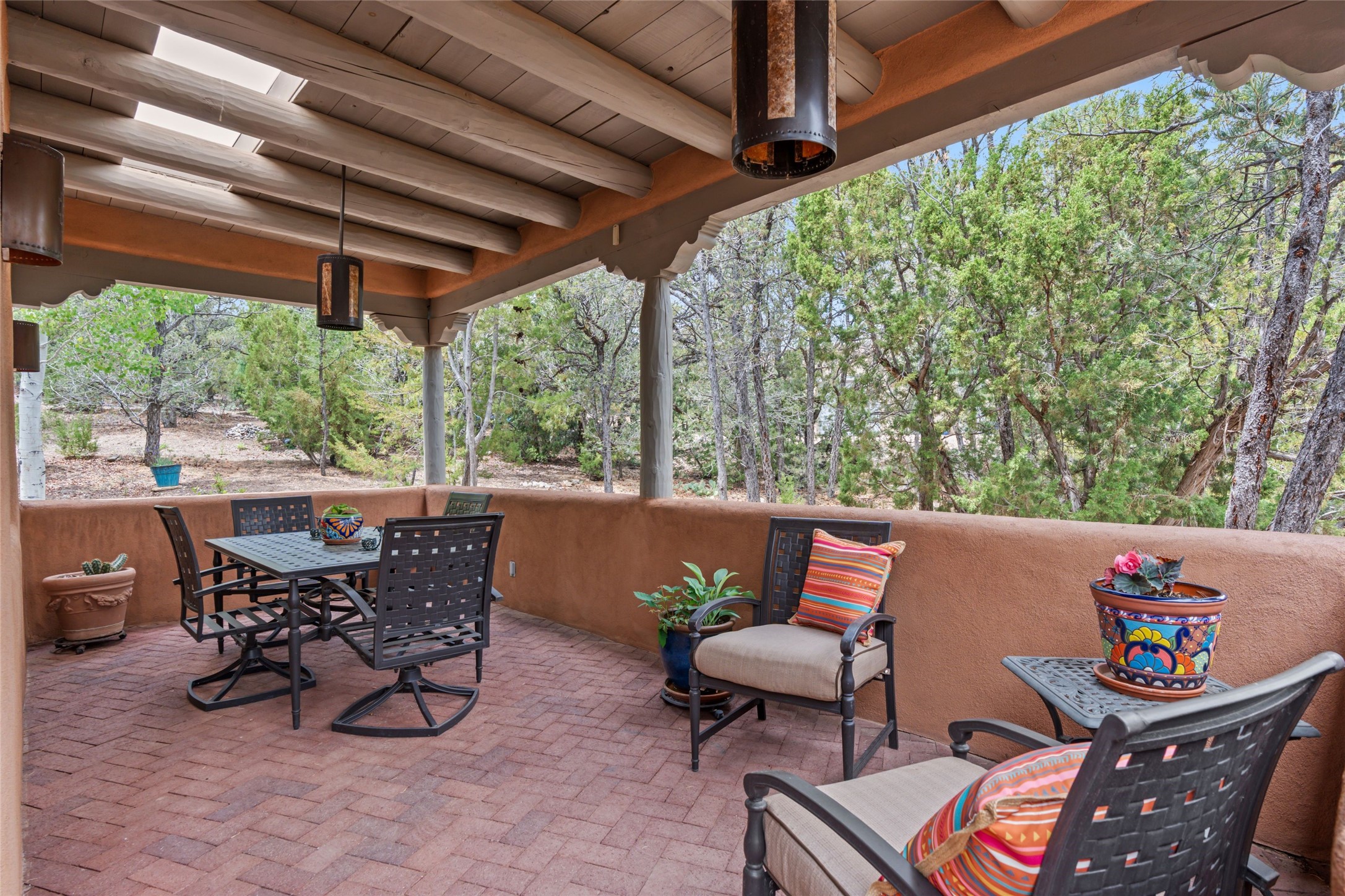 Tucked into the serene hills just above the historic Santa Fe Plaza, this timeless adobe-style residence offers the quintessential blend of Southwestern charm and refined privacy. With over 3,000 square feet of elegant living space, this three-bedroom sanctuary also includes a versatile den or office--perfect for quiet workdays or creative pursuits.Classic vigas, kiva fireplaces, and thick plaster walls showcase the rich architectural heritage of Northern New Mexico, while expansive windows frame peek-a-boo views of the surrounding mountains and distant sunsets. Thoughtfully positioned for tranquility, the property feels worlds away yet remains just minutes from the heart of Santa Fe's galleries, shops, and world-class dining.The open floor plan includes amazing access to multiple outdoor portals. Located on the main level, the primary suite features wood floors, his / hers closets and a sitting room just off the bath. On lower level you will find 2 guest bedrooms and a full bathroom. Whether hosting under the stars on a peaceful patio or retreating into a cozy reading nook, this home embodies the spirit of Santa Fe living--where authenticity meets effortless comfort.