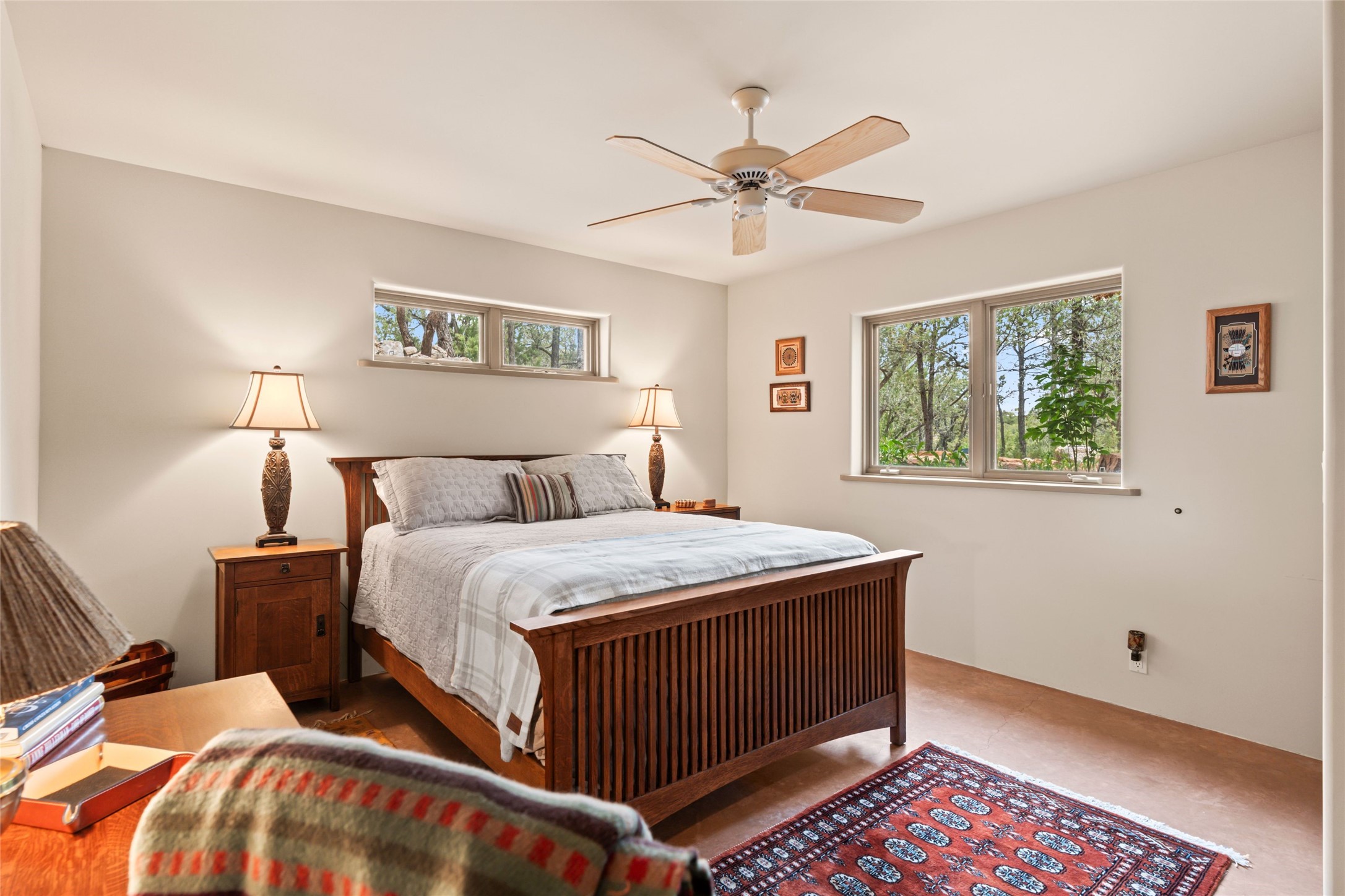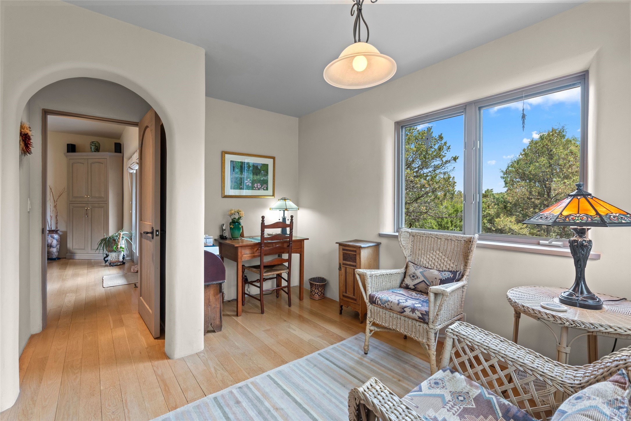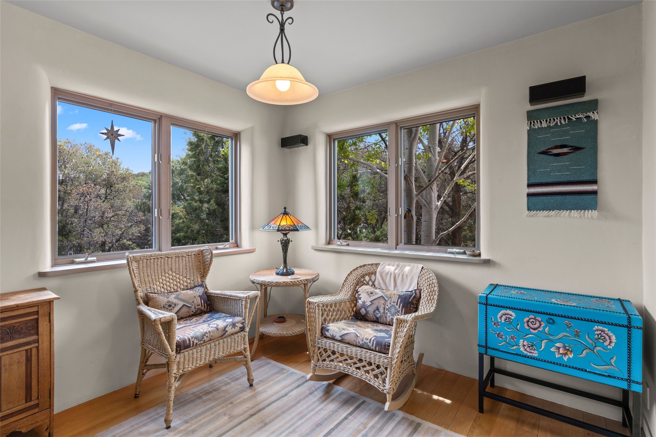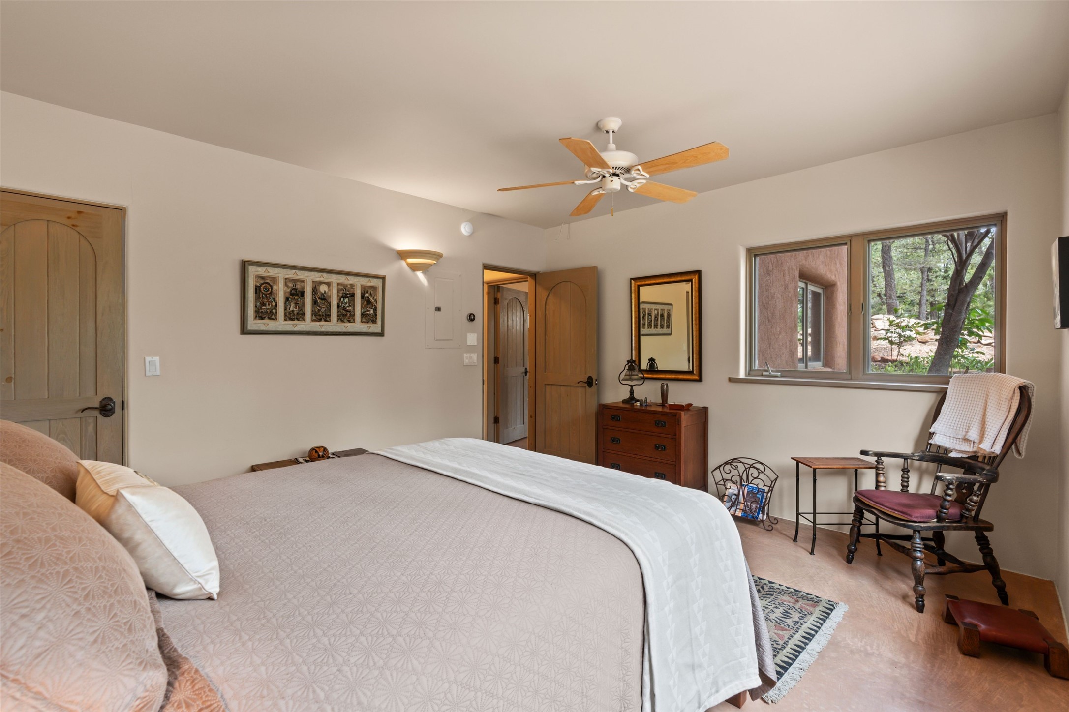 Tucked into the serene hills just above the historic Santa Fe Plaza, this timeless adobe-style residence offers the quintessential blend of Southwestern charm and refined privacy. With over 3,000 square feet of elegant living space, this three-bedroom sanctuary also includes a versatile den or office--perfect for quiet workdays or creative pursuits.Classic vigas, kiva fireplaces, and thick plaster walls showcase the rich architectural heritage of Northern New Mexico, while expansive windows frame peek-a-boo views of the surrounding mountains and distant sunsets. Thoughtfully positioned for tranquility, the property feels worlds away yet remains just minutes from the heart of Santa Fe's galleries, shops, and world-class dining.The open floor plan includes amazing access to multiple outdoor portals. Located on the main level, the primary suite features wood floors, his / hers closets and a sitting room just off the bath. On lower level you will find 2 guest bedrooms and a full bathroom. Whether hosting under the stars on a peaceful patio or retreating into a cozy reading nook, this home embodies the spirit of Santa Fe living--where authenticity meets effortless comfort.