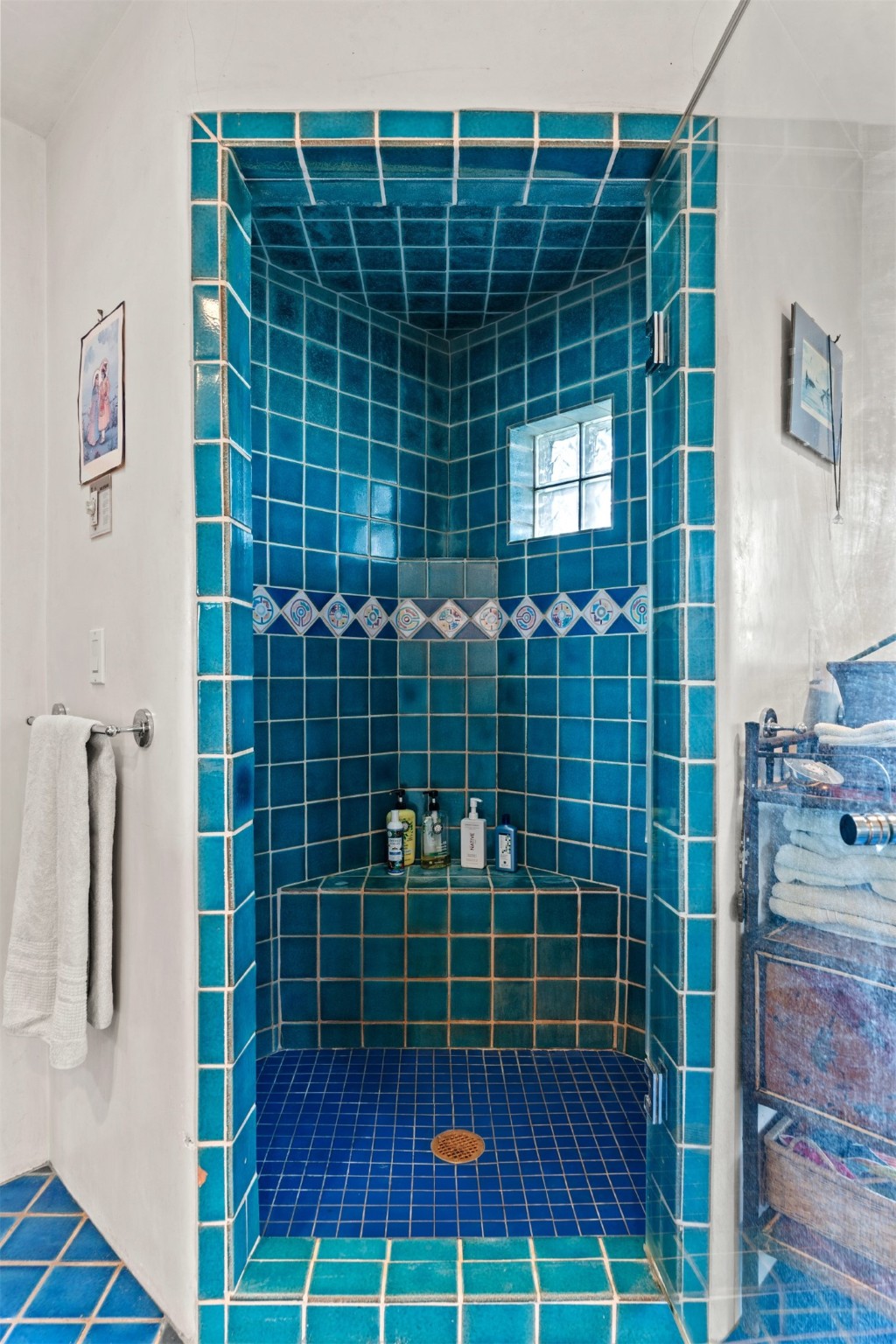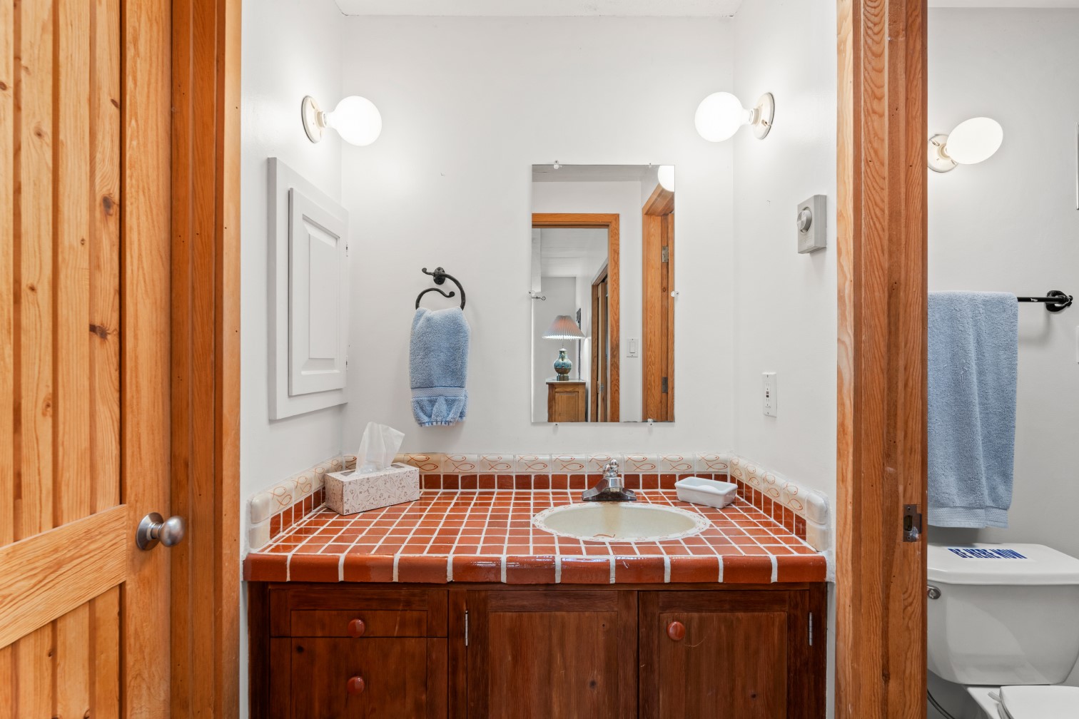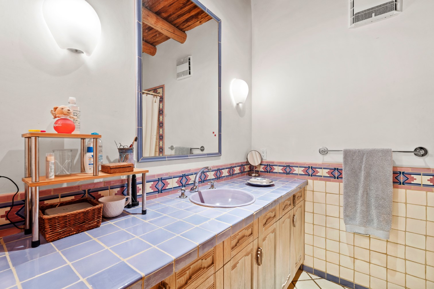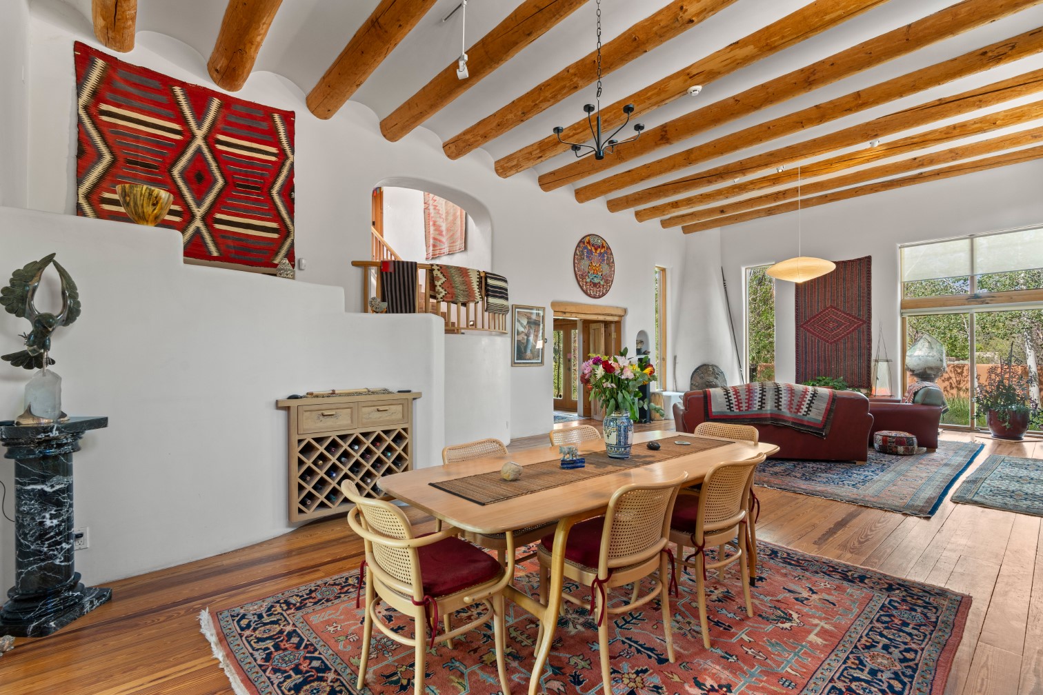 MAJESTIC UPPER EASTSIDE ESTATE - Discover the magic of this classic pueblo-style adobe compound off Upper Canyon Road - a serene oasis with magnificent views of the Sangre de Cristo and Jemez Mountains. Gated and fenced with private access to protected trails (Dorothy Stewart Trails), and on a cul-de-sac, the compound's gates swing open to reveal a stream and waterfall surrounded by day lilies, water lilies, irises, and verdant grasses embellishing extraordinary landscaping and gardens (featured in the 1997 Rizzoli book, Secret Gardens of Santa Fe). The adobe 4-bedroom main residence and 1-bedroom guest house are nestled within 1.14 acres of abundant aspens and towering blue spruce that frame the drama of distant mountains. Features of the main house include 6 fireplaces, ceilings of vigas, latillas and coves, antique doors, custom hardware, radiant under-floor heating, outdoor patios and portals, a media room, yoga studio, and 2-car garage. The upstairs primary suite includes a separate office and three outdoor spaces - a patio / portal, a separate balcony, and a spacious deck - and an elegant bath suite with a custom steam shower and whirlpool tub.