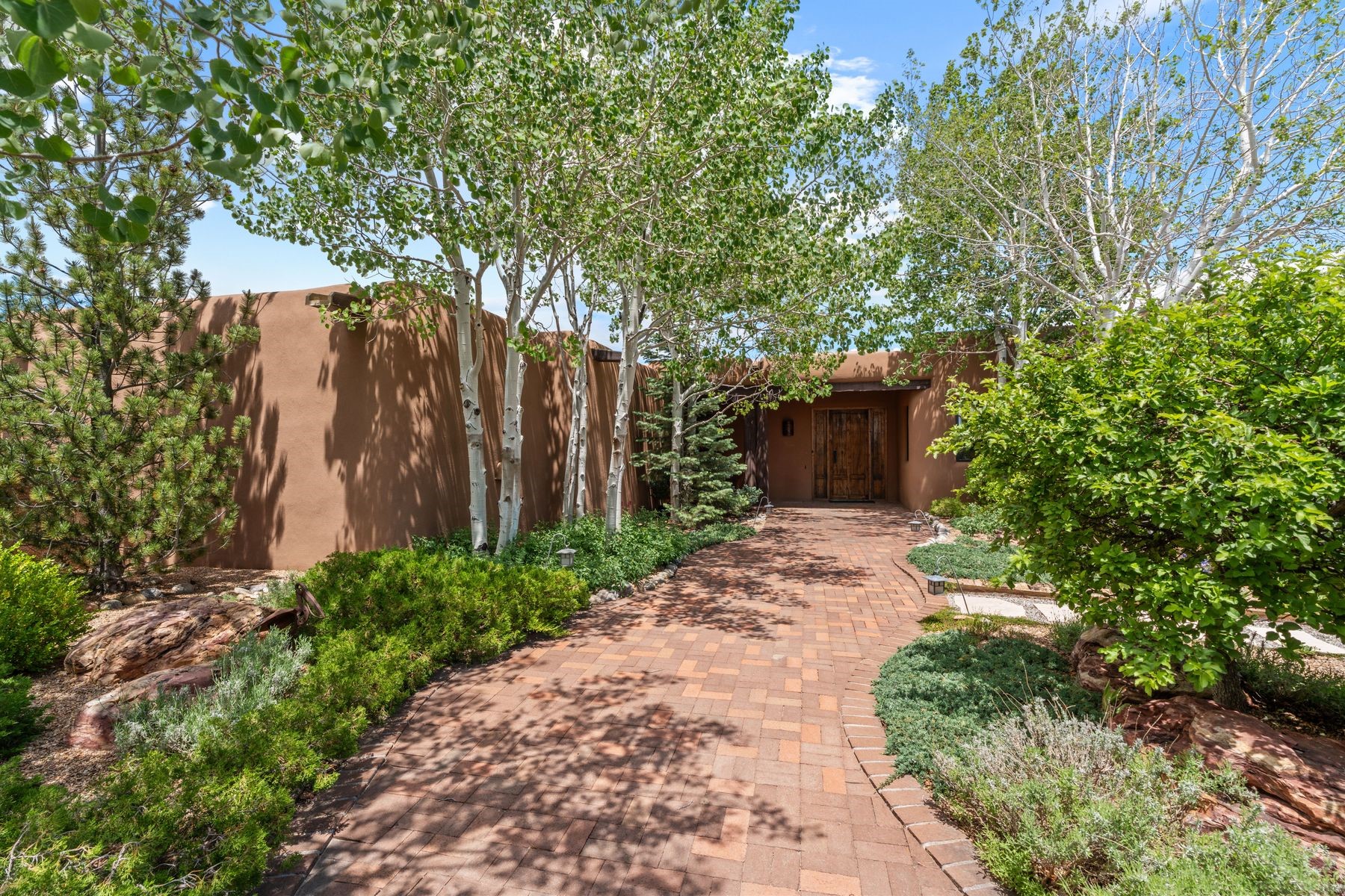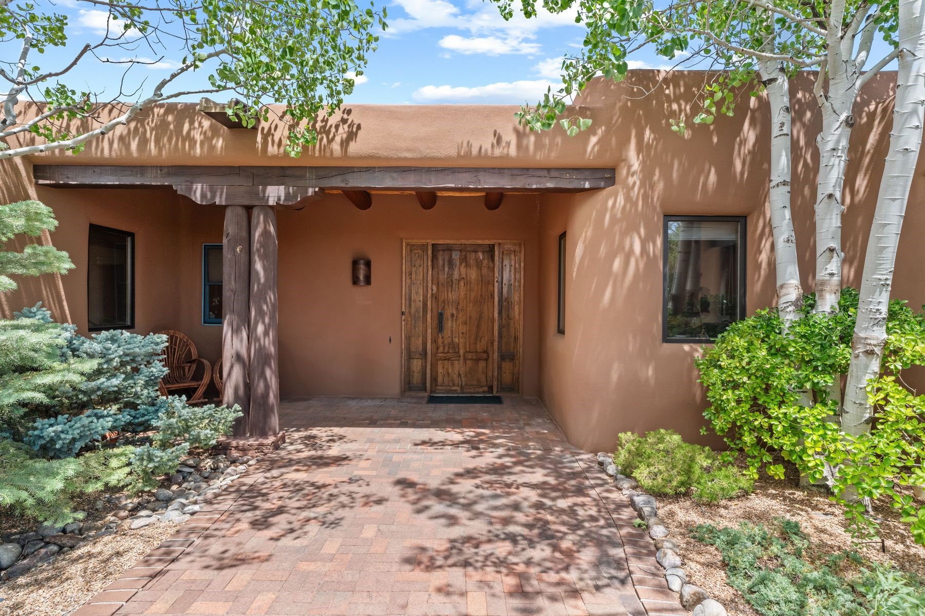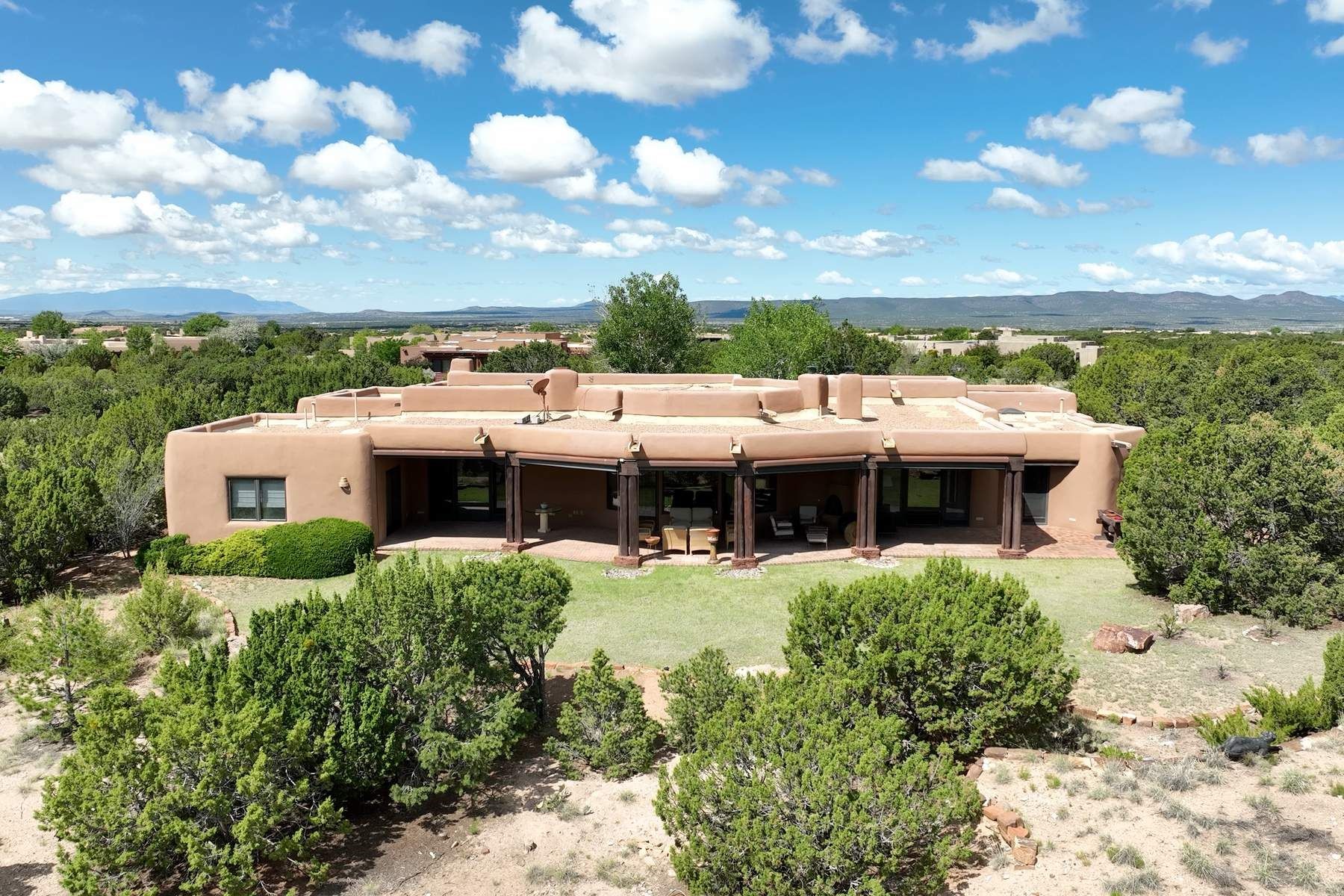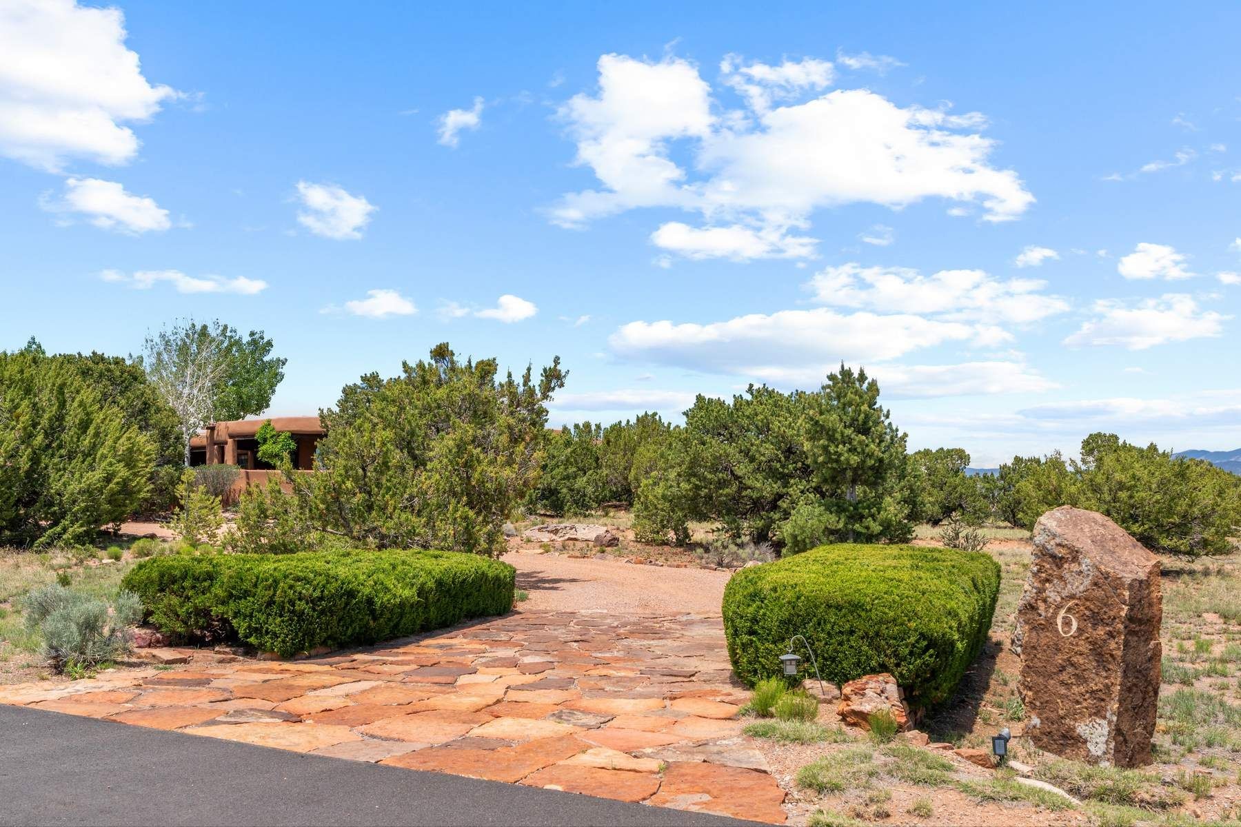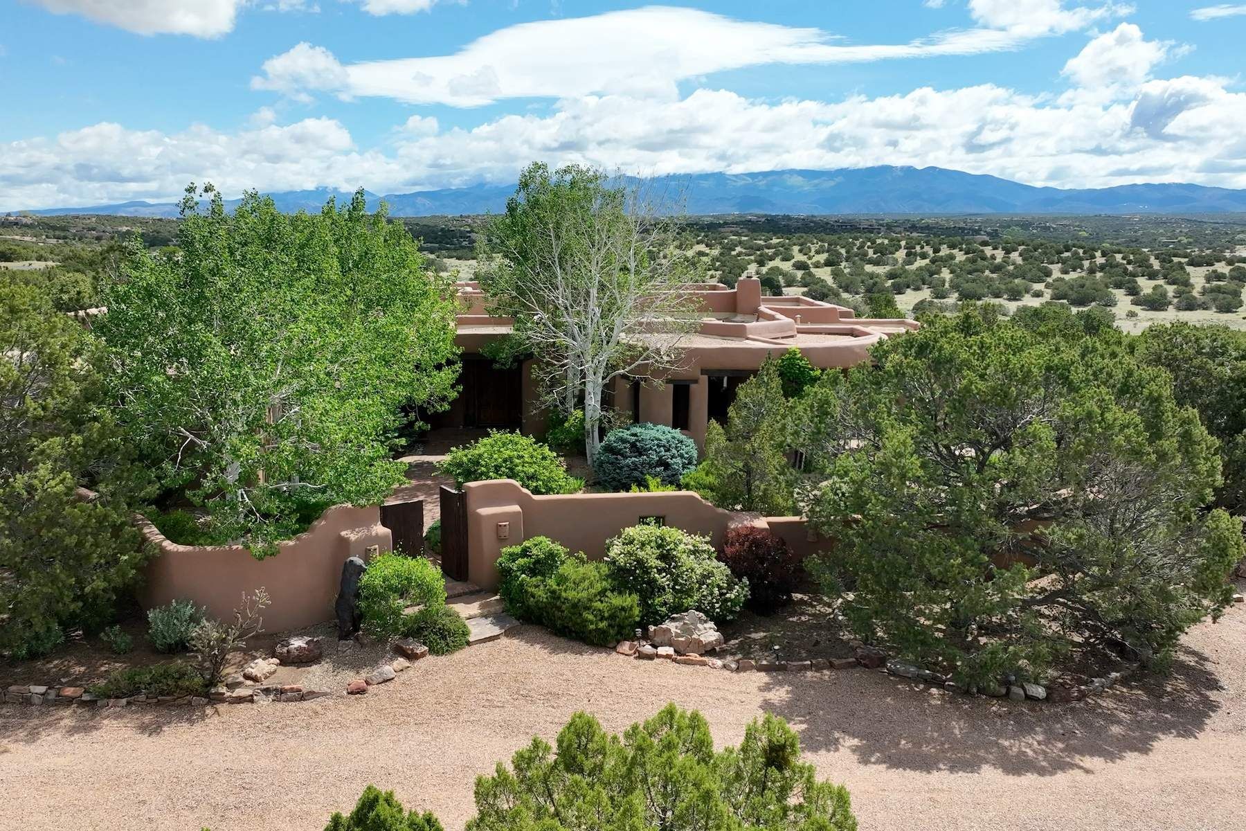 Located in the gated premier community of Las Campanas, 6 Rising Moon is a substantial adobe home offering 3 bedroom suites, 4 bathrooms, and approximately 1.86 acres of land. Set on a rise with unobstructed views to the east, the home takes in sweeping vistas of the Sangre de Cristo Mountains--framed dramatically through the living room's large windows and enjoyed from the deep portal and landscaped lawn of native grasses just beyond. Built in the classic Pueblo style, the home features thick adobe walls, hand-troweled plaster, vigas, flagstone floors, and Mexican-style tile in the bathrooms. The layout is both functional and generous: a large primary suite is set apart on one end of the house, with two guest suites on the other. In the center is a spacious living and dining room with high ceilings and eastern light, and an adjacent kitchen that opens to a breakfast nook and sitting area. There are no interior steps across the 4,553 square foot home, which also has a two-car garage with a large storage room. In-floor radiant heat and minisplits provide comfortable climate control in all seasons. This is the first time the home has been offered for sale by its original owner--a property of lasting quality, thoughtfully sited and full of character, ready for its next chapter