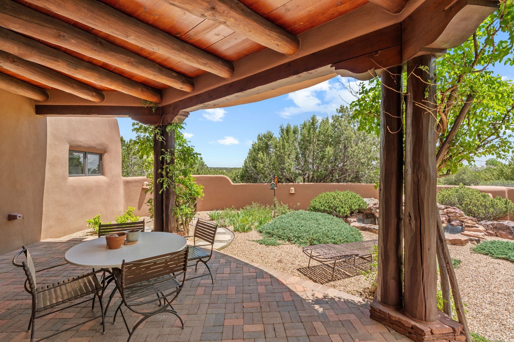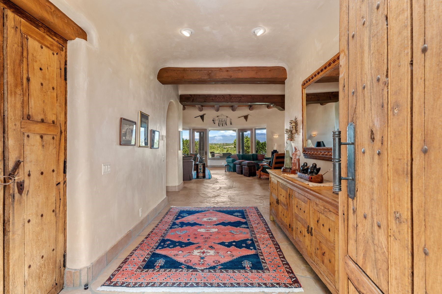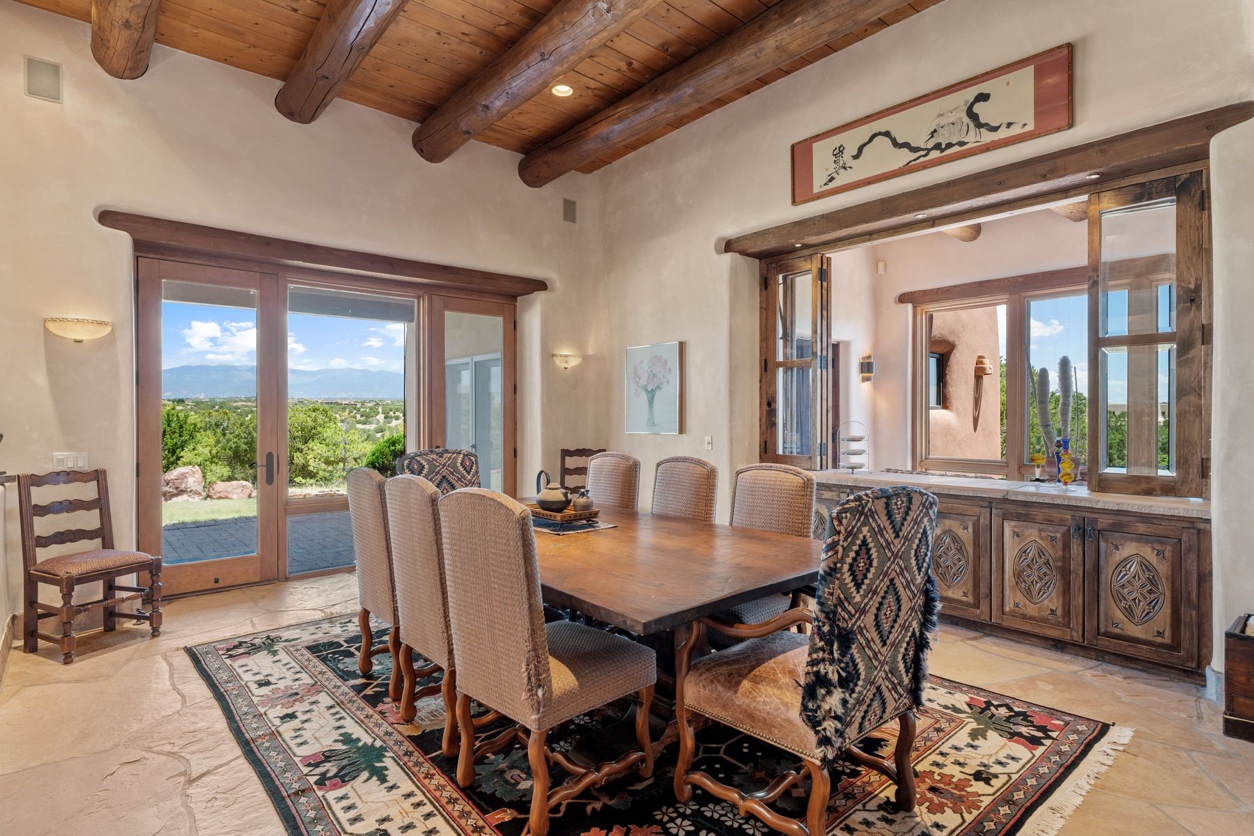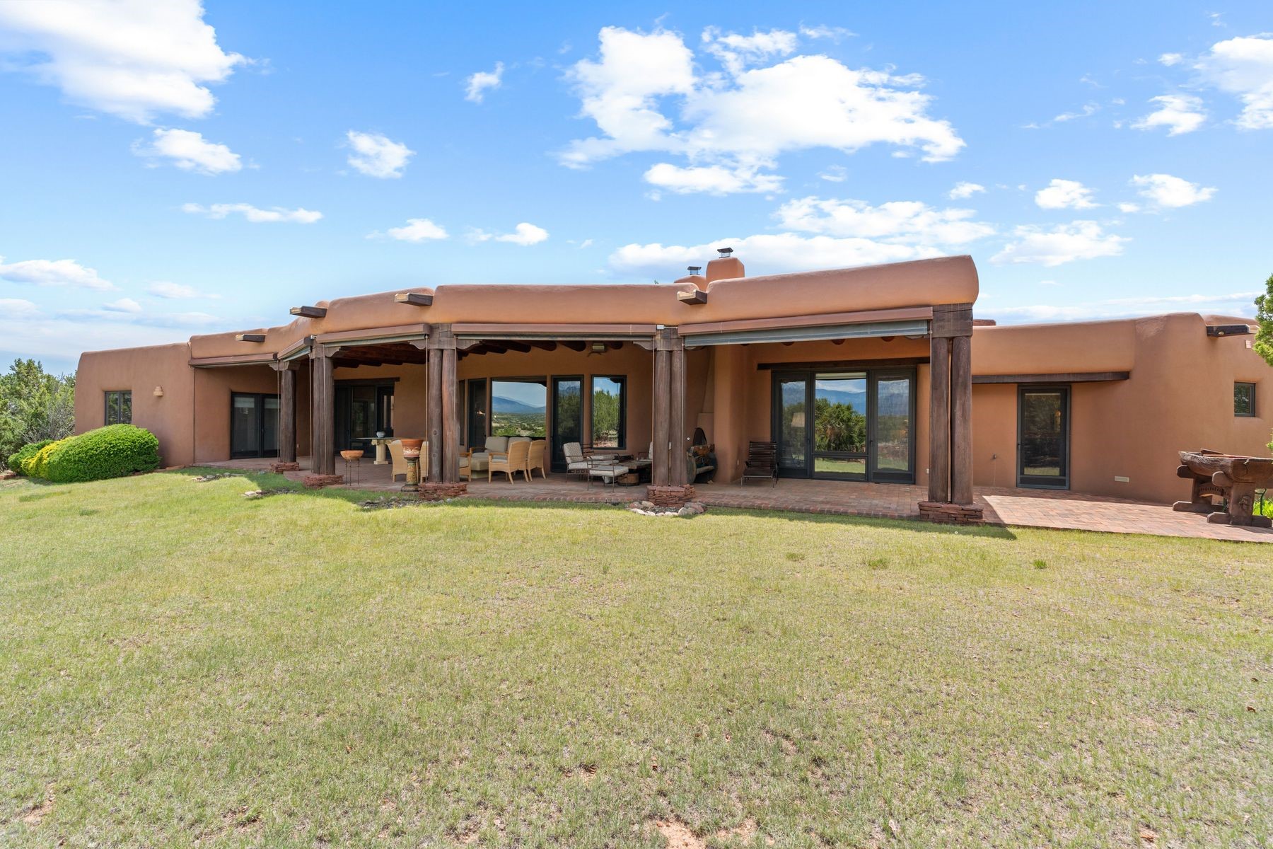 Located in the gated premier community of Las Campanas, 6 Rising Moon is a substantial adobe home offering 3 bedroom suites, 4 bathrooms, and approximately 1.86 acres of land. Set on a rise with unobstructed views to the east, the home takes in sweeping vistas of the Sangre de Cristo Mountains--framed dramatically through the living room's large windows and enjoyed from the deep portal and landscaped lawn of native grasses just beyond. Built in the classic Pueblo style, the home features thick adobe walls, hand-troweled plaster, vigas, flagstone floors, and Mexican-style tile in the bathrooms. The layout is both functional and generous: a large primary suite is set apart on one end of the house, with two guest suites on the other. In the center is a spacious living and dining room with high ceilings and eastern light, and an adjacent kitchen that opens to a breakfast nook and sitting area. There are no interior steps across the 4,553 square foot home, which also has a two-car garage with a large storage room. In-floor radiant heat and minisplits provide comfortable climate control in all seasons. This is the first time the home has been offered for sale by its original owner--a property of lasting quality, thoughtfully sited and full of character, ready for its next chapter