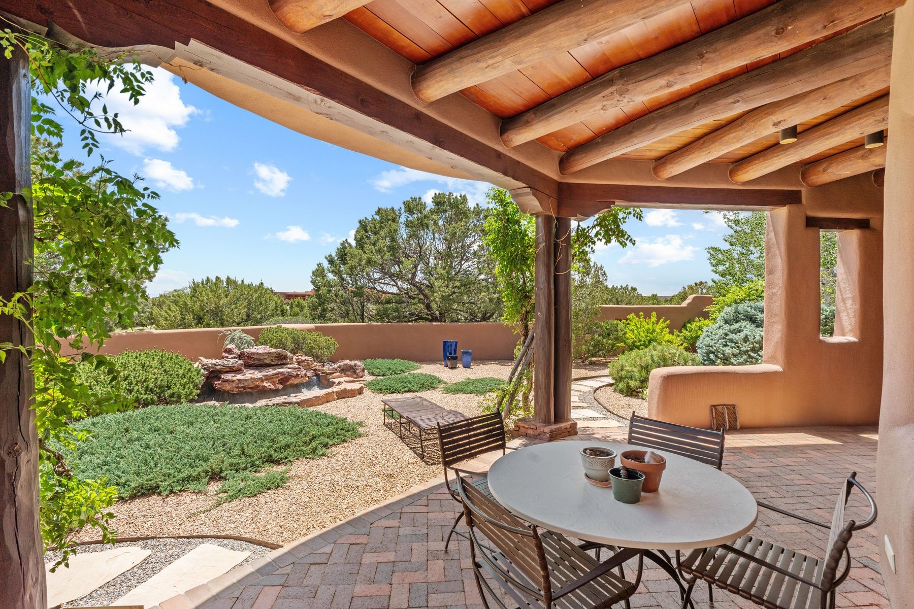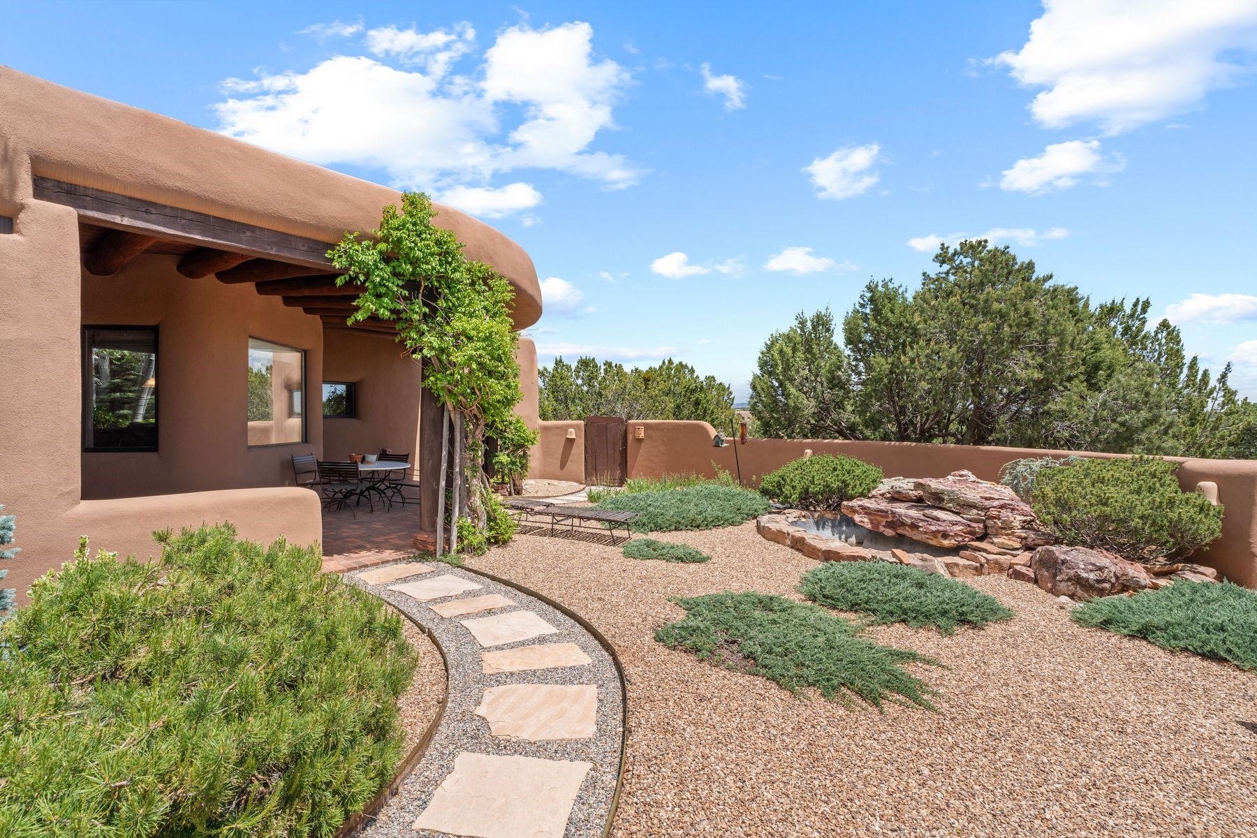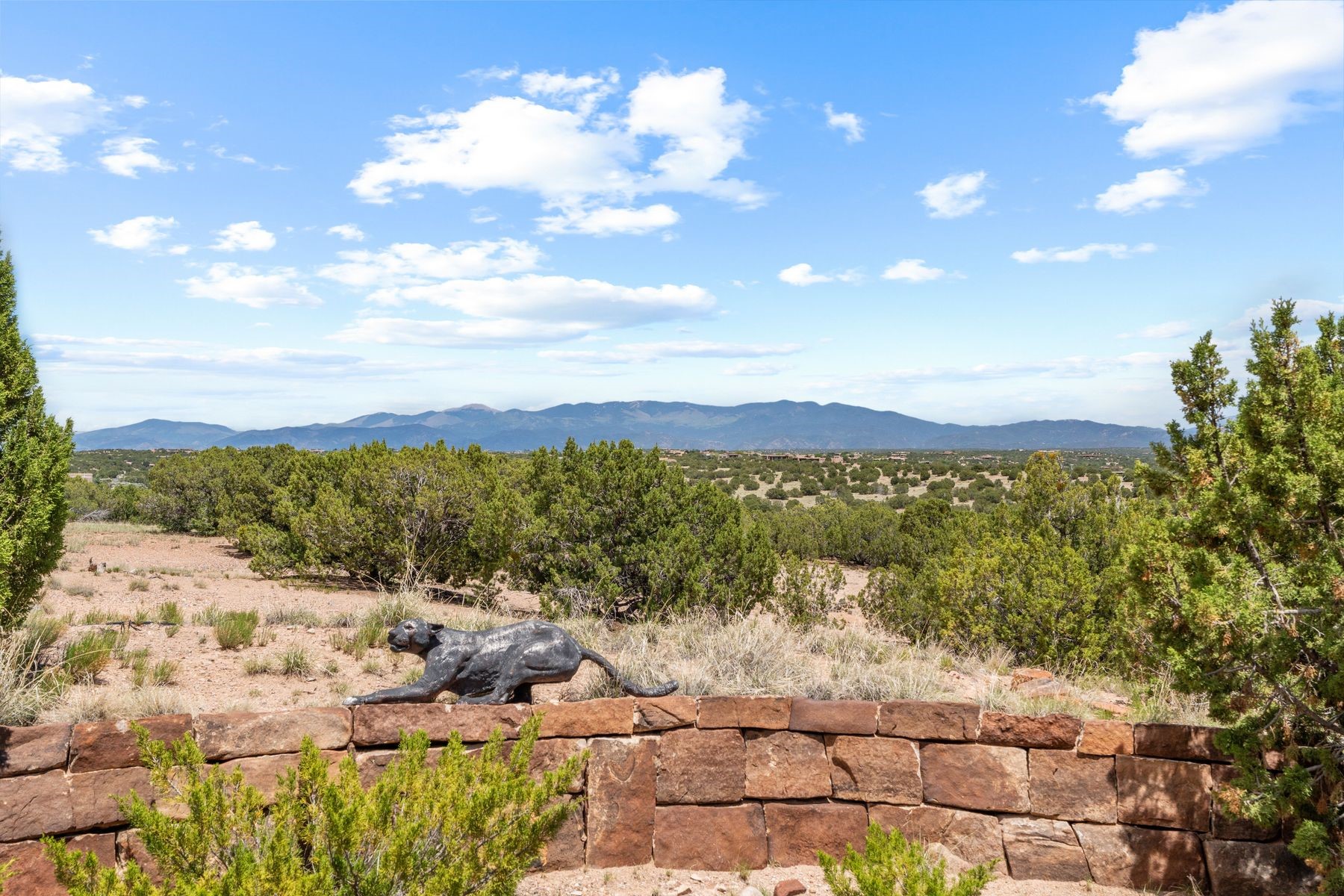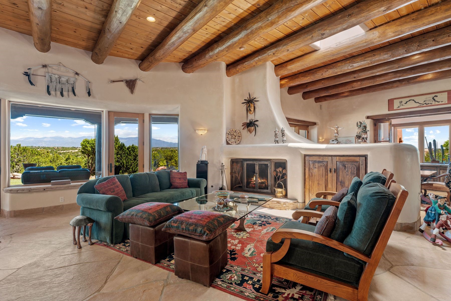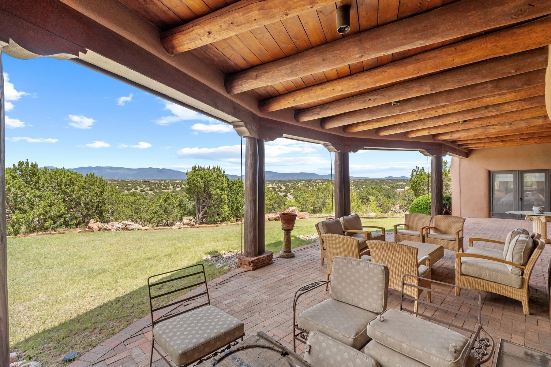 Located in the gated premier community of Las Campanas, 6 Rising Moon is a substantial adobe home offering 3 bedroom suites, 4 bathrooms, and approximately 1.86 acres of land. Set on a rise with unobstructed views to the east, the home takes in sweeping vistas of the Sangre de Cristo Mountains--framed dramatically through the living room's large windows and enjoyed from the deep portal and landscaped lawn of native grasses just beyond. Built in the classic Pueblo style, the home features thick adobe walls, hand-troweled plaster, vigas, flagstone floors, and Mexican-style tile in the bathrooms. The layout is both functional and generous: a large primary suite is set apart on one end of the house, with two guest suites on the other. In the center is a spacious living and dining room with high ceilings and eastern light, and an adjacent kitchen that opens to a breakfast nook and sitting area. There are no interior steps across the 4,553 square foot home, which also has a two-car garage with a large storage room. In-floor radiant heat and minisplits provide comfortable climate control in all seasons. This is the first time the home has been offered for sale by its original owner--a property of lasting quality, thoughtfully sited and full of character, ready for its next chapter