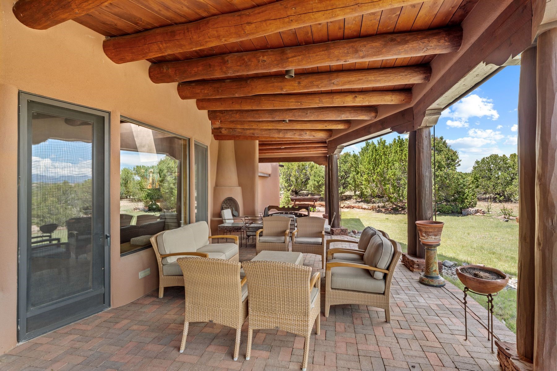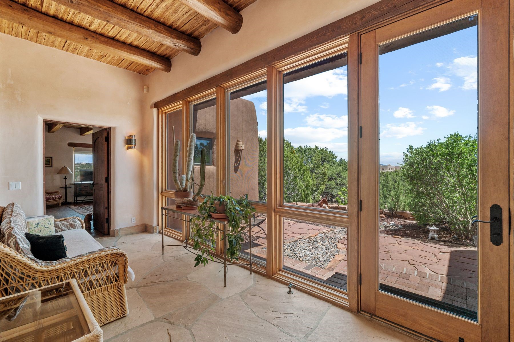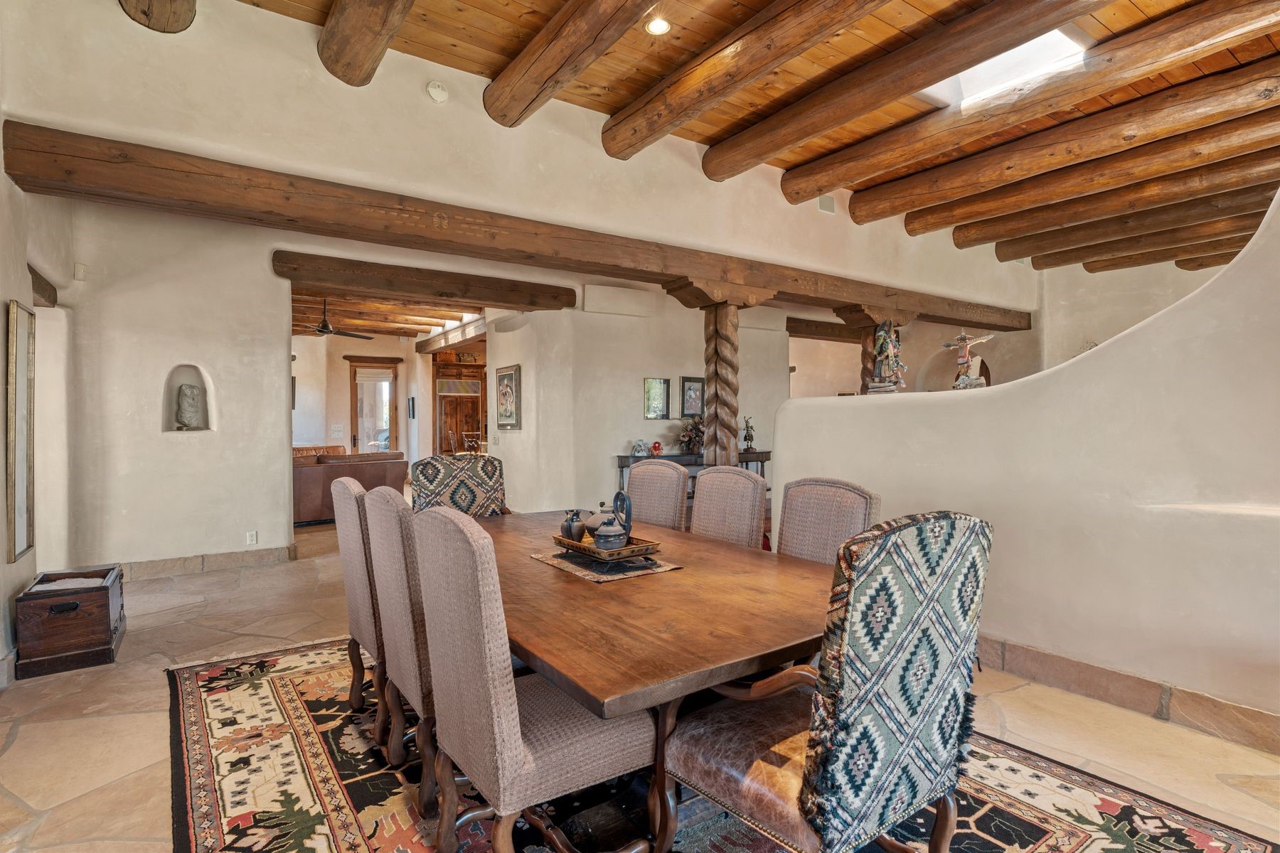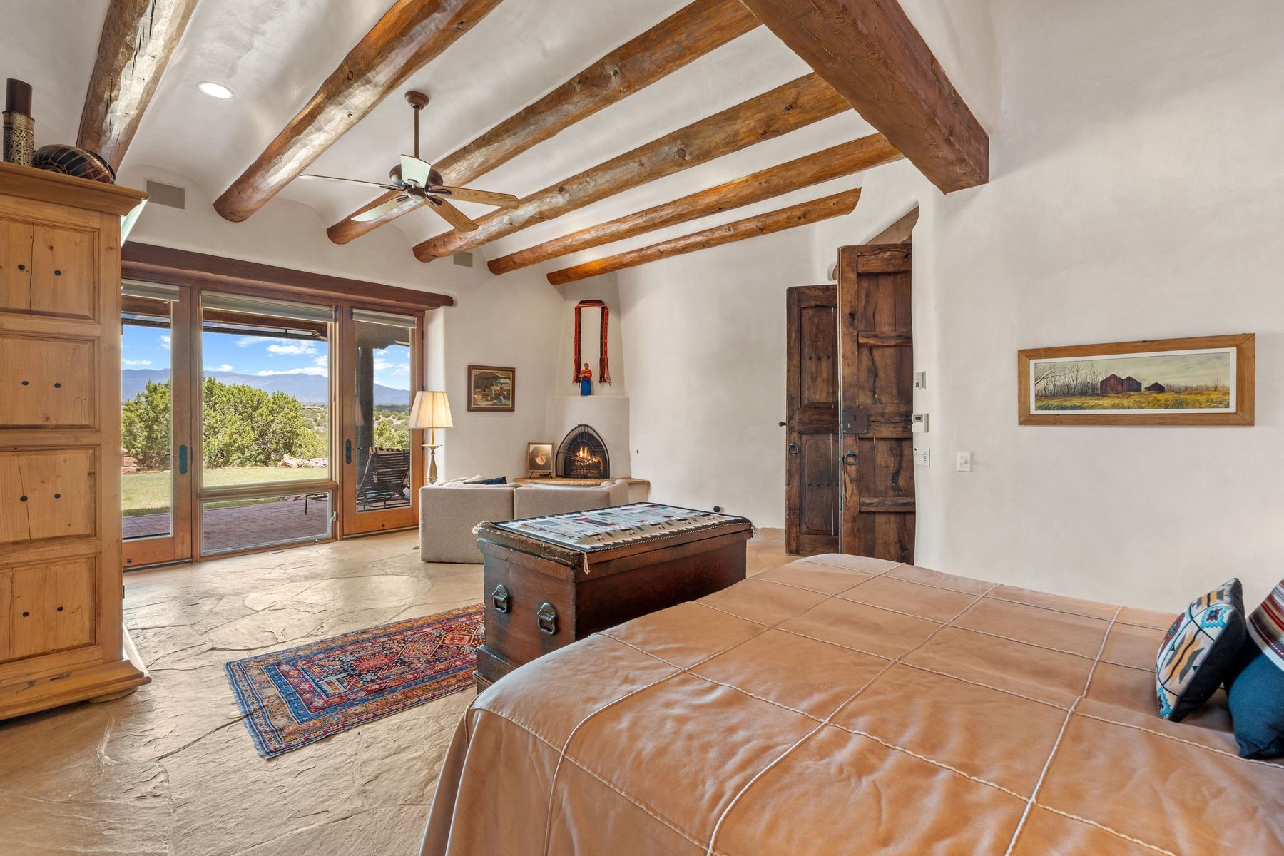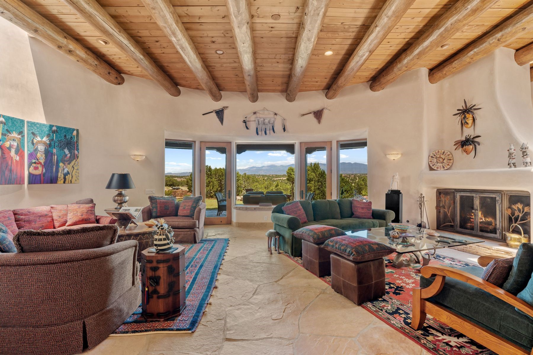 Located in the gated premier community of Las Campanas, 6 Rising Moon is a substantial adobe home offering 3 bedroom suites, 4 bathrooms, and approximately 1.86 acres of land. Set on a rise with unobstructed views to the east, the home takes in sweeping vistas of the Sangre de Cristo Mountains--framed dramatically through the living room's large windows and enjoyed from the deep portal and landscaped lawn of native grasses just beyond. Built in the classic Pueblo style, the home features thick adobe walls, hand-troweled plaster, vigas, flagstone floors, and Mexican-style tile in the bathrooms. The layout is both functional and generous: a large primary suite is set apart on one end of the house, with two guest suites on the other. In the center is a spacious living and dining room with high ceilings and eastern light, and an adjacent kitchen that opens to a breakfast nook and sitting area. There are no interior steps across the 4,553 square foot home, which also has a two-car garage with a large storage room. In-floor radiant heat and minisplits provide comfortable climate control in all seasons. This is the first time the home has been offered for sale by its original owner--a property of lasting quality, thoughtfully sited and full of character, ready for its next chapter
