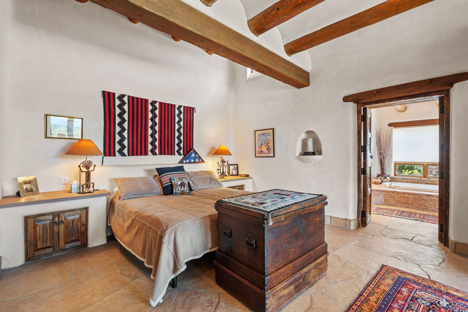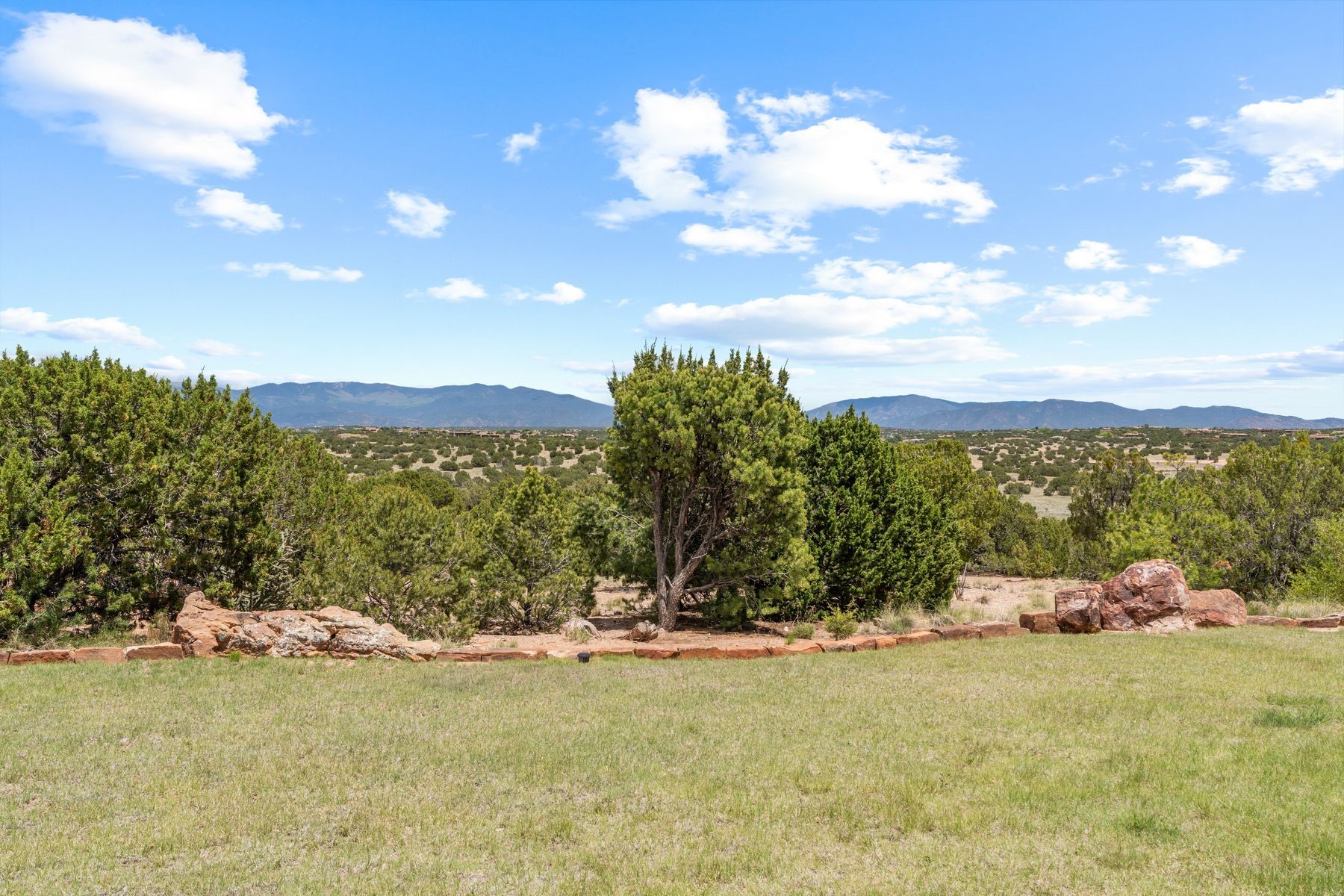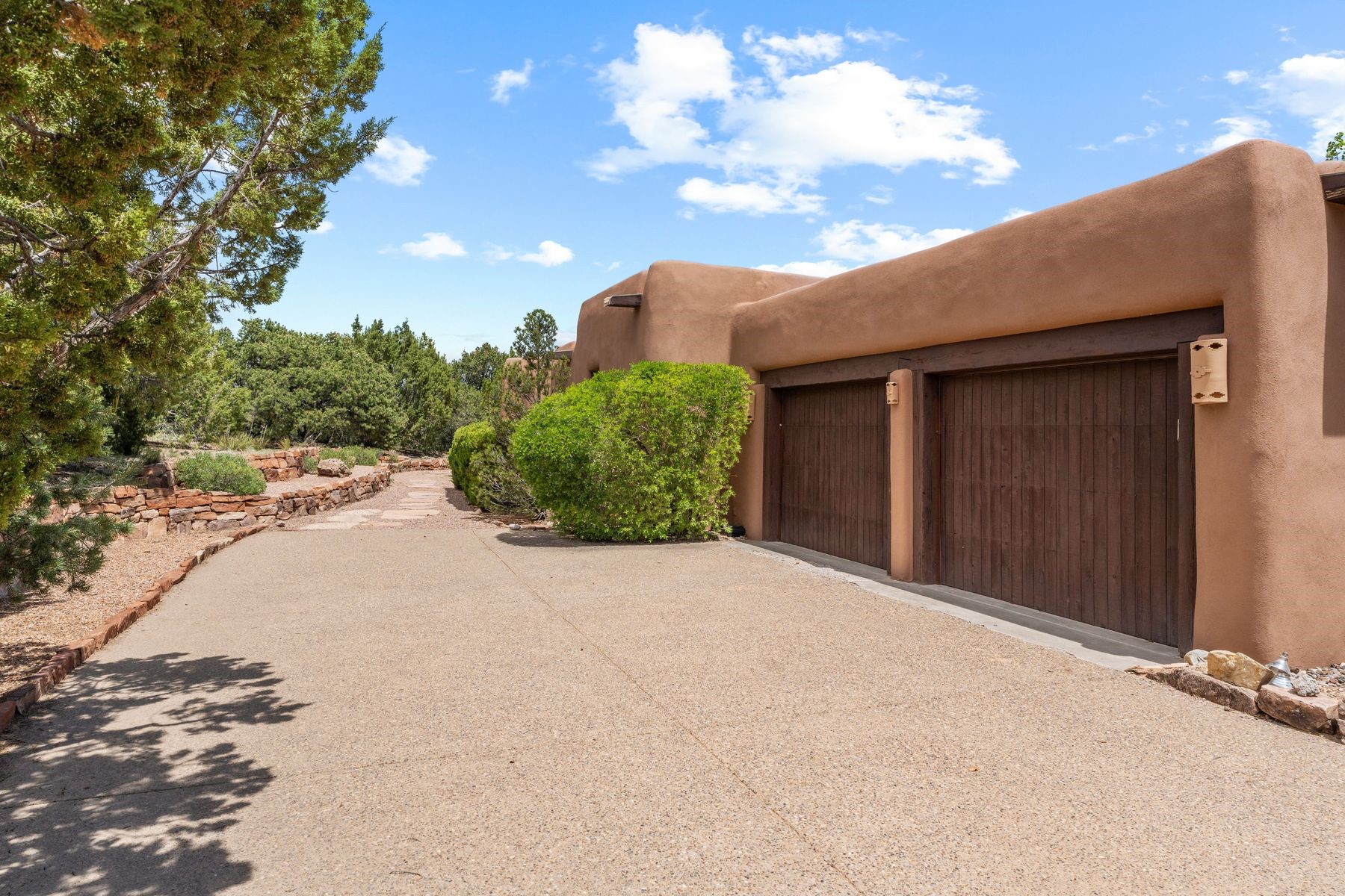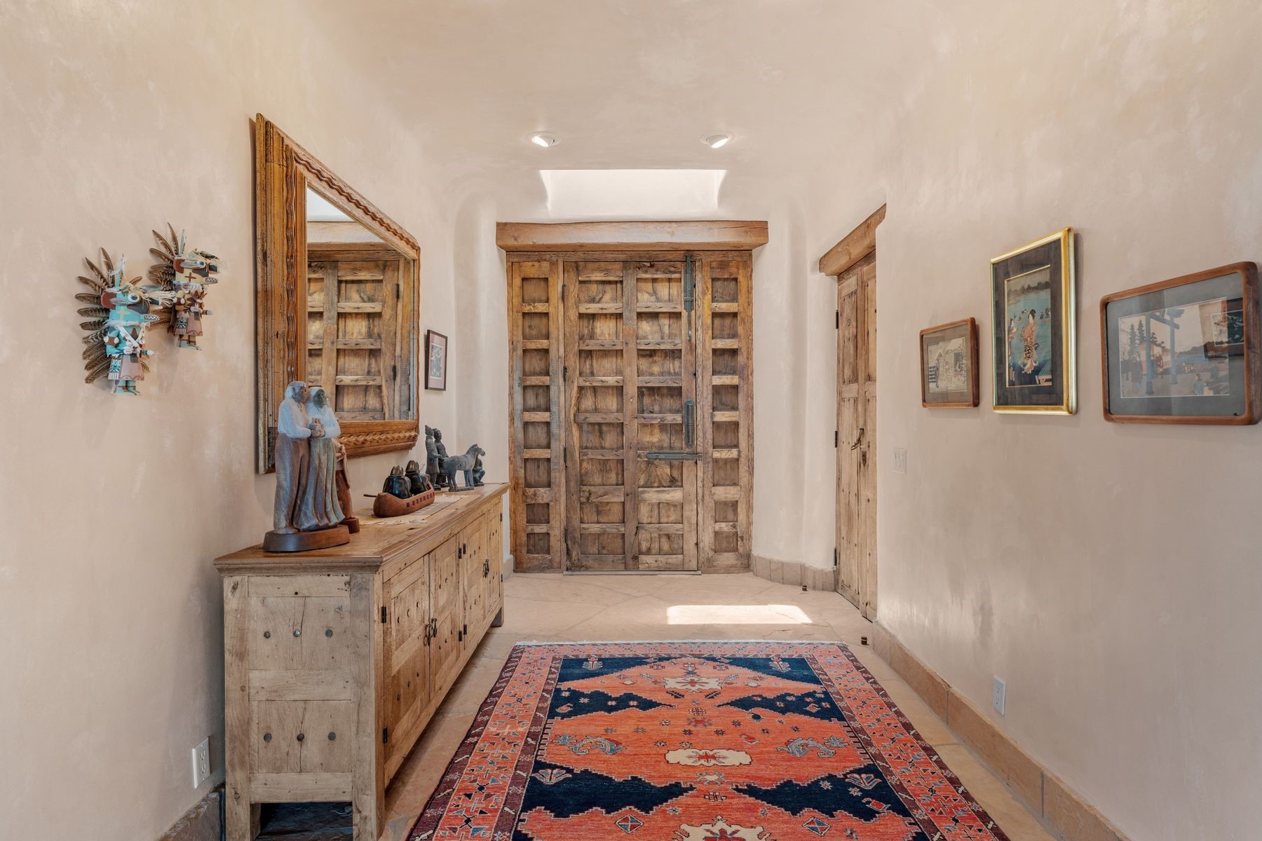 Located in the gated premier community of Las Campanas, 6 Rising Moon is a substantial adobe home offering 3 bedroom suites, 4 bathrooms, and approximately 1.86 acres of land. Set on a rise with unobstructed views to the east, the home takes in sweeping vistas of the Sangre de Cristo Mountains--framed dramatically through the living room's large windows and enjoyed from the deep portal and landscaped lawn of native grasses just beyond. Built in the classic Pueblo style, the home features thick adobe walls, hand-troweled plaster, vigas, flagstone floors, and Mexican-style tile in the bathrooms. The layout is both functional and generous: a large primary suite is set apart on one end of the house, with two guest suites on the other. In the center is a spacious living and dining room with high ceilings and eastern light, and an adjacent kitchen that opens to a breakfast nook and sitting area. There are no interior steps across the 4,553 square foot home, which also has a two-car garage with a large storage room. In-floor radiant heat and minisplits provide comfortable climate control in all seasons. This is the first time the home has been offered for sale by its original owner--a property of lasting quality, thoughtfully sited and full of character, ready for its next chapter