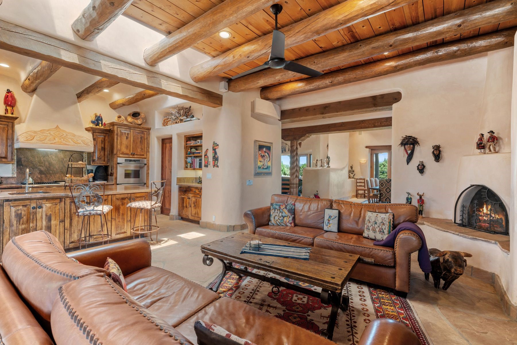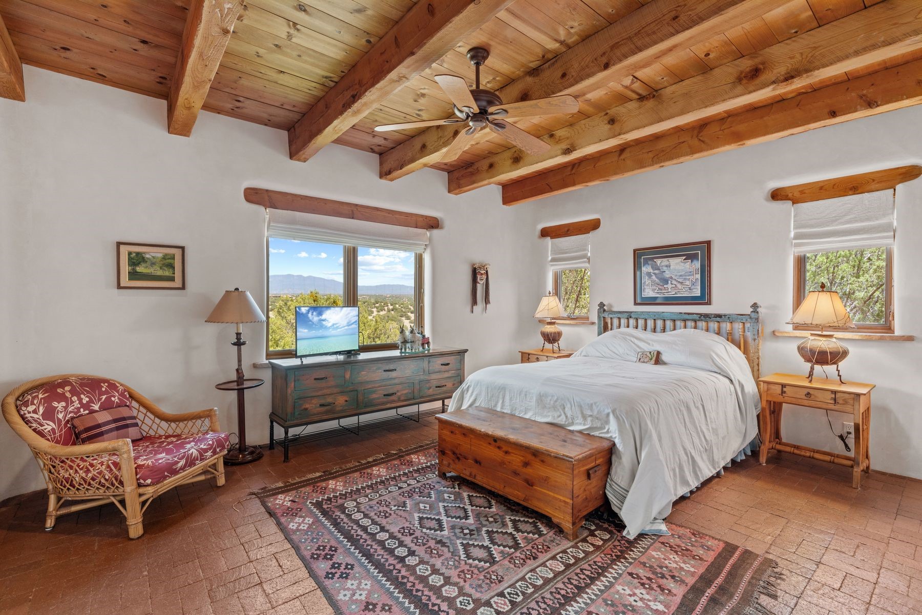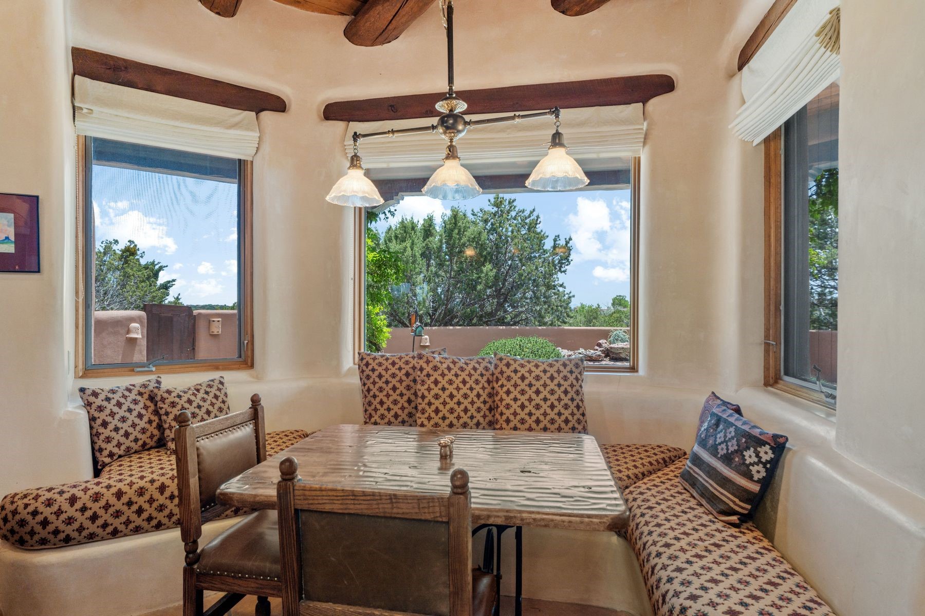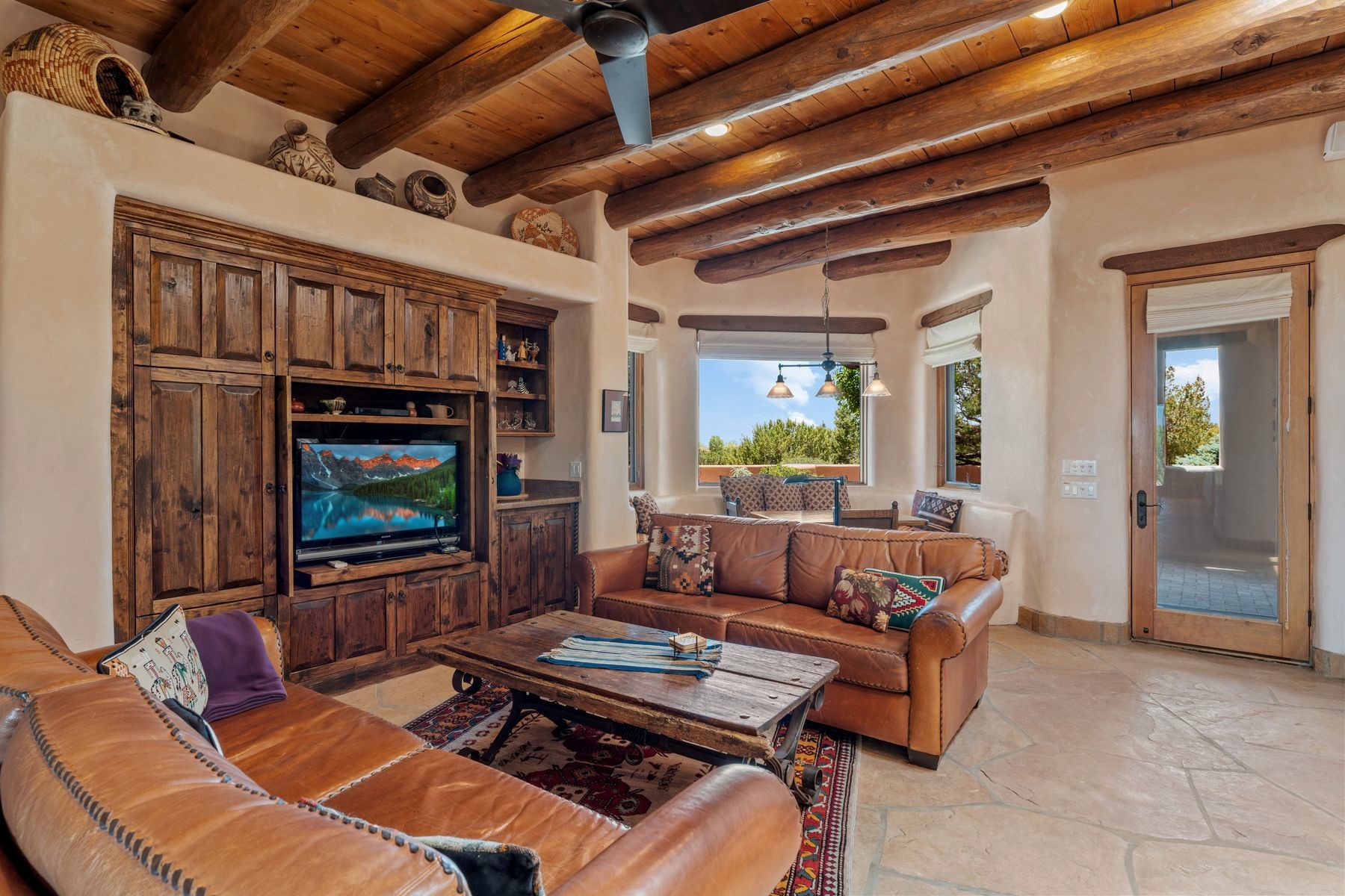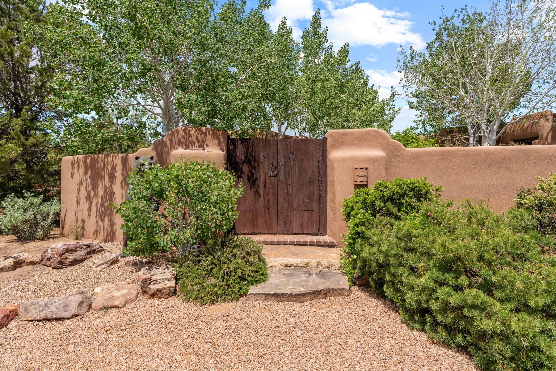 Located in the gated premier community of Las Campanas, 6 Rising Moon is a substantial adobe home offering 3 bedroom suites, 4 bathrooms, and approximately 1.86 acres of land. Set on a rise with unobstructed views to the east, the home takes in sweeping vistas of the Sangre de Cristo Mountains--framed dramatically through the living room's large windows and enjoyed from the deep portal and landscaped lawn of native grasses just beyond. Built in the classic Pueblo style, the home features thick adobe walls, hand-troweled plaster, vigas, flagstone floors, and Mexican-style tile in the bathrooms. The layout is both functional and generous: a large primary suite is set apart on one end of the house, with two guest suites on the other. In the center is a spacious living and dining room with high ceilings and eastern light, and an adjacent kitchen that opens to a breakfast nook and sitting area. There are no interior steps across the 4,553 square foot home, which also has a two-car garage with a large storage room. In-floor radiant heat and minisplits provide comfortable climate control in all seasons. This is the first time the home has been offered for sale by its original owner--a property of lasting quality, thoughtfully sited and full of character, ready for its next chapter