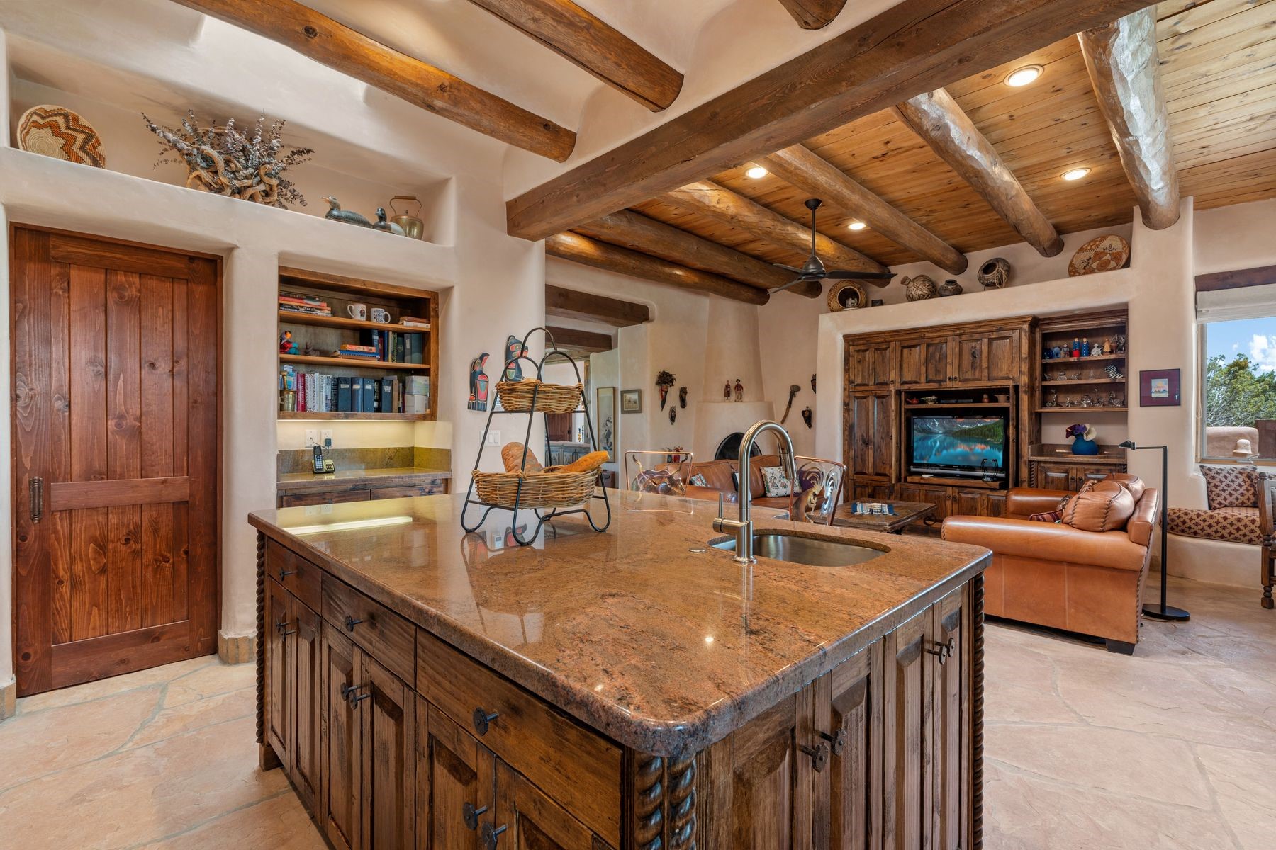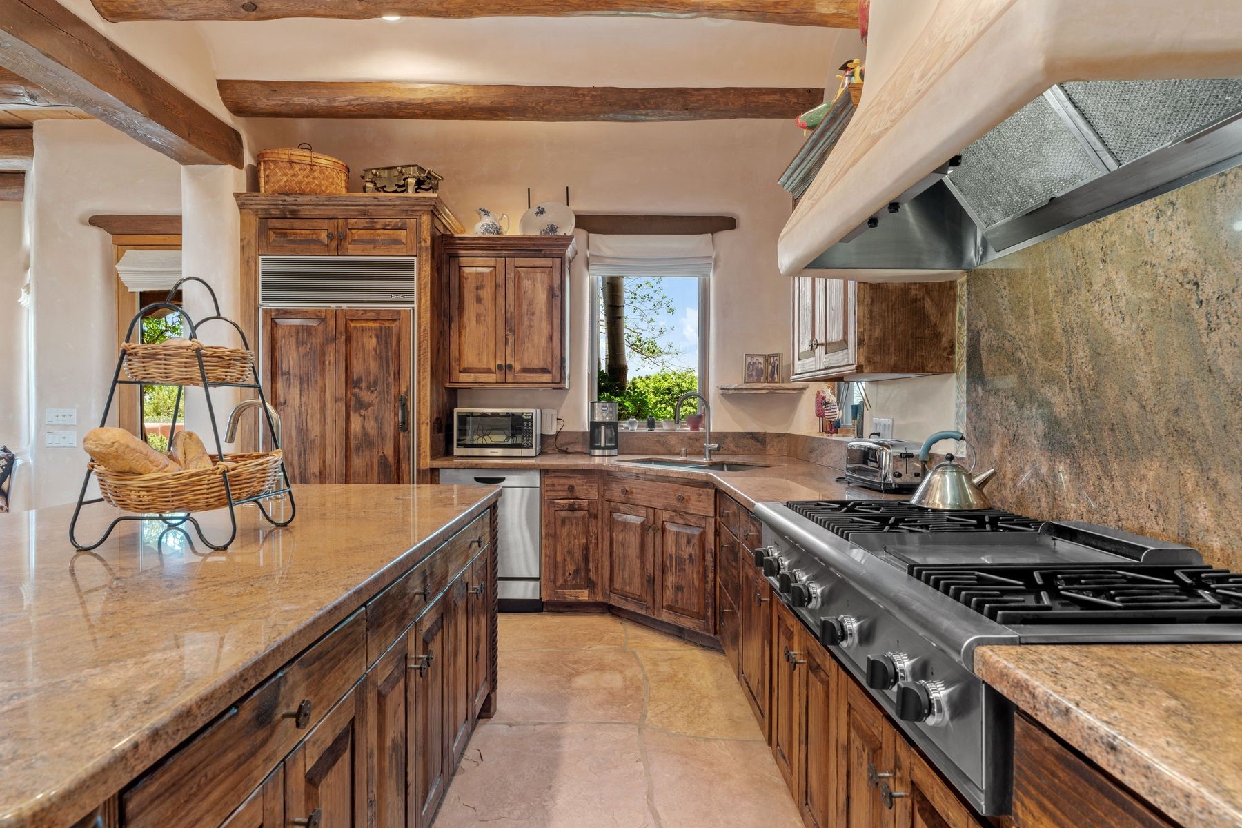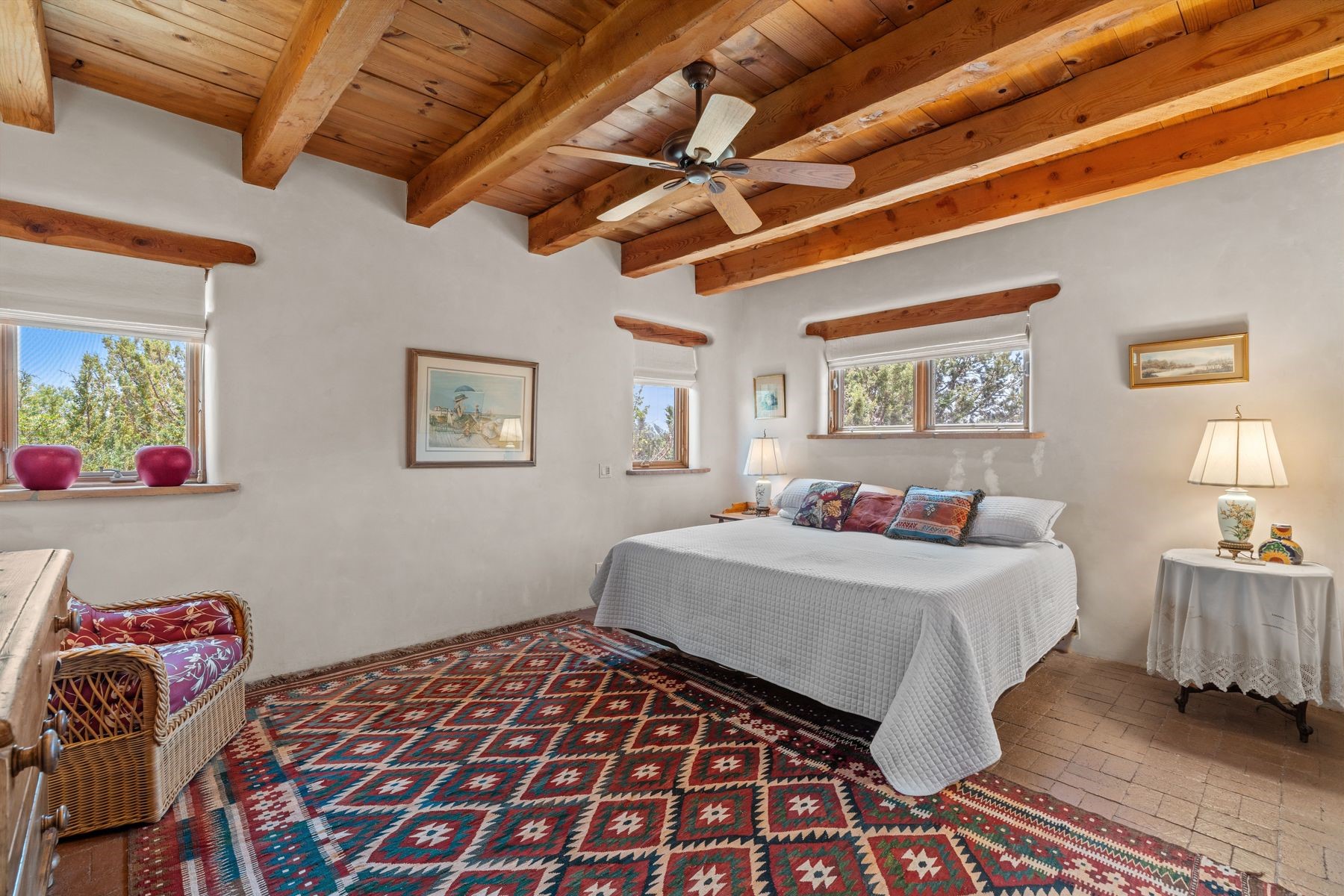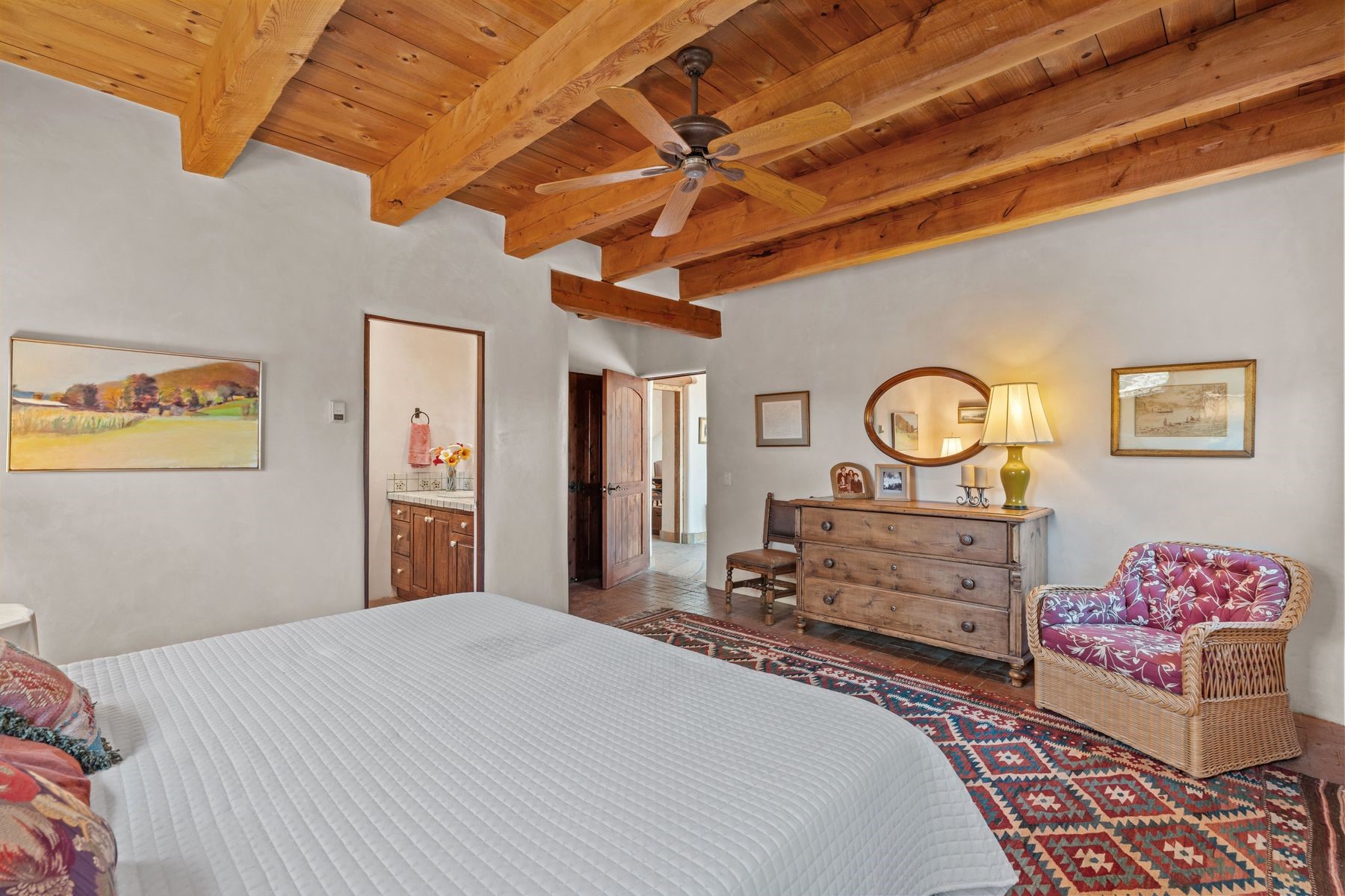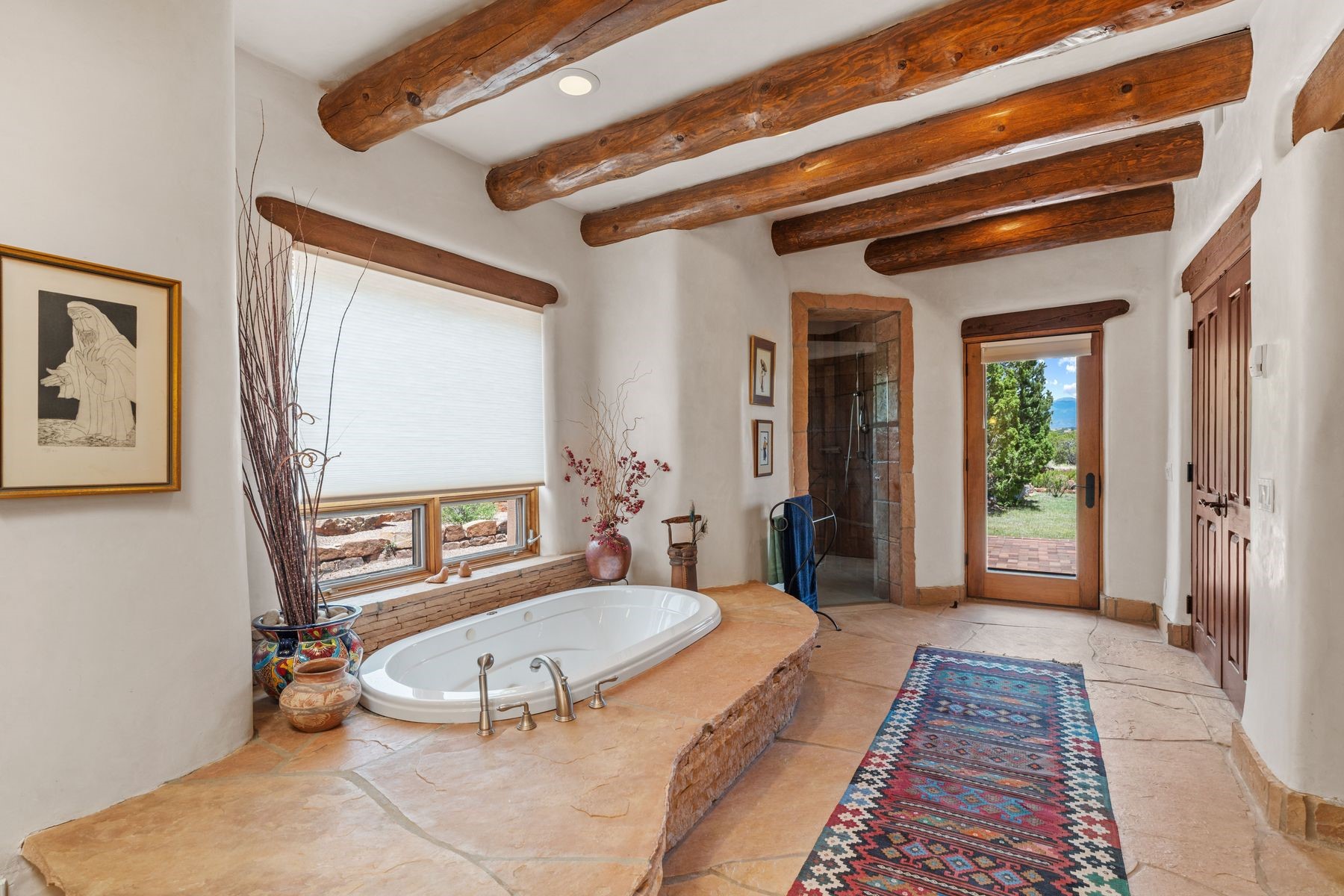 Located in the gated premier community of Las Campanas, 6 Rising Moon is a substantial adobe home offering 3 bedroom suites, 4 bathrooms, and approximately 1.86 acres of land. Set on a rise with unobstructed views to the east, the home takes in sweeping vistas of the Sangre de Cristo Mountains--framed dramatically through the living room's large windows and enjoyed from the deep portal and landscaped lawn of native grasses just beyond. Built in the classic Pueblo style, the home features thick adobe walls, hand-troweled plaster, vigas, flagstone floors, and Mexican-style tile in the bathrooms. The layout is both functional and generous: a large primary suite is set apart on one end of the house, with two guest suites on the other. In the center is a spacious living and dining room with high ceilings and eastern light, and an adjacent kitchen that opens to a breakfast nook and sitting area. There are no interior steps across the 4,553 square foot home, which also has a two-car garage with a large storage room. In-floor radiant heat and minisplits provide comfortable climate control in all seasons. This is the first time the home has been offered for sale by its original owner--a property of lasting quality, thoughtfully sited and full of character, ready for its next chapter