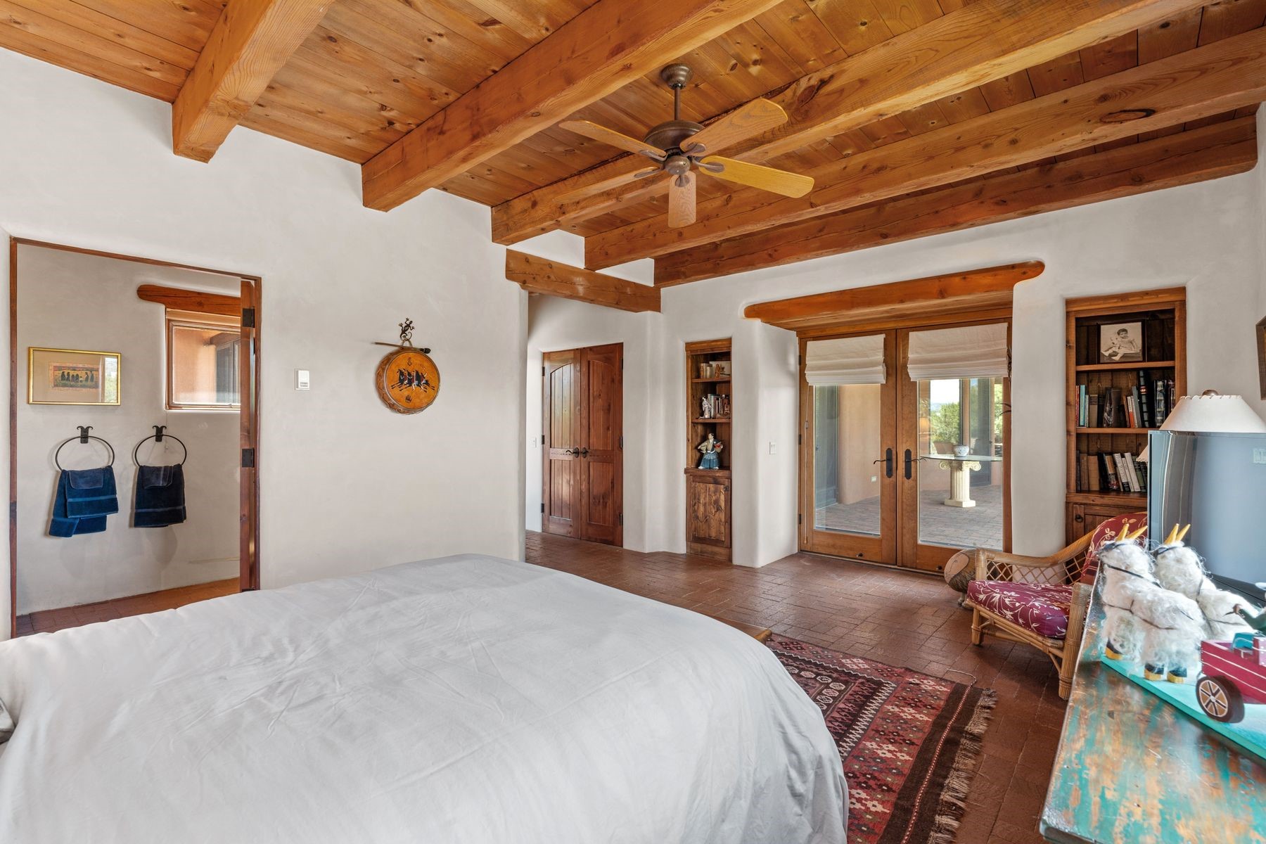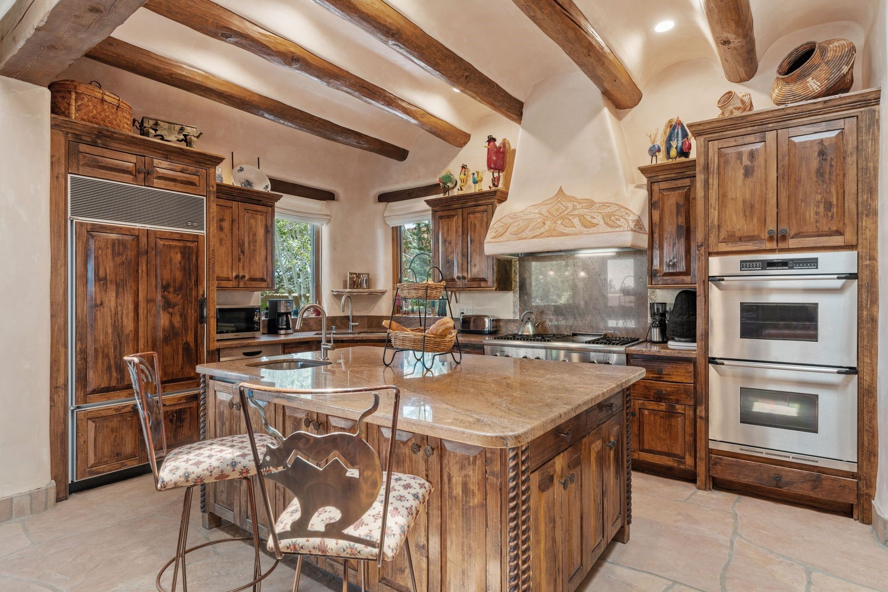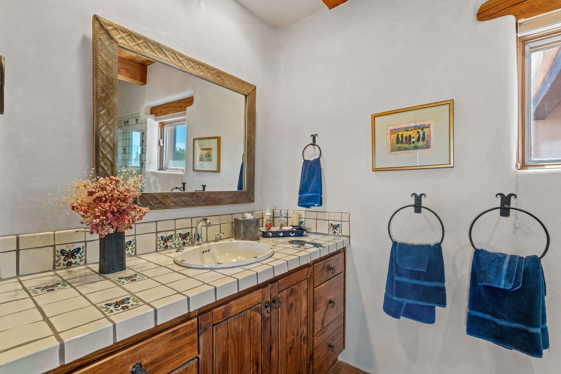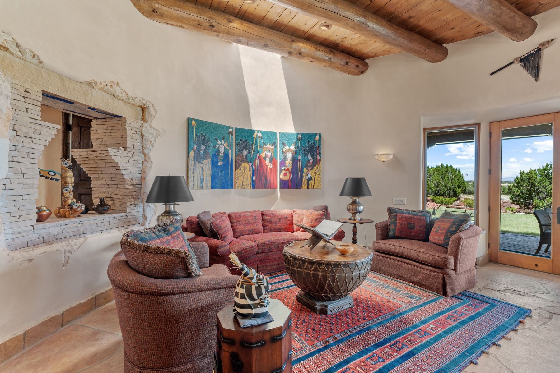 Located in the gated premier community of Las Campanas, 6 Rising Moon is a substantial adobe home offering 3 bedroom suites, 4 bathrooms, and approximately 1.86 acres of land. Set on a rise with unobstructed views to the east, the home takes in sweeping vistas of the Sangre de Cristo Mountains--framed dramatically through the living room's large windows and enjoyed from the deep portal and landscaped lawn of native grasses just beyond. Built in the classic Pueblo style, the home features thick adobe walls, hand-troweled plaster, vigas, flagstone floors, and Mexican-style tile in the bathrooms. The layout is both functional and generous: a large primary suite is set apart on one end of the house, with two guest suites on the other. In the center is a spacious living and dining room with high ceilings and eastern light, and an adjacent kitchen that opens to a breakfast nook and sitting area. There are no interior steps across the 4,553 square foot home, which also has a two-car garage with a large storage room. In-floor radiant heat and minisplits provide comfortable climate control in all seasons. This is the first time the home has been offered for sale by its original owner--a property of lasting quality, thoughtfully sited and full of character, ready for its next chapter