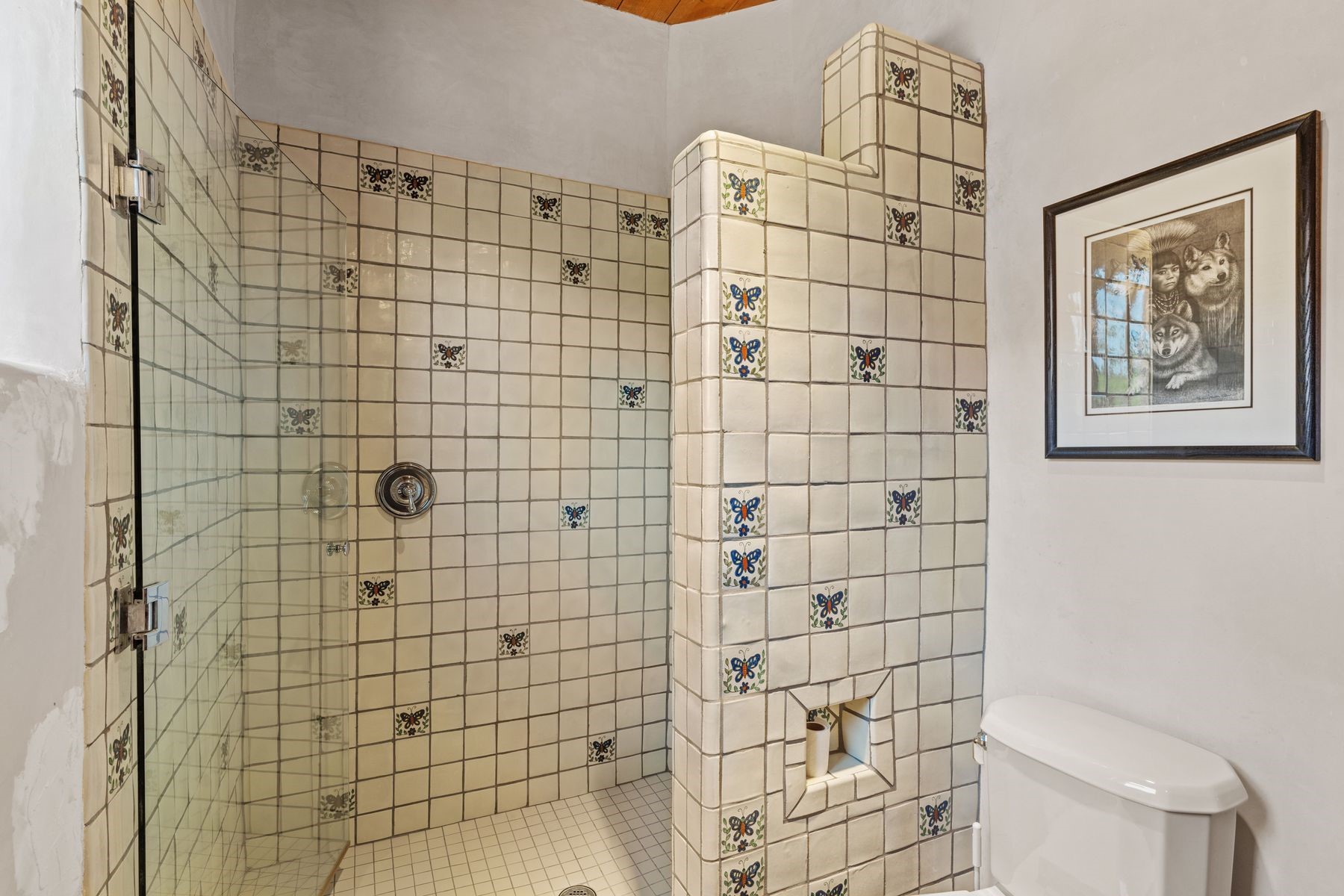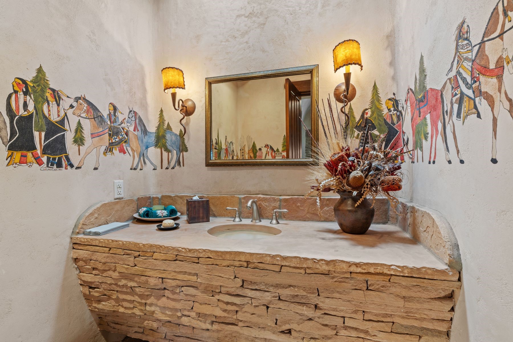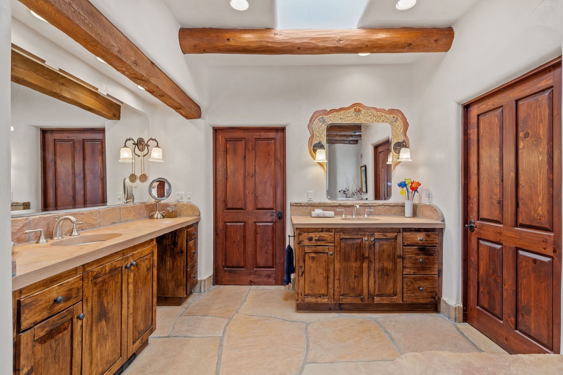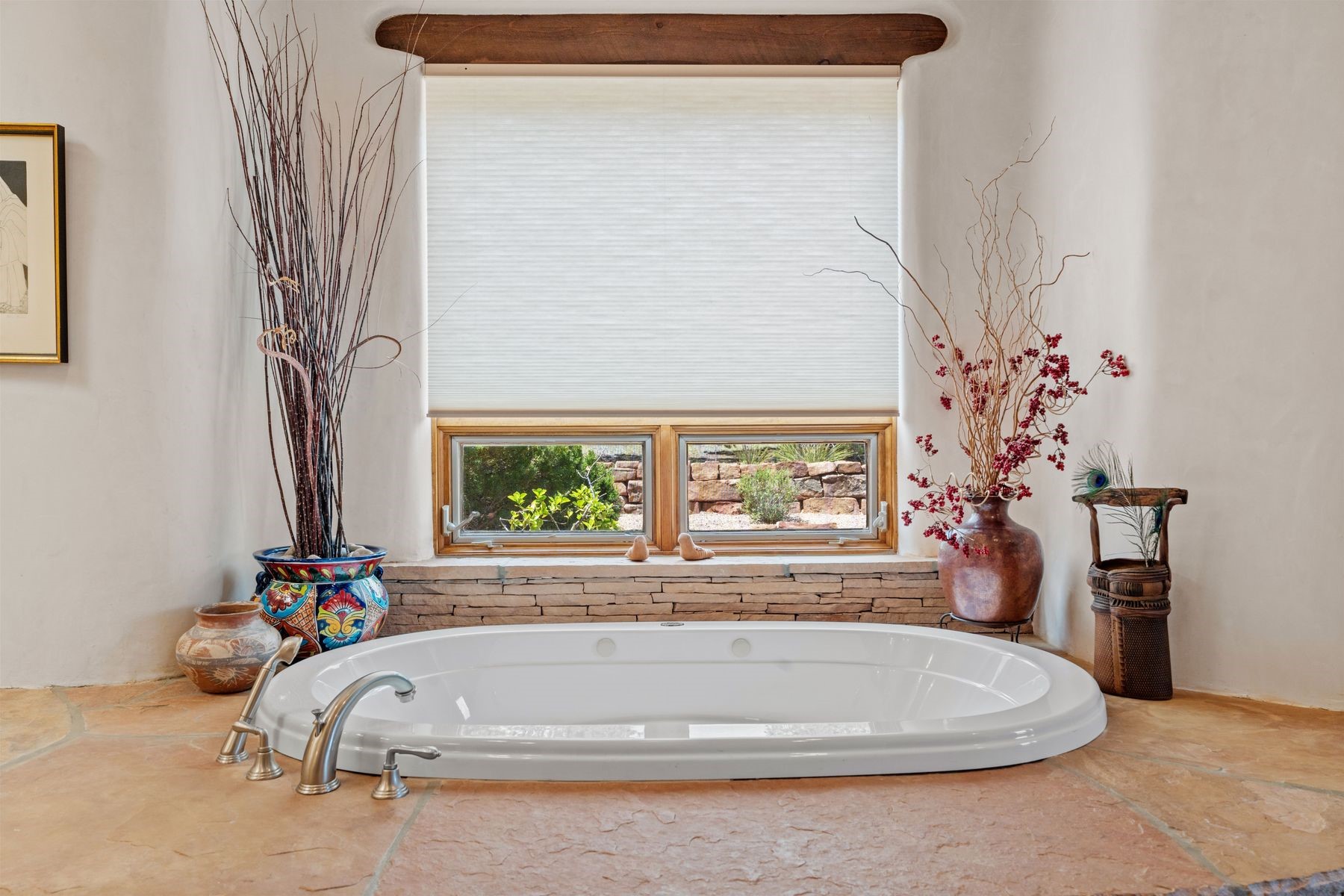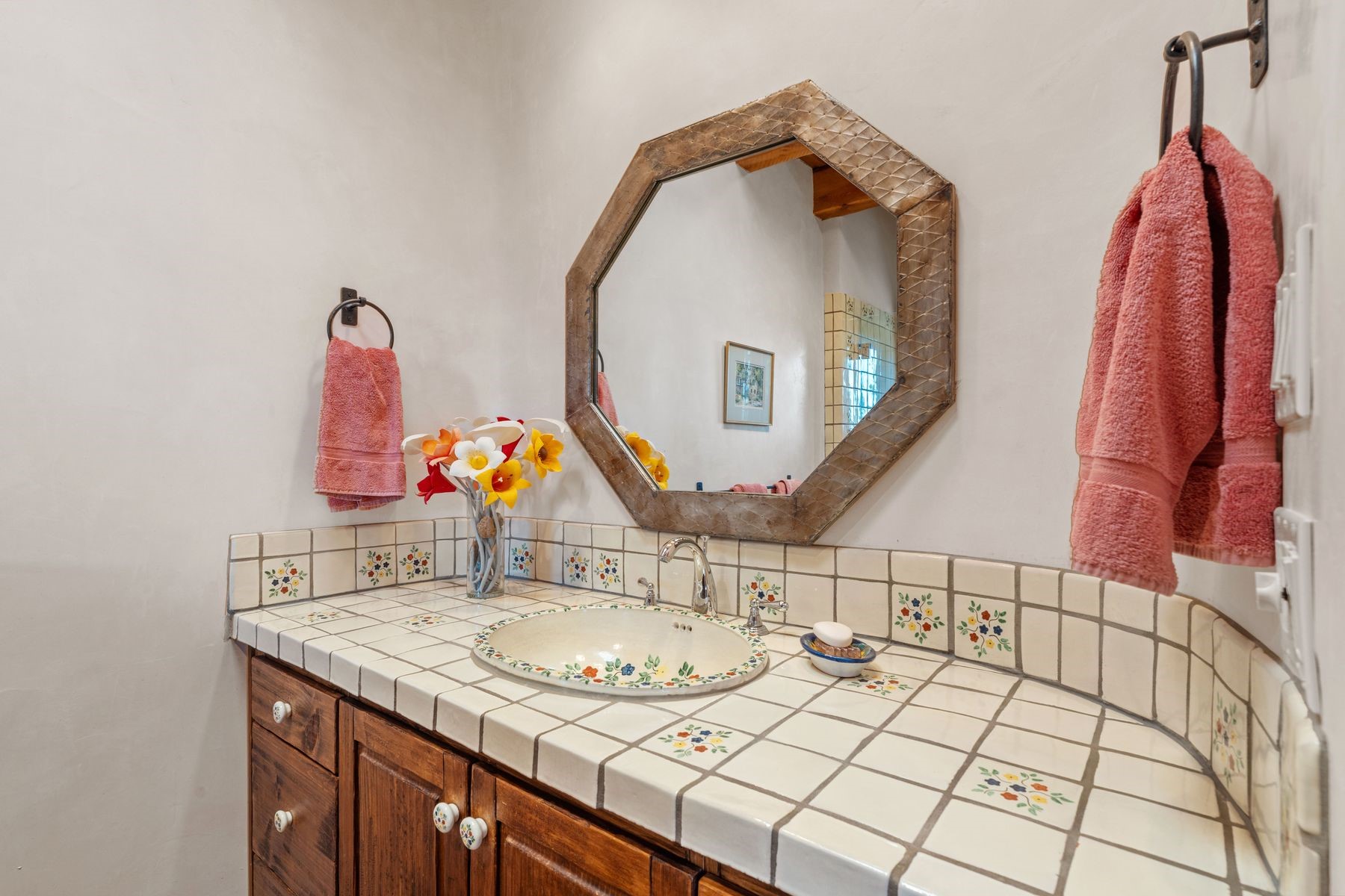 Located in the gated premier community of Las Campanas, 6 Rising Moon is a substantial adobe home offering 3 bedroom suites, 4 bathrooms, and approximately 1.86 acres of land. Set on a rise with unobstructed views to the east, the home takes in sweeping vistas of the Sangre de Cristo Mountains--framed dramatically through the living room's large windows and enjoyed from the deep portal and landscaped lawn of native grasses just beyond. Built in the classic Pueblo style, the home features thick adobe walls, hand-troweled plaster, vigas, flagstone floors, and Mexican-style tile in the bathrooms. The layout is both functional and generous: a large primary suite is set apart on one end of the house, with two guest suites on the other. In the center is a spacious living and dining room with high ceilings and eastern light, and an adjacent kitchen that opens to a breakfast nook and sitting area. There are no interior steps across the 4,553 square foot home, which also has a two-car garage with a large storage room. In-floor radiant heat and minisplits provide comfortable climate control in all seasons. This is the first time the home has been offered for sale by its original owner--a property of lasting quality, thoughtfully sited and full of character, ready for its next chapter