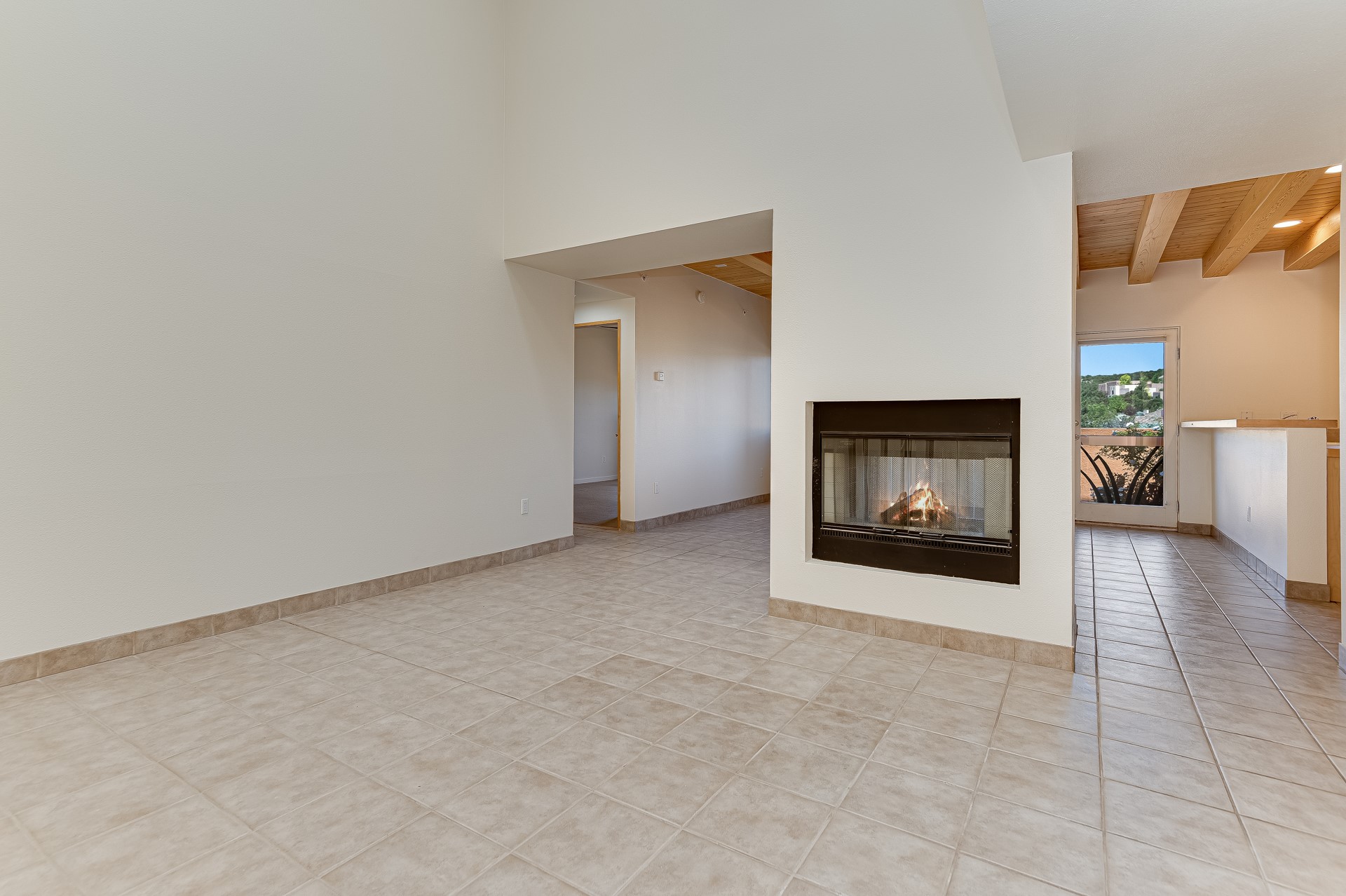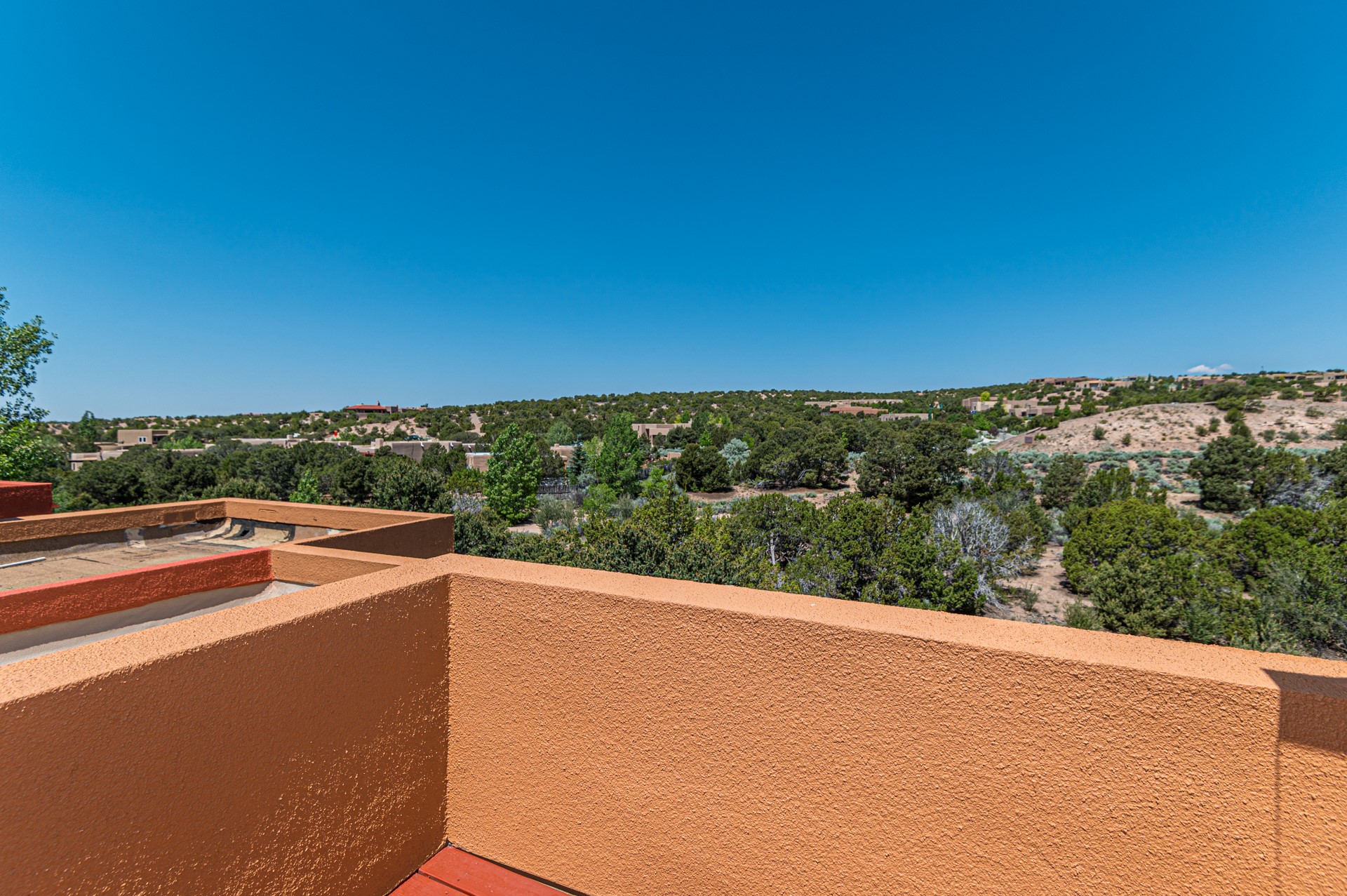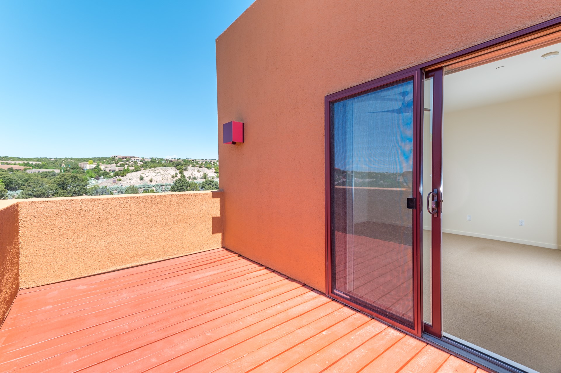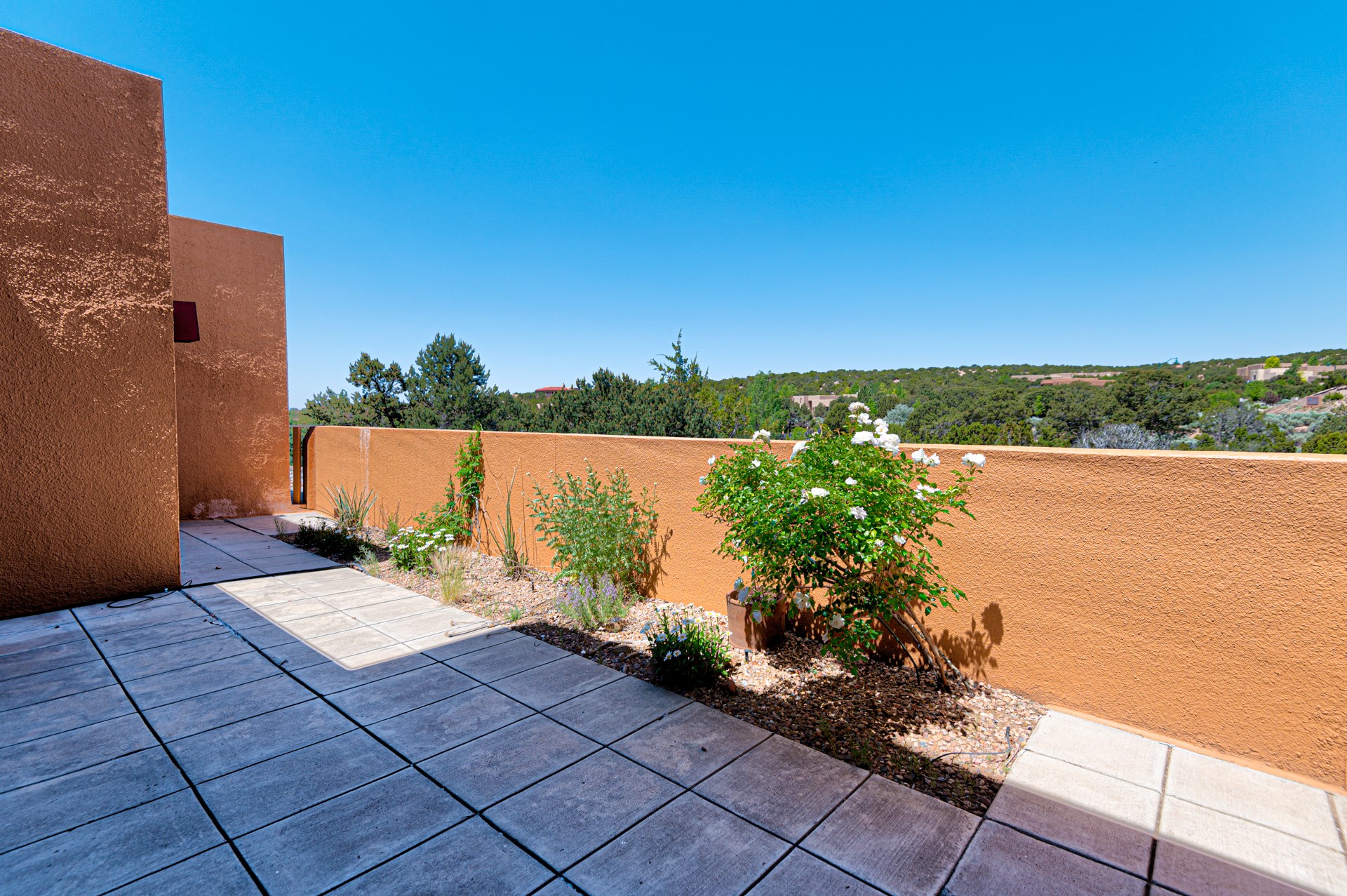 This home features one of the most popular floor plans built at Zocalo and is located in one of the most desirable areas, facing west over- looking the arroyo and hillside. This light filled home has two master suites one on the main floor and one upstairs with a balcony. Access the private patio off the living room or master bedroom. The dining room includes high ceilings with skylights, the living room and kitchen features a wood ceiling. A double-sided wood burning fireplace separates the dining room and living area. This home has a lot to offer including ground level living, ample storage and no wasted space. Located in the beautiful Zocalo Condominium complex designed by World renowned Mexican architect Ricardo Legorreta and located just minutes from downtown and all that Santa Fe offers in shopping, museums and services. Community amenities include two fitness facilities, a clubhouse, pool and spa.