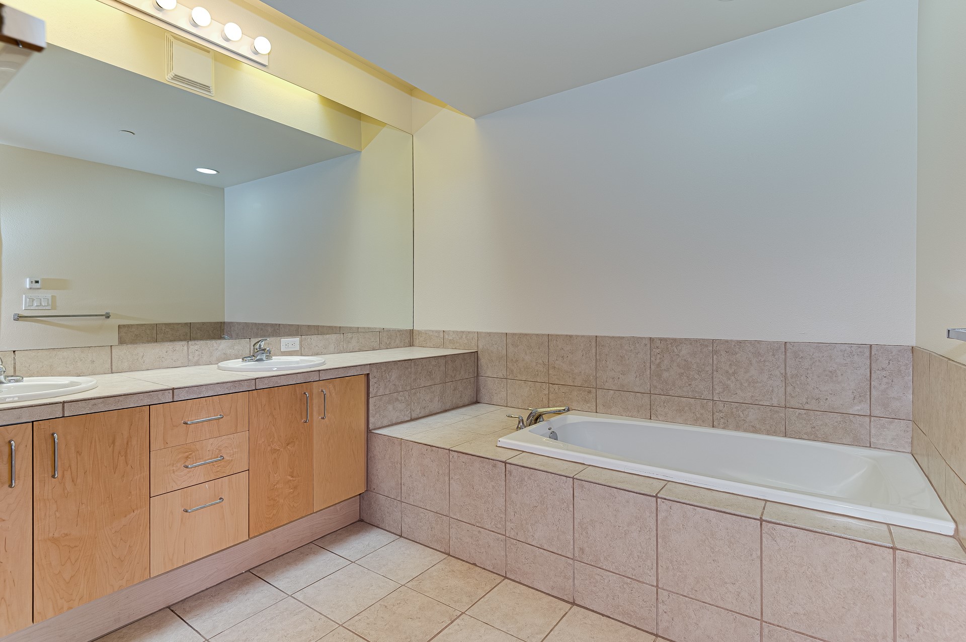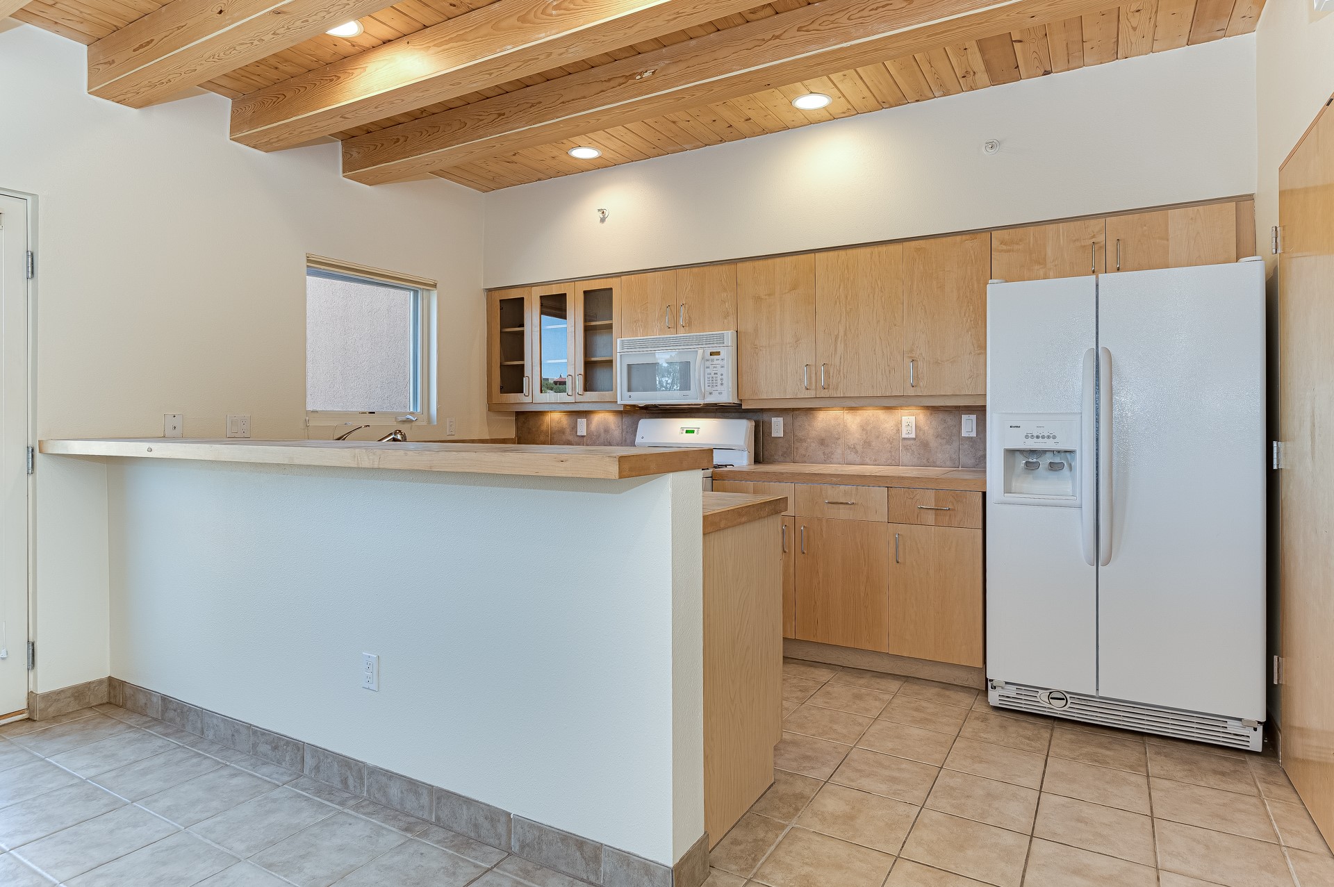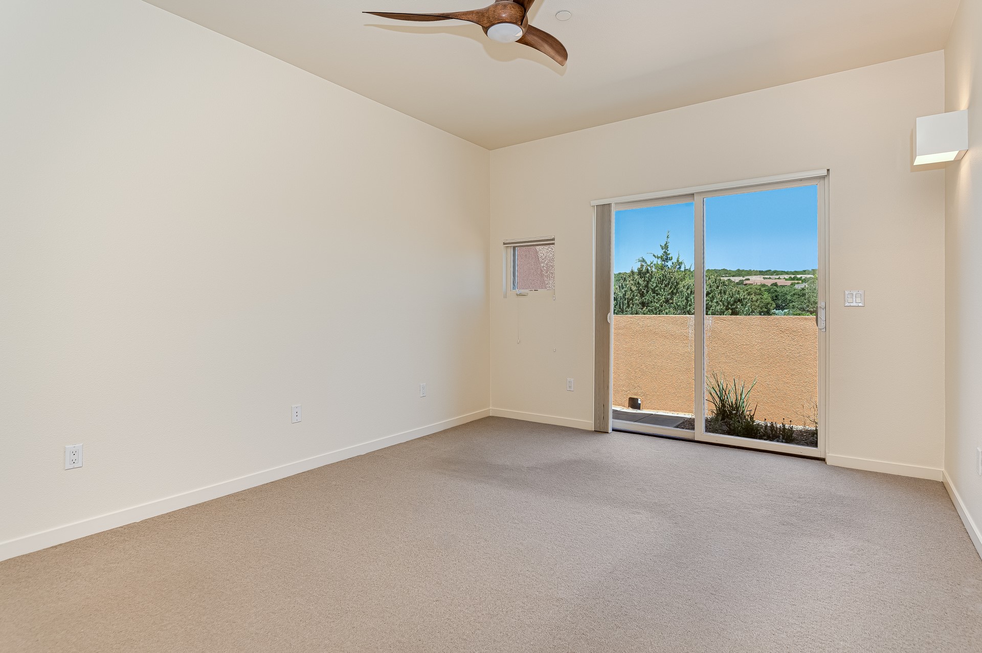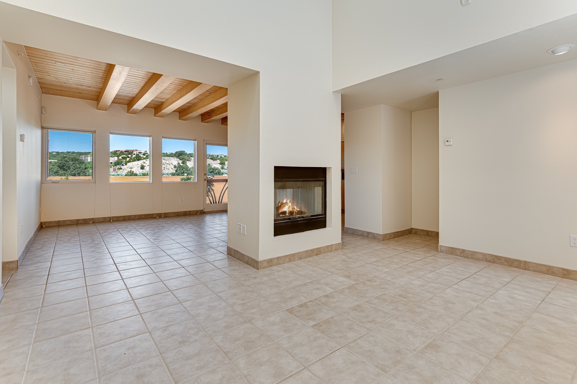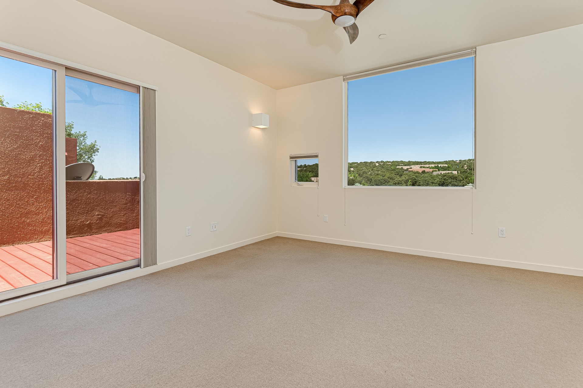 This home features one of the most popular floor plans built at Zocalo and is located in one of the most desirable areas, facing west over- looking the arroyo and hillside. This light filled home has two master suites one on the main floor and one upstairs with a balcony. Access the private patio off the living room or master bedroom. The dining room includes high ceilings with skylights, the living room and kitchen features a wood ceiling. A double-sided wood burning fireplace separates the dining room and living area. This home has a lot to offer including ground level living, ample storage and no wasted space. Located in the beautiful Zocalo Condominium complex designed by World renowned Mexican architect Ricardo Legorreta and located just minutes from downtown and all that Santa Fe offers in shopping, museums and services. Community amenities include two fitness facilities, a clubhouse, pool and spa.
