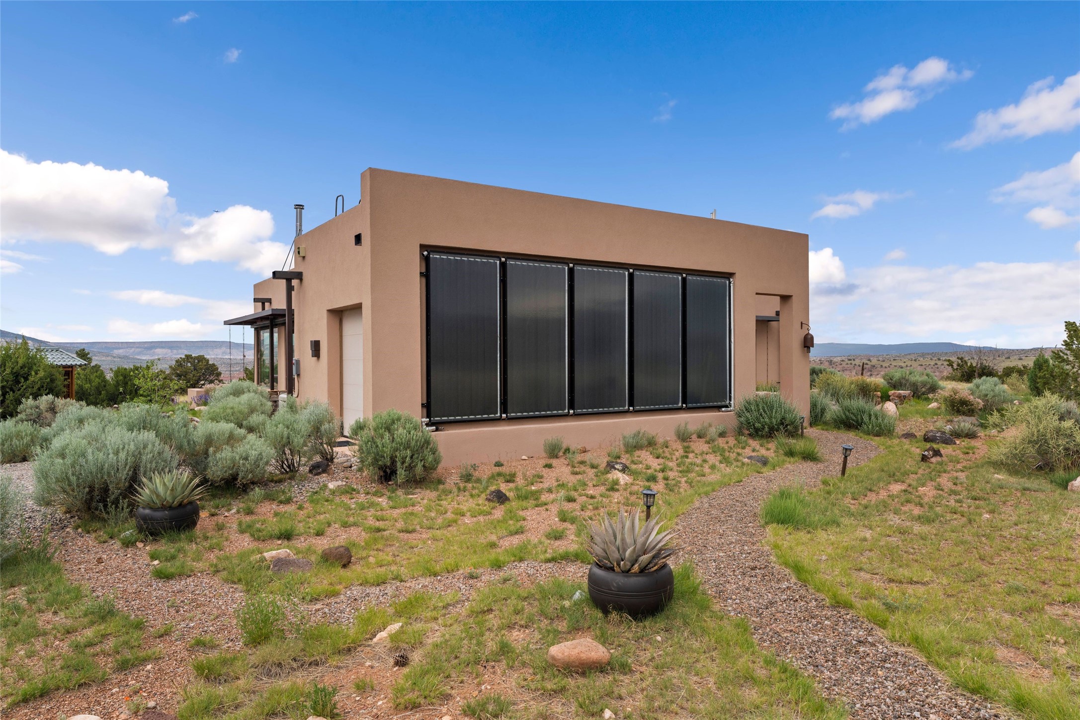 Casa con Vista a private sanctuary with sweeping mountain views. Perched atop the serene La Cuchilla mesa, this peaceful retreat offers breathtaking vistas of the Pedernal, Kitchen Mesa at Ghost Ranch, and the surrounding mountains and mesas. Designed in harmony with its natural setting, this contemporary residence invites you to experience the beauty of New Mexico in every direction -- from glowing sandstone cliffs at sunrise and sunset to crystal-clear night skies adorned with countless stars. Each season transforms the landscape -- golden cottonwoods lining the Rio Puerco in autumn, snow-capped peaks in winter, gentle spring rains, and vibrant wildflowers in summer. Wildlife frequents the property, including deer, elk, bobcats, ravens, red-tailed hawks, pion jays, and an array of migratory birds. This immaculate two-bedroom, two-bath home, designed and built by award-winning Solterra Design Build, is a high-performance, off-the-grid home that combines modern comfort with environmental mindfulness. Thoughtfully positioned to maximize views and light, the home features ICF construction, a 48-panel photovoltaic solar array with Outback inverter, three charge controllers, and a Kohler propane backup generator. Five 4'x8' thermal panels provide hot water and in-floor radiant heating. Additional systems include a whole-house reverse osmosis filtration system, two 2,500-gallon cisterns, recirculating hot water pump, 300-gallon sprinkler system, and drip irrigation for landscaped and garden areas. Beyond the main residence, a hand-crafted Teahouse and ramada offer serene spaces for relaxation and meditation. A labyrinth and large viewing portal provide peaceful settings for reflection while taking in the sweeping landscape.