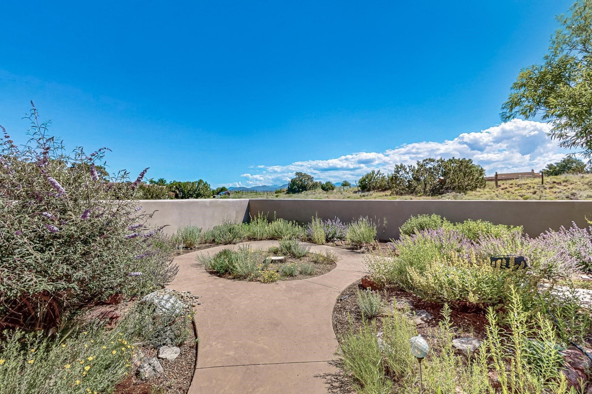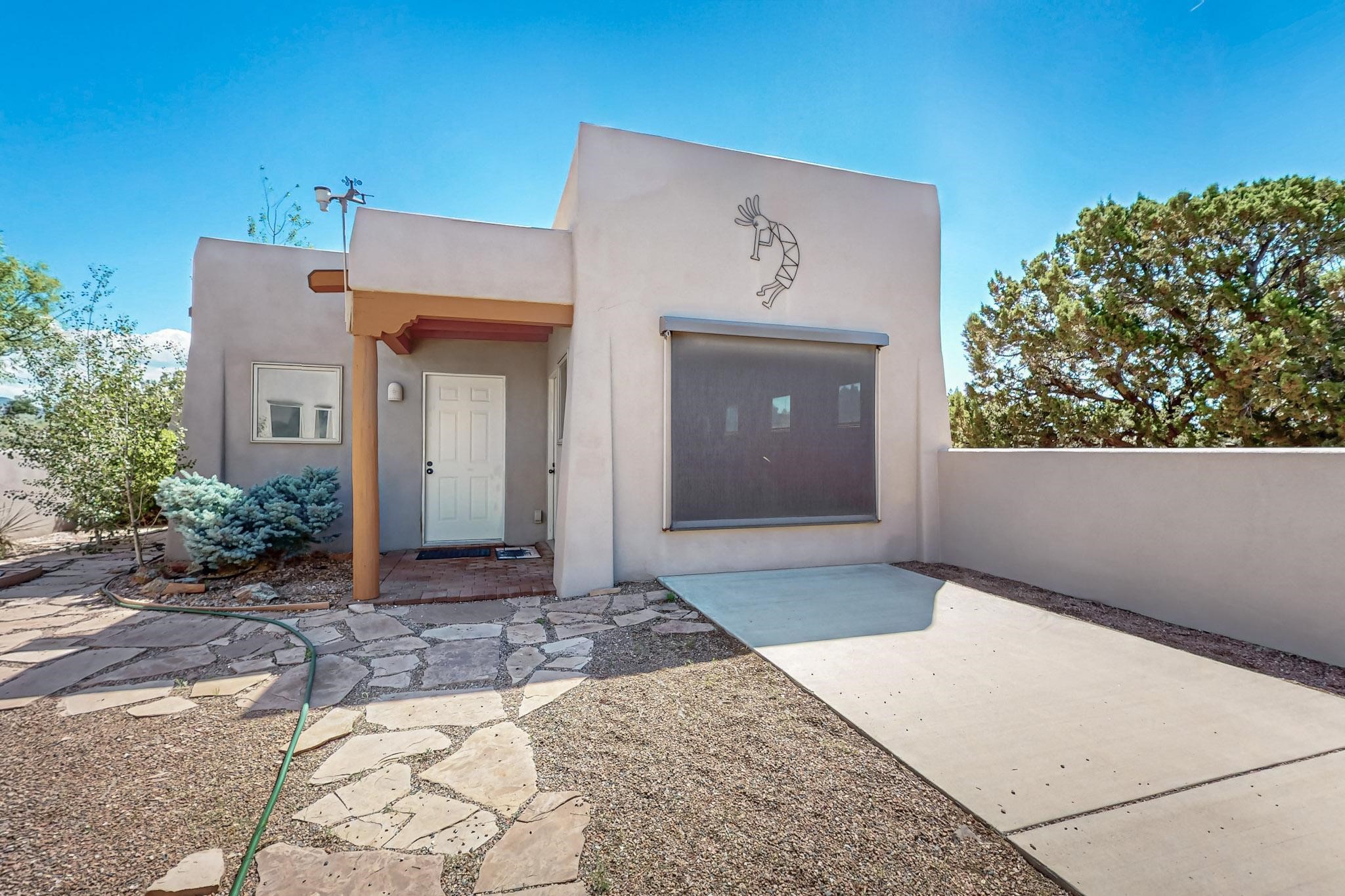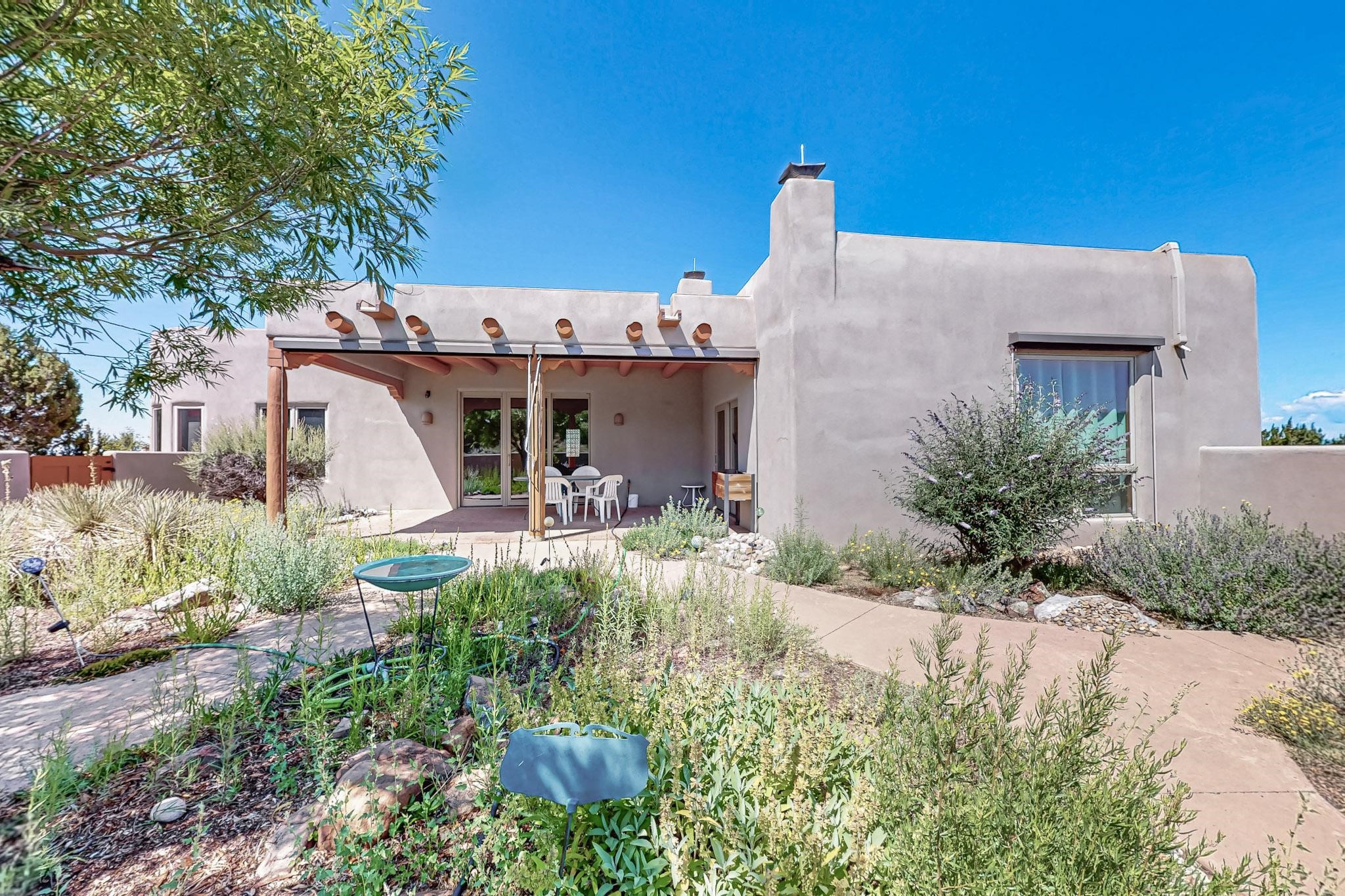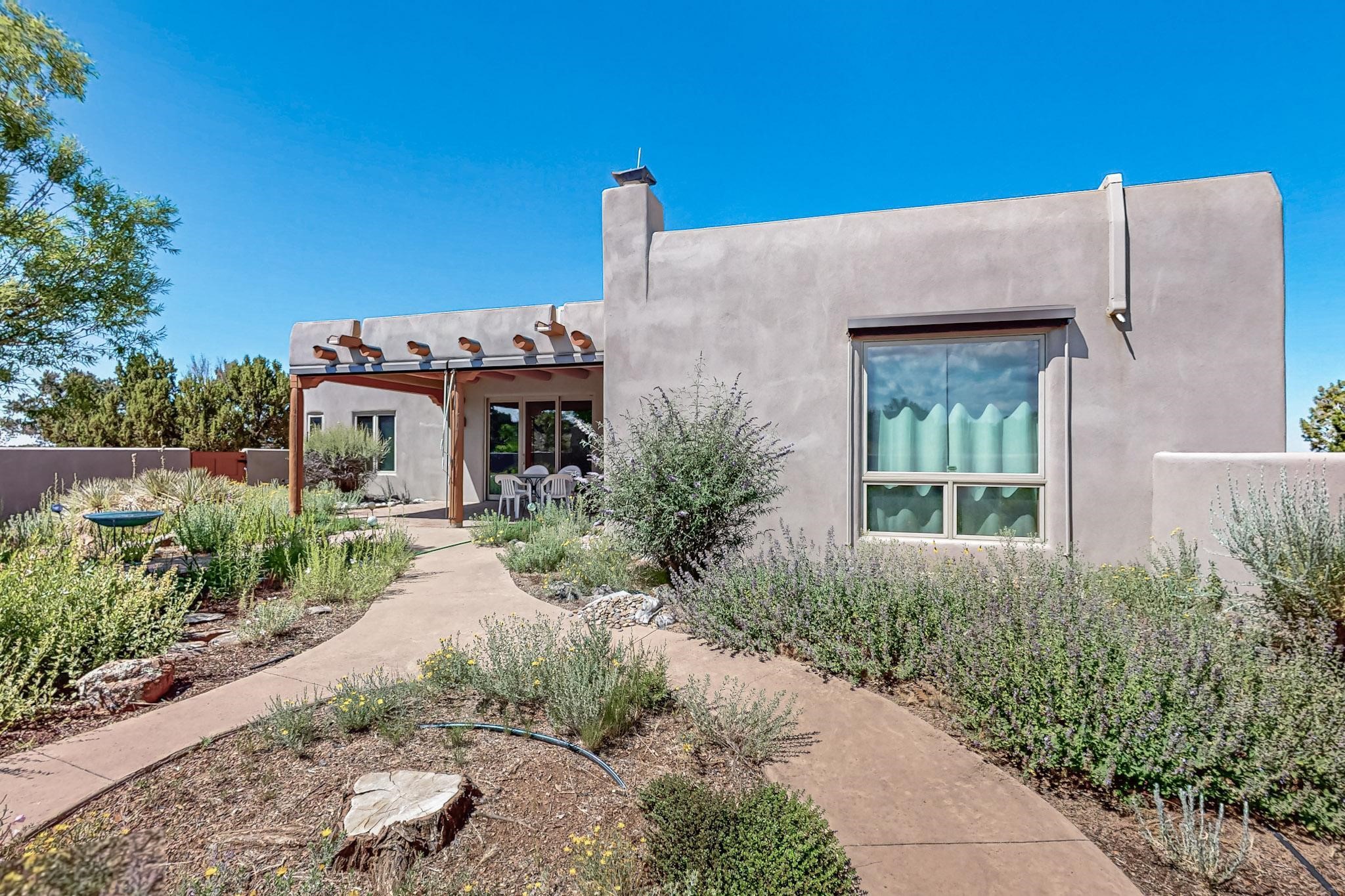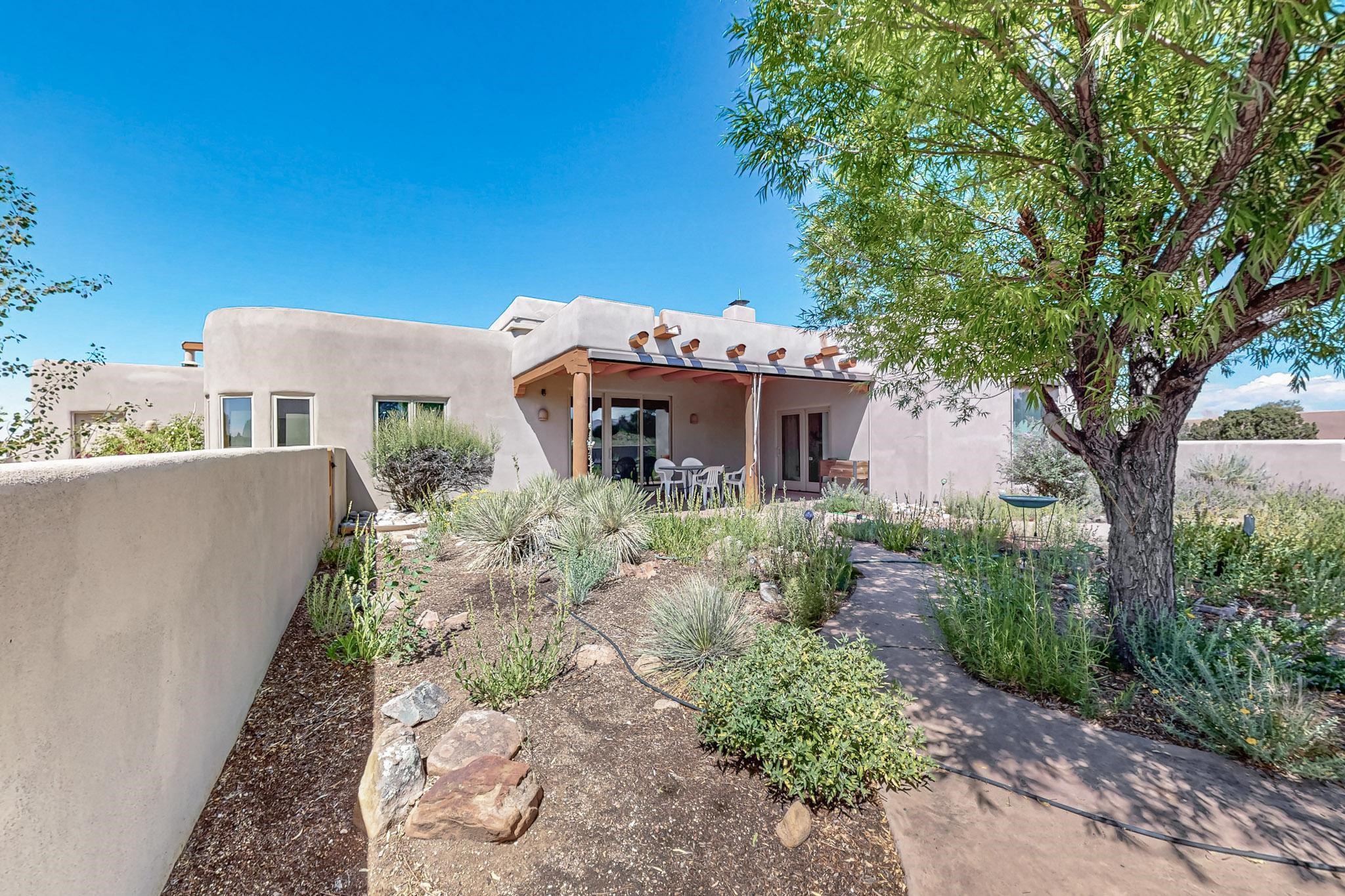 Priced to Sell! Potential multigenerational living. Expansive contemporary pueblo, split bedroom open plan design with high ceilings throughout. The main home includes a formal dining area, spacious great room with kiva fireplace, a large primary suite with kiva fireplace, large walk in closet and spa-like bathroom. Excellent separation from the two guest bedrooms and bath, plus a den/study. The kitchen has been remodeled including an induction range top, custom lighted cabinetry and pantry. The radiant heating is supplemented by 5 mini splits to keep a comfortable temperature summer and winter. There is a large heated storage room/workroom for hobbies and toys plus an oversized 2 car garage. Behind the home sits a detached 478 sq.ft. heated 2 room studio/guest with a 3/4 bathroom for extra guests/office or studio with a separate septic system. A lovely walled garden with a 3rd kiva fireplace for enjoyment plus a large portal for morning or evening outside entertainment. Enjoy the historic railway and rail trail bordering the back of your land. Plenty of guest parking with a paved driveway and easy access to Eldorado amenities, local shopping only minutes into Santa Fe.