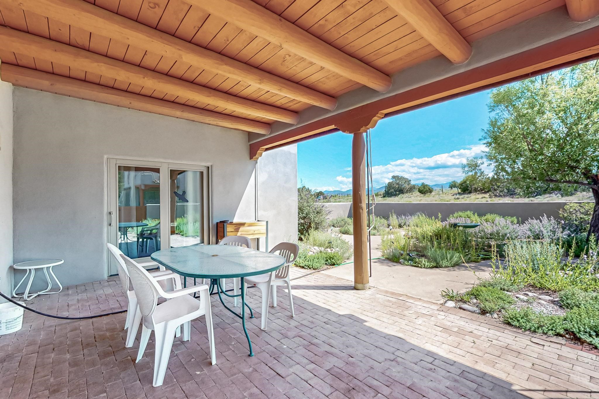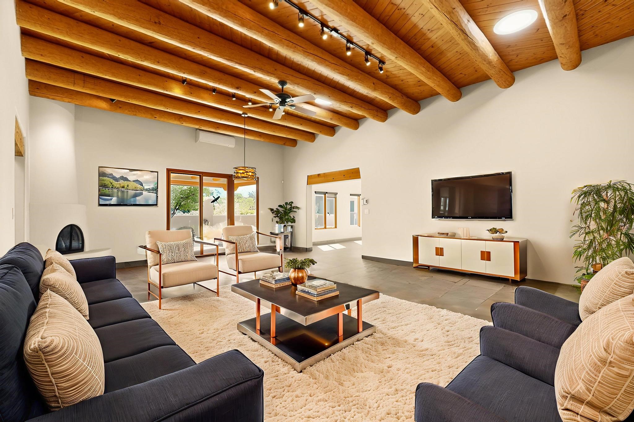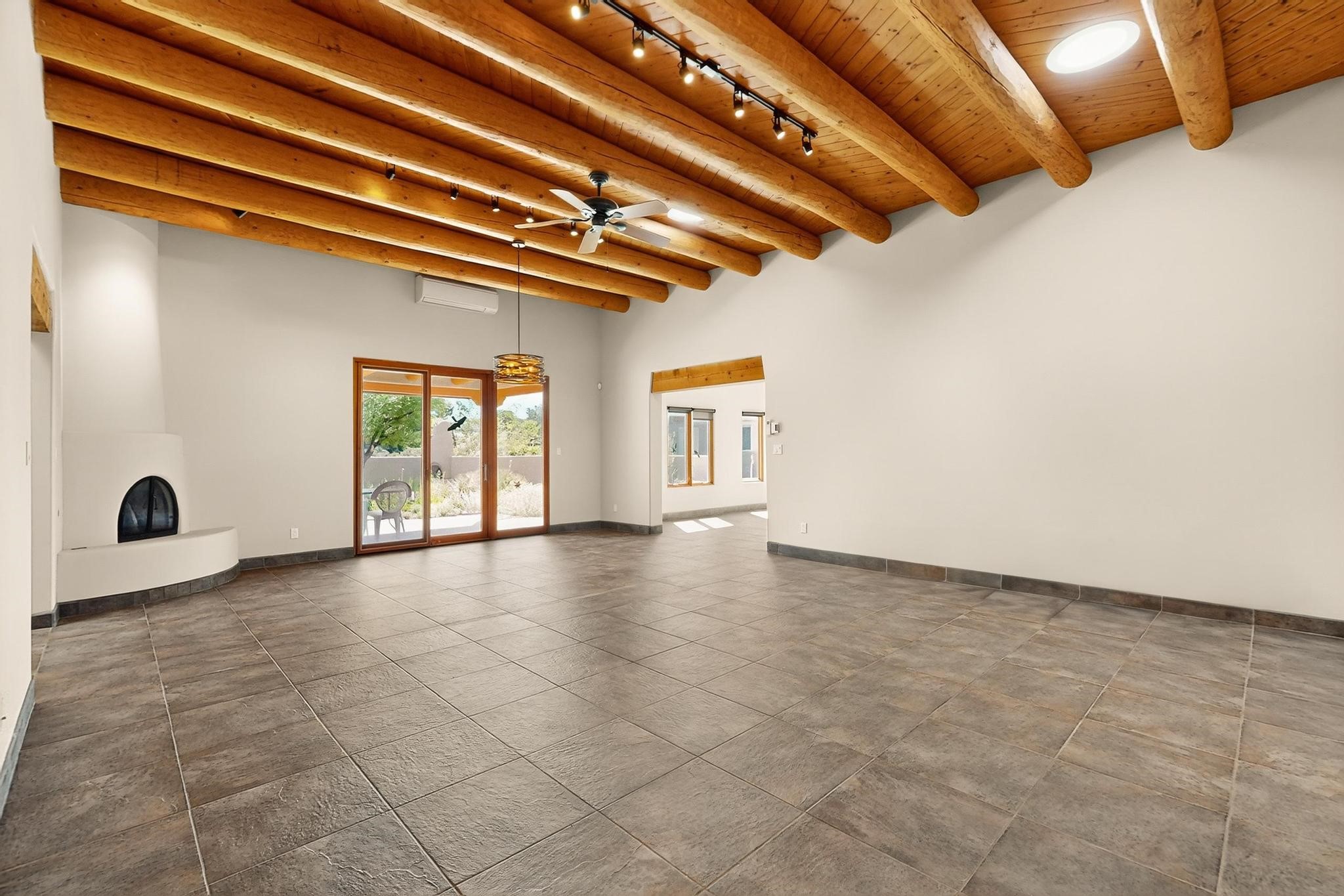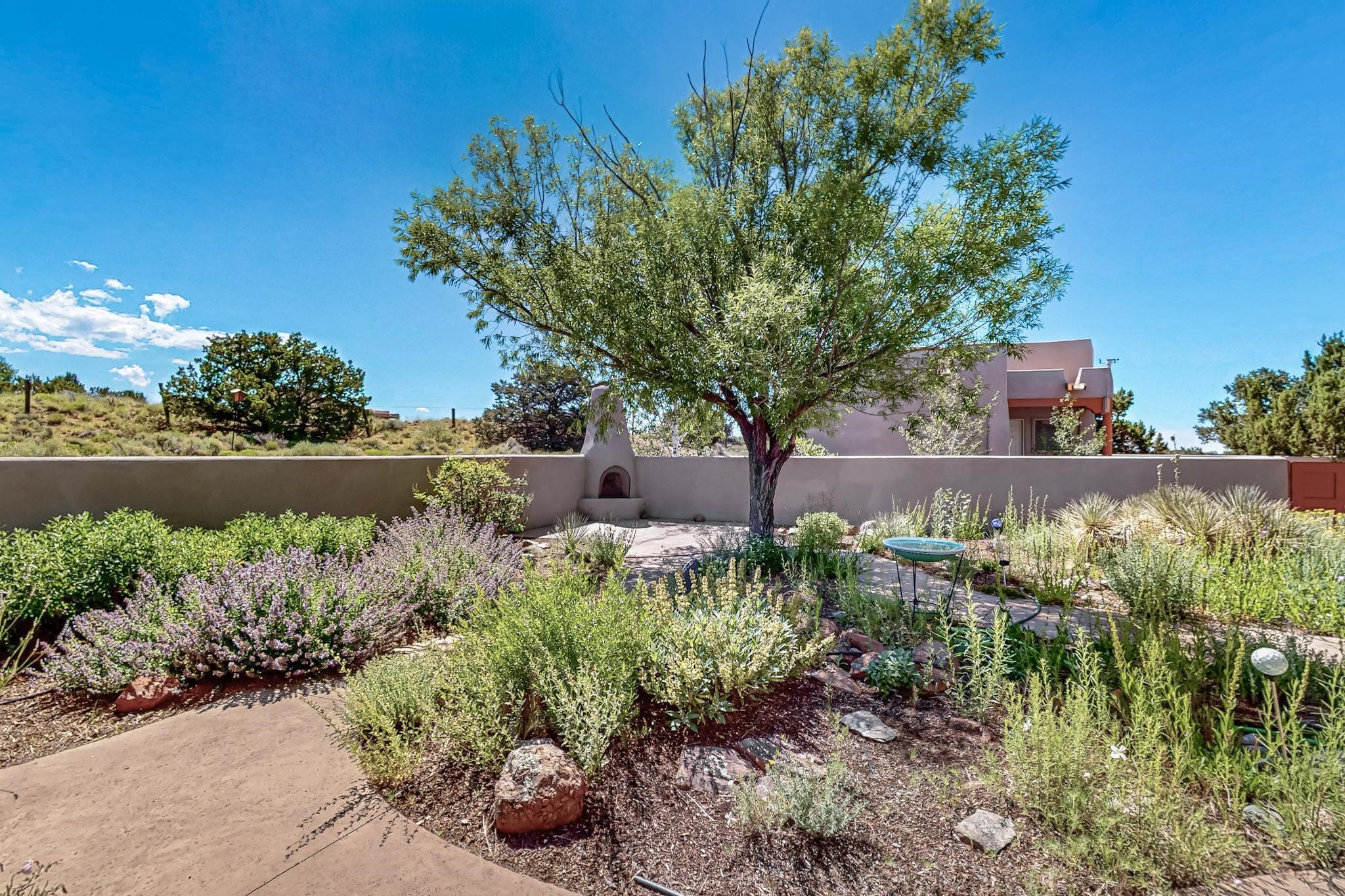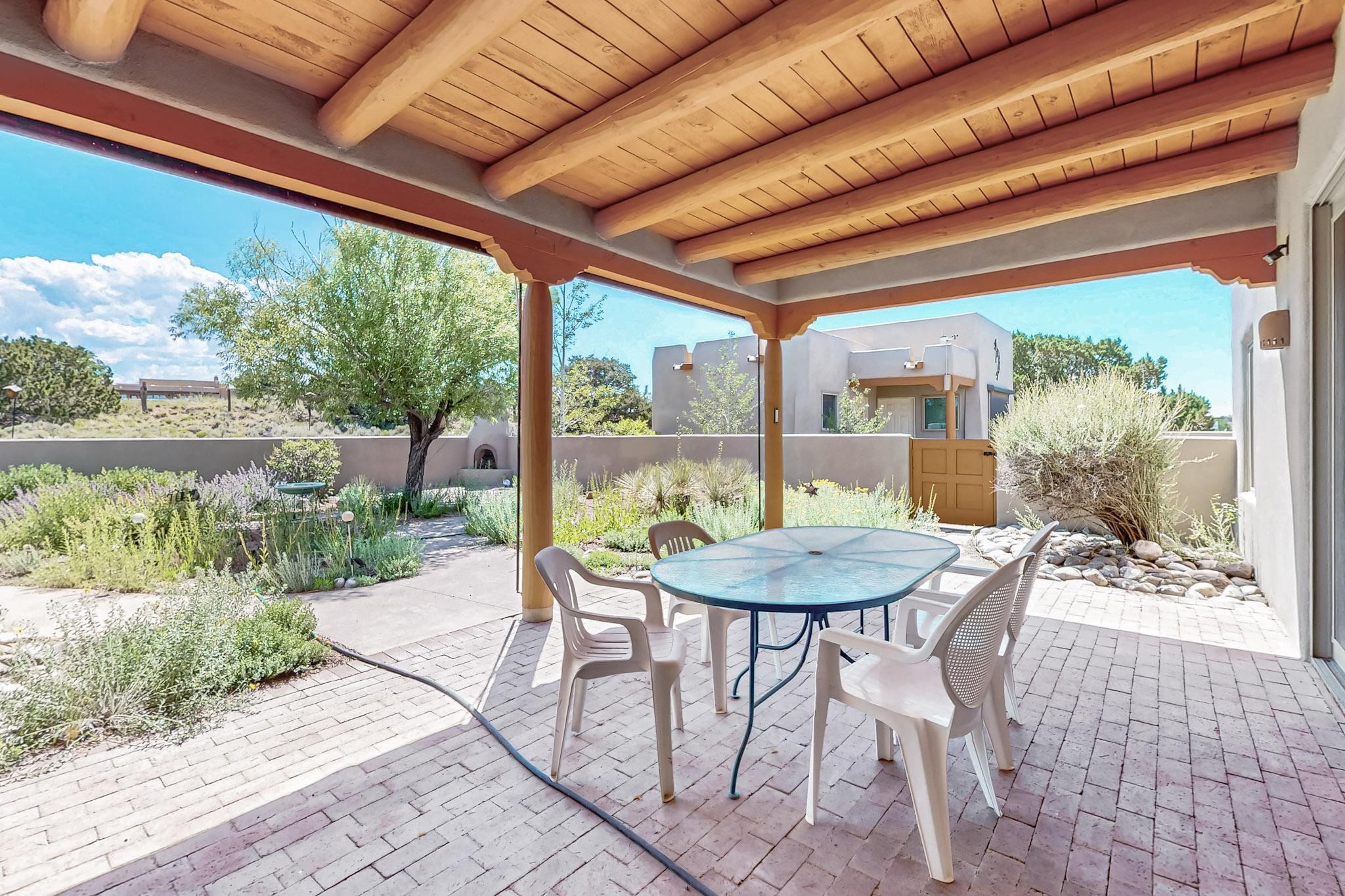 Priced to Sell! Potential multigenerational living. Expansive contemporary pueblo, split bedroom open plan design with high ceilings throughout. The main home includes a formal dining area, spacious great room with kiva fireplace, a large primary suite with kiva fireplace, large walk in closet and spa-like bathroom. Excellent separation from the two guest bedrooms and bath, plus a den/study. The kitchen has been remodeled including an induction range top, custom lighted cabinetry and pantry. The radiant heating is supplemented by 5 mini splits to keep a comfortable temperature summer and winter. There is a large heated storage room/workroom for hobbies and toys plus an oversized 2 car garage. Behind the home sits a detached 478 sq.ft. heated 2 room studio/guest with a 3/4 bathroom for extra guests/office or studio with a separate septic system. A lovely walled garden with a 3rd kiva fireplace for enjoyment plus a large portal for morning or evening outside entertainment. Enjoy the historic railway and rail trail bordering the back of your land. Plenty of guest parking with a paved driveway and easy access to Eldorado amenities, local shopping only minutes into Santa Fe.