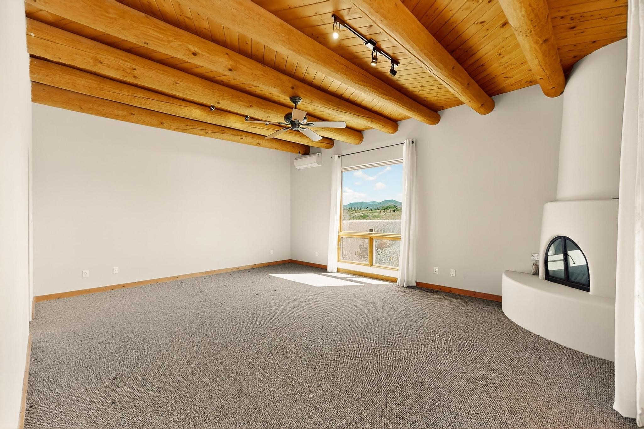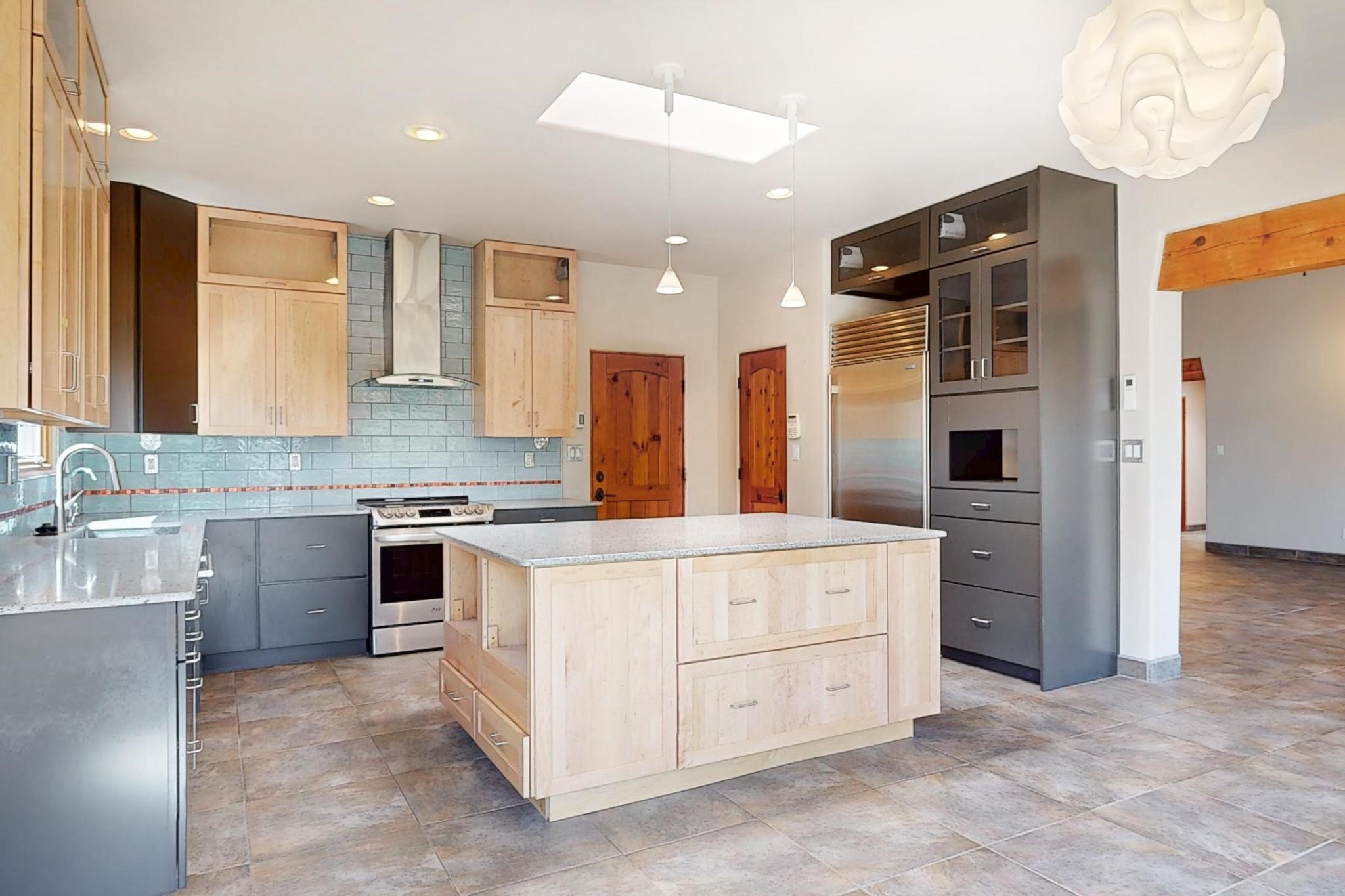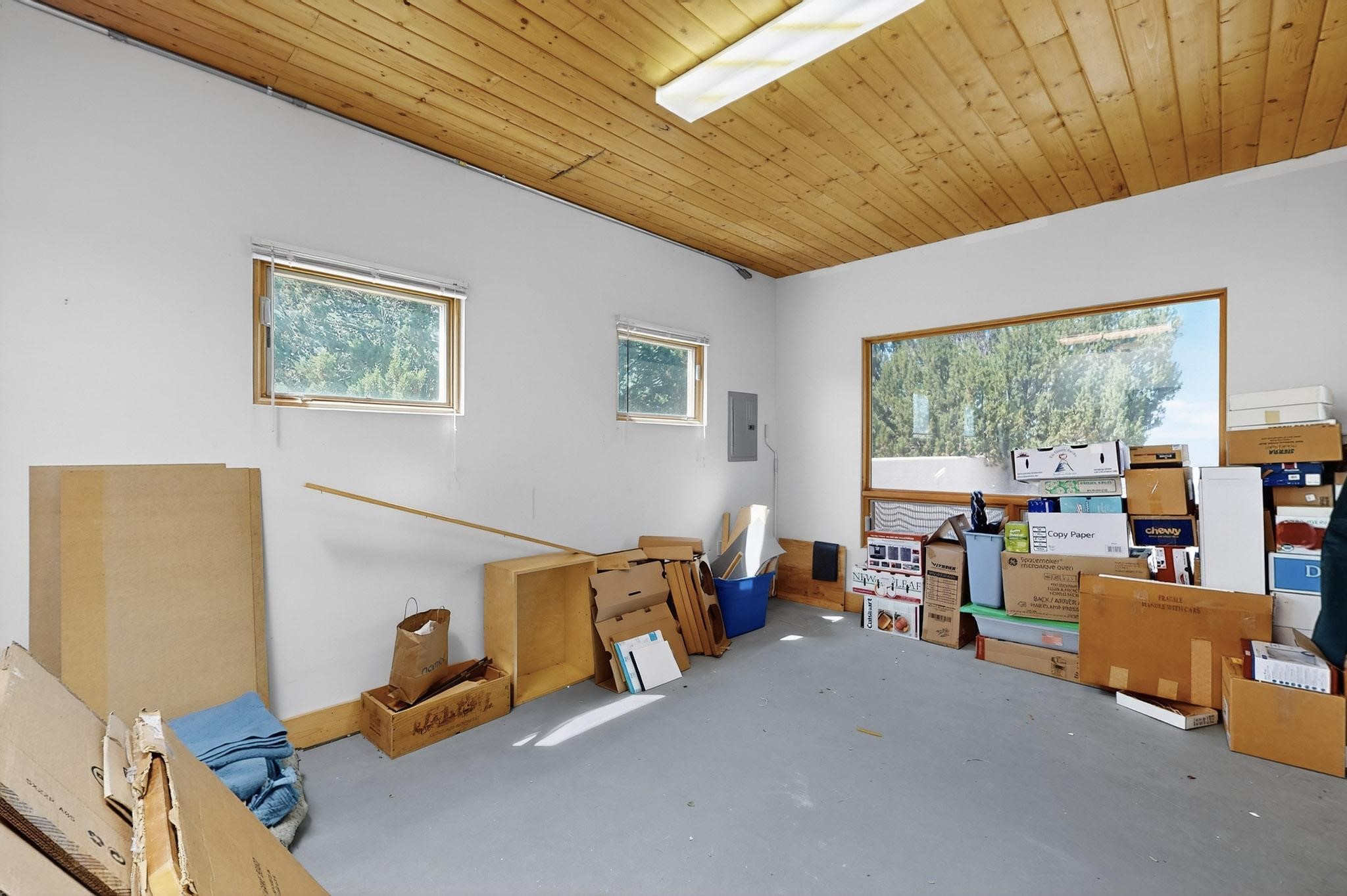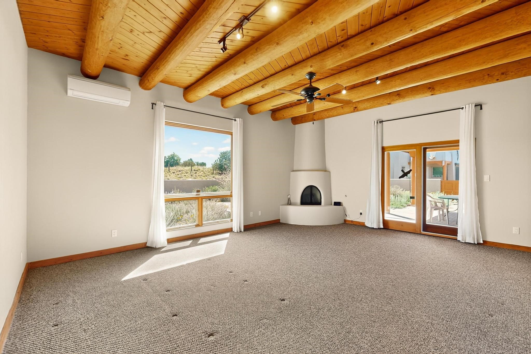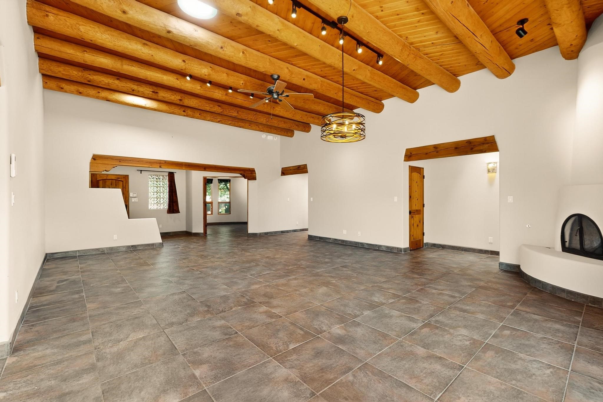 Priced to Sell! Potential multigenerational living. Expansive contemporary pueblo, split bedroom open plan design with high ceilings throughout. The main home includes a formal dining area, spacious great room with kiva fireplace, a large primary suite with kiva fireplace, large walk in closet and spa-like bathroom. Excellent separation from the two guest bedrooms and bath, plus a den/study. The kitchen has been remodeled including an induction range top, custom lighted cabinetry and pantry. The radiant heating is supplemented by 5 mini splits to keep a comfortable temperature summer and winter. There is a large heated storage room/workroom for hobbies and toys plus an oversized 2 car garage. Behind the home sits a detached 478 sq.ft. heated 2 room studio/guest with a 3/4 bathroom for extra guests/office or studio with a separate septic system. A lovely walled garden with a 3rd kiva fireplace for enjoyment plus a large portal for morning or evening outside entertainment. Enjoy the historic railway and rail trail bordering the back of your land. Plenty of guest parking with a paved driveway and easy access to Eldorado amenities, local shopping only minutes into Santa Fe.