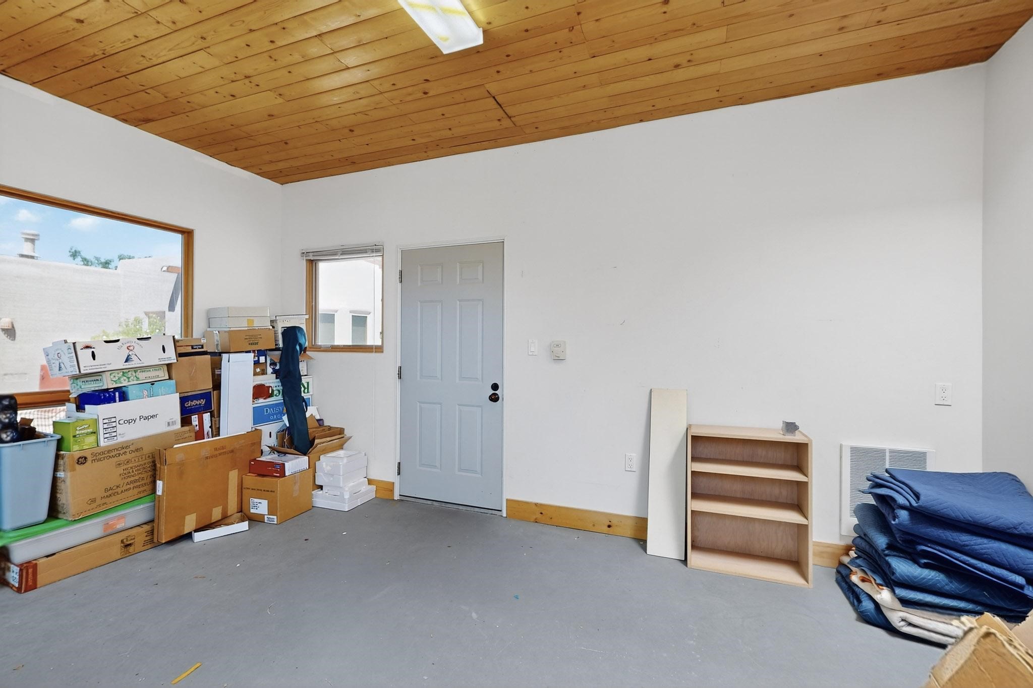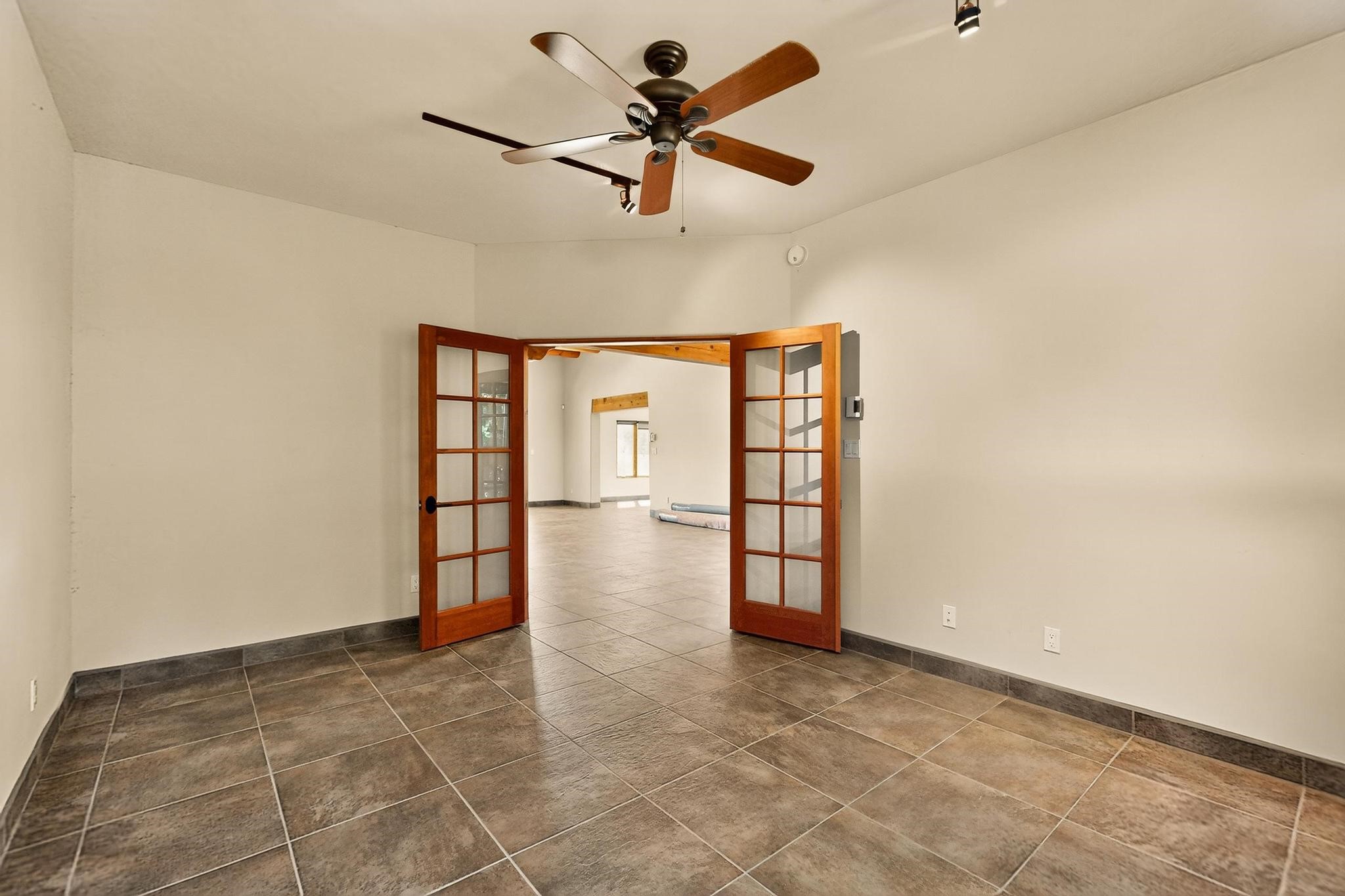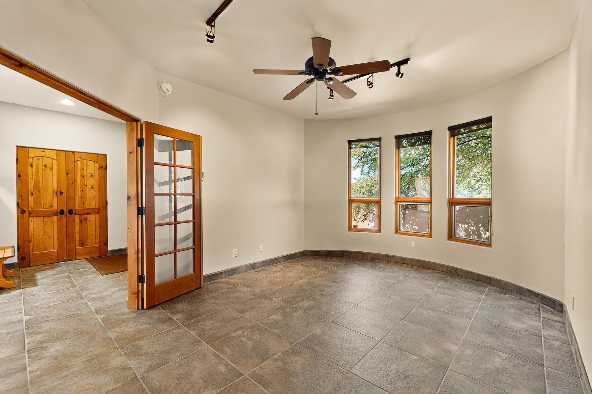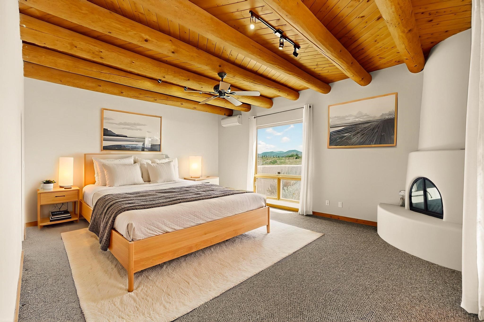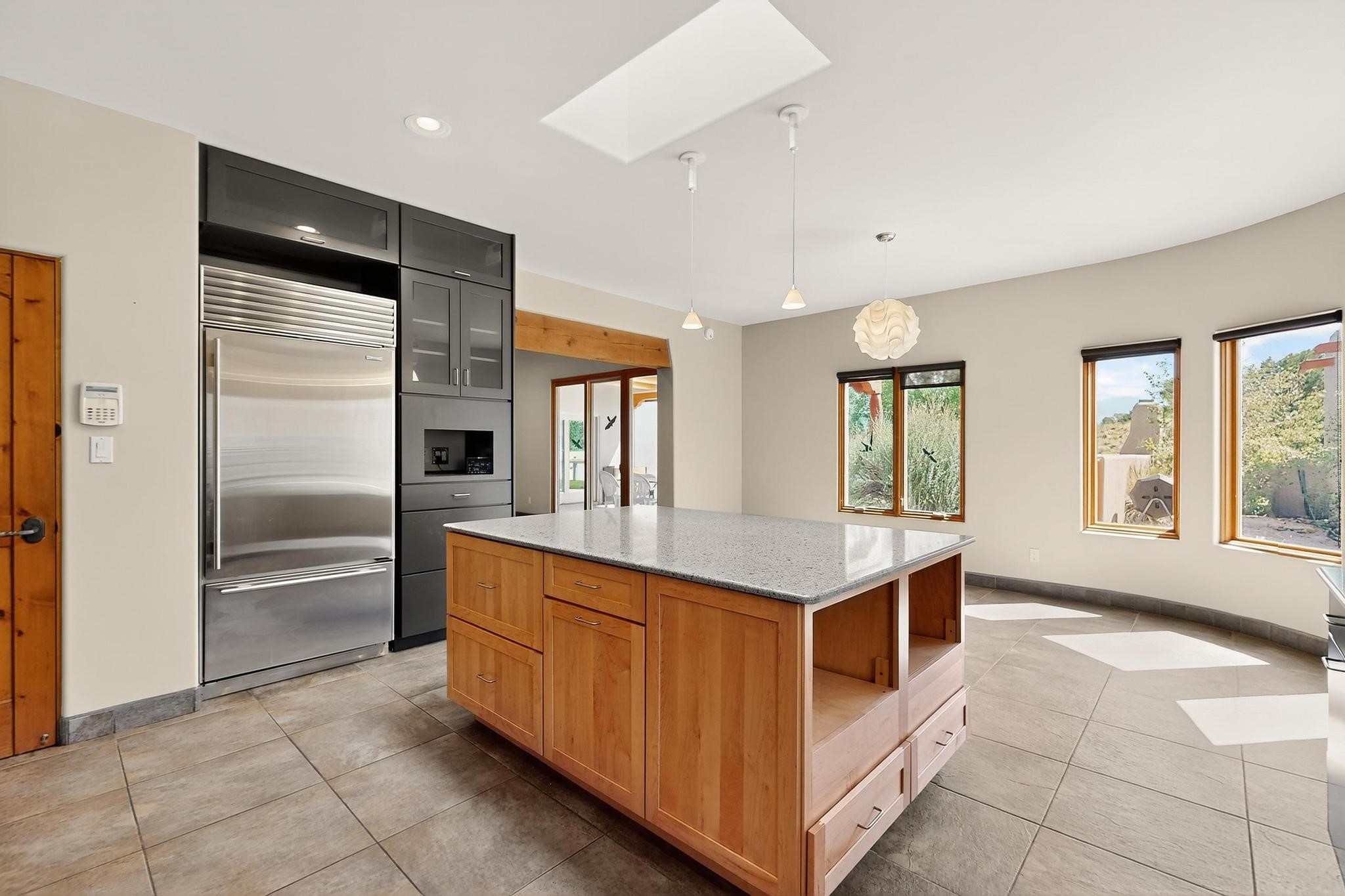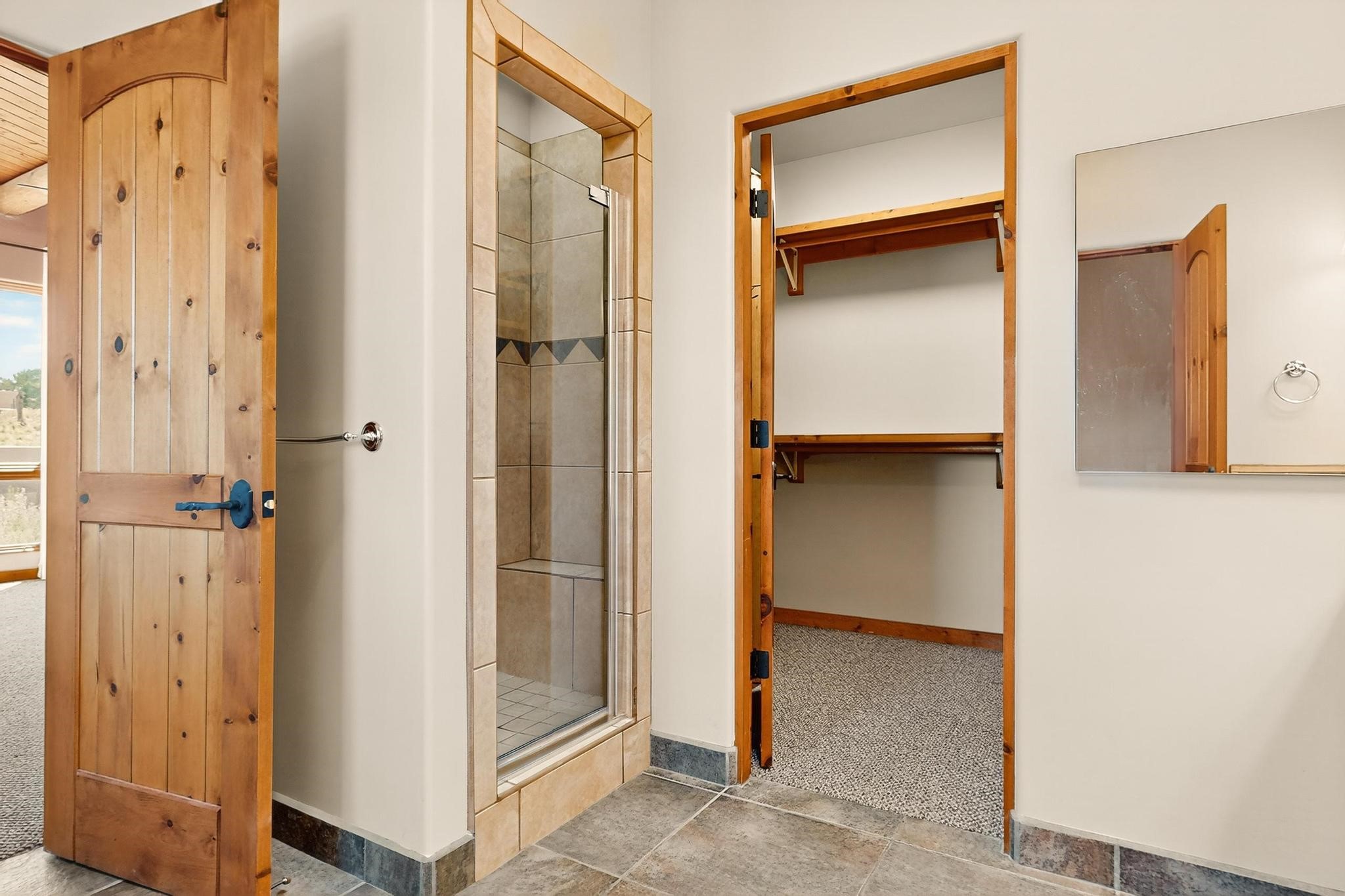 Priced to Sell! Potential multigenerational living. Expansive contemporary pueblo, split bedroom open plan design with high ceilings throughout. The main home includes a formal dining area, spacious great room with kiva fireplace, a large primary suite with kiva fireplace, large walk in closet and spa-like bathroom. Excellent separation from the two guest bedrooms and bath, plus a den/study. The kitchen has been remodeled including an induction range top, custom lighted cabinetry and pantry. The radiant heating is supplemented by 5 mini splits to keep a comfortable temperature summer and winter. There is a large heated storage room/workroom for hobbies and toys plus an oversized 2 car garage. Behind the home sits a detached 478 sq.ft. heated 2 room studio/guest with a 3/4 bathroom for extra guests/office or studio with a separate septic system. A lovely walled garden with a 3rd kiva fireplace for enjoyment plus a large portal for morning or evening outside entertainment. Enjoy the historic railway and rail trail bordering the back of your land. Plenty of guest parking with a paved driveway and easy access to Eldorado amenities, local shopping only minutes into Santa Fe.