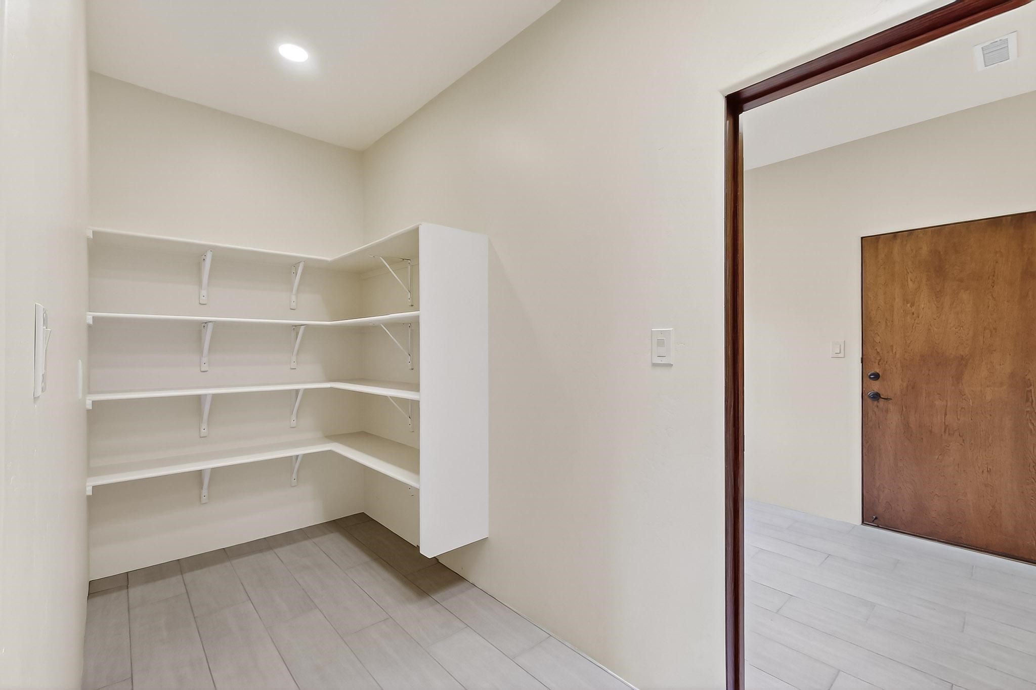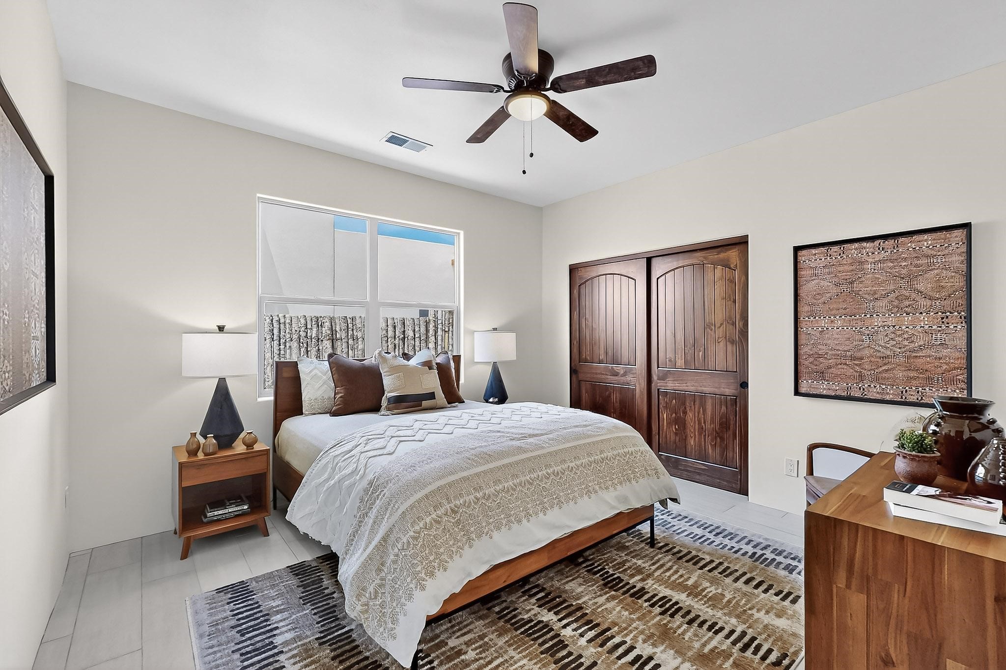 With a gated front courtyard wall and a 3 Car garage, this San Antonio Plan consists of 2260 sq. ft., 3 bedrooms and 2 1/2 baths. Located at 33 La Pradera in the La Pradera Subdivision, the exterior is a pitched roof Spanish design with clay-like tile roofs and covered portals with heavy wood beams and brick pavers. The 3-car driveway is a colored stamped- concrete design. The home is entered through an 8 ft. high door to a foyer with a boveda ceiling and beige, wood-like porcelain floor tiles. To the right is a powder room and to the left is a hallway with a nicho-accented wall leading to the two (2) guest bedrooms. The foyer leads into the living/dining room which has a 12-foot-high ceiling with cedar-stained wood beams and clear-coated T & G trim and a gas fireplace. The living room and the owner's suite open out to a covered portal with brick pavers and a gas-fired fireplace. The open kitchen has white cabinets mahogany- colored backsplash tile. An exceptionally large pantry is directly off the kitchen. The utility room is then accessed from the pantry and has ample cabinets, skylight, and a sink.The owner's bath has a large walk-in shower with euro-style shower fixtures and an overhead rain shower head. There is also an exceptionally large walk-incloset. The insulated garage includes a storage room and an epoxy-coated floor.
