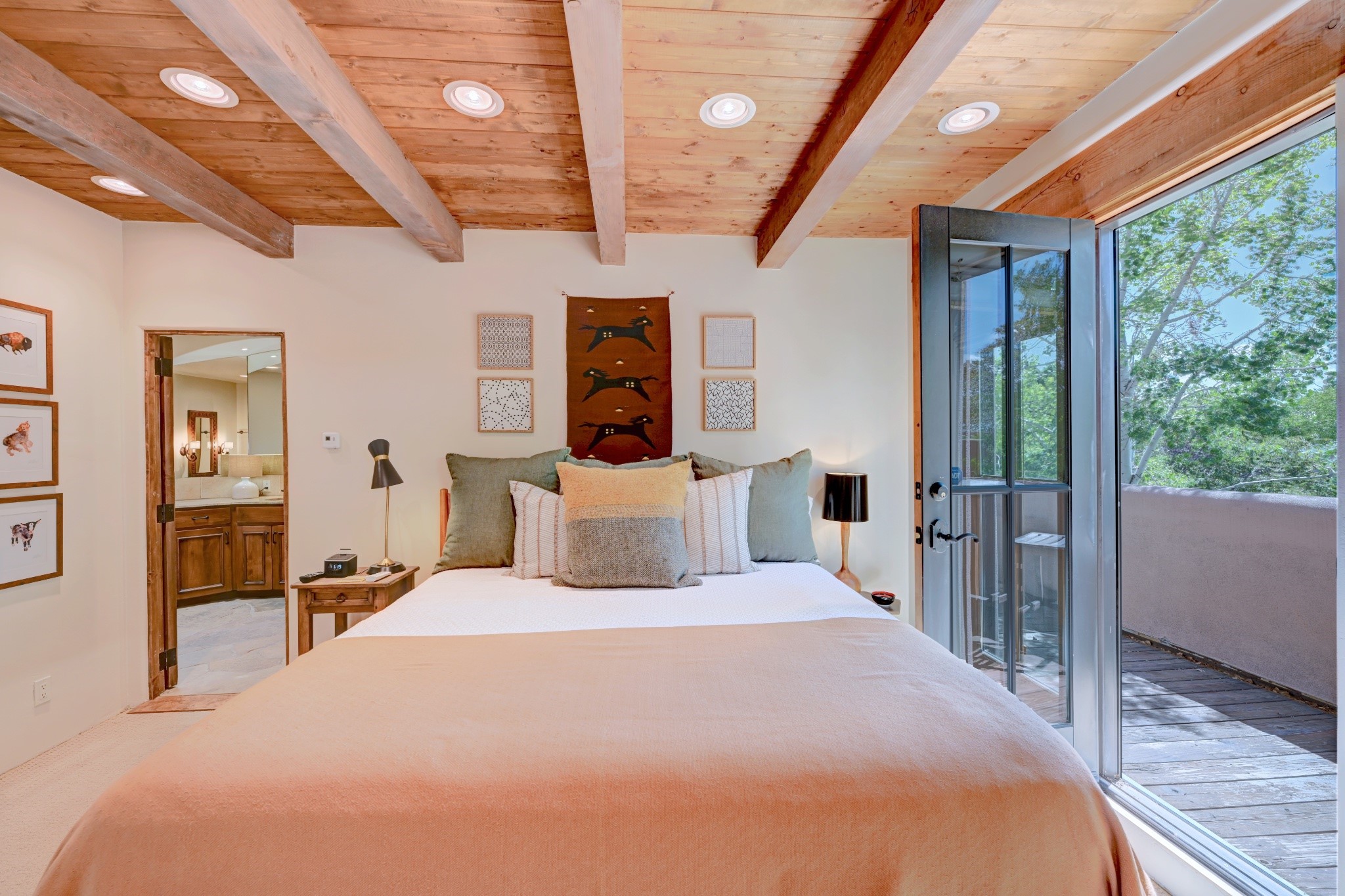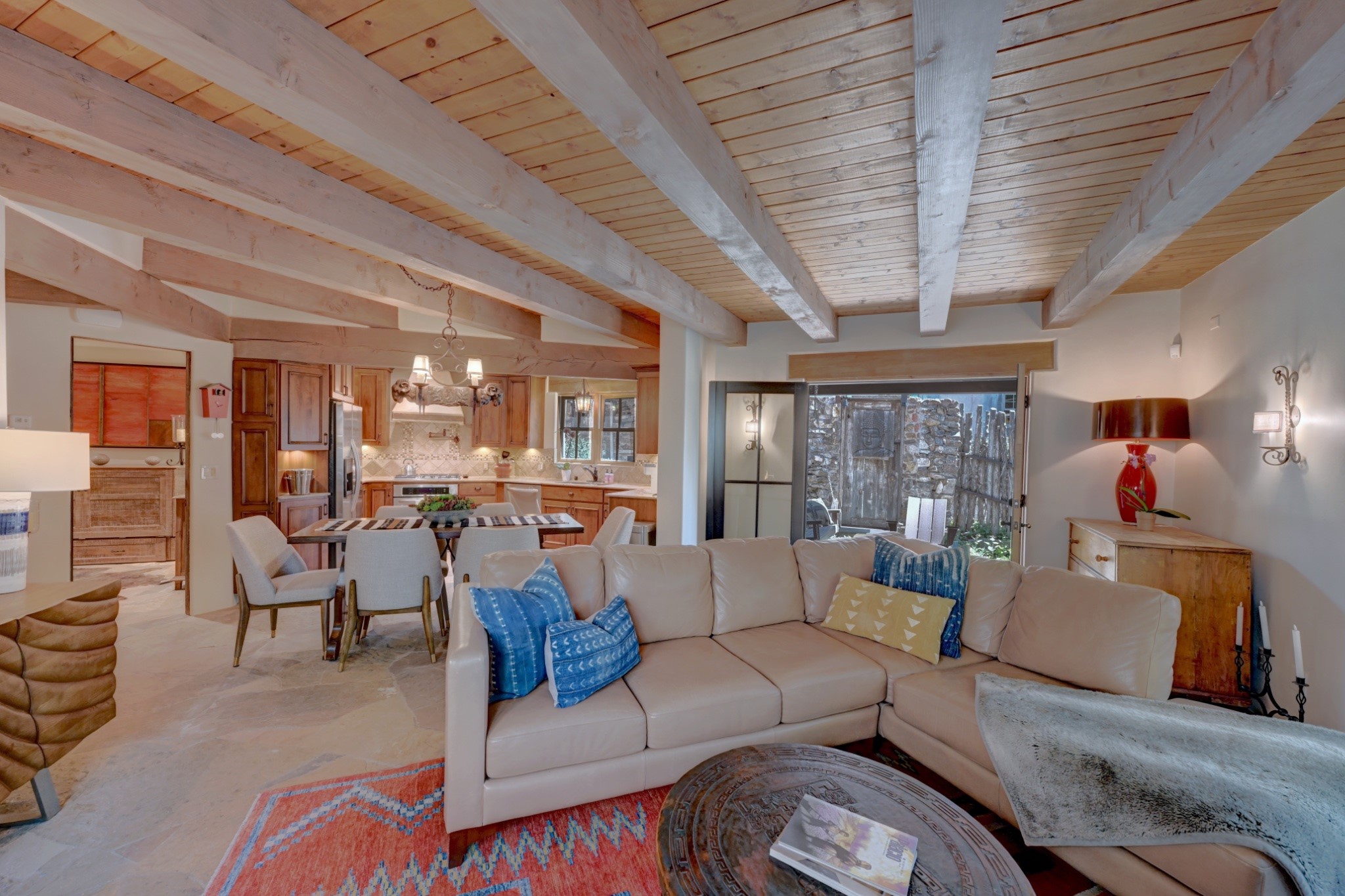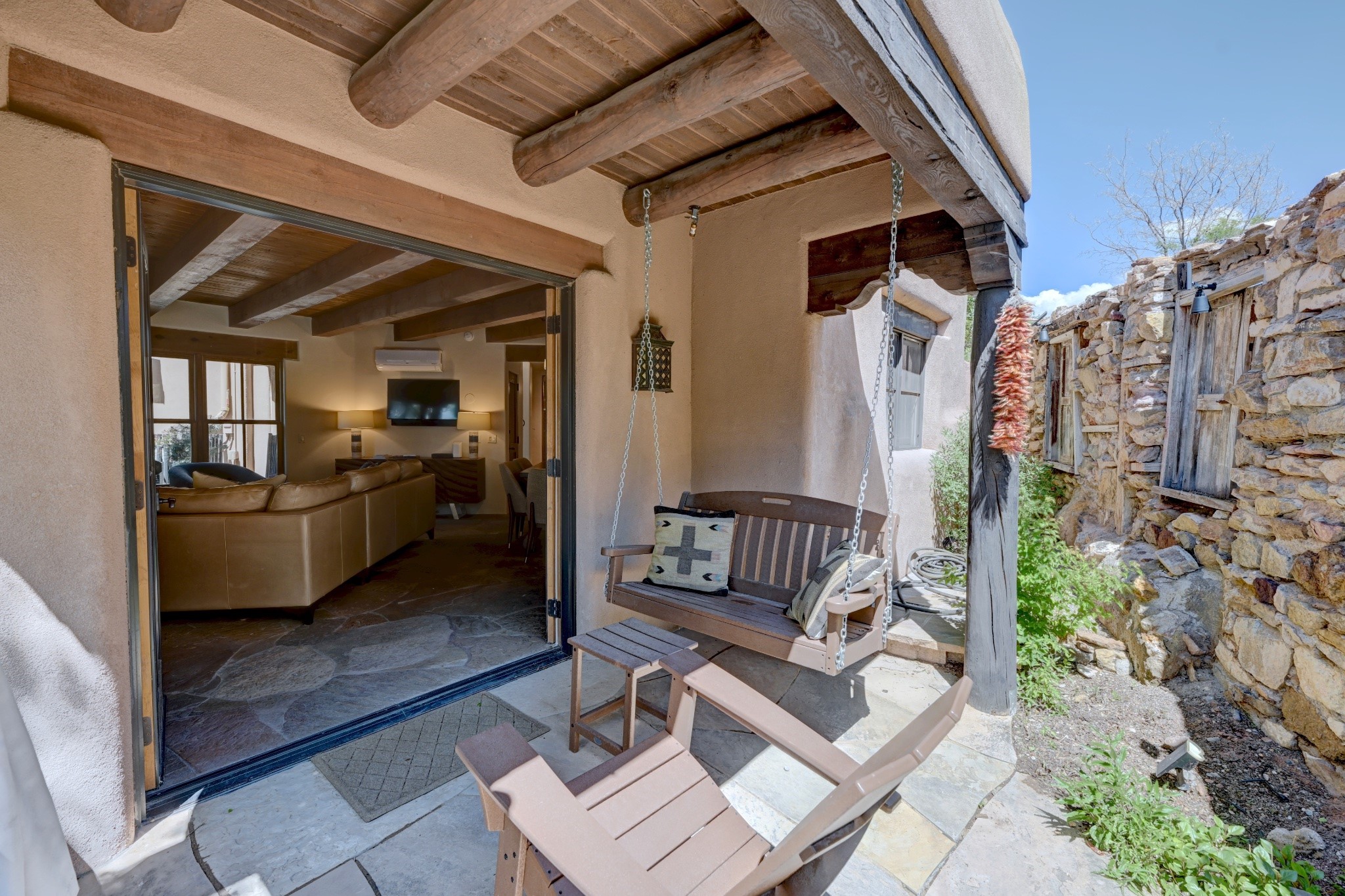 Nestled in the heart of Santa Fe's coveted historic Eastside and located off of Gonzales Rd, this elegant condo captures the essence of Southwestern living. Just a short walk from the famed Canyon Road art district, you'll find yourself perfectly positioned to enjoy the city's rich culture. Step inside to discover authentic Santa Fe style throughout this 1,352 +/- square foot retreat within a two-condo development. Admire beautiful beam and wood-plank ceilings, while gorgeous hand-hewn flagstone floors ground the space in traditional craftsmanship. The well-appointed cook's kitchen flows seamlessly into the living and dining areas, featuring thoughtful touches like a two-drawer dishwasher, convenient pot-filler, and a microwave drawer. Unwind by the kiva fireplace in the living room or step outside to your enchanting garden. This outdoor oasis boasts a hand-stacked rock wall, carved Buddha wooden gate, large, mature Wisteria vine and a soothing fountain surrounded by two distinct seating areas--all beautifully landscaped for easy care. Upstairs, the primary bedroom suite offers a private deck with lovely views, plus an ensuite bathroom featuring a double sink vanity, large soaking tub, and luxurious steam shower. Artistic details abound throughout, from wrought iron stair rails and light fixtures to hand painting on a nicho and fireplace. A charming wooden door with hand-painted Santos leads to the second bedroom, which doubles perfectly as a home office. Every room showcases custom cabinetry, doors, and true divided-light windows. Modern comforts include radiant in-floor heating, ductless mini-splits for cooling comfort, and a new tankless hot water heater. One dedicated parking space completes this package. Located minutes from Canyon Road's galleries, world renown restaurants and the Santa Fe Plaza's downtown attractions, this condo offers both convenience and tranquility. Whether as your Santa Fe pied--terre or full-time residence, this lock-and-leave lifestyle puts the best of The City Different at your doorstep. Please see the Matterport 3-D walkthrough in the listing. An extensive furniture package is available for purchase separately.