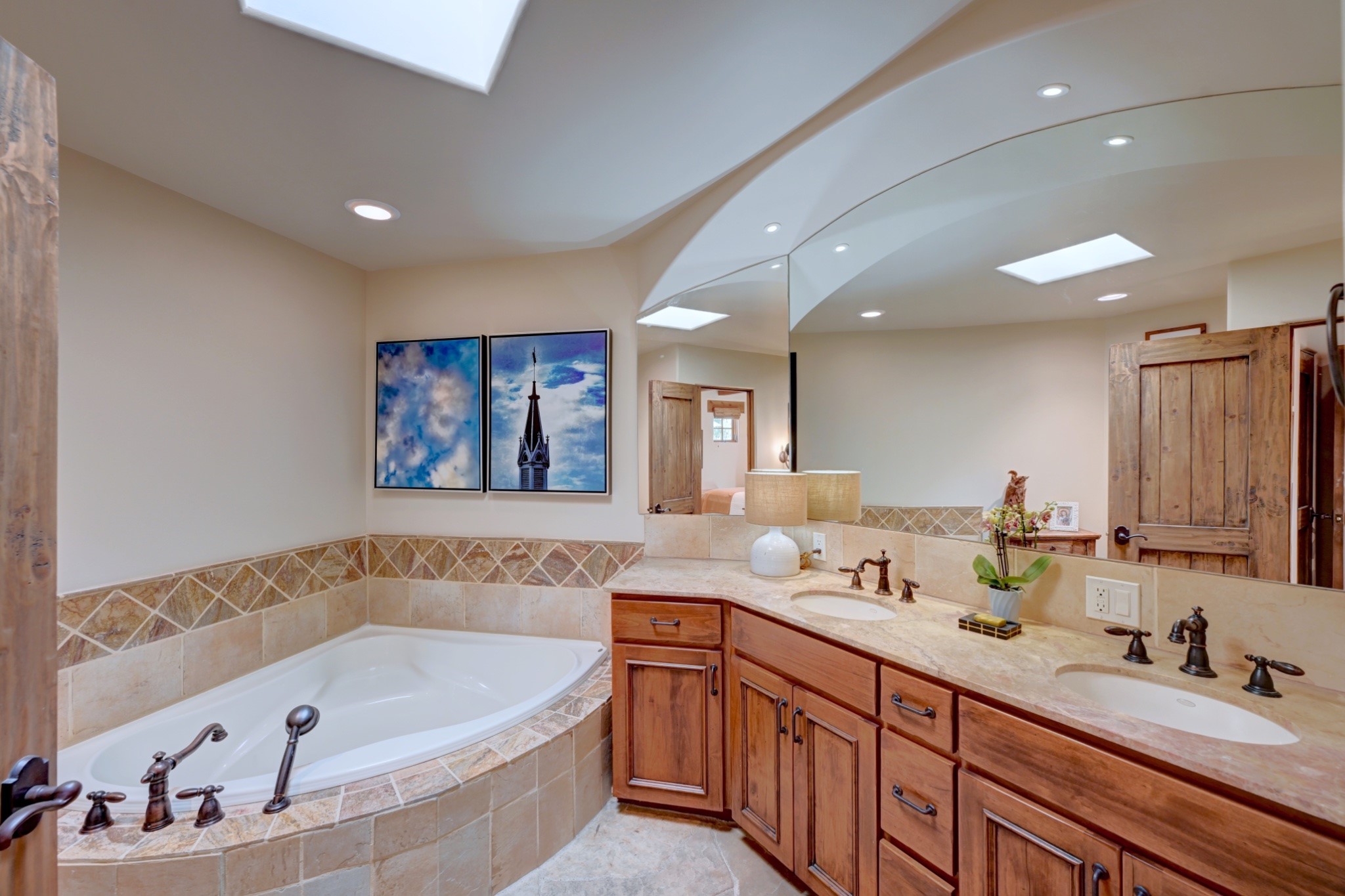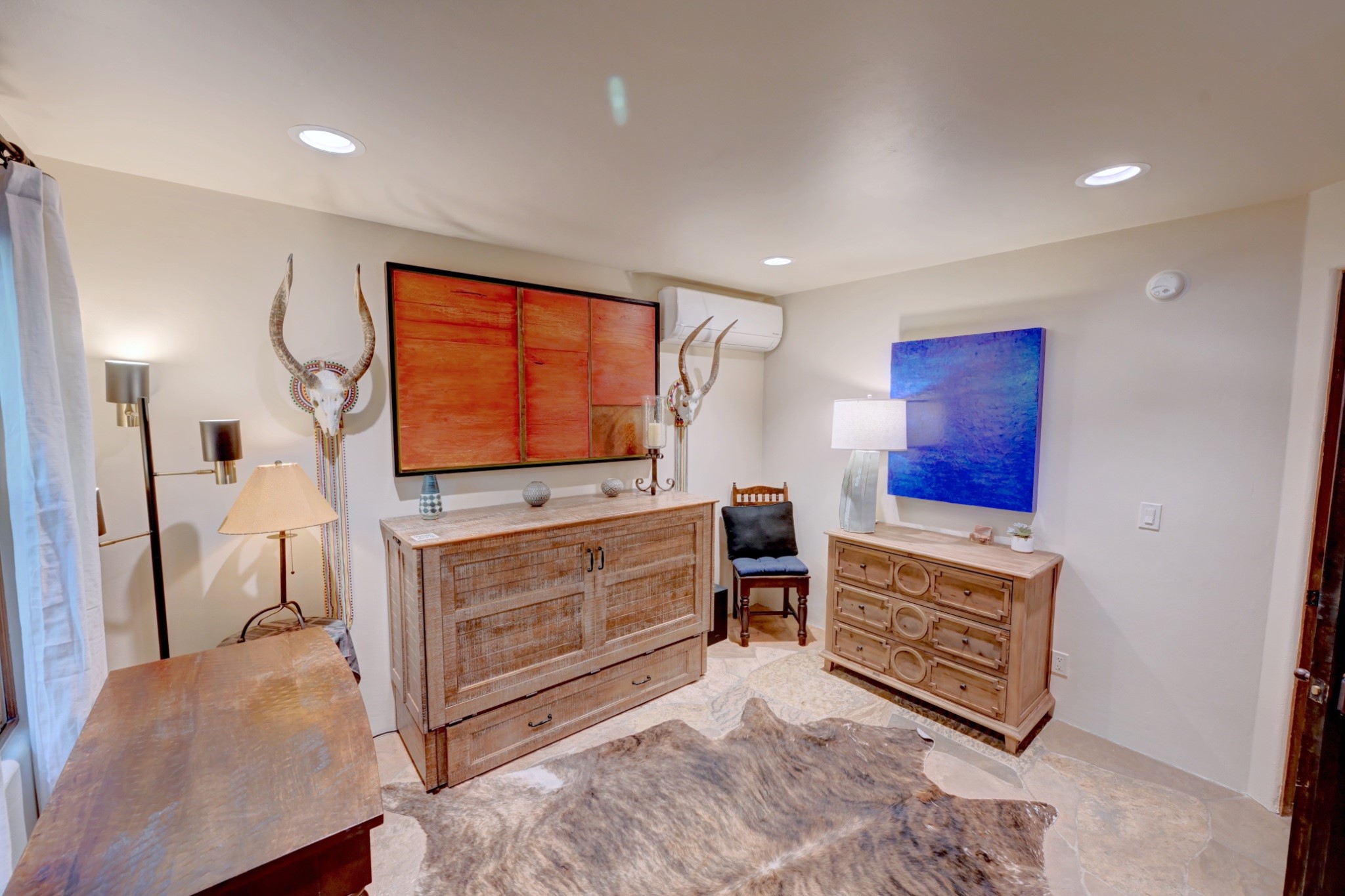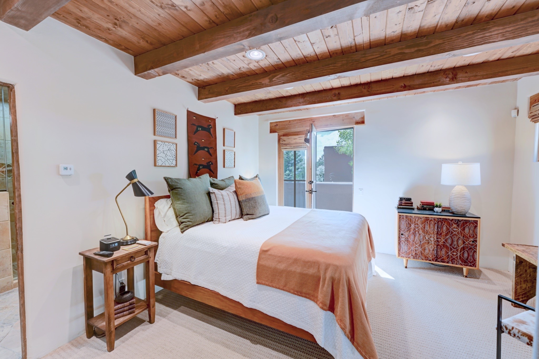 Nestled in the heart of Santa Fe's coveted historic Eastside and located off of Gonzales Rd, this elegant condo captures the essence of Southwestern living. Just a short walk from the famed Canyon Road art district, you'll find yourself perfectly positioned to enjoy the city's rich culture. Step inside to discover authentic Santa Fe style throughout this 1,352 +/- square foot retreat within a two-condo development. Admire beautiful beam and wood-plank ceilings, while gorgeous hand-hewn flagstone floors ground the space in traditional craftsmanship. The well-appointed cook's kitchen flows seamlessly into the living and dining areas, featuring thoughtful touches like a two-drawer dishwasher, convenient pot-filler, and a microwave drawer. Unwind by the kiva fireplace in the living room or step outside to your enchanting garden. This outdoor oasis boasts a hand-stacked rock wall, carved Buddha wooden gate, large, mature Wisteria vine and a soothing fountain surrounded by two distinct seating areas--all beautifully landscaped for easy care. Upstairs, the primary bedroom suite offers a private deck with lovely views, plus an ensuite bathroom featuring a double sink vanity, large soaking tub, and luxurious steam shower. Artistic details abound throughout, from wrought iron stair rails and light fixtures to hand painting on a nicho and fireplace. A charming wooden door with hand-painted Santos leads to the second bedroom, which doubles perfectly as a home office. Every room showcases custom cabinetry, doors, and true divided-light windows. Modern comforts include radiant in-floor heating, ductless mini-splits for cooling comfort, and a new tankless hot water heater. One dedicated parking space completes this package. Located minutes from Canyon Road's galleries, world renown restaurants and the Santa Fe Plaza's downtown attractions, this condo offers both convenience and tranquility. Whether as your Santa Fe pied--terre or full-time residence, this lock-and-leave lifestyle puts the best of The City Different at your doorstep. Please see the Matterport 3-D walkthrough in the listing. An extensive furniture package is available for purchase separately.