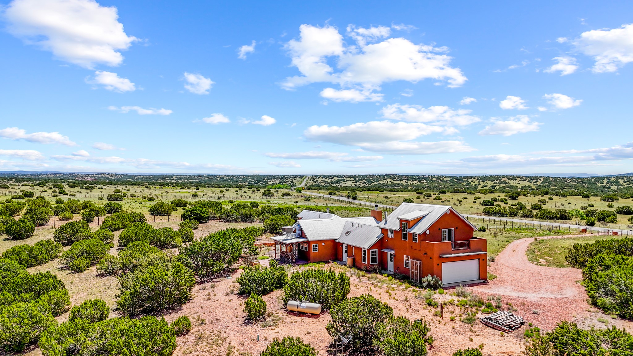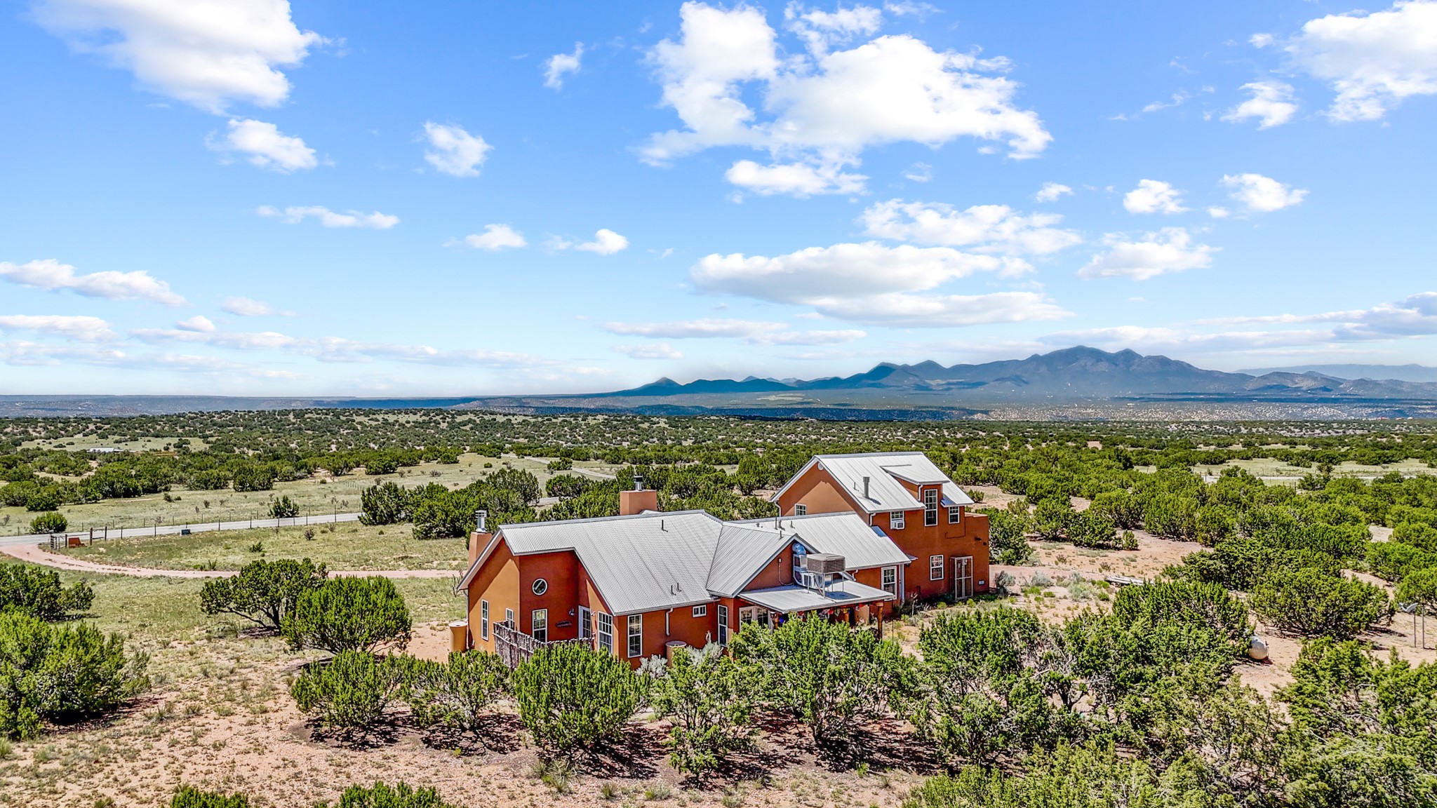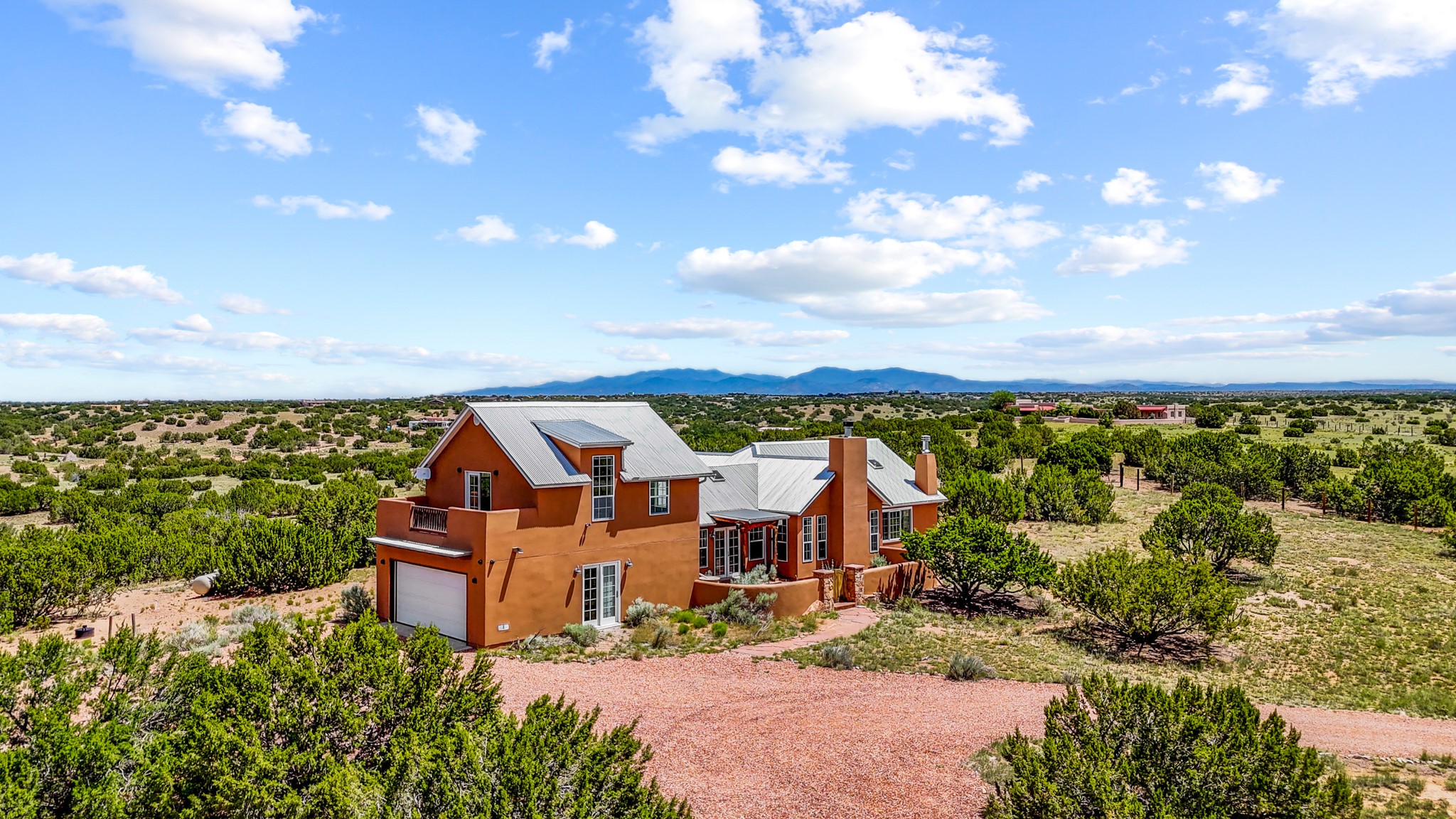 Discover a true work of art, designed and built by the artist who cherished it for 18 years. This private sanctuary sits on 10 acres of serene high-desert landscape just south of Santa Fe. Located off the scenic Turquoise Trail (Hwy 14), the gated property offers commanding views from its high point, showcasing the majestic Sangre de Cristo, Jemez, and Sandia Mountains, as well as Cerro Pelon, the Ortiz Mountains, and the Cerrillos Hills.This move-in ready home masterfully blends a light-filled, soft contemporary feel with the soul of an authentic New Mexican ranch home. The clean, sophisticated design features a pitched metal roof, passive solar principles, and beautiful Saltillo tile floors accented with small decorative tiles.The heart of the home is the great room, boasting vaulted ceilings with exposed beams, and an open concept kitchen, dining, and living area with a fireplace. The kitchen is appointed with stainless appliances and a large island topped with hand-poured concrete countertops.Retreat to the luxurious owner's suite, complete with its own kiva fireplace. The spa-like bathroom is a masterpiece of natural light, featuring stunning floor stones from Brazil, a deep footed tub, a walk-in shower, and hand-poured concrete counters. This private oasis also provides access to a walled patio and an outdoor shower.The second floor reveals a versatile studio, an ideal workspace with durable rubber flooring and a viewing deck that captures spectacular western sunsets over the Jemez and Ortiz Mountains. With views from almost every window and a rainwater catchment system, this 2-bedroom, 2-full-bathroom home is a sophisticated perch offering unmatched solitude and privacy.