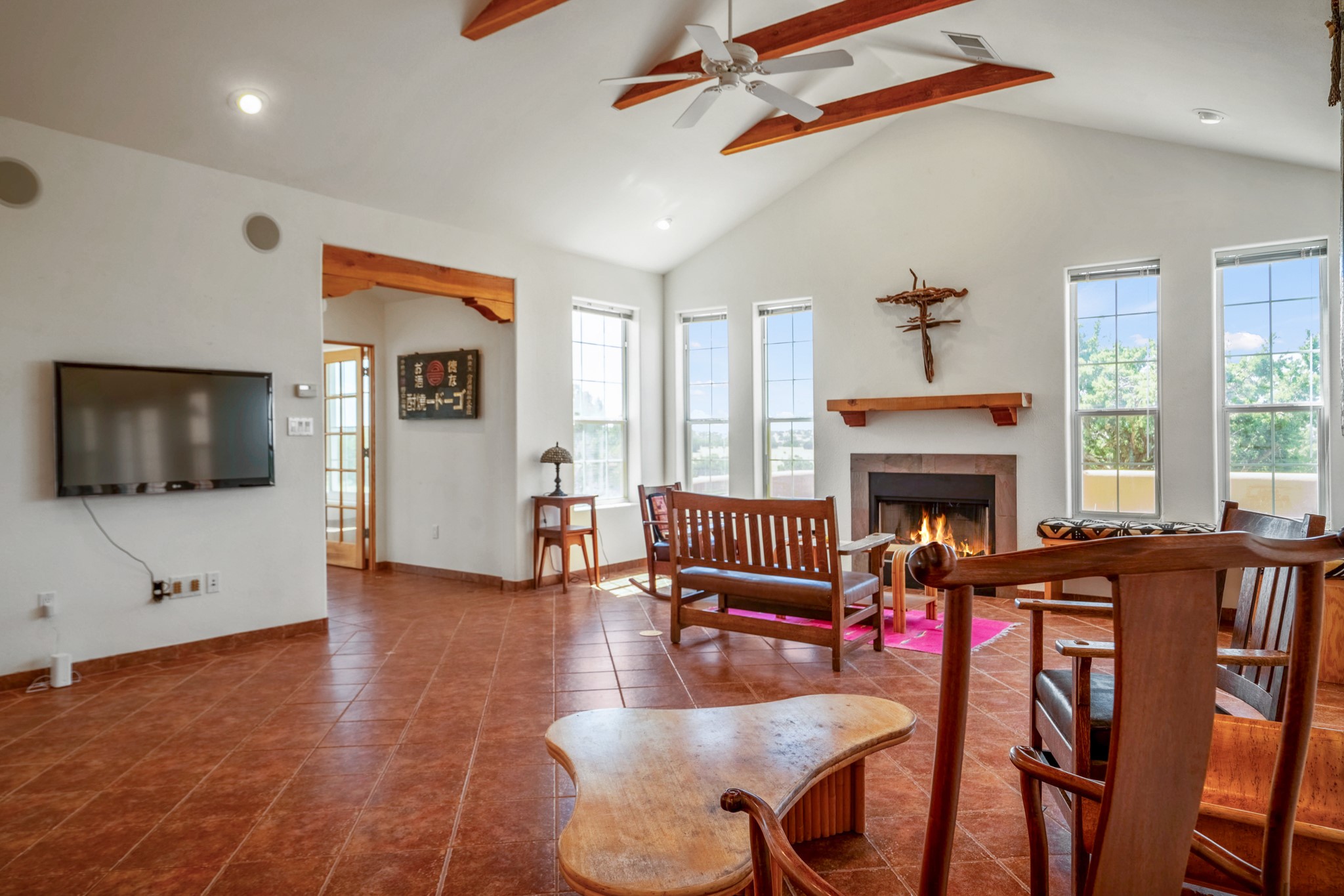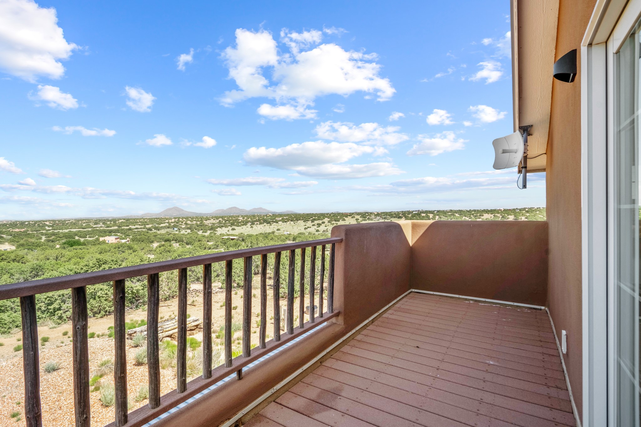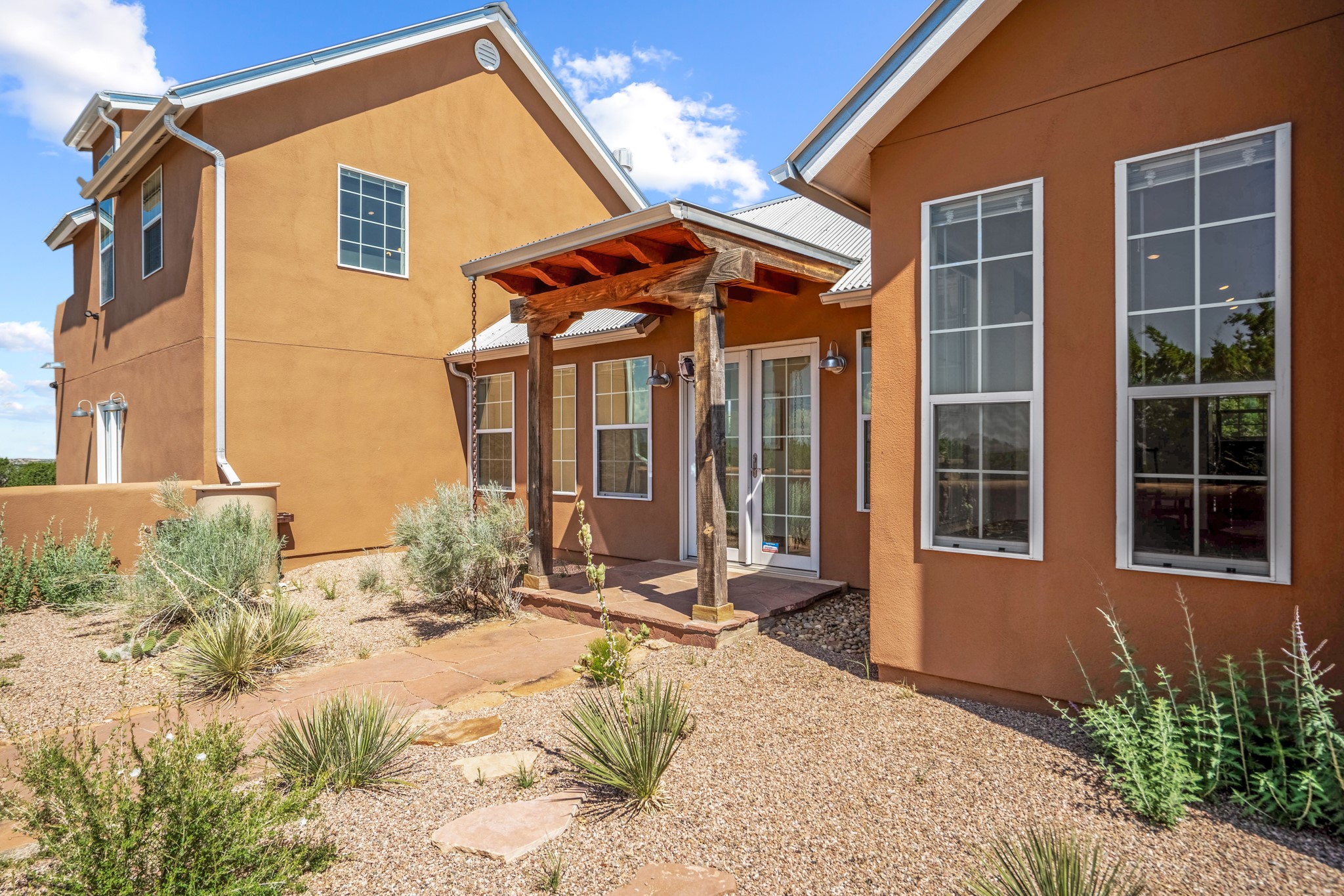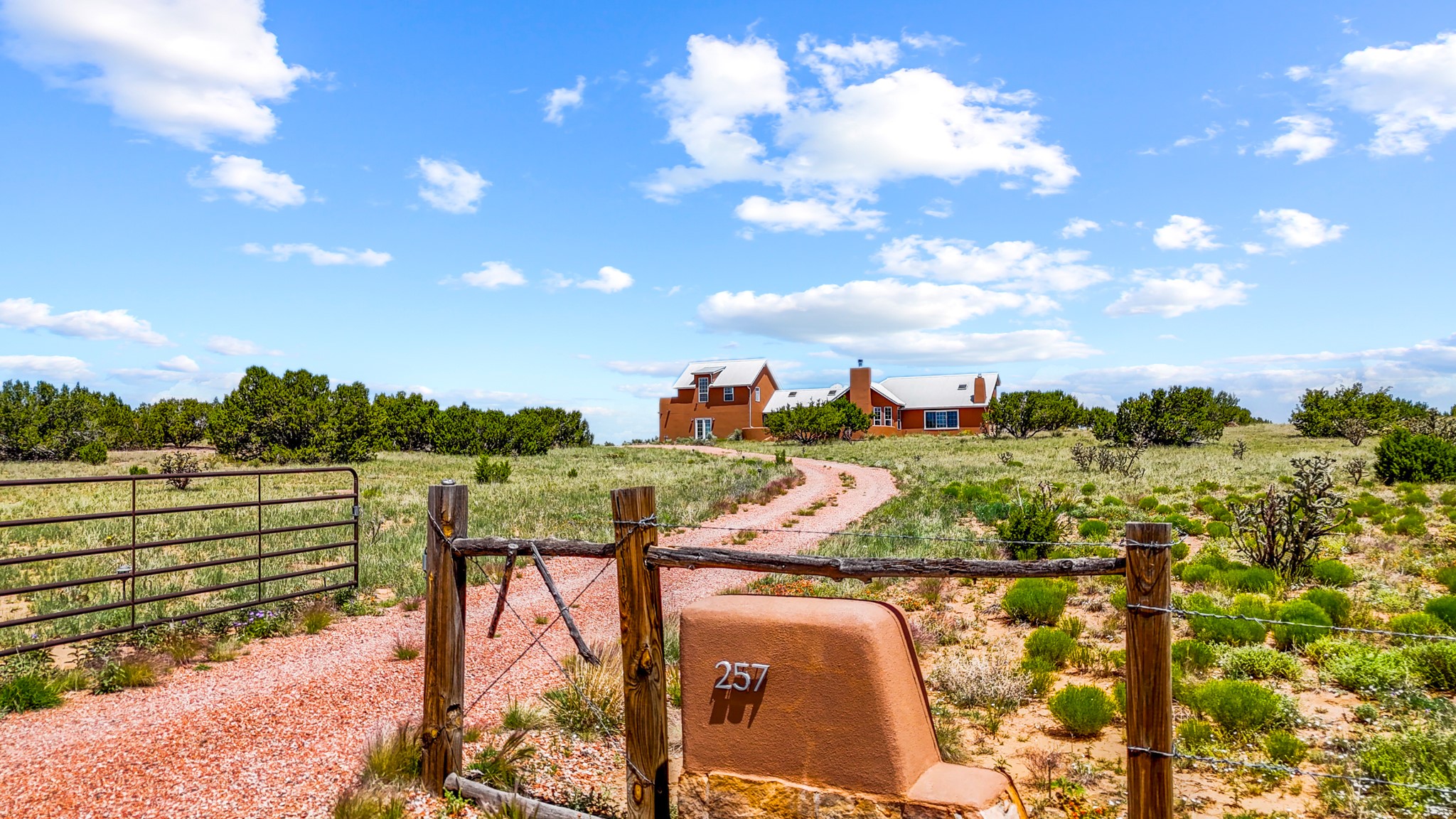 Discover a true work of art, designed and built by the artist who cherished it for 18 years. This private sanctuary sits on 10 acres of serene high-desert landscape just south of Santa Fe. Located off the scenic Turquoise Trail (Hwy 14), the gated property offers commanding views from its high point, showcasing the majestic Sangre de Cristo, Jemez, and Sandia Mountains, as well as Cerro Pelon, the Ortiz Mountains, and the Cerrillos Hills.This move-in ready home masterfully blends a light-filled, soft contemporary feel with the soul of an authentic New Mexican ranch home. The clean, sophisticated design features a pitched metal roof, passive solar principles, and beautiful Saltillo tile floors accented with small decorative tiles.The heart of the home is the great room, boasting vaulted ceilings with exposed beams, and an open concept kitchen, dining, and living area with a fireplace. The kitchen is appointed with stainless appliances and a large island topped with hand-poured concrete countertops.Retreat to the luxurious owner's suite, complete with its own kiva fireplace. The spa-like bathroom is a masterpiece of natural light, featuring stunning floor stones from Brazil, a deep footed tub, a walk-in shower, and hand-poured concrete counters. This private oasis also provides access to a walled patio and an outdoor shower.The second floor reveals a versatile studio, an ideal workspace with durable rubber flooring and a viewing deck that captures spectacular western sunsets over the Jemez and Ortiz Mountains. With views from almost every window and a rainwater catchment system, this 2-bedroom, 2-full-bathroom home is a sophisticated perch offering unmatched solitude and privacy.