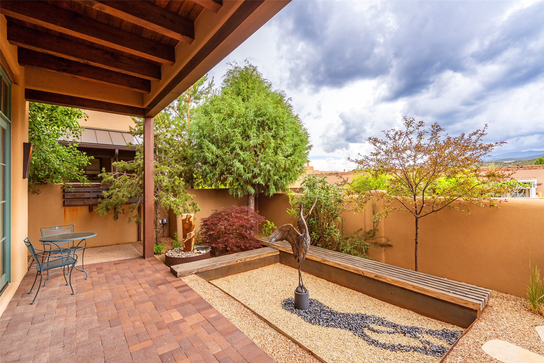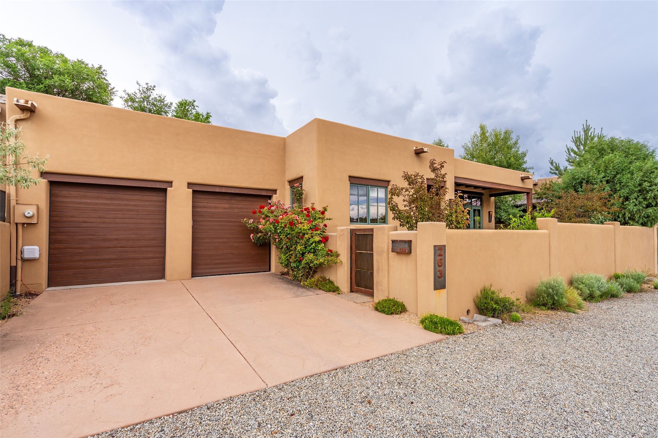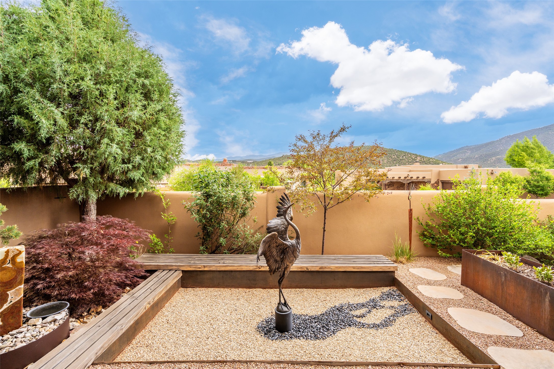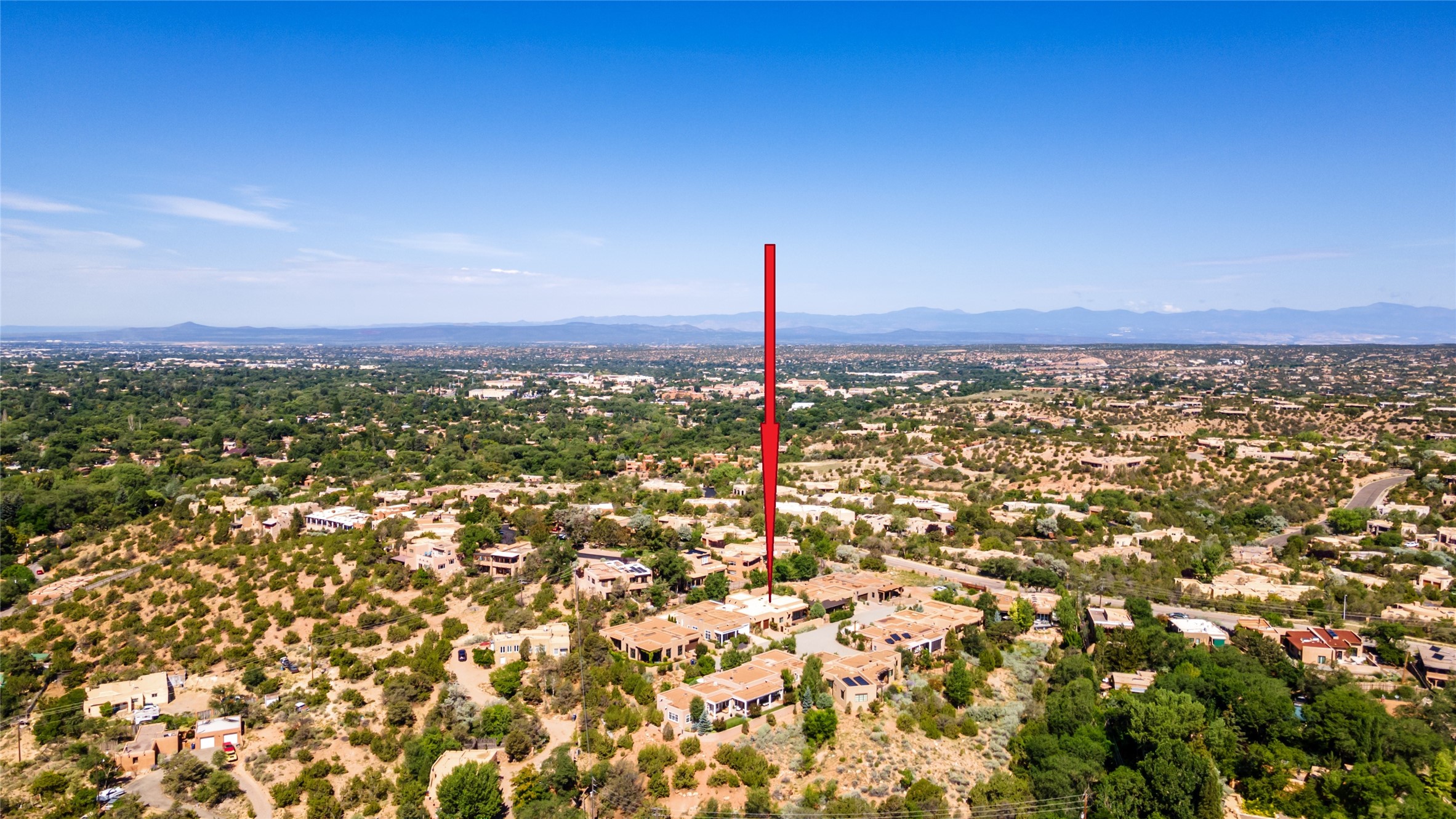 Simply Sublime in the Santa Fe Foothills! Located just moments from both Canyon Road and the historic Santa Fe Plaza, this stunning contemporary residence is the perfect blend of sophisticated elegance and functional livability. Nestled in the picturesque foothills within a charmingly small, gated community, the home offers sweeping views of the Sangre de Cristo Mountains through expansive French doors that flood the interior with natural light. Beautifully designed with a modern sensibility, the open-concept floor plan showcases wide-plank French Oak flooring, smooth hand-troweled plaster walls, and impeccable attention to detail throughout. The chef's kitchen is a true showstopper, featuring Calcutta marble countertops, custom Walnut cabinetry, and premium appliances including a new 36-inch Fisher & Paykel induction range.The spacious primary suite is a serene retreat with direct access to a private rear courtyard surrounded by lush, tranquil landscaping--ideal for morning coffee or evening reflection. The spa-like primary bath includes dual sinks set into bespoke wood countertops, a luxurious soaking tub, and a generous walk-in shower. The ensuite guest bedroom also opens to its own private outdoor seating area, offering a peaceful escape for visitors. Additional features include a new, 2023 TPO roof, whole-house LED lighting, electronic water softener, refrigerated air conditioning, powder room for guests, and an attached two-car garage. Every element of this home has been thoughtfully curated--creating a truly exceptional contemporary sanctuary in one of Santa Fe's most coveted locations.