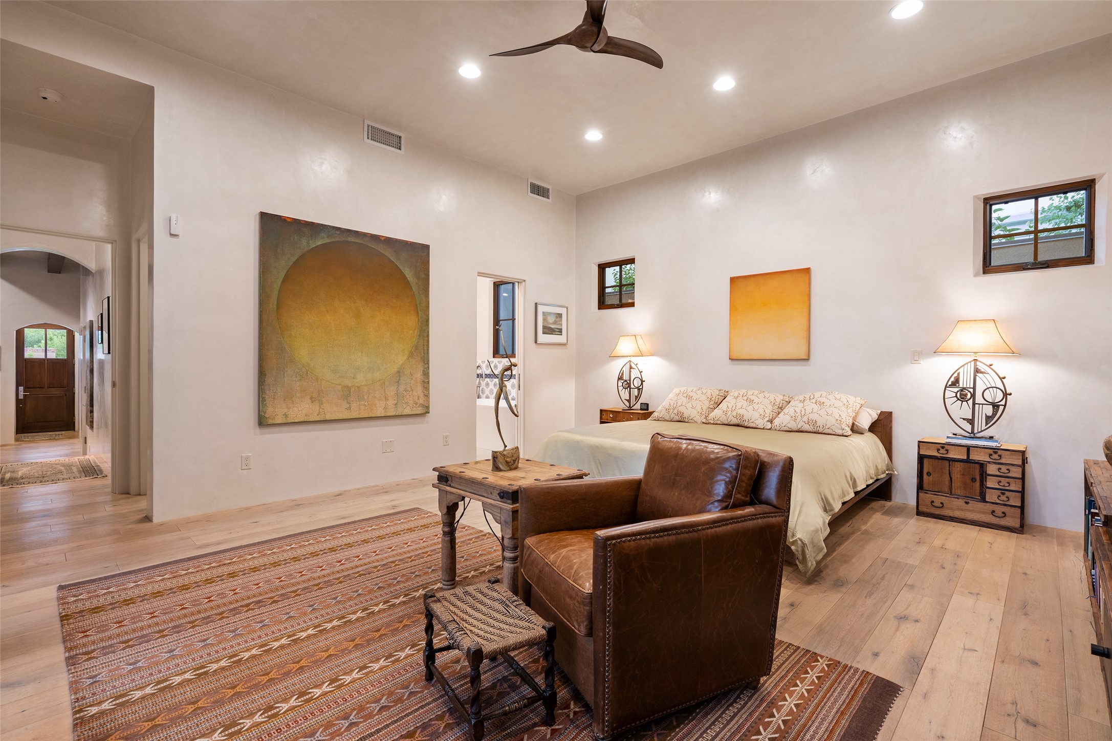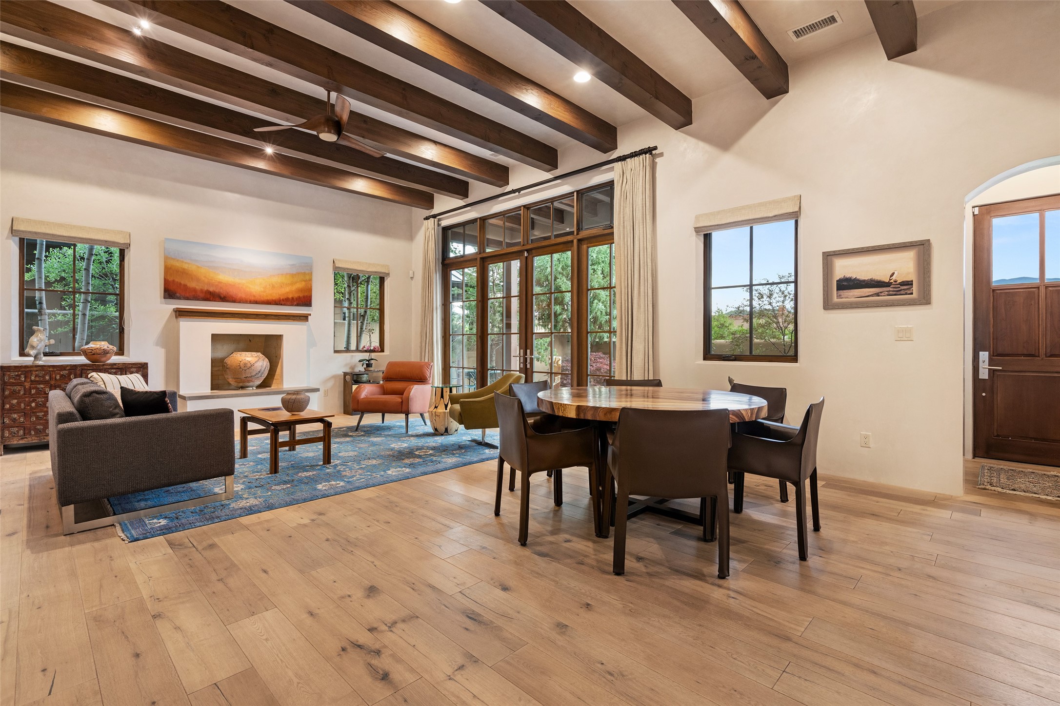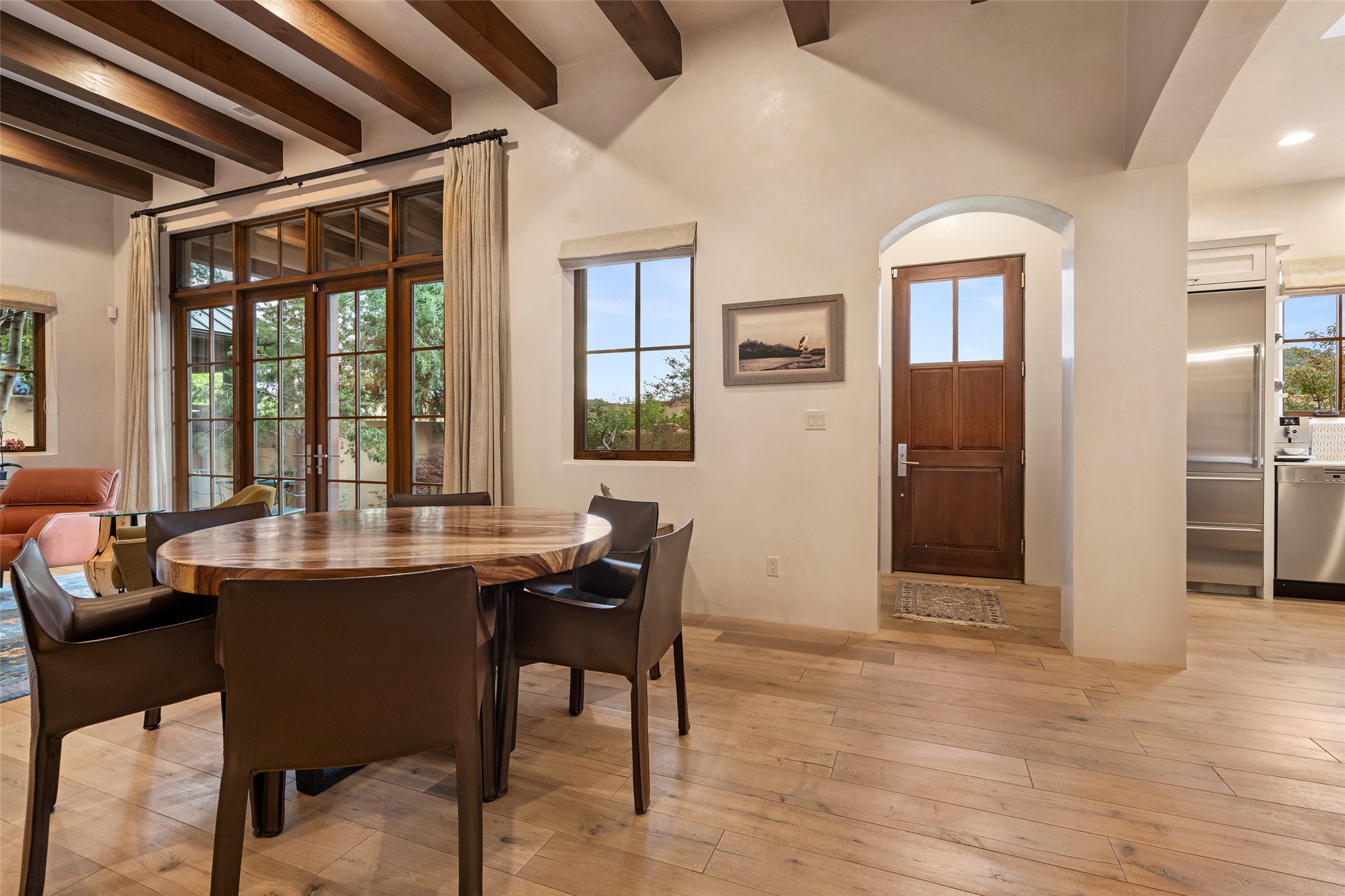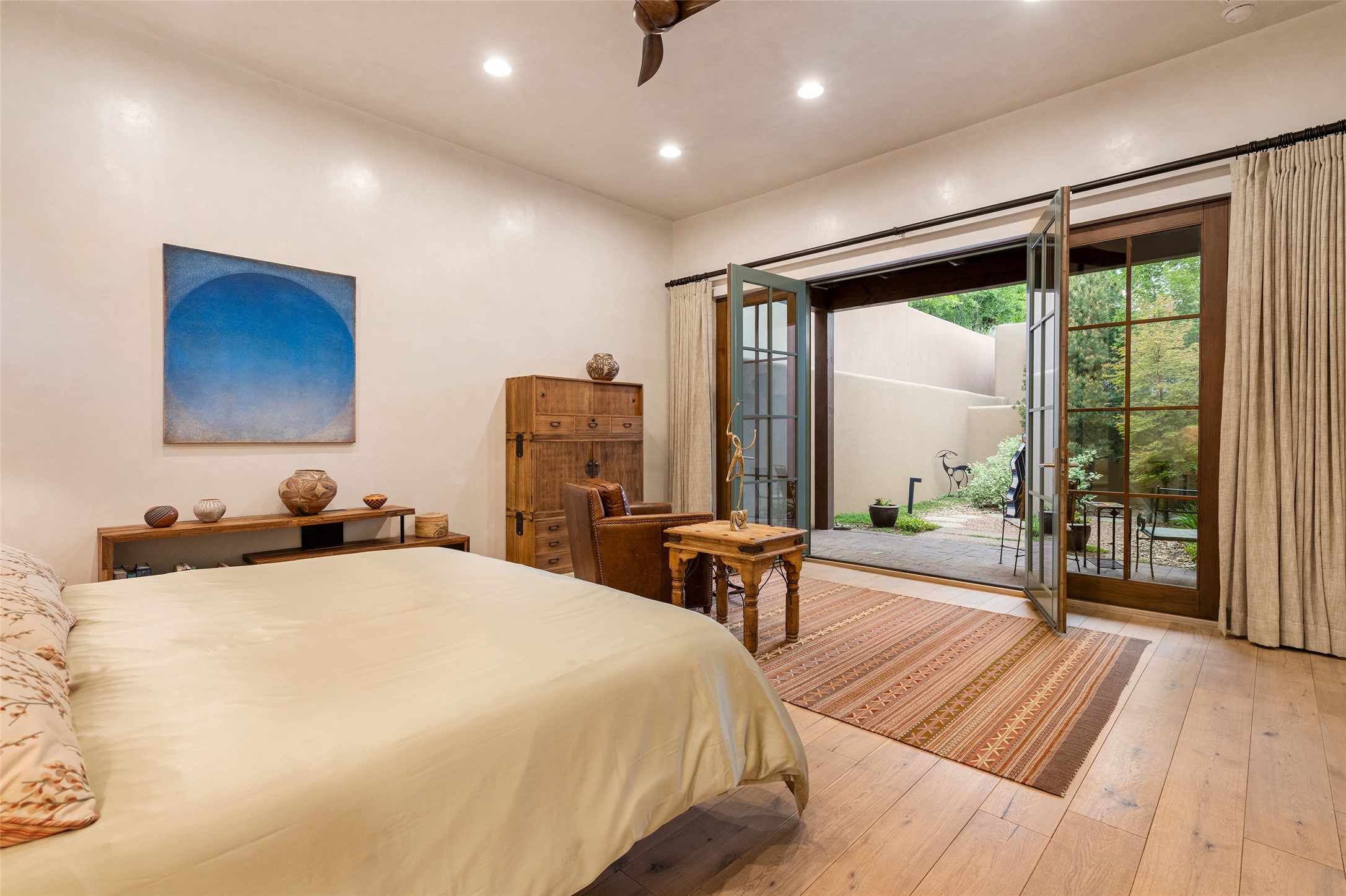 Simply Sublime in the Santa Fe Foothills! Located just moments from both Canyon Road and the historic Santa Fe Plaza, this stunning contemporary residence is the perfect blend of sophisticated elegance and functional livability. Nestled in the picturesque foothills within a charmingly small, gated community, the home offers sweeping views of the Sangre de Cristo Mountains through expansive French doors that flood the interior with natural light. Beautifully designed with a modern sensibility, the open-concept floor plan showcases wide-plank French Oak flooring, smooth hand-troweled plaster walls, and impeccable attention to detail throughout. The chef's kitchen is a true showstopper, featuring Calcutta marble countertops, custom Walnut cabinetry, and premium appliances including a new 36-inch Fisher & Paykel induction range.The spacious primary suite is a serene retreat with direct access to a private rear courtyard surrounded by lush, tranquil landscaping--ideal for morning coffee or evening reflection. The spa-like primary bath includes dual sinks set into bespoke wood countertops, a luxurious soaking tub, and a generous walk-in shower. The ensuite guest bedroom also opens to its own private outdoor seating area, offering a peaceful escape for visitors. Additional features include a new, 2023 TPO roof, whole-house LED lighting, electronic water softener, refrigerated air conditioning, powder room for guests, and an attached two-car garage. Every element of this home has been thoughtfully curated--creating a truly exceptional contemporary sanctuary in one of Santa Fe's most coveted locations.