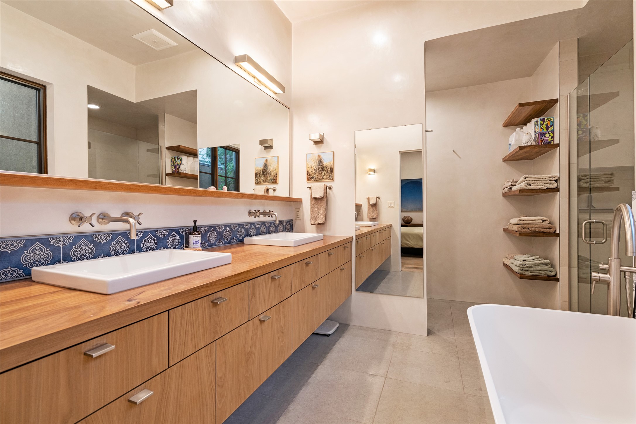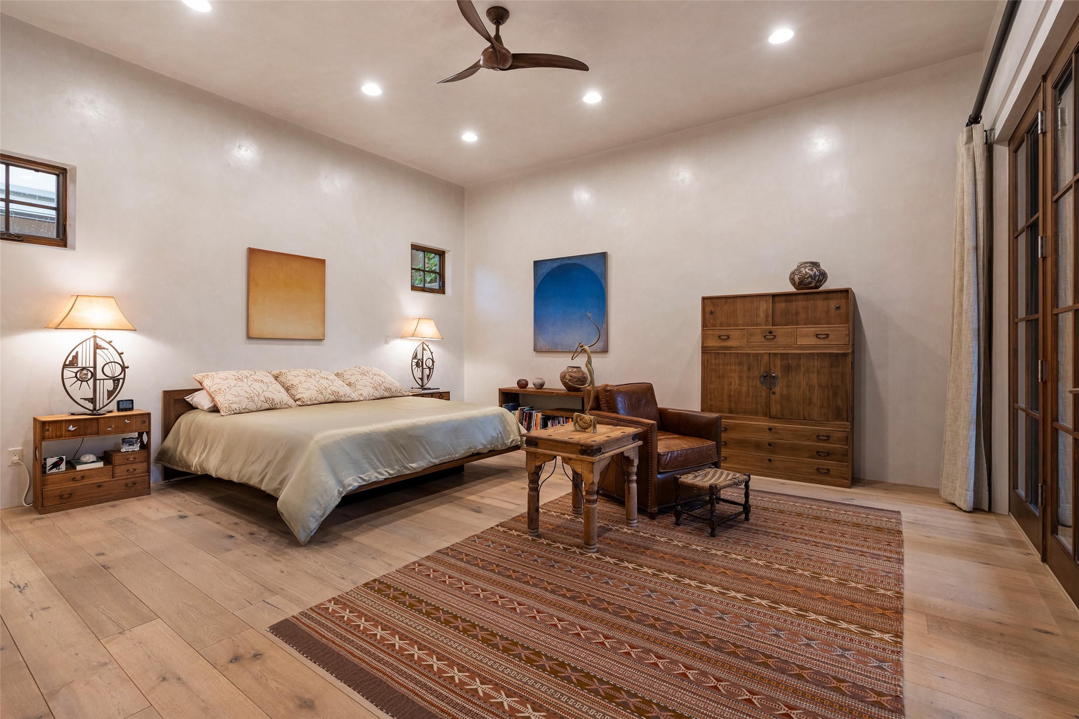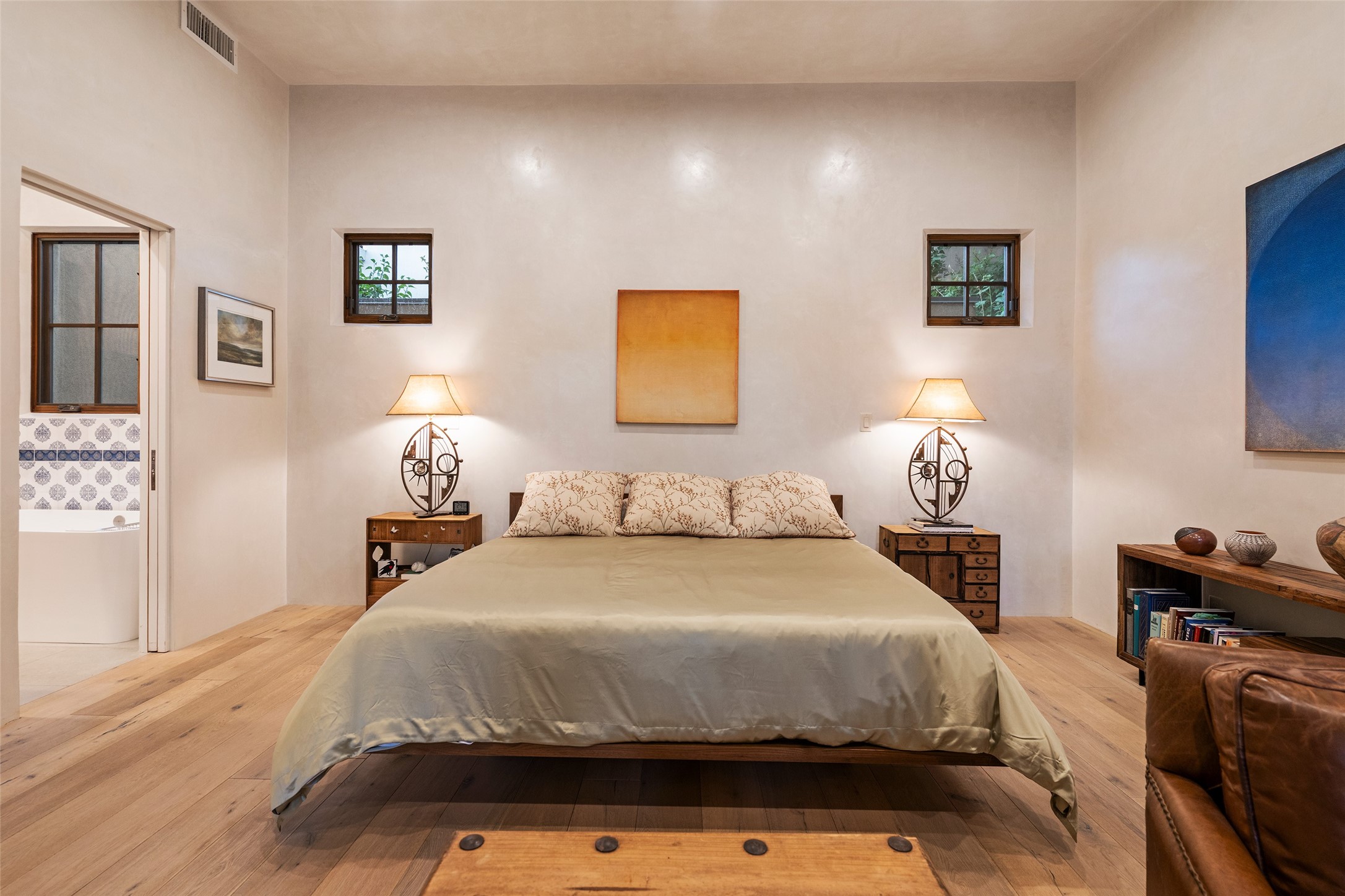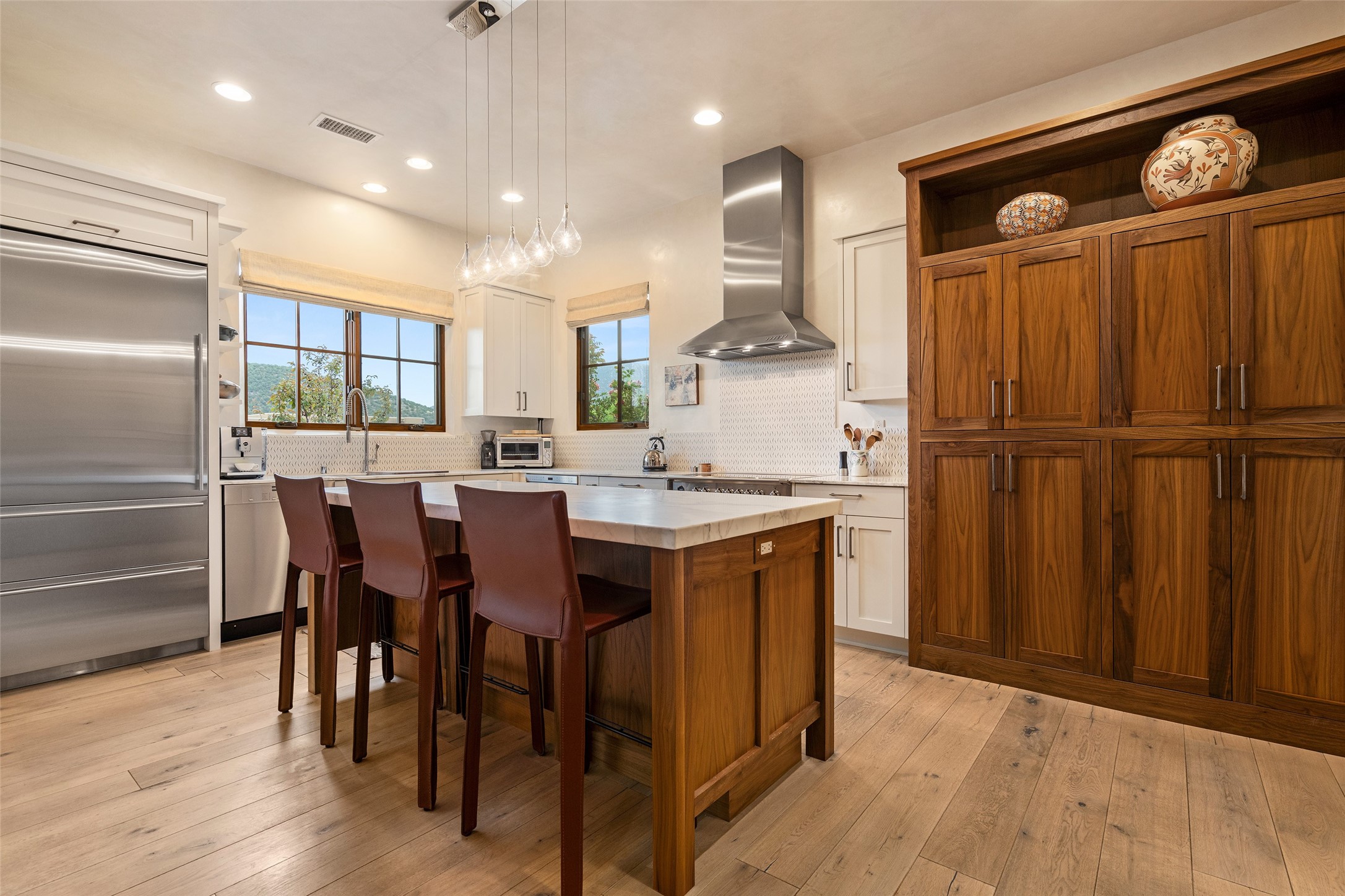 Simply Sublime in the Santa Fe Foothills! Located just moments from both Canyon Road and the historic Santa Fe Plaza, this stunning contemporary residence is the perfect blend of sophisticated elegance and functional livability. Nestled in the picturesque foothills within a charmingly small, gated community, the home offers sweeping views of the Sangre de Cristo Mountains through expansive French doors that flood the interior with natural light. Beautifully designed with a modern sensibility, the open-concept floor plan showcases wide-plank French Oak flooring, smooth hand-troweled plaster walls, and impeccable attention to detail throughout. The chef's kitchen is a true showstopper, featuring Calcutta marble countertops, custom Walnut cabinetry, and premium appliances including a new 36-inch Fisher & Paykel induction range.The spacious primary suite is a serene retreat with direct access to a private rear courtyard surrounded by lush, tranquil landscaping--ideal for morning coffee or evening reflection. The spa-like primary bath includes dual sinks set into bespoke wood countertops, a luxurious soaking tub, and a generous walk-in shower. The ensuite guest bedroom also opens to its own private outdoor seating area, offering a peaceful escape for visitors. Additional features include a new, 2023 TPO roof, whole-house LED lighting, electronic water softener, refrigerated air conditioning, powder room for guests, and an attached two-car garage. Every element of this home has been thoughtfully curated--creating a truly exceptional contemporary sanctuary in one of Santa Fe's most coveted locations.