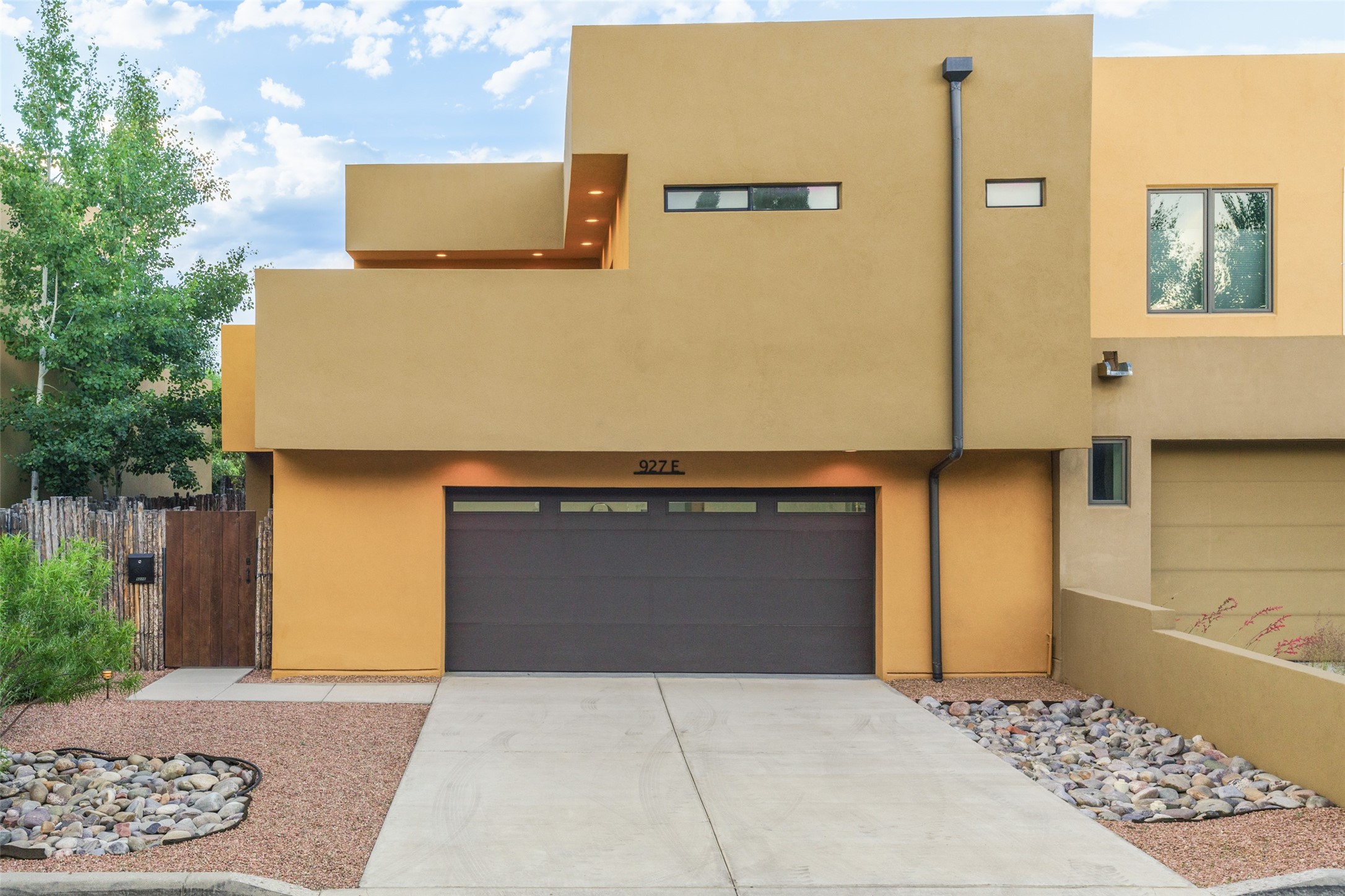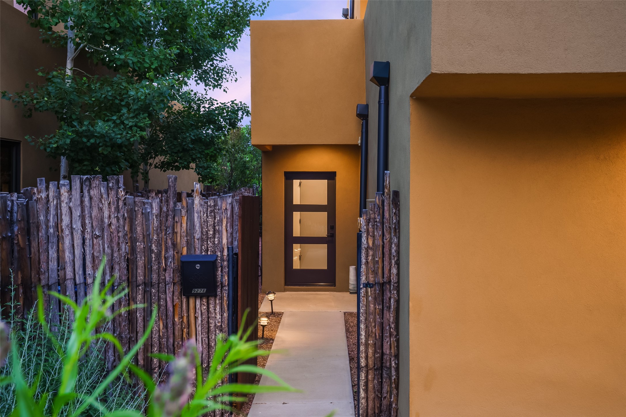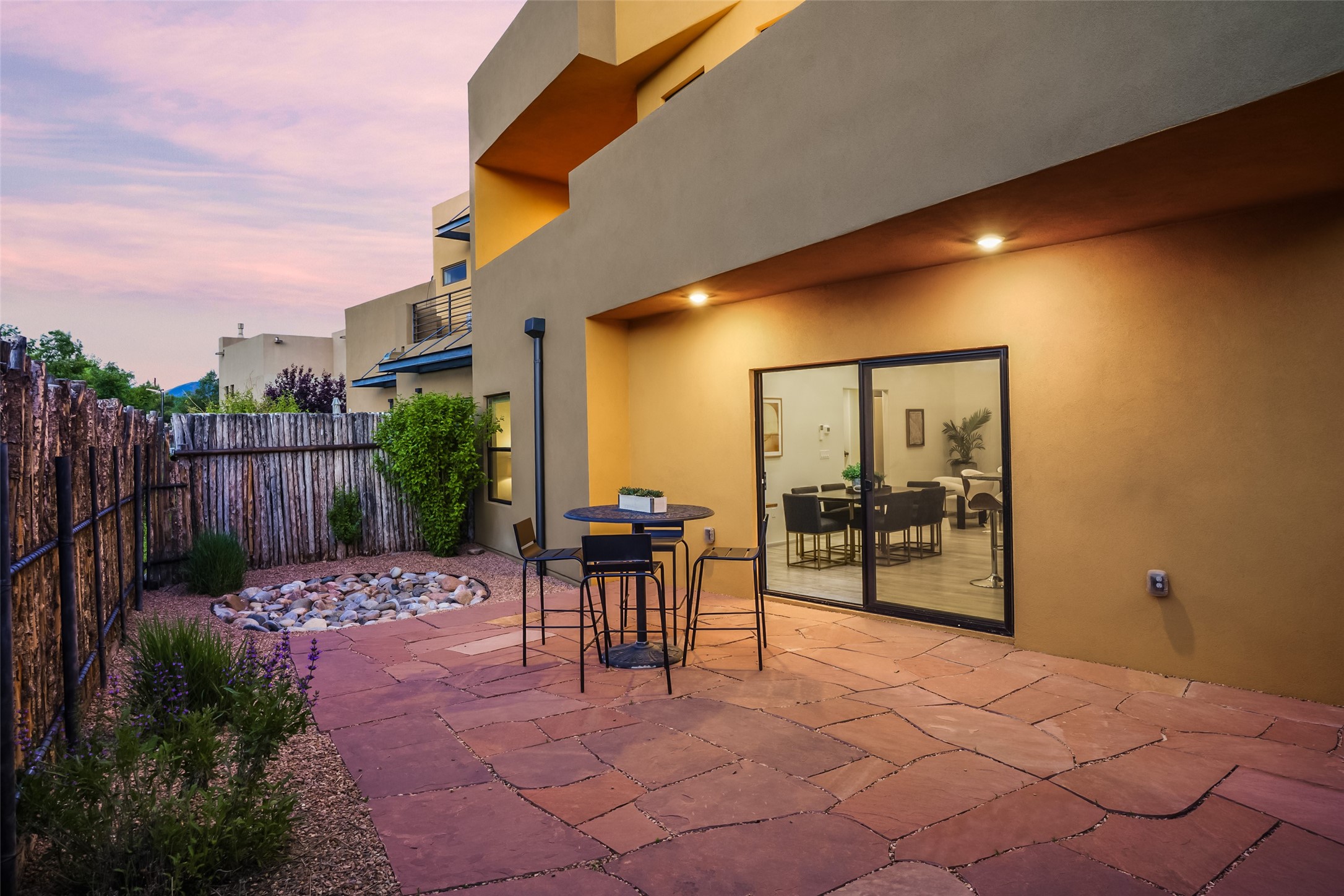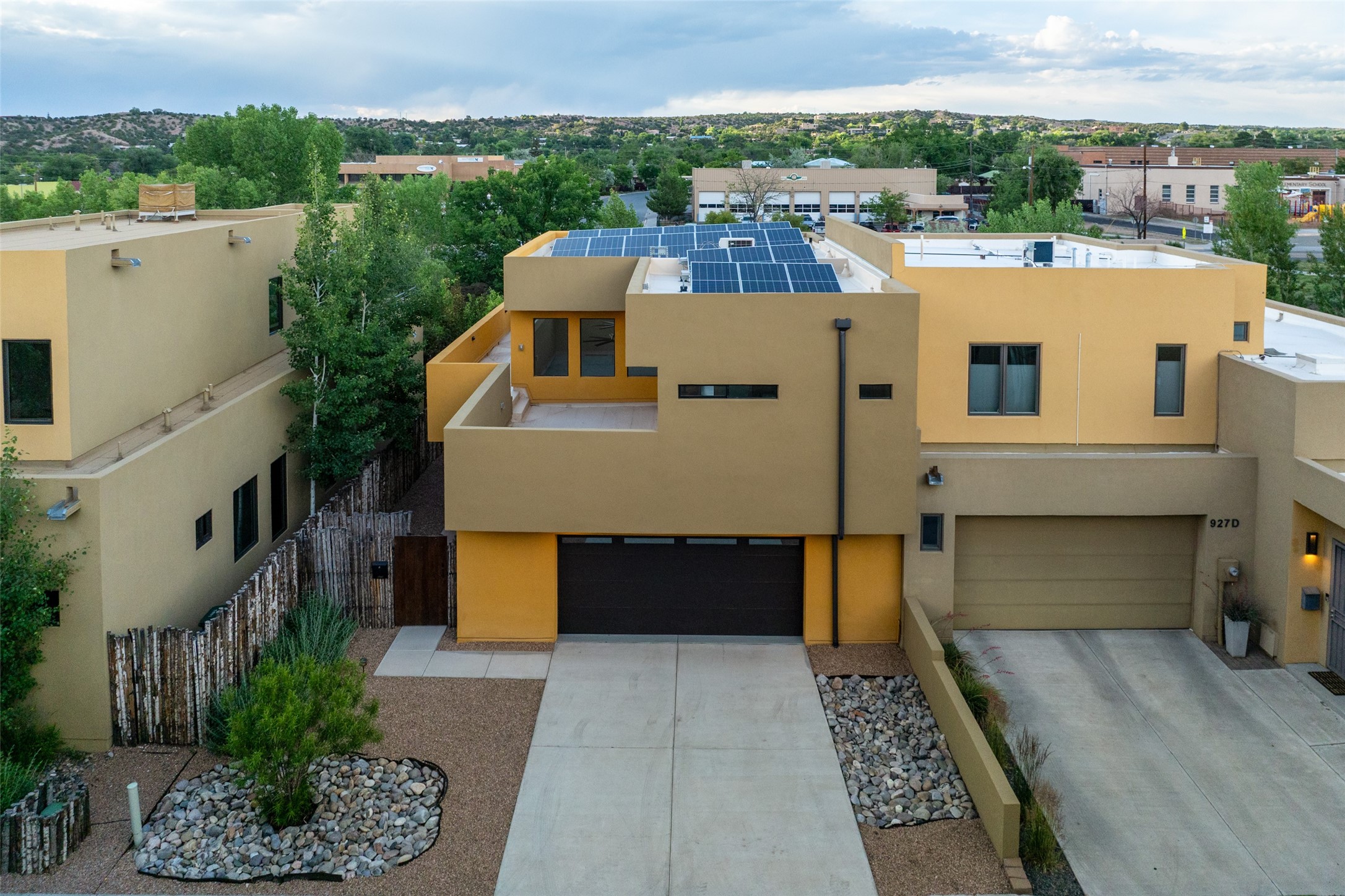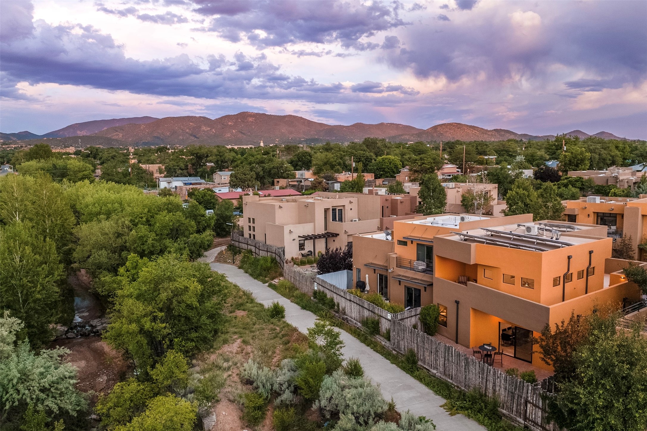 Tucked away at the end of a private drive alongside the Santa Fe River Trail, this expertly designed condominium offers both privacy and proximity to the Plaza. Crafted as an all-electric home with an Emerald Green Certification, the highest level attainable including owned solar equaling zero electricity bills. Inside, the main living area features double height ceilings with architectural clerestory windows and seamless indoor-outdoor flow to the rear patio. The downstairs bedroom offers flexibility as a guest space or private office, while the upstairs primary suite feels like a retreat with a sense of quiet separation. Plus a covered portal with stunning mountain views. Located just one mile from the Plaza along the river trail and less than a mile from the Santa Fe Railyard & Farmers Market this unique property is perfectly positioned for convenience. In-floor radiant heating throughout including the garage and mini splits offer year round comfort. Low maintenance landscaping and smart home features offer the ability to lock and leave without worry. A rare contemporary offering near the Plaza!