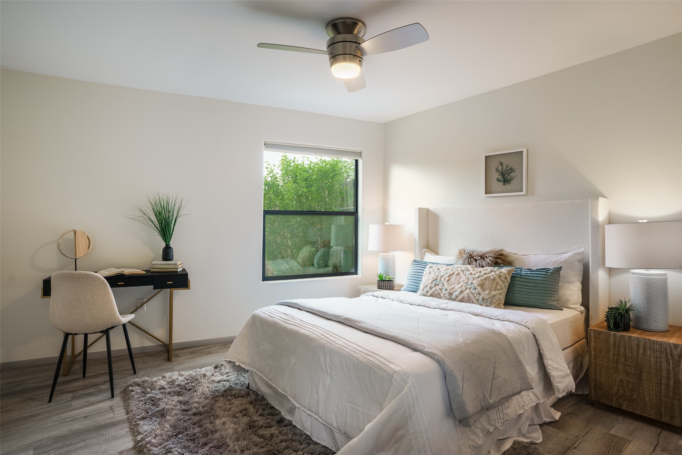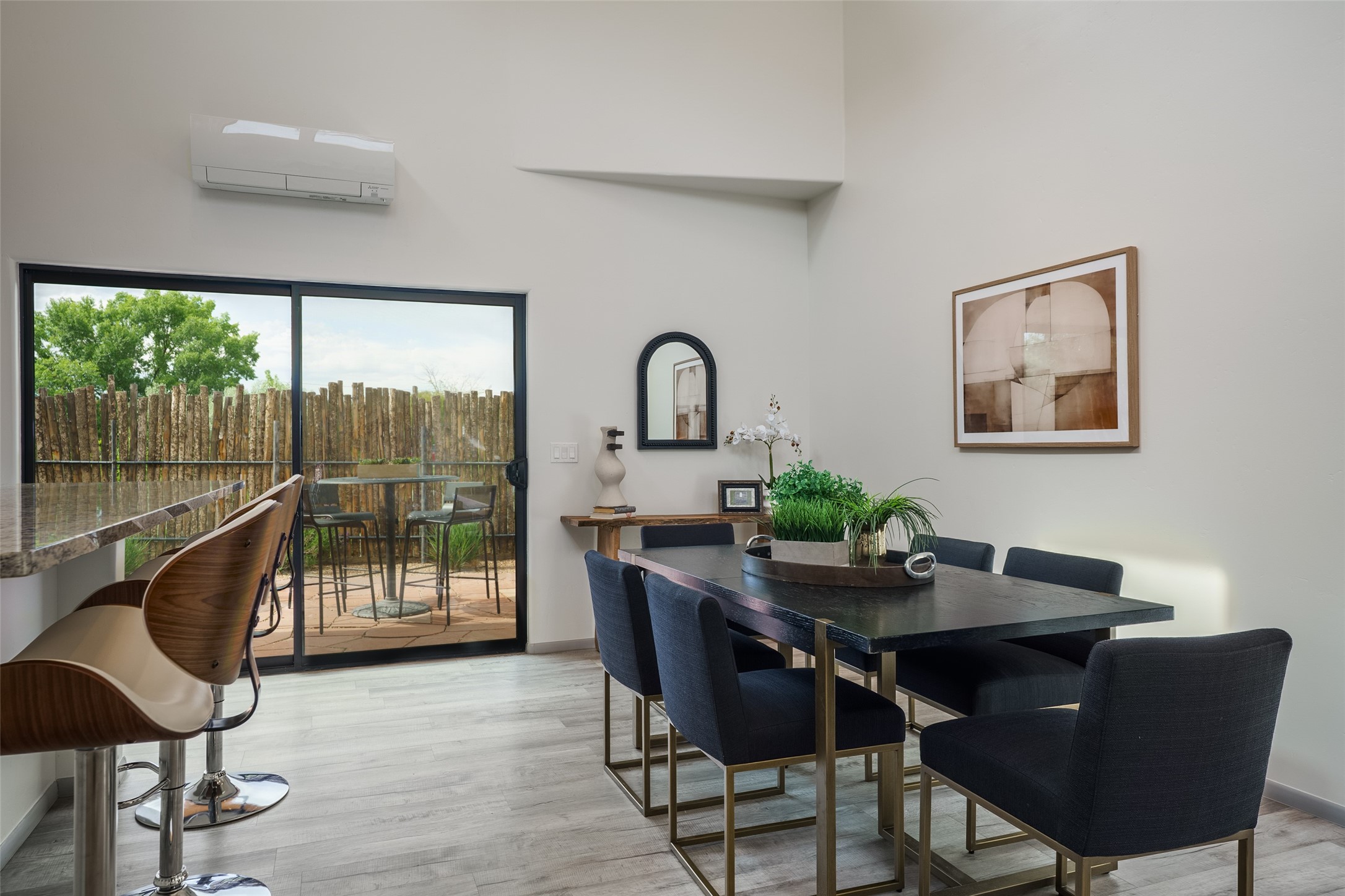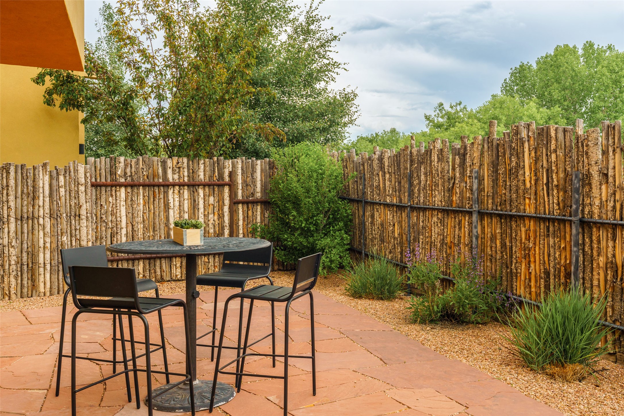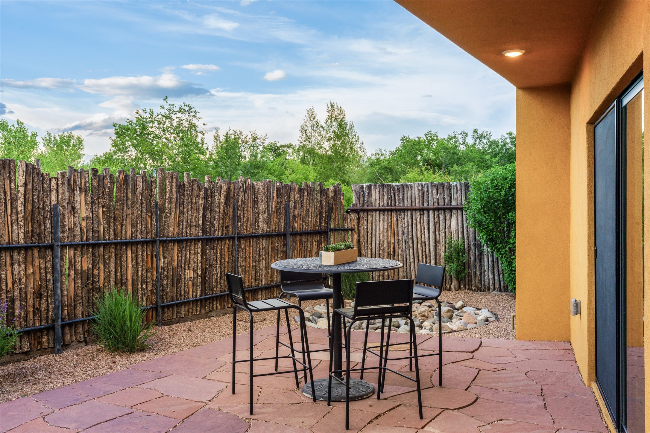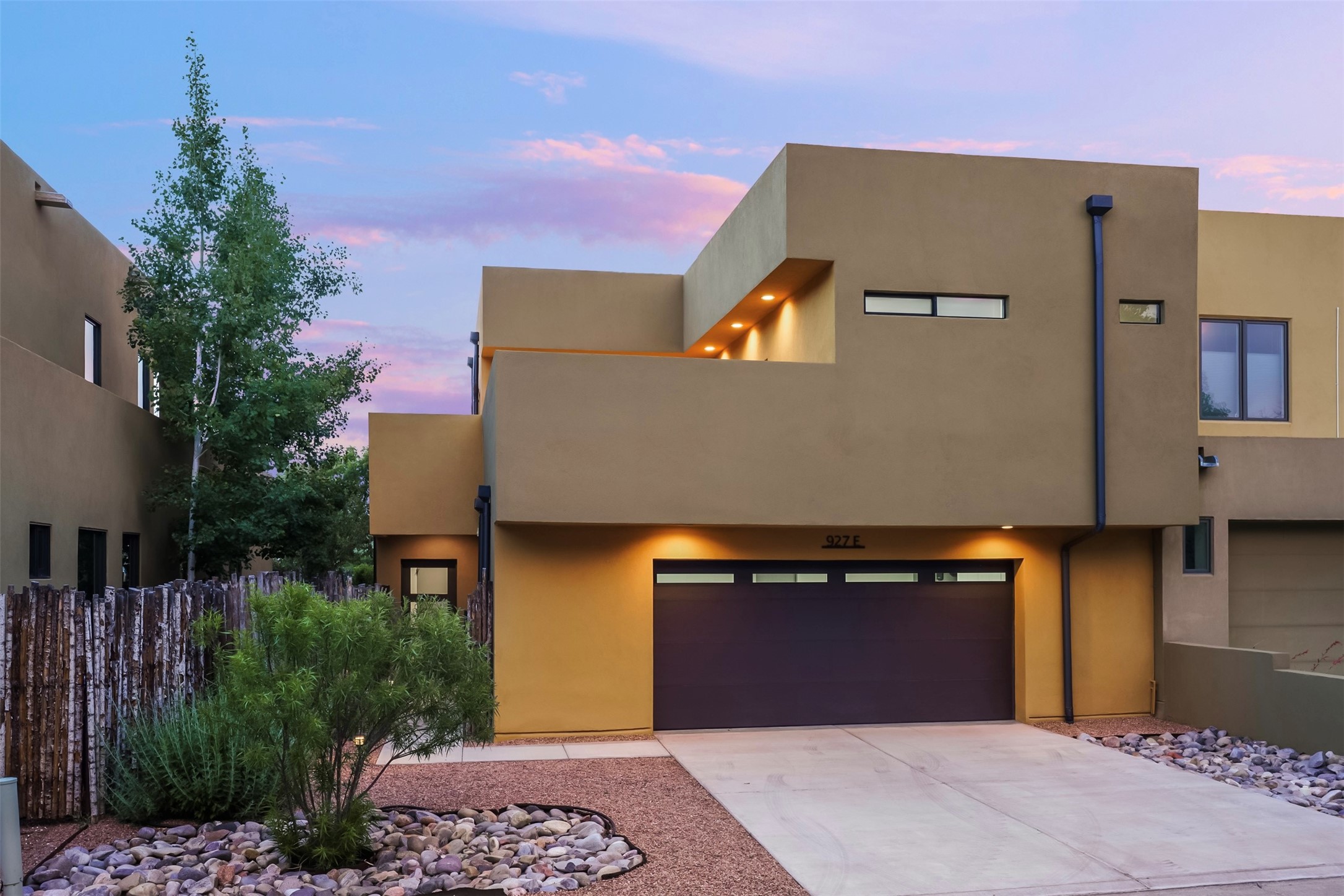Tucked away at the end of a private drive alongside the Santa Fe River Trail, this expertly designed condominium offers both privacy and proximity to the Plaza. Crafted as an all-electric home with an Emerald Green Certification, the highest level attainable including owned solar equaling zero electricity bills. Inside, the main living area features double height ceilings with architectural clerestory windows and seamless indoor-outdoor flow to the rear patio. The downstairs bedroom offers flexibility as a guest space or private office, while the upstairs primary suite feels like a retreat with a sense of quiet separation. Plus a covered portal with stunning mountain views. Located just one mile from the Plaza along the river trail and less than a mile from the Santa Fe Railyard & Farmers Market this unique property is perfectly positioned for convenience. In-floor radiant heating throughout including the garage and mini splits offer year round comfort. Low maintenance landscaping and smart home features offer the ability to lock and leave without worry. A rare contemporary offering near the Plaza!