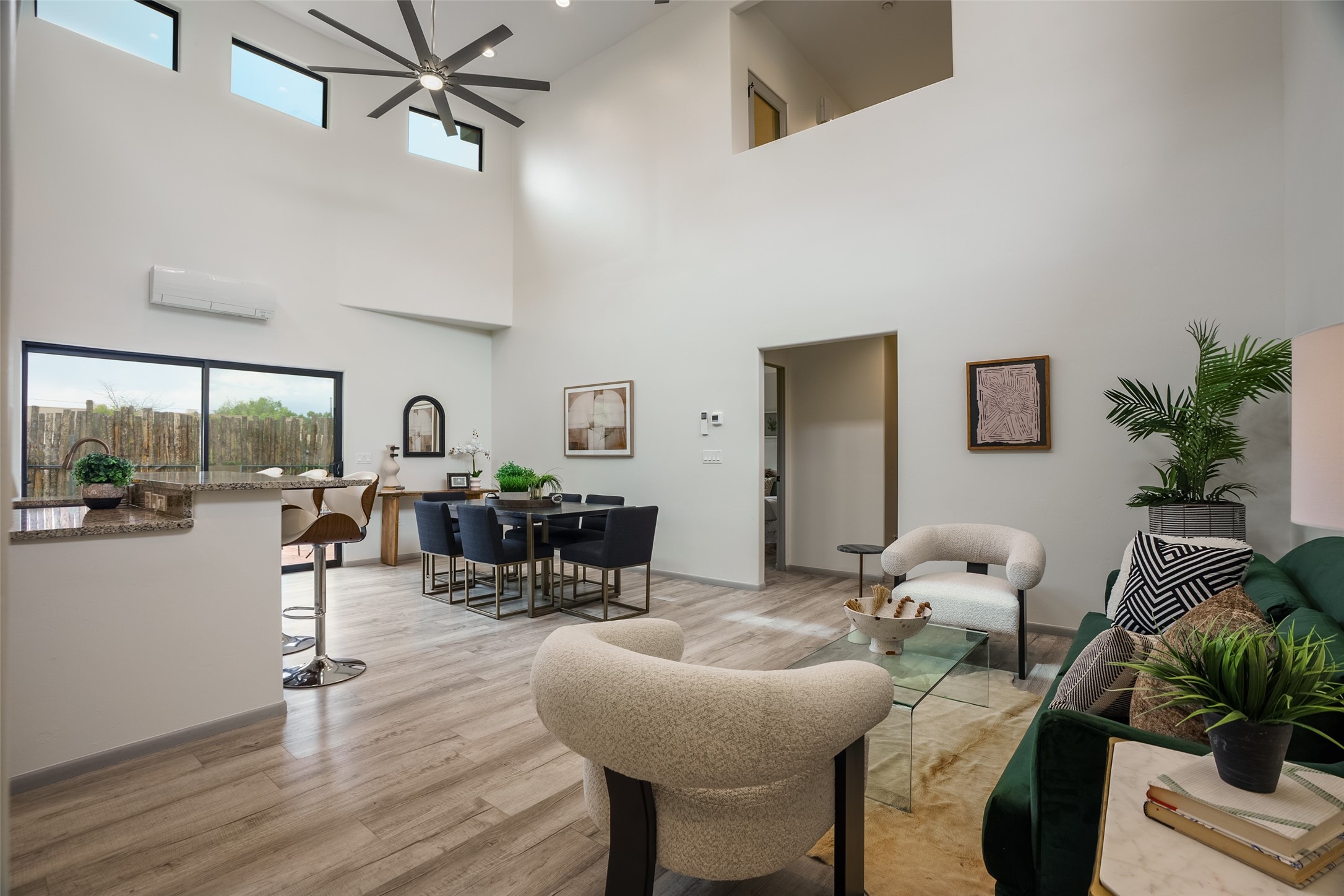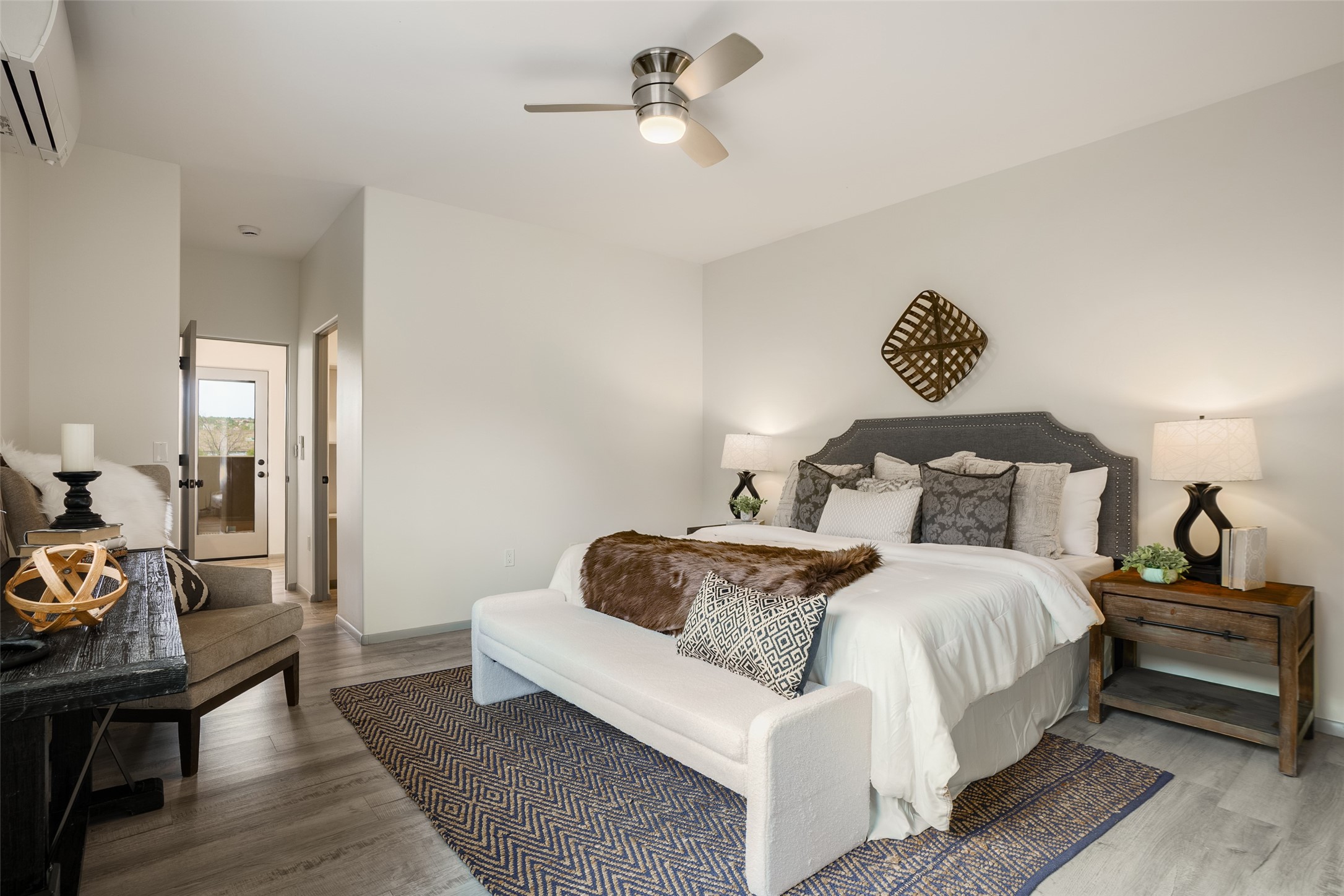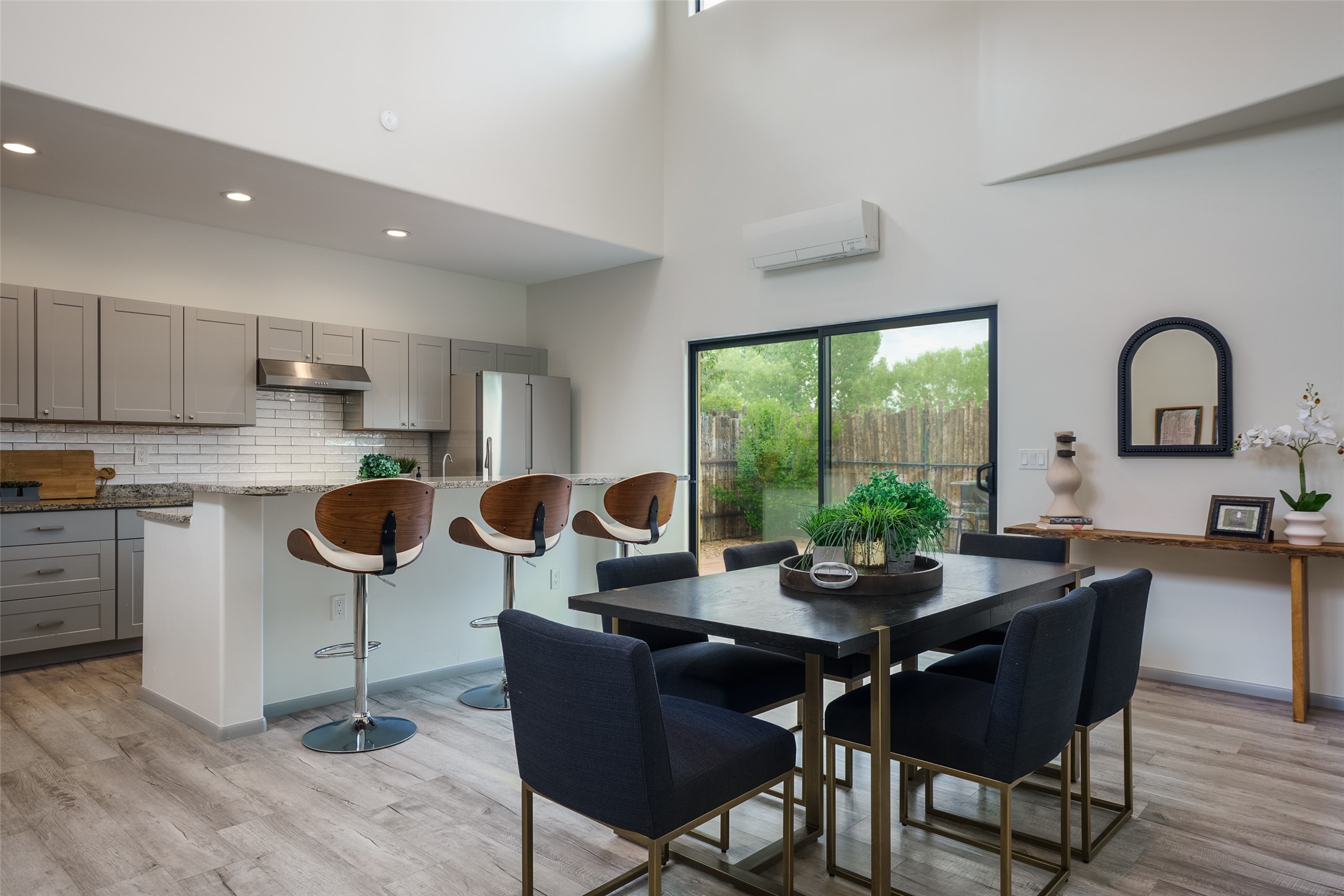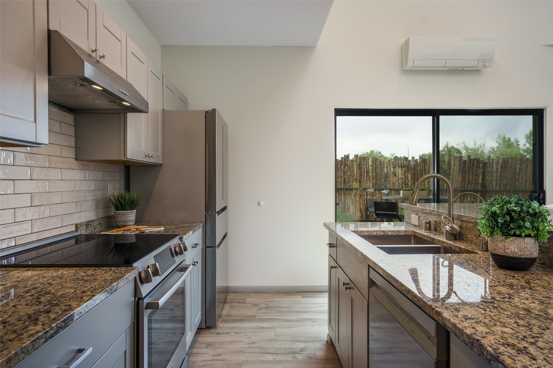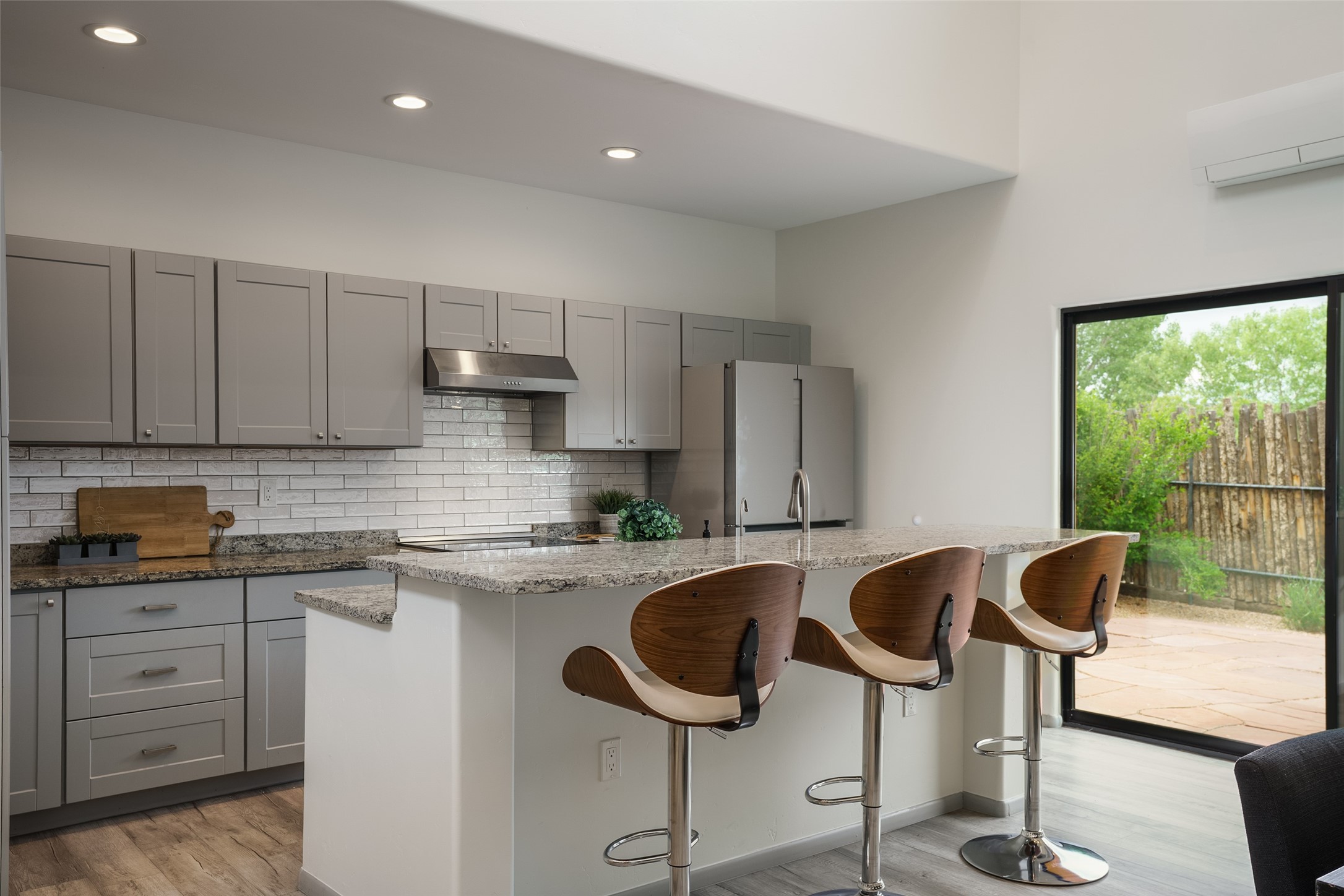 Tucked away at the end of a private drive alongside the Santa Fe River Trail, this expertly designed condominium offers both privacy and proximity to the Plaza. Crafted as an all-electric home with an Emerald Green Certification, the highest level attainable including owned solar equaling zero electricity bills. Inside, the main living area features double height ceilings with architectural clerestory windows and seamless indoor-outdoor flow to the rear patio. The downstairs bedroom offers flexibility as a guest space or private office, while the upstairs primary suite feels like a retreat with a sense of quiet separation. Plus a covered portal with stunning mountain views. Located just one mile from the Plaza along the river trail and less than a mile from the Santa Fe Railyard & Farmers Market this unique property is perfectly positioned for convenience. In-floor radiant heating throughout including the garage and mini splits offer year round comfort. Low maintenance landscaping and smart home features offer the ability to lock and leave without worry. A rare contemporary offering near the Plaza!