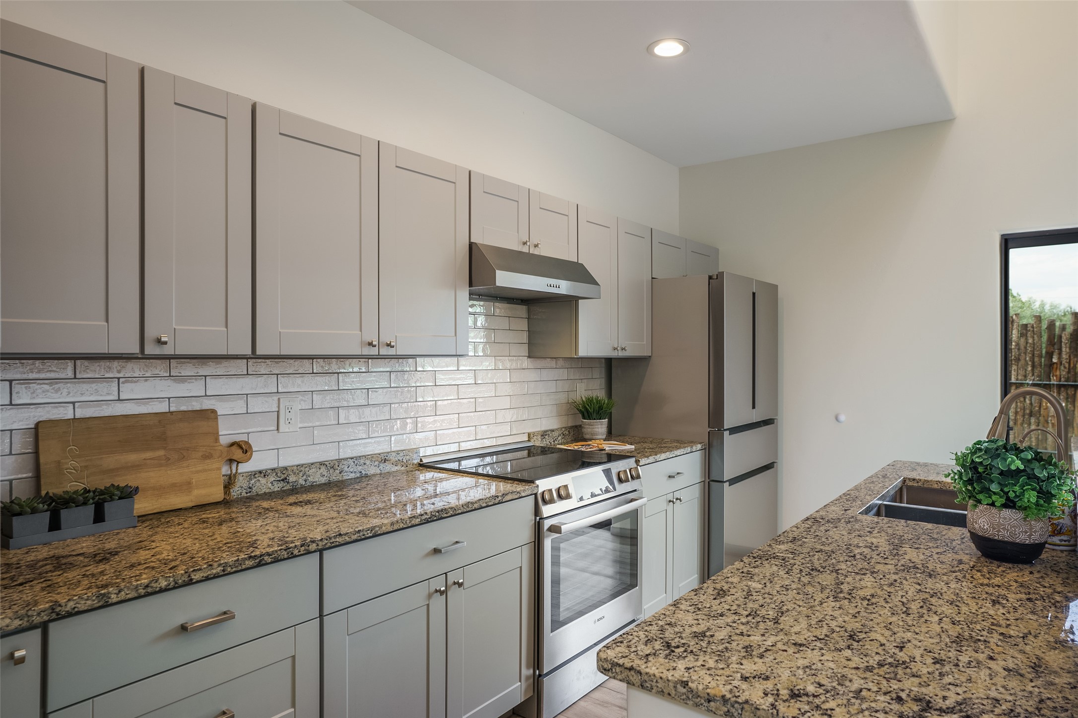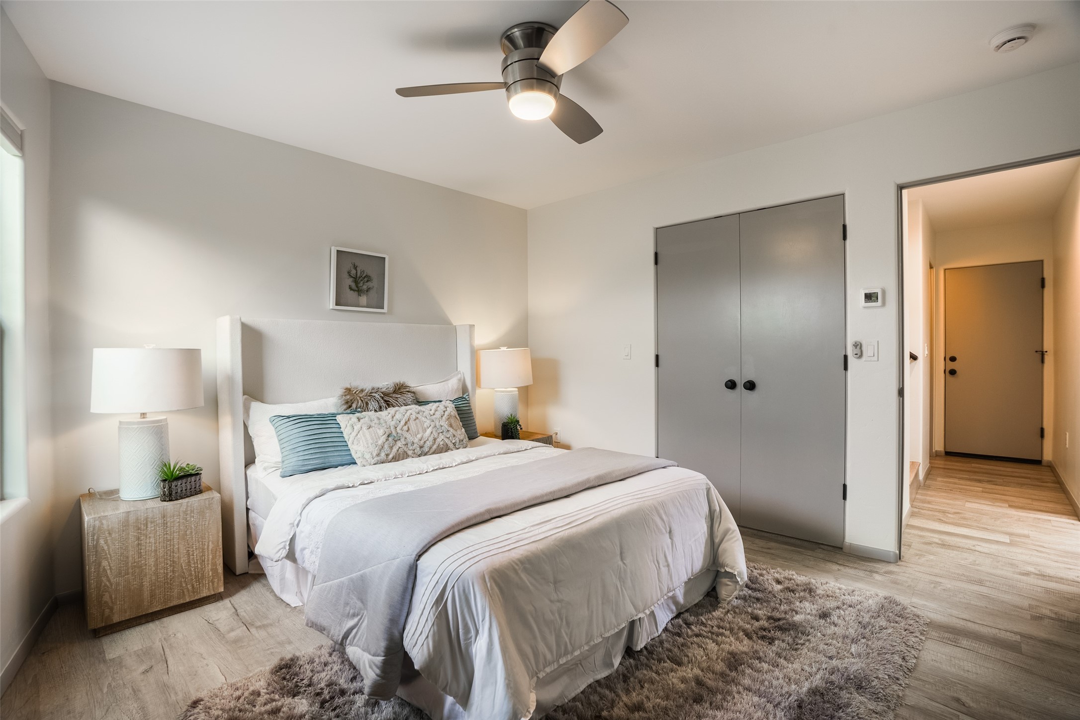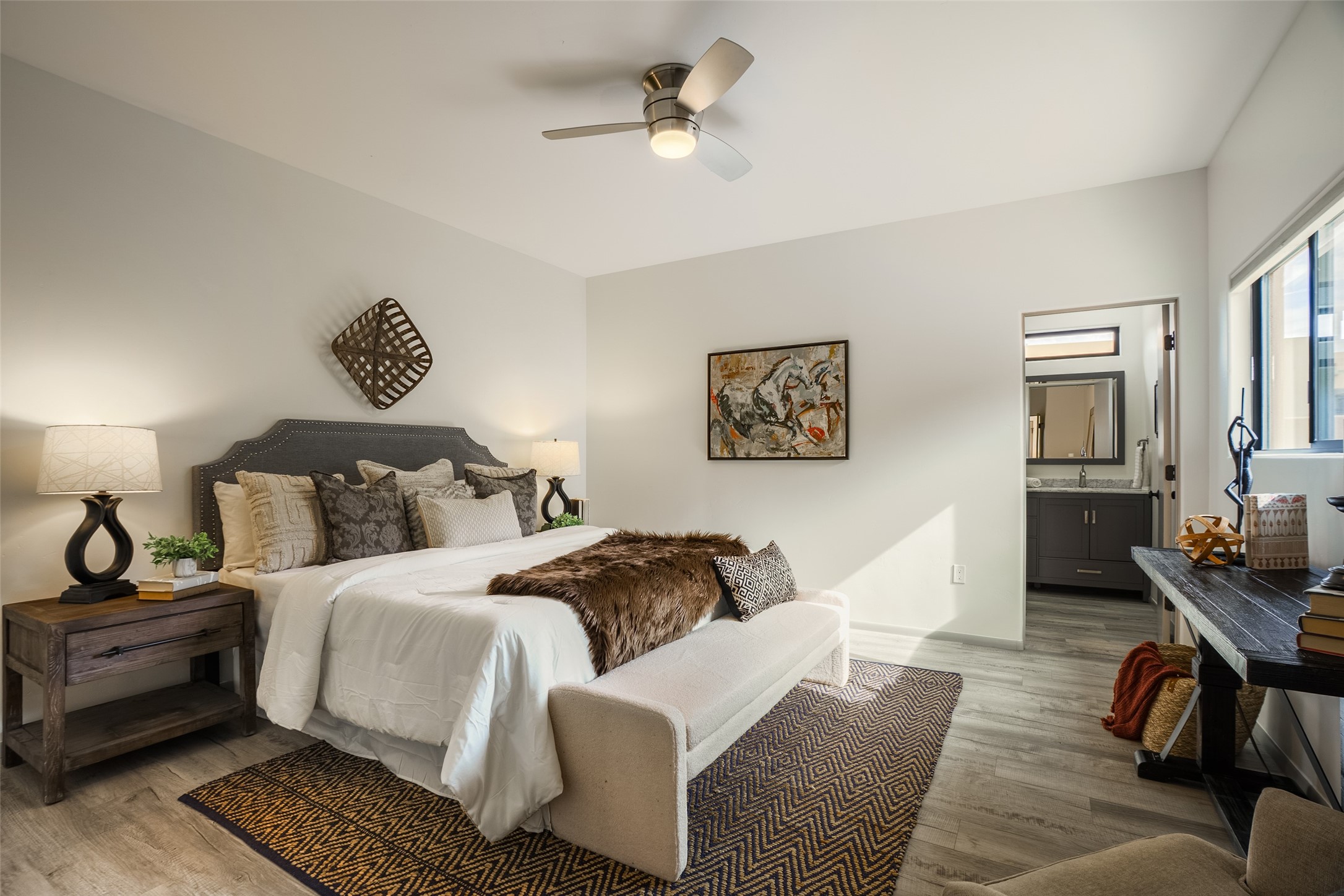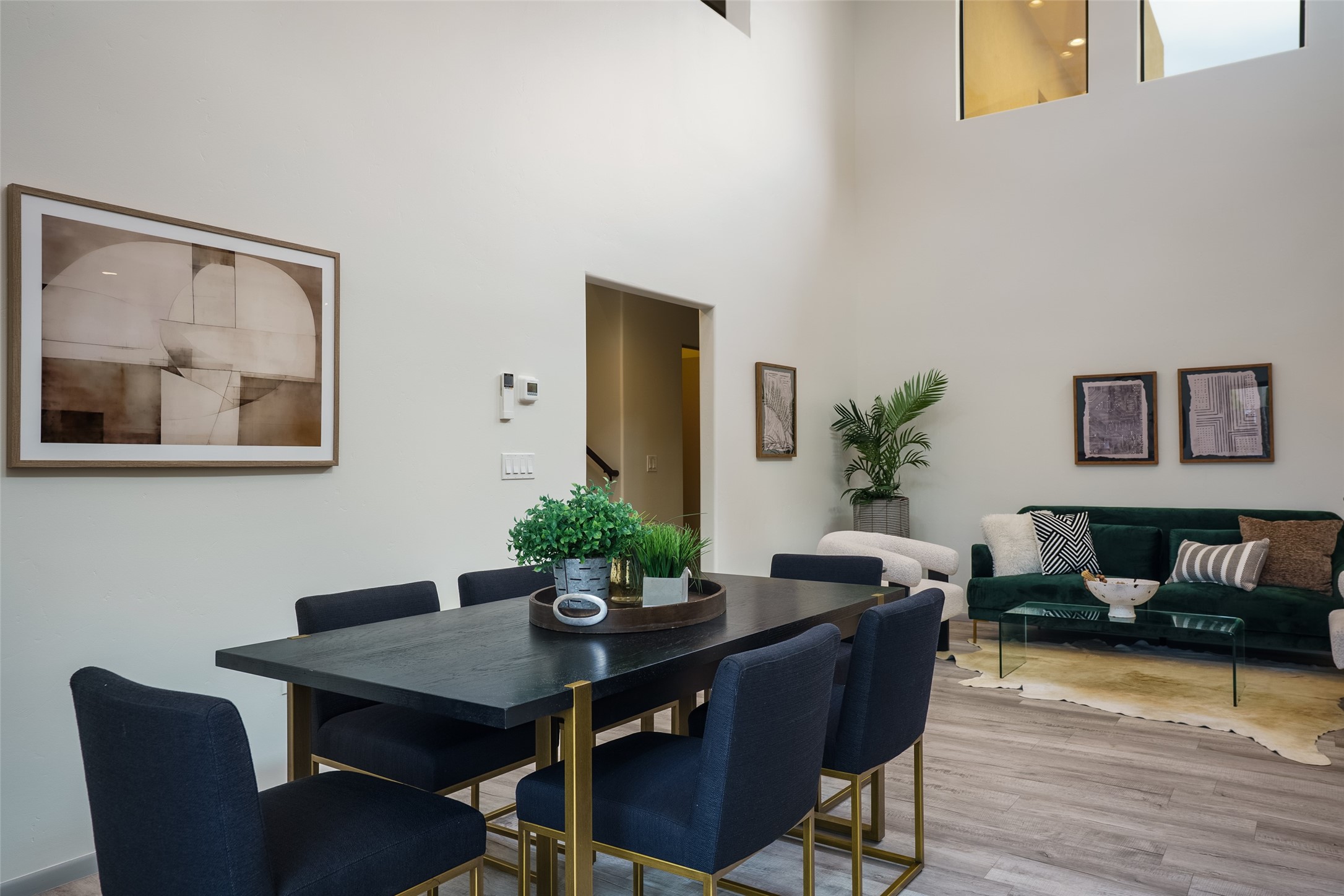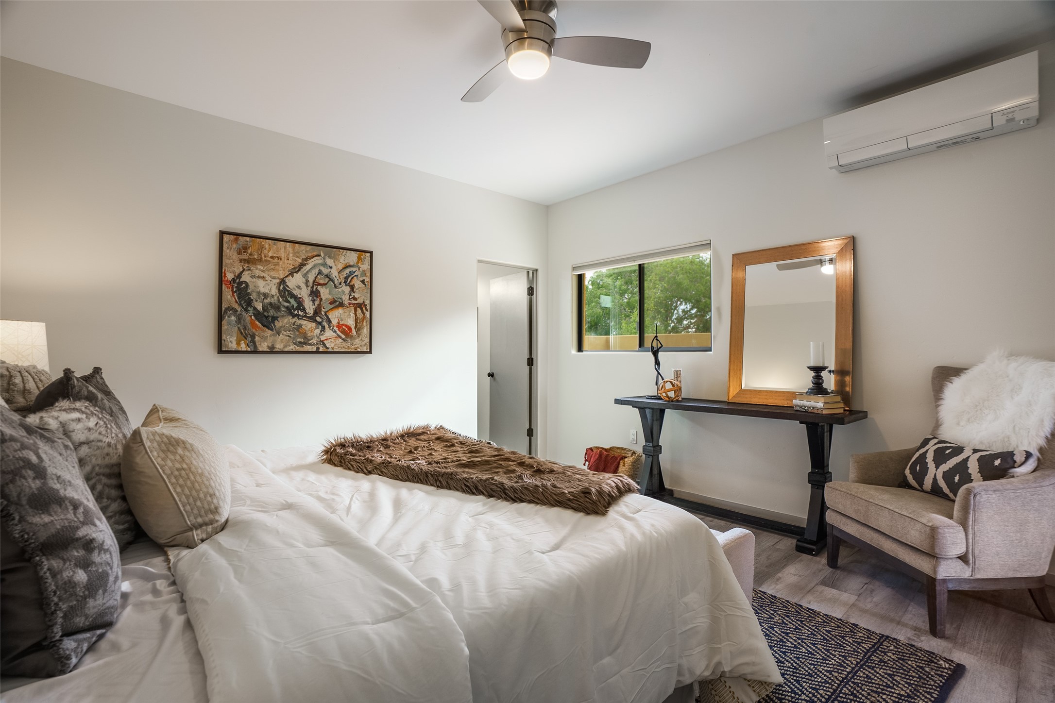 Tucked away at the end of a private drive alongside the Santa Fe River Trail, this expertly designed condominium offers both privacy and proximity to the Plaza. Crafted as an all-electric home with an Emerald Green Certification, the highest level attainable including owned solar equaling zero electricity bills. Inside, the main living area features double height ceilings with architectural clerestory windows and seamless indoor-outdoor flow to the rear patio. The downstairs bedroom offers flexibility as a guest space or private office, while the upstairs primary suite feels like a retreat with a sense of quiet separation. Plus a covered portal with stunning mountain views. Located just one mile from the Plaza along the river trail and less than a mile from the Santa Fe Railyard & Farmers Market this unique property is perfectly positioned for convenience. In-floor radiant heating throughout including the garage and mini splits offer year round comfort. Low maintenance landscaping and smart home features offer the ability to lock and leave without worry. A rare contemporary offering near the Plaza!