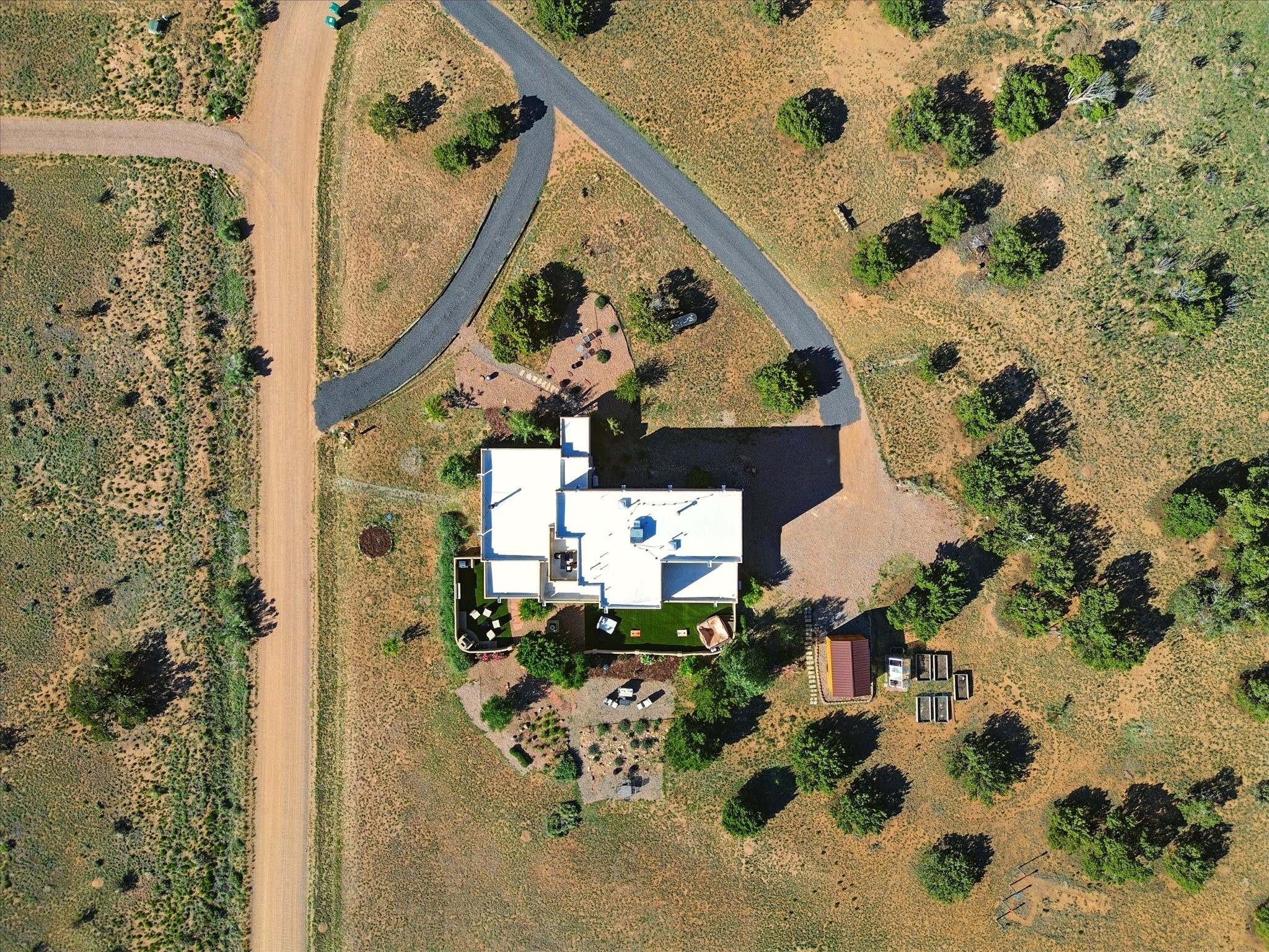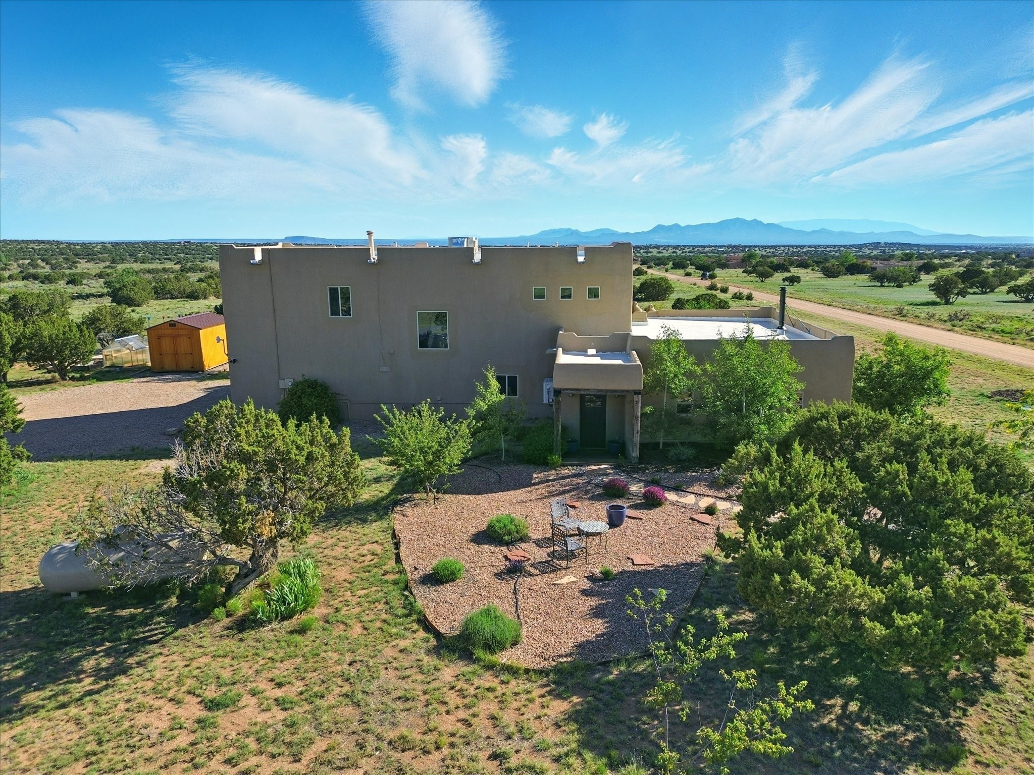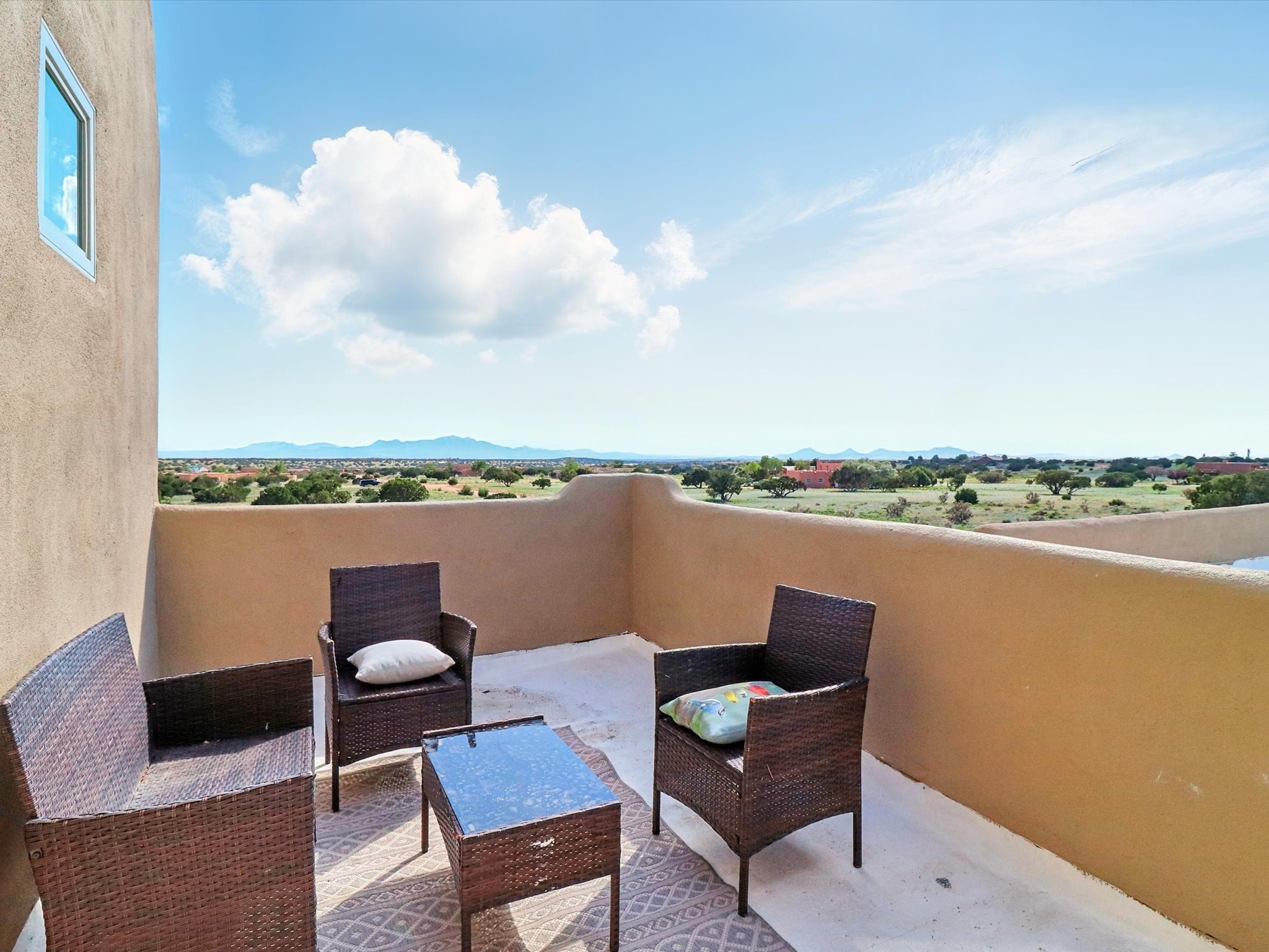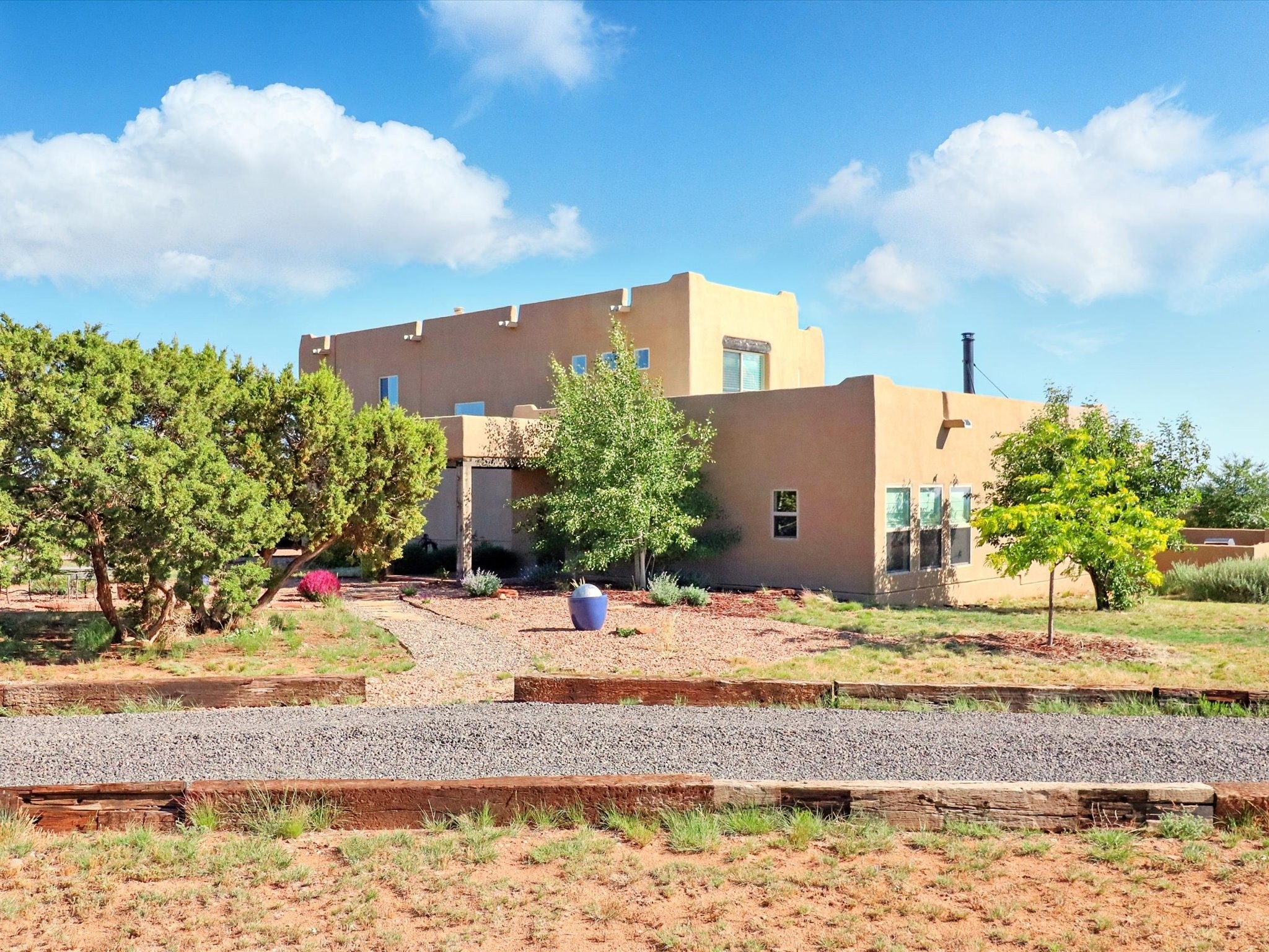 Experience breathtaking views surrounding this exceptional property located on just over 4 acres of pristine high desert landscape. This stunning home blends the timeless charm of Pueblo-style architecture with the inviting touches of modern farmhouse design including an expansive 1,000 square foot addition completed in 2020. The versatile floor plan is anchored by a beautifully updated gourmet kitchen featuring a Sub-Zero refrigerator and custom finishes with ample workspace, and a seamless flow for entertaining. On the main floor you will find that the primary bedroom showcases soaring ceilings with a picturesque view and private access to the outdoor courtyard. Complete with an oversized closet area and beautifully renovated bathroom that is perfect for soaking in the bathtub while taking in the view from the large picture window right above. The second floor consists of two bedrooms, a bonus room and two bathrooms. The balcony off the ensuite bedroom is ideal for soaking in the mountains and serene sunsets. Step outside to enjoy the covered portal and cozy up by the outdoor wood-burning fireplace. Fruit trees dot the landscape, adding character and a touch of sweetness to your retreat. Backed by peaceful green space and only minutes from the Galisteo Basin preserve, Santa Fe Rail Trail, this property offers the perfect blend of tranquility, access to nature and refined living. Do not miss this rare opportunity to own a home that truly captures the spirit and beauty of New Mexico.Pre-listing inspection report is available.