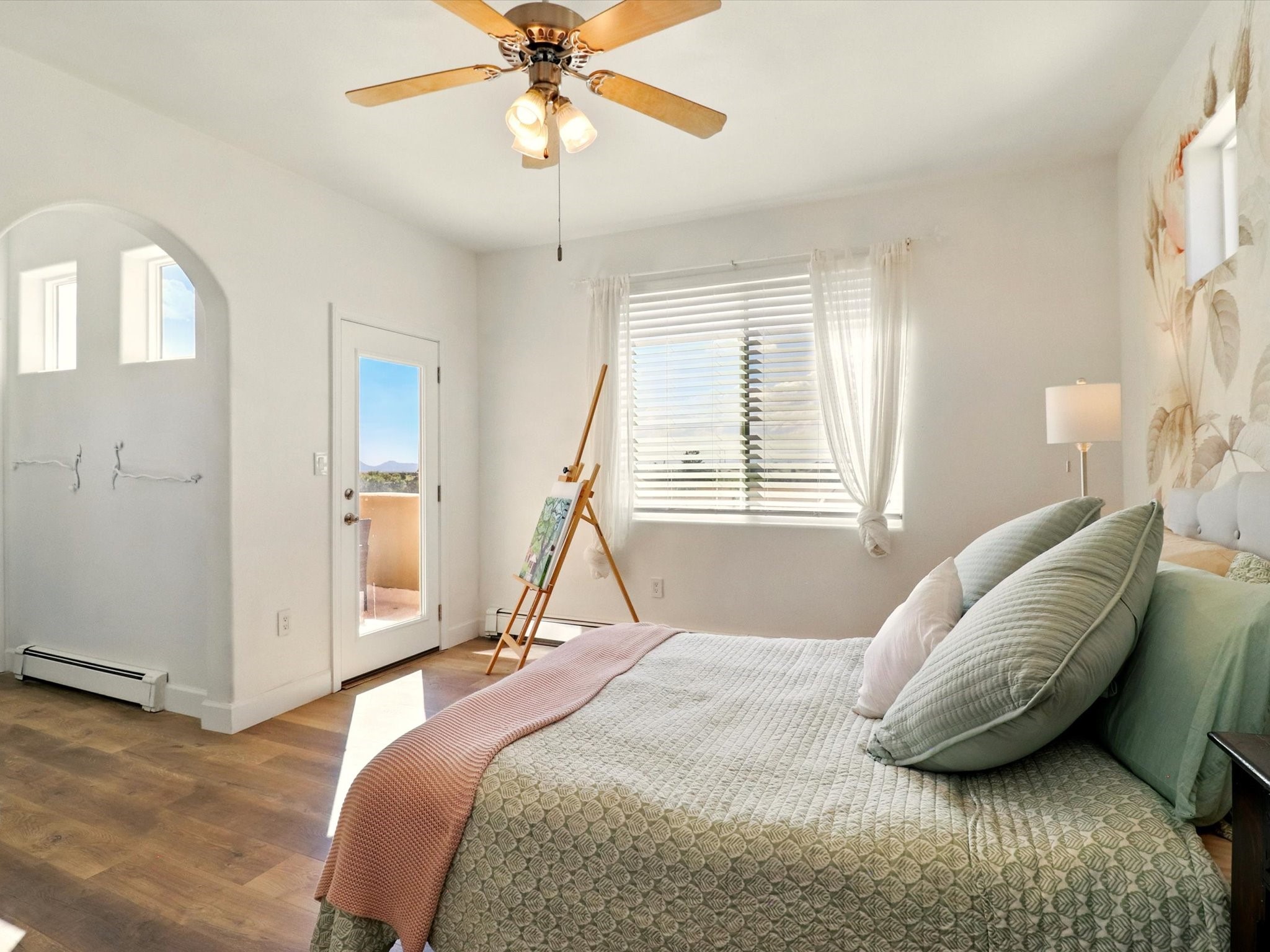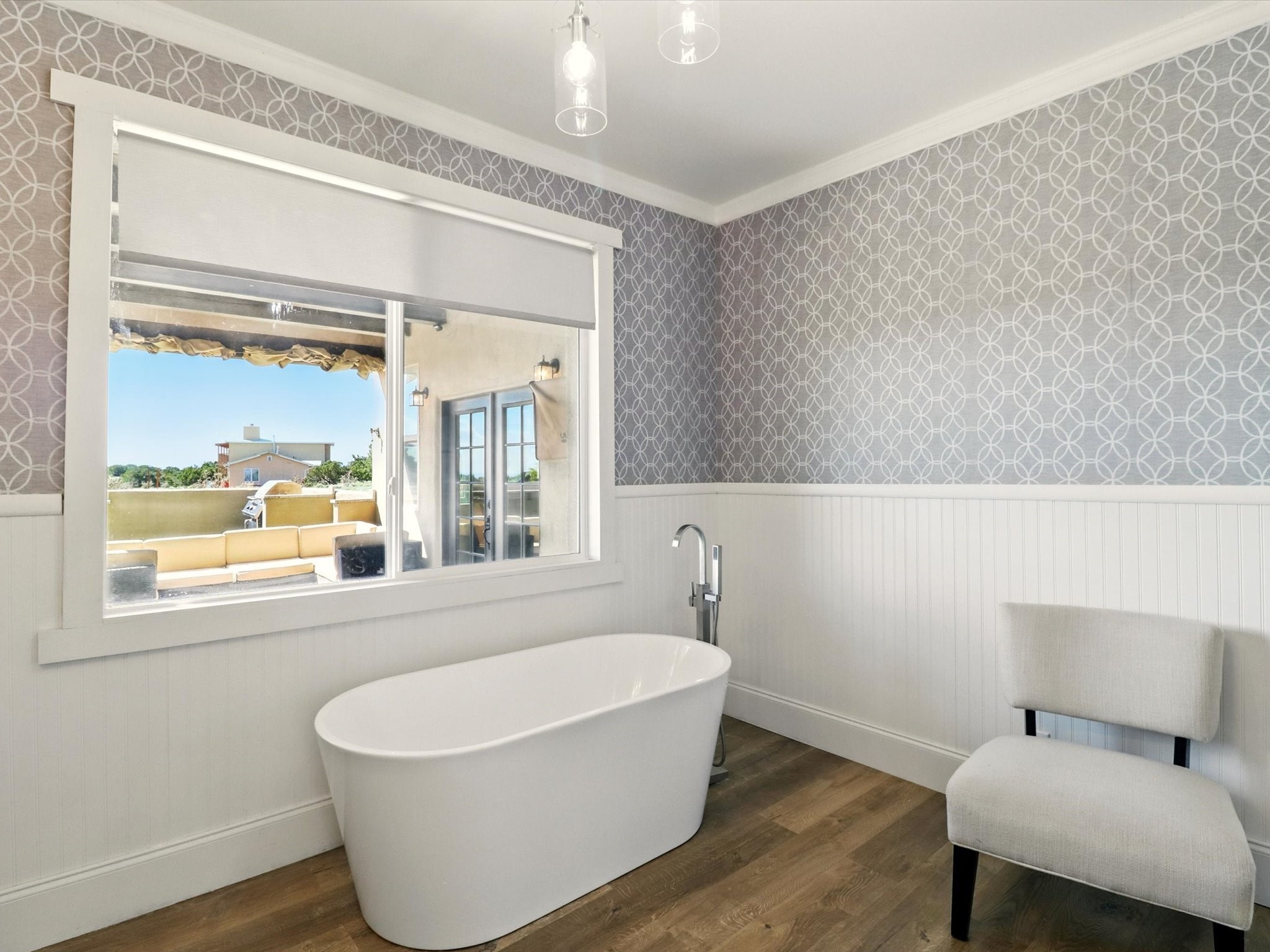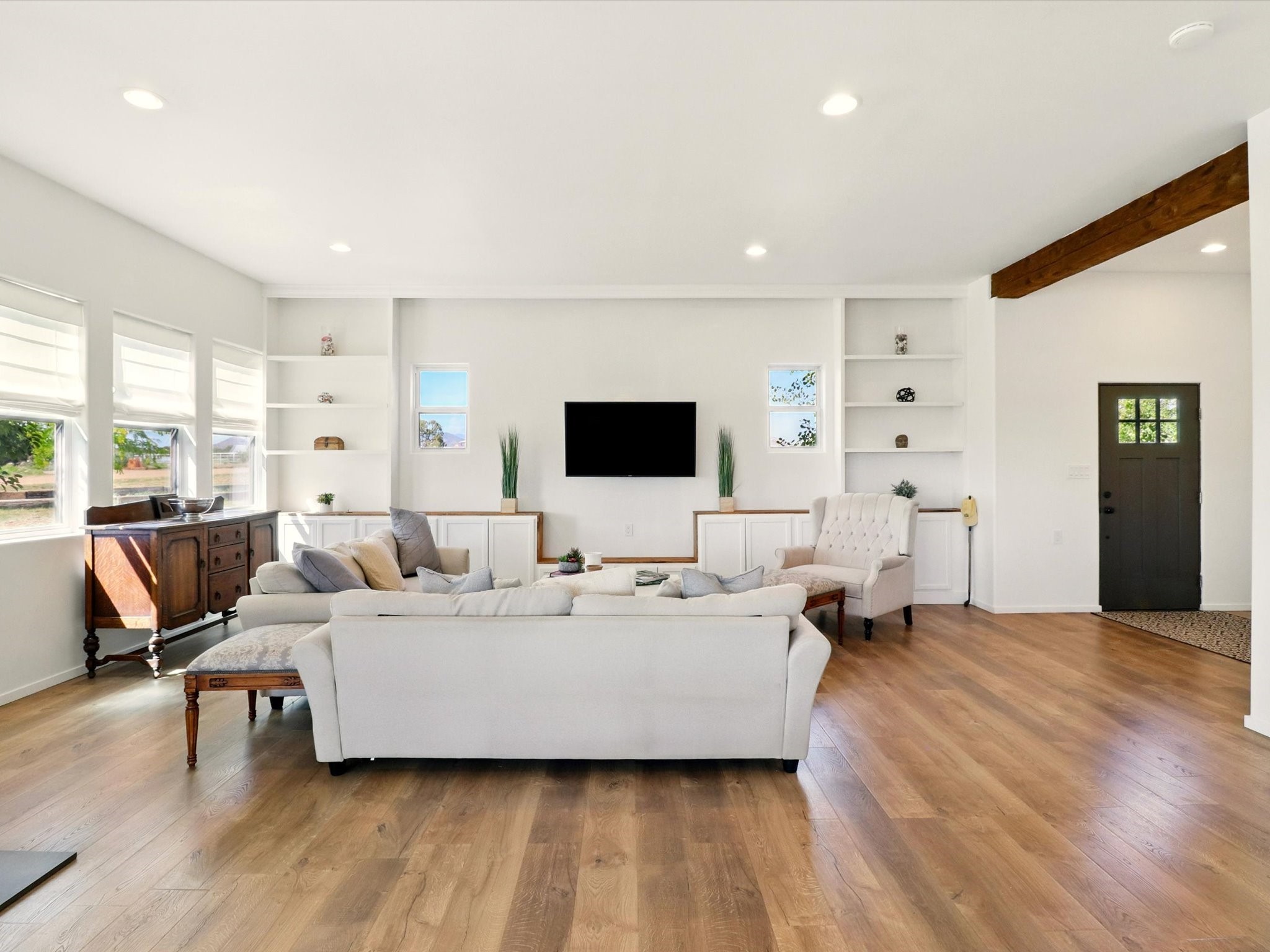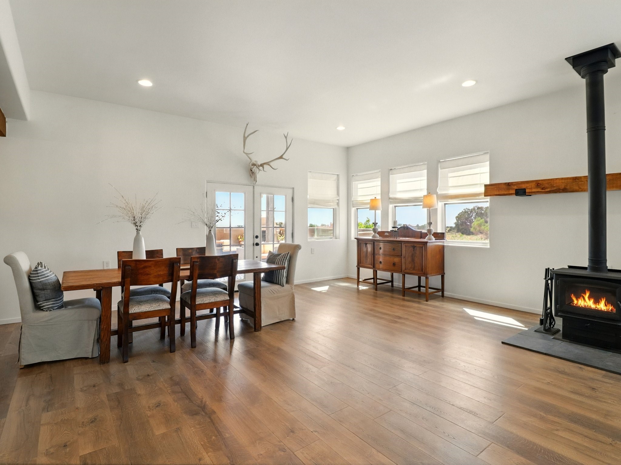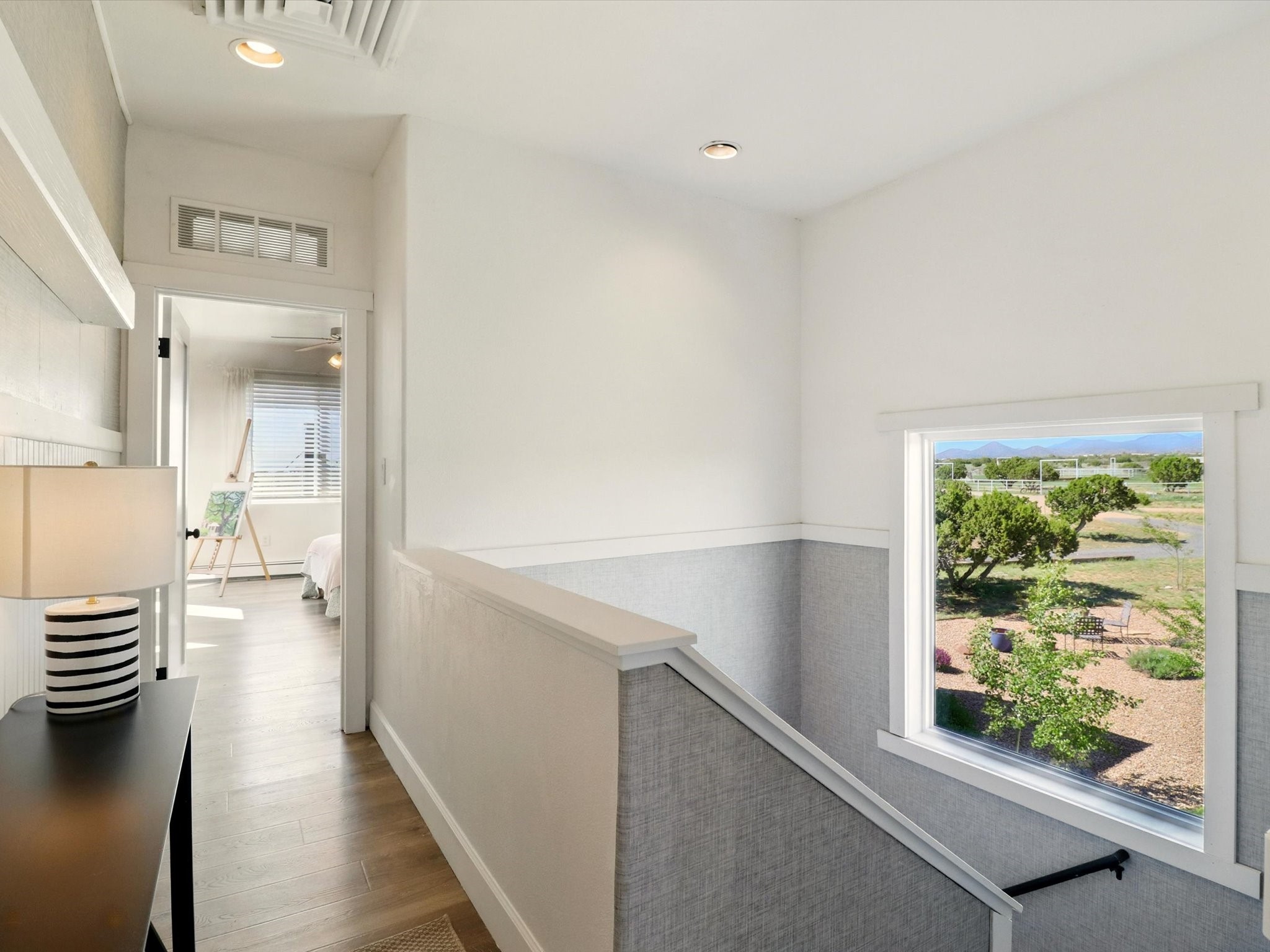 Experience breathtaking views surrounding this exceptional property located on just over 4 acres of pristine high desert landscape. This stunning home blends the timeless charm of Pueblo-style architecture with the inviting touches of modern farmhouse design including an expansive 1,000 square foot addition completed in 2020. The versatile floor plan is anchored by a beautifully updated gourmet kitchen featuring a Sub-Zero refrigerator and custom finishes with ample workspace, and a seamless flow for entertaining. On the main floor you will find that the primary bedroom showcases soaring ceilings with a picturesque view and private access to the outdoor courtyard. Complete with an oversized closet area and beautifully renovated bathroom that is perfect for soaking in the bathtub while taking in the view from the large picture window right above. The second floor consists of two bedrooms, a bonus room and two bathrooms. The balcony off the ensuite bedroom is ideal for soaking in the mountains and serene sunsets. Step outside to enjoy the covered portal and cozy up by the outdoor wood-burning fireplace. Fruit trees dot the landscape, adding character and a touch of sweetness to your retreat. Backed by peaceful green space and only minutes from the Galisteo Basin preserve, Santa Fe Rail Trail, this property offers the perfect blend of tranquility, access to nature and refined living. Do not miss this rare opportunity to own a home that truly captures the spirit and beauty of New Mexico.Pre-listing inspection report is available.