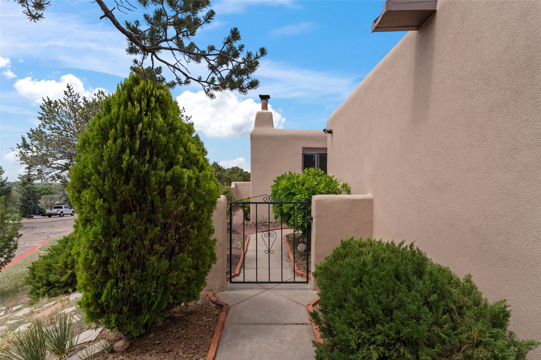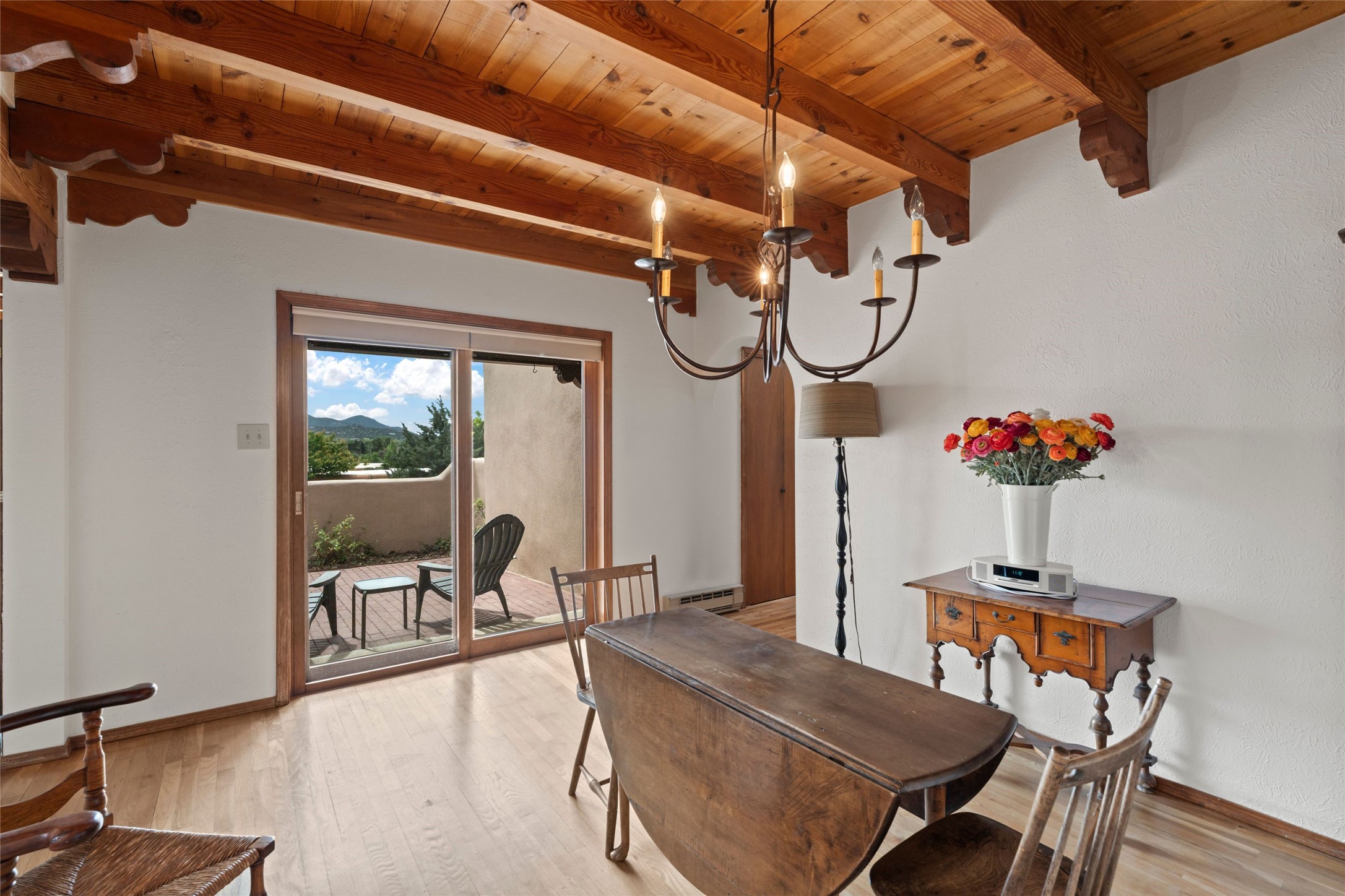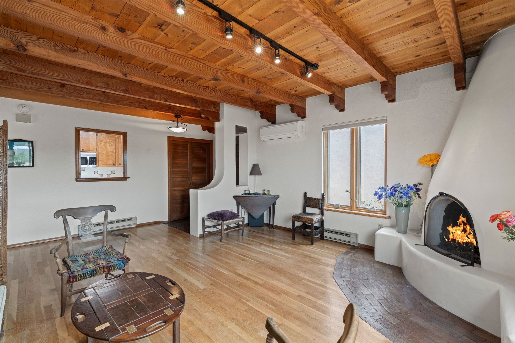 Nestled in a serene enclave with views of Sun and Moon Mountain, this charming 2-bedroom, 2-bath townhouse radiates timeless charm with wood floors, rustic ceiling beams, and authentic Southwestern character throughout.Located in the heart of Santa Fe in the Wood-Gormley School district, you're minutes from the historic Plaza, Museum Hill, and neighborhood cafes. The attached two-car garage provides convenient parking and storage, while mini-splits ensure year-round comfort.Complete with two wood-burning Kiva fireplaces and an attached 2-car garage offering ample storage, this home is a rare gem where charm meets functionality. Whether you're sipping coffee on the patio at sunrise or enjoying a sunset glow on the mountains, this is where desert beauty and refined living come together.