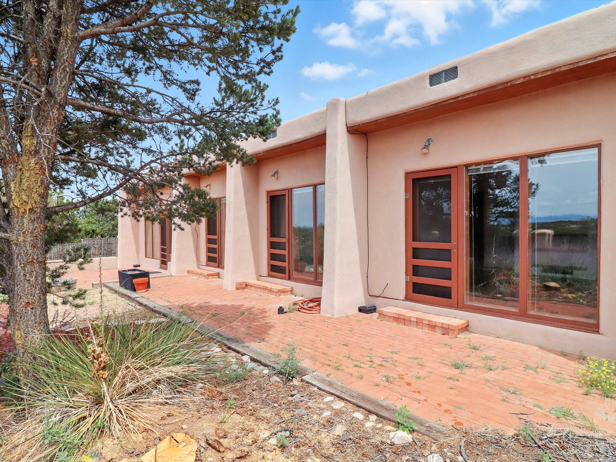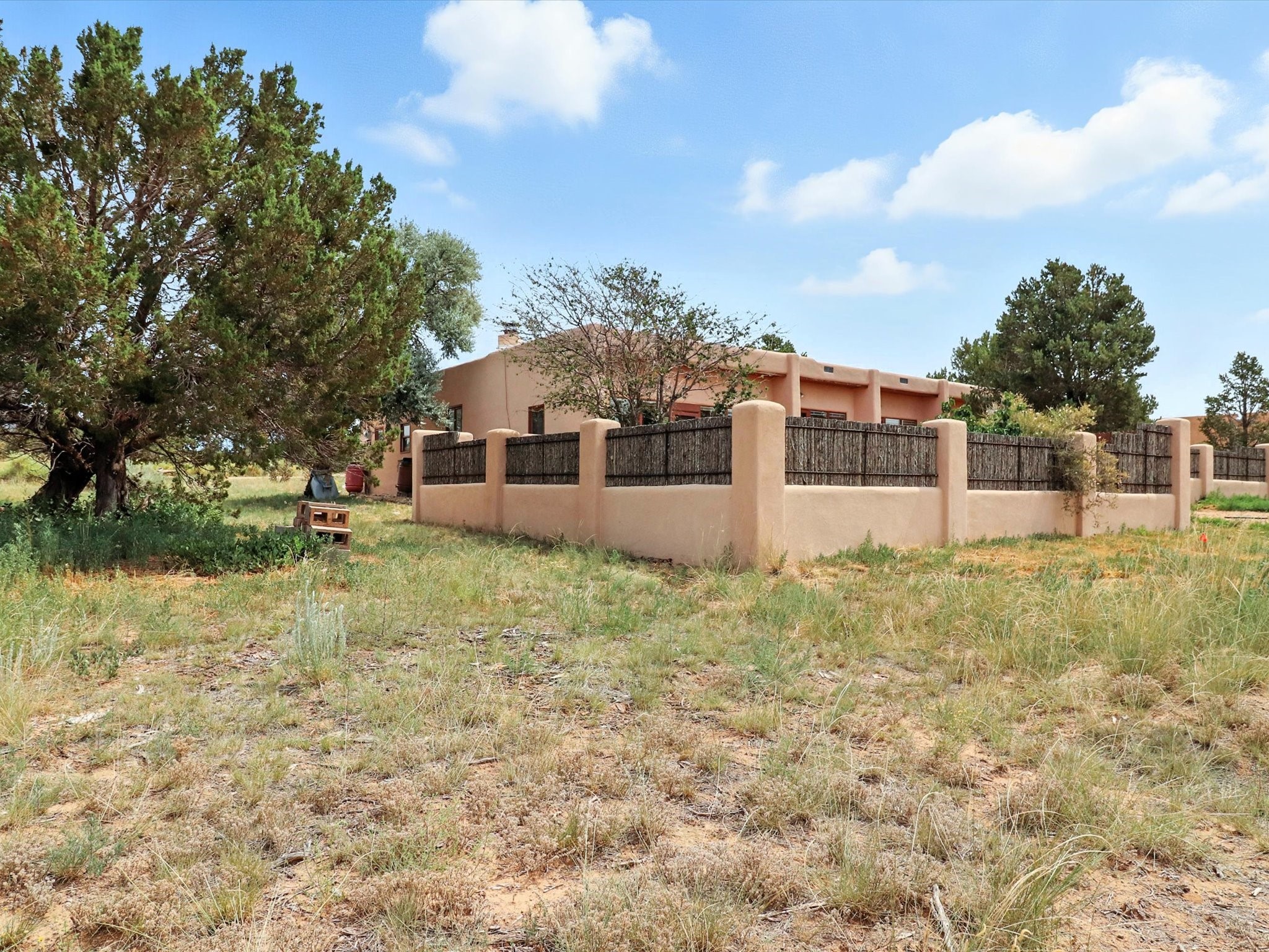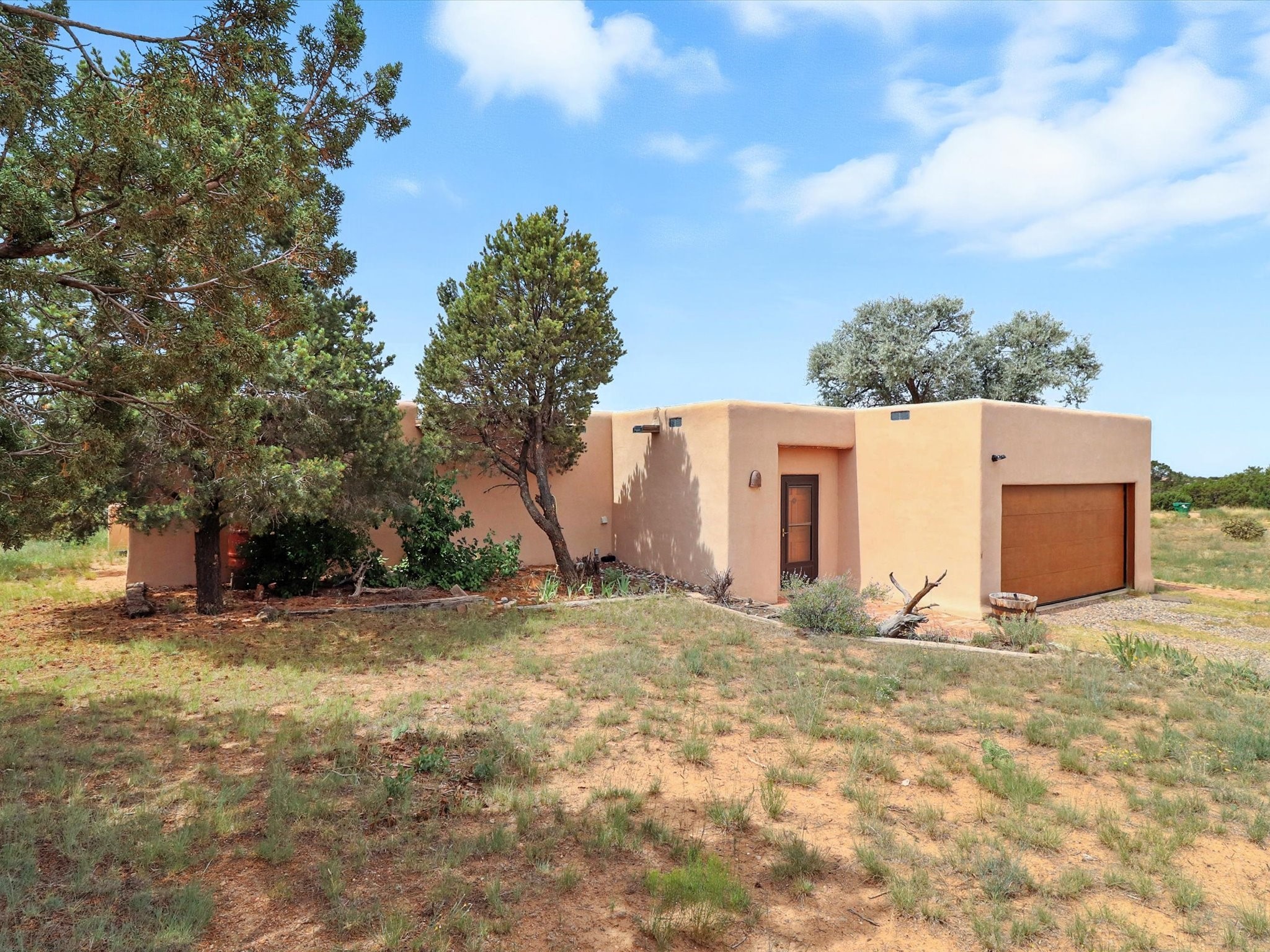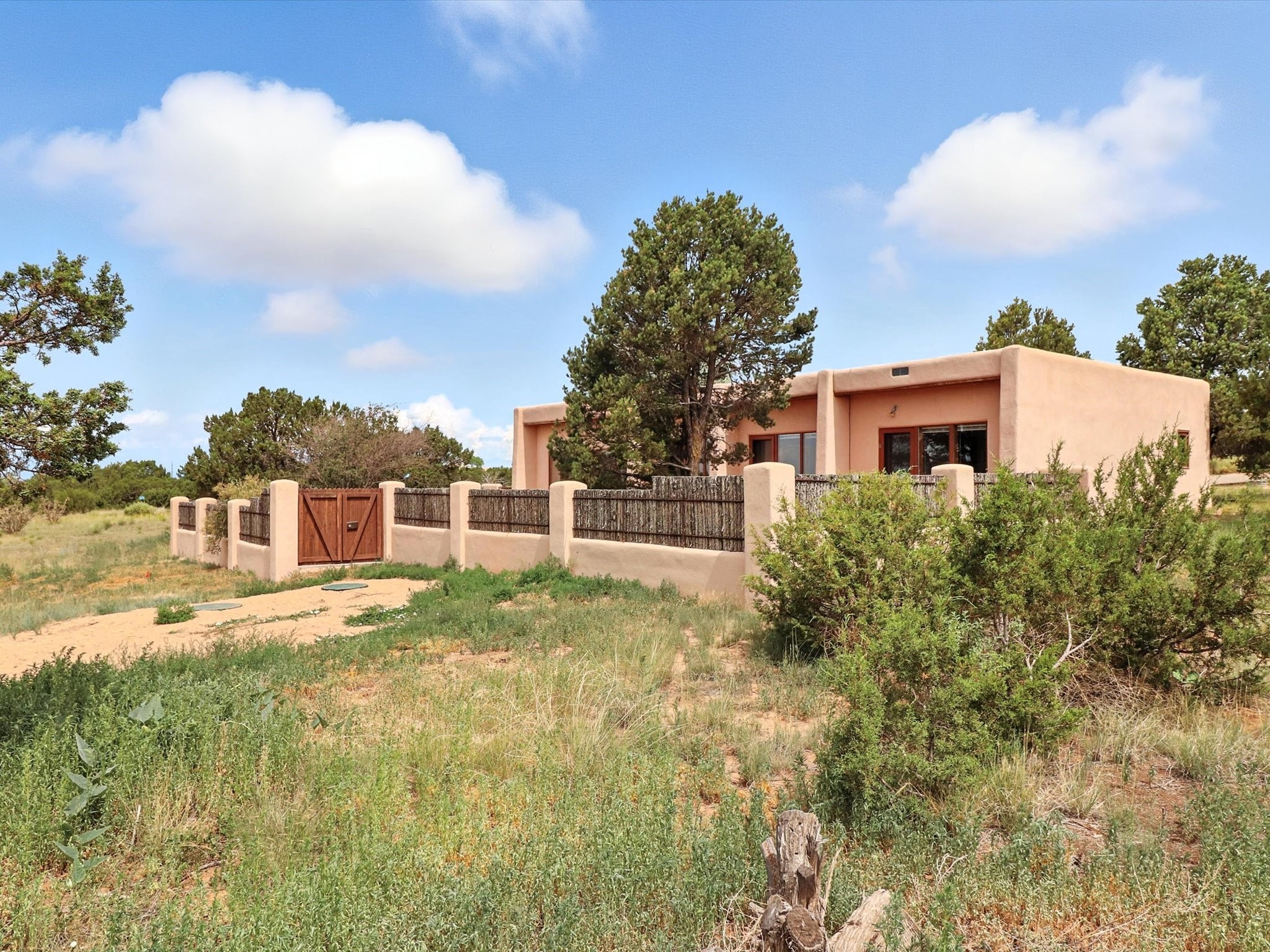 Bright Adobe Home with Southwestern Charm in Peaceful EldoradoNestled on a full acre in the sought-after Eldorado community, this light-filled single-story adobe home offers over 1,600 square feet of comfortable living infused with classic Santa Fe style. Featuring 3 bedrooms and 2 bathrooms, this hidden gem is thoughtfully designed with warm Southwestern details, including a charming kiva fireplace that sets the tone for cozy gatherings.Each bedroom offers direct access to the private, fenced backyard--perfect for enjoying the serene views or creating your own outdoor retreat. The spacious primary suite includes a full bath and built-in cabinetry for added convenience. Large glass windows flood the home with natural light, while the separate laundry room and attached garage provide everyday functionality.Whether you're relaxing in the sunlit interior, cultivating a garden, or exploring nearby walking trails, this property offers both comfort and connection to nature. Located just minutes from downtown Santa Fe via paved roads, and with access to Eldorado's incredible amenities--pool, clubhouse, and scenic trails--you'll experience the best of peaceful living and community charm.
