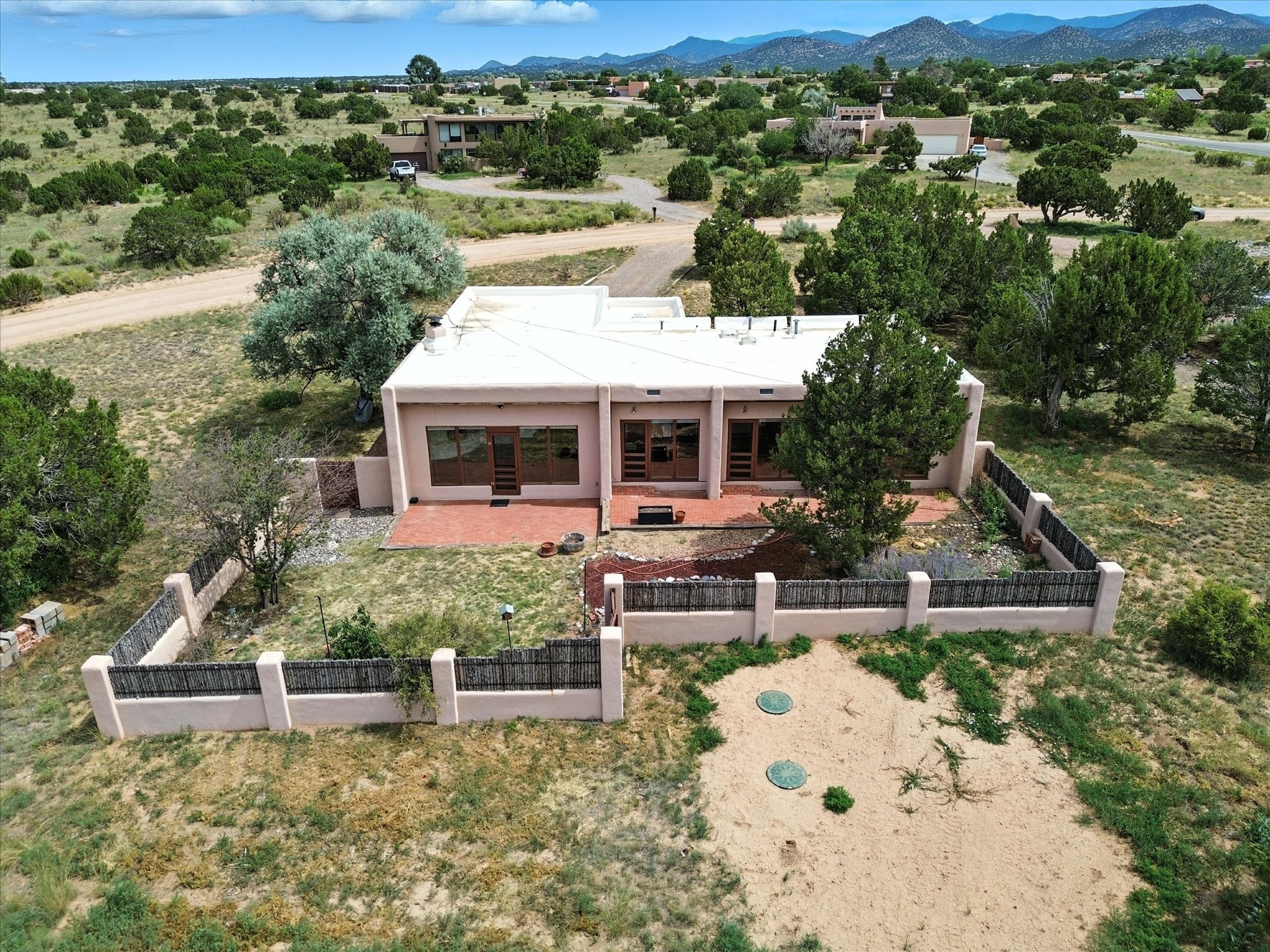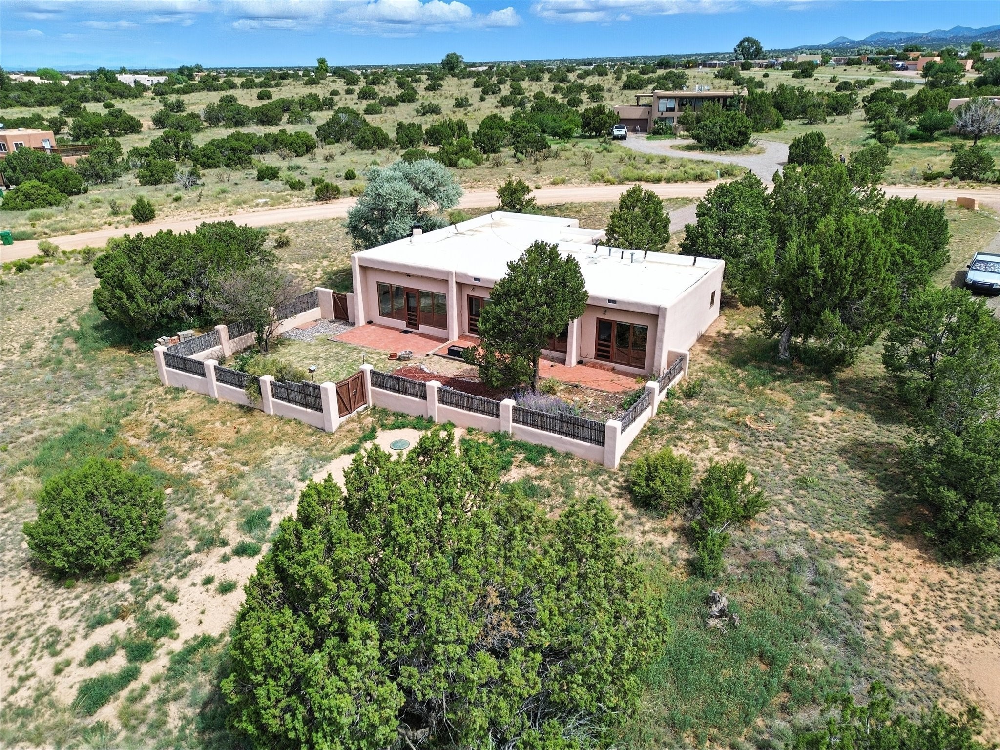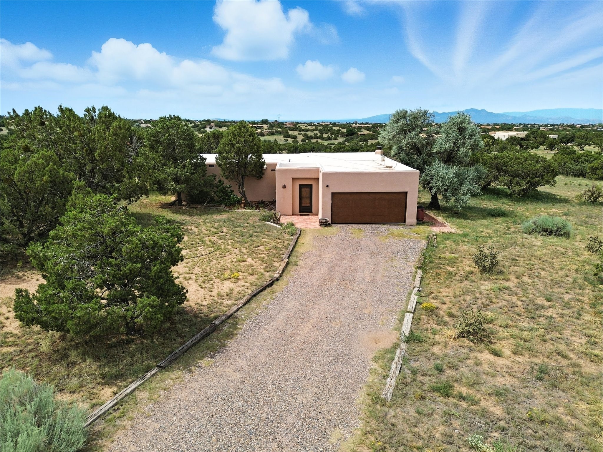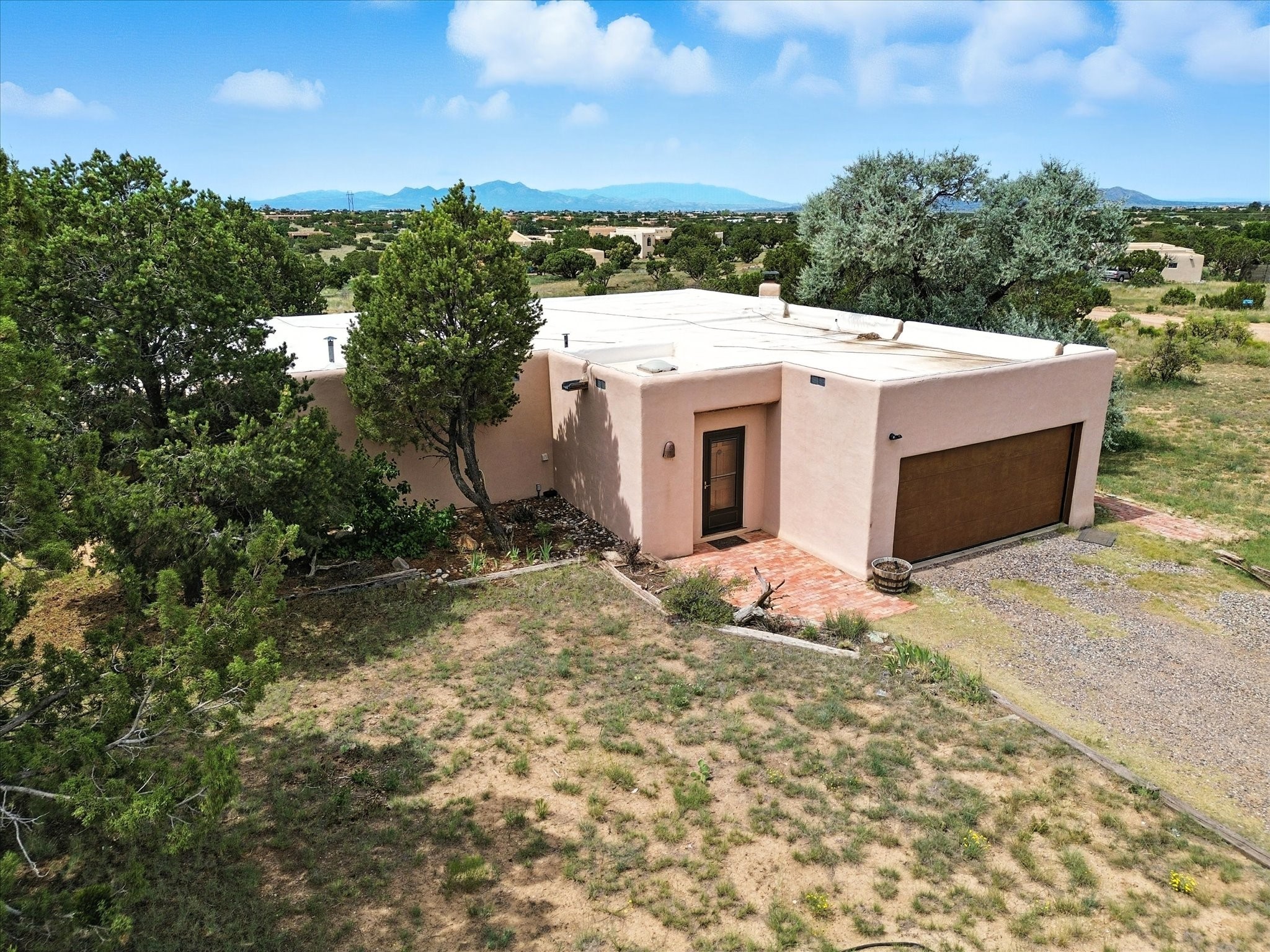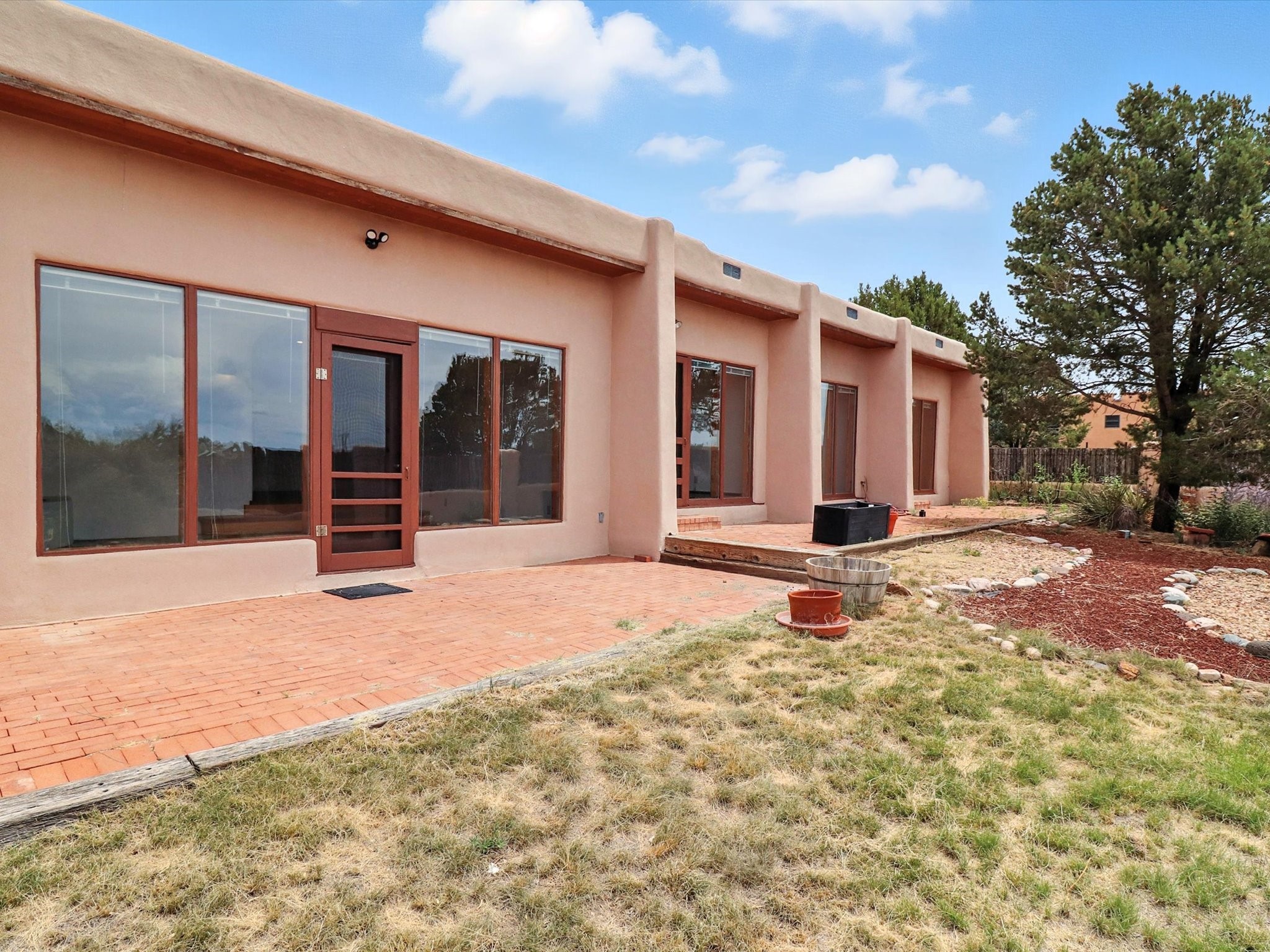 Bright Adobe Home with Southwestern Charm in Peaceful EldoradoNestled on a full acre in the sought-after Eldorado community, this light-filled single-story adobe home offers over 1,600 square feet of comfortable living infused with classic Santa Fe style. Featuring 3 bedrooms and 2 bathrooms, this hidden gem is thoughtfully designed with warm Southwestern details, including a charming kiva fireplace that sets the tone for cozy gatherings.Each bedroom offers direct access to the private, fenced backyard--perfect for enjoying the serene views or creating your own outdoor retreat. The spacious primary suite includes a full bath and built-in cabinetry for added convenience. Large glass windows flood the home with natural light, while the separate laundry room and attached garage provide everyday functionality.Whether you're relaxing in the sunlit interior, cultivating a garden, or exploring nearby walking trails, this property offers both comfort and connection to nature. Located just minutes from downtown Santa Fe via paved roads, and with access to Eldorado's incredible amenities--pool, clubhouse, and scenic trails--you'll experience the best of peaceful living and community charm.