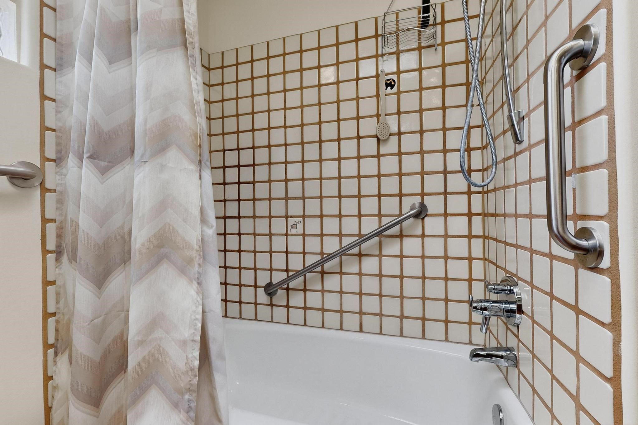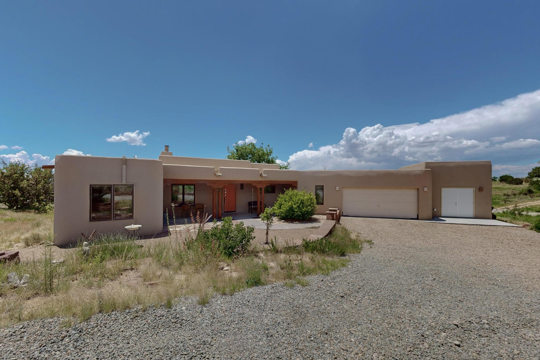 Superb sunset views from the dining area, living room and portal are one of the special treats offered at this lovely home built with a romantic flair by Homes by Marie. Curved corners, high viga ceilings, a central kiva fireplace, double glass in the baths and lots of Santa Fe trimmings create a light and ambient home. Excellent separation between the main and guest bedrooms, and an open plan design makes for easy living spaces. Natural gas radiant heat plus 4 mini splits creates summer and winter comfort plus a cheery Revillusion electric log fireplace insert adds heat and ambience. The refreshed kitchen includes an induction range and granite counter tops. There is a gas hook up behind the range if preferred. An extra heated area between the house and garage was finished as a workout room/office/storage. Added next to the 2 car garage is a spacious finished 12ftx20ft workshop/studio for all those extra hobbies. There is a terraced walled garden and large fenced in area for the fur family, the septic tank was replaced in 2024. Centrally located on a quiet cul de sac this home has easy access to Eldorado Amenities, local shopping, library and schools, only minutes into Santa Fe
