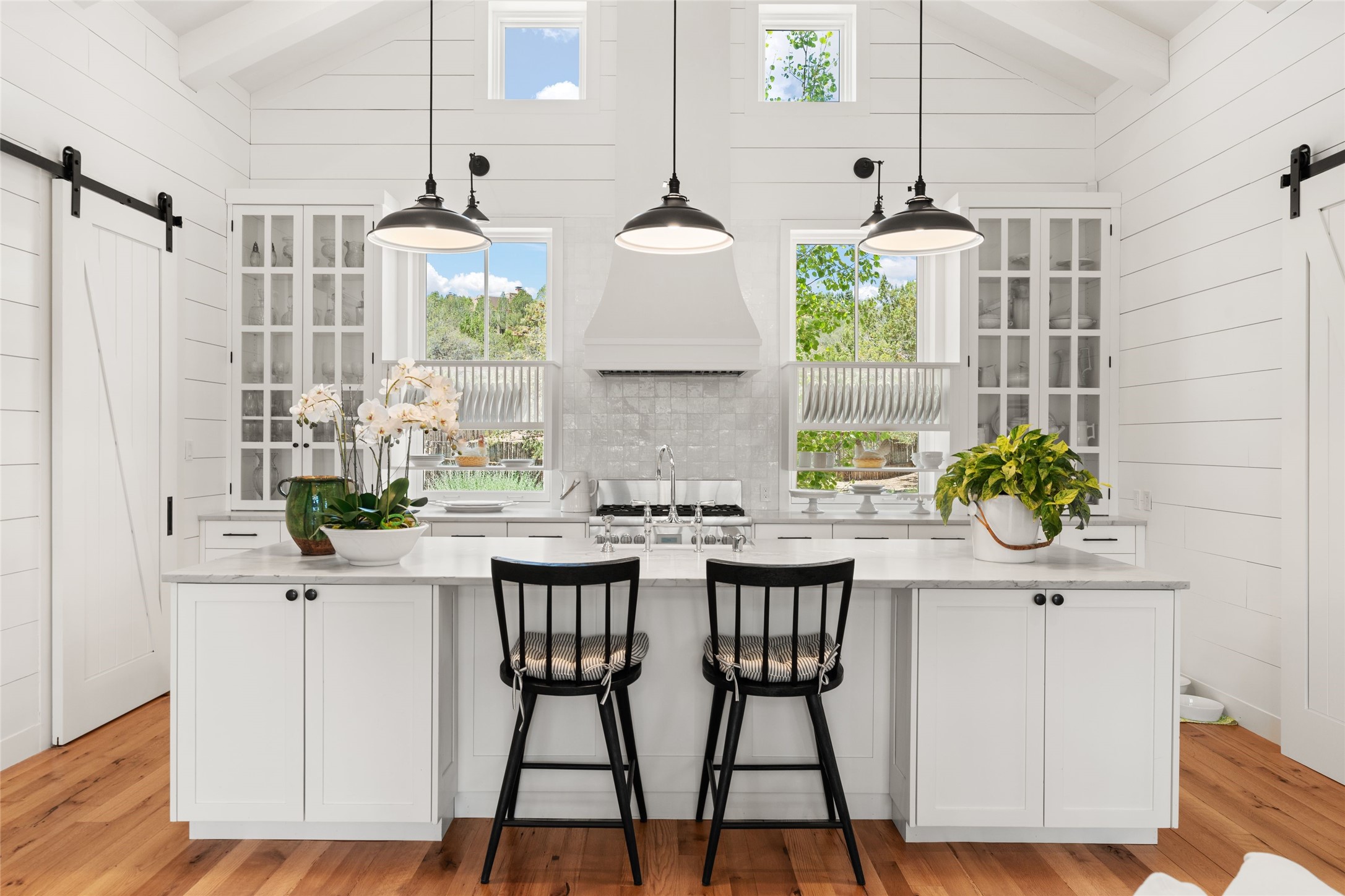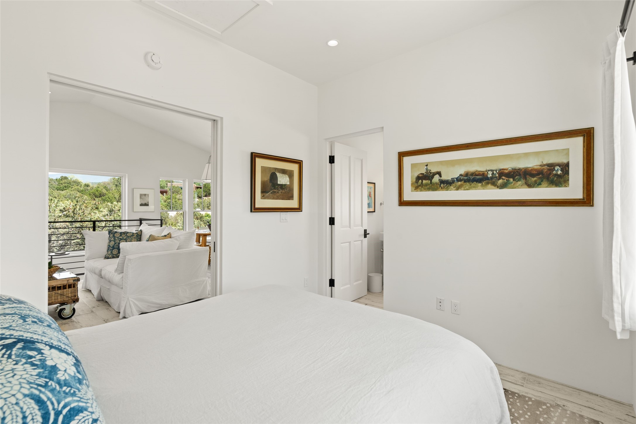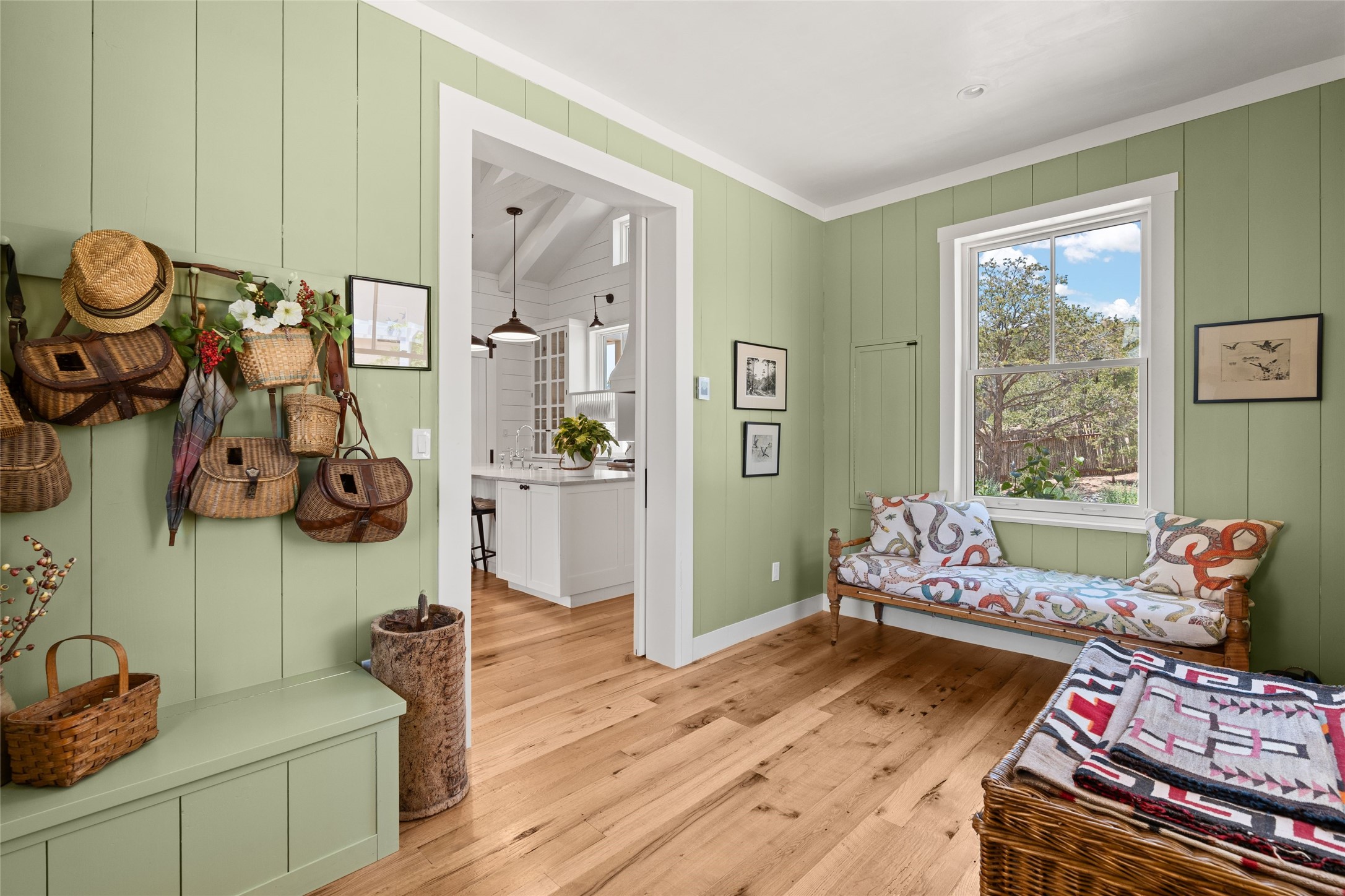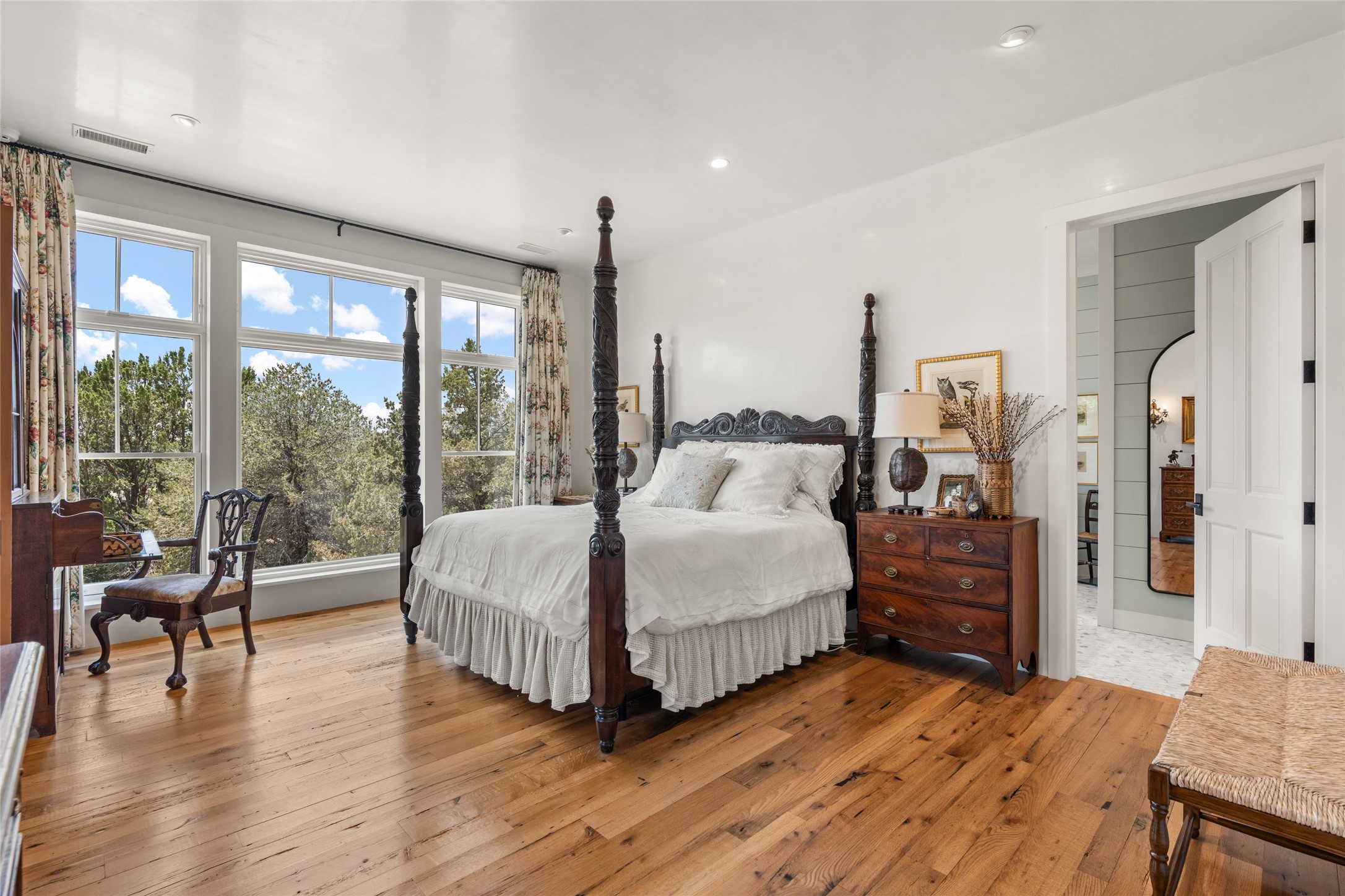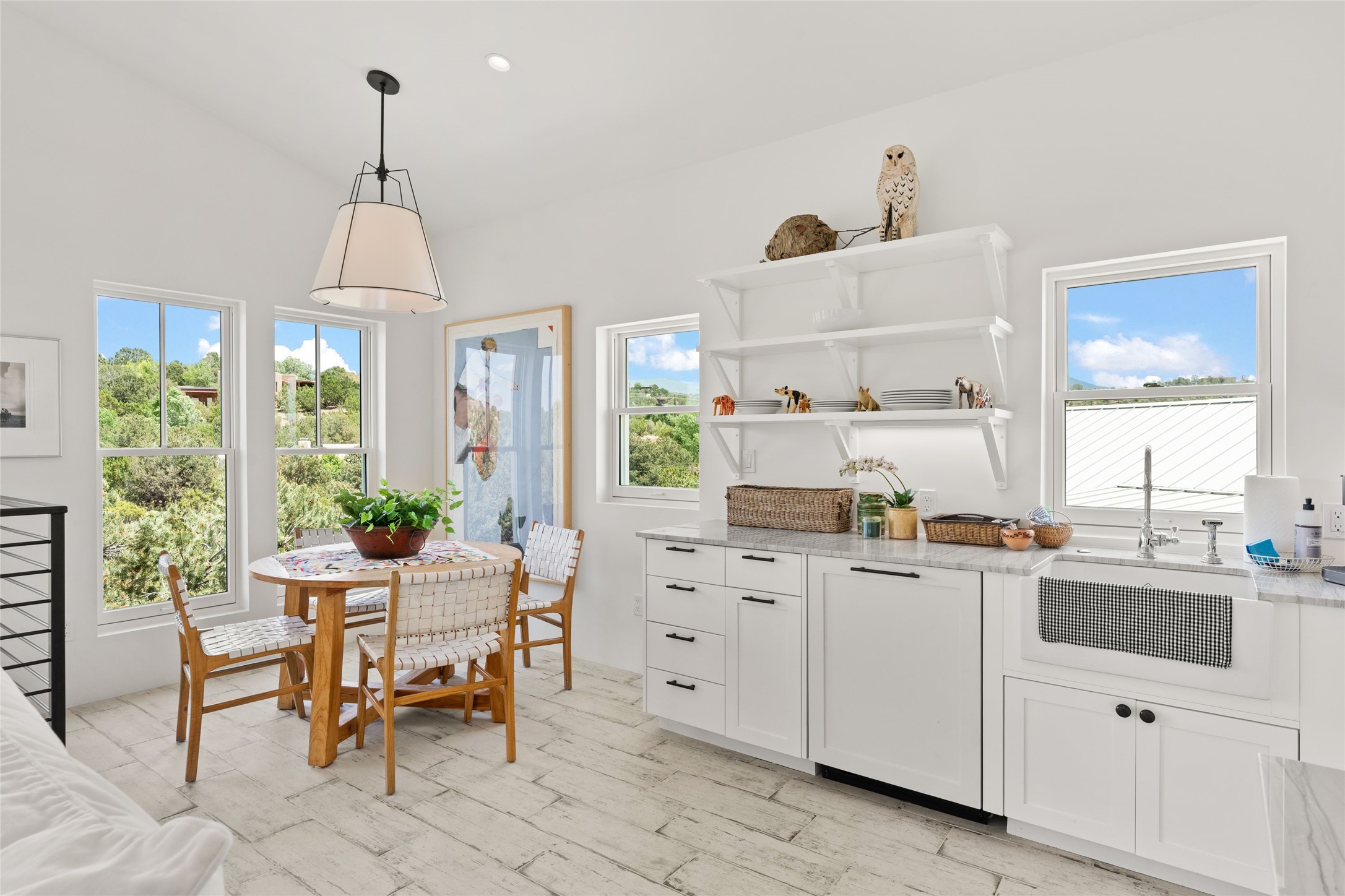 A masterpiece in Design and Location- Nestled in a premier address, this property s a gem that harmoniously blends sophisticated construction with natural beauty. Meticulously built by award winning Woods Construction, the home exudes exceptional craftsmanship, offering elegant yet comfortable living experience. Step inside to discover a space that is as gracious as it is inviting. The interior design showcases an array of unique details including: reclaimed oak floors, stunning ship-lath walls, and smooth diamond plaster that add texture and warmth to the home. Soaring ceilings and large picture windows bathe the interior in natural ight, while also framing sweeping views of the mountain desert landscape.The spacious 2 bedroom, 1 1/2 bath main house is a perfect retreat. The primary suite offers both luxury and privacy, featuring an elegant, wood paneled library that separates it from the rest of the home. A second bedroom is a versatile space that lends itself to an office, if needed.Above the detached garage, you will find a generously sized guest apartment with a living room and kitchen and offering superb views of the Sangres. Adjacent to the garage is a climatized workspace, perfect for converting into a wine cellar or studio. Spanning 2.4 acres, this lovely property celebrates the rugged beauty of the surrounding arroyo. The back portal of the main house is a protected spot for year round entertaining. This is more than a home - it is a sanctuary where every detail has been carefully considered to create a special and serene environment.