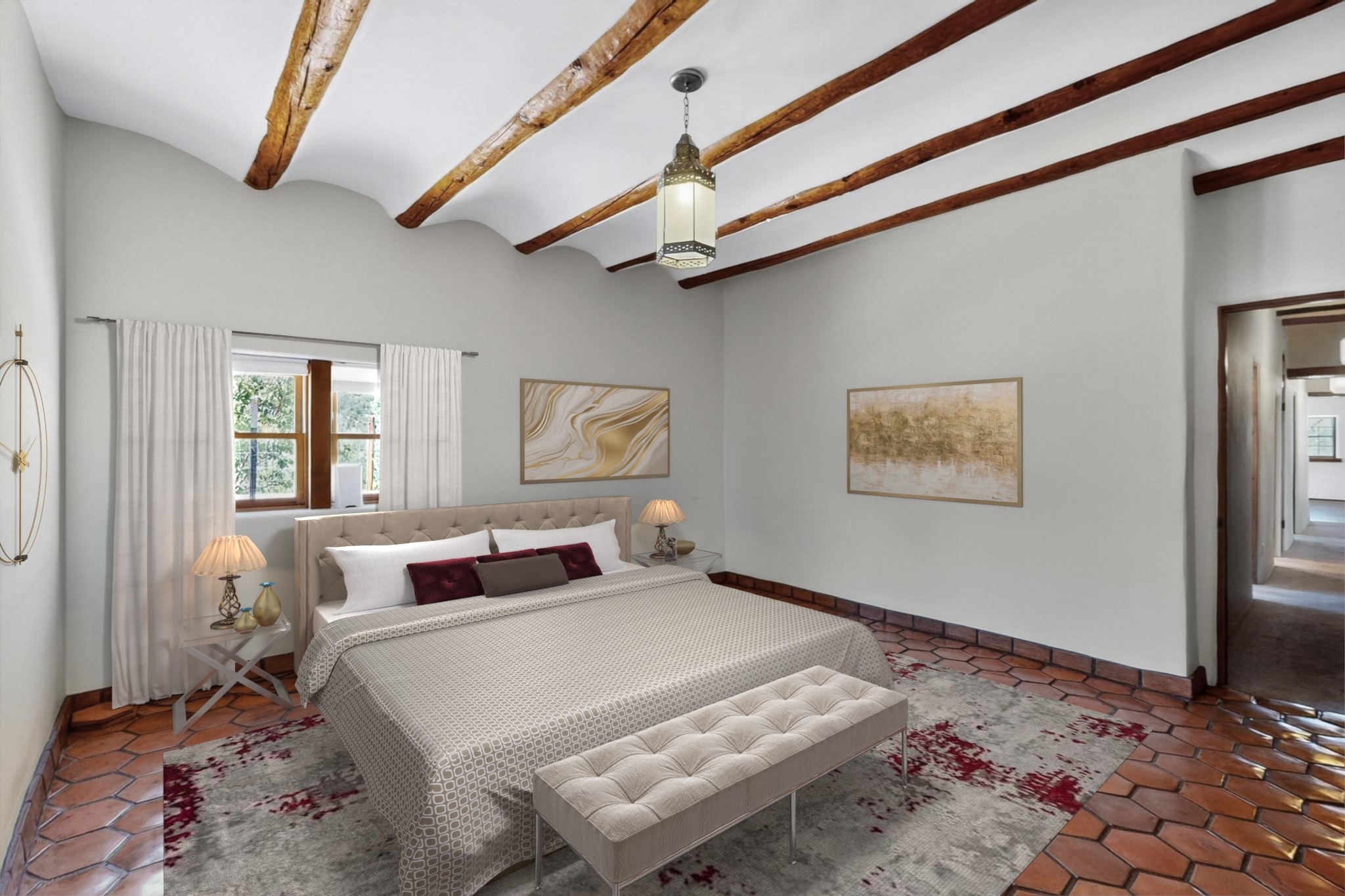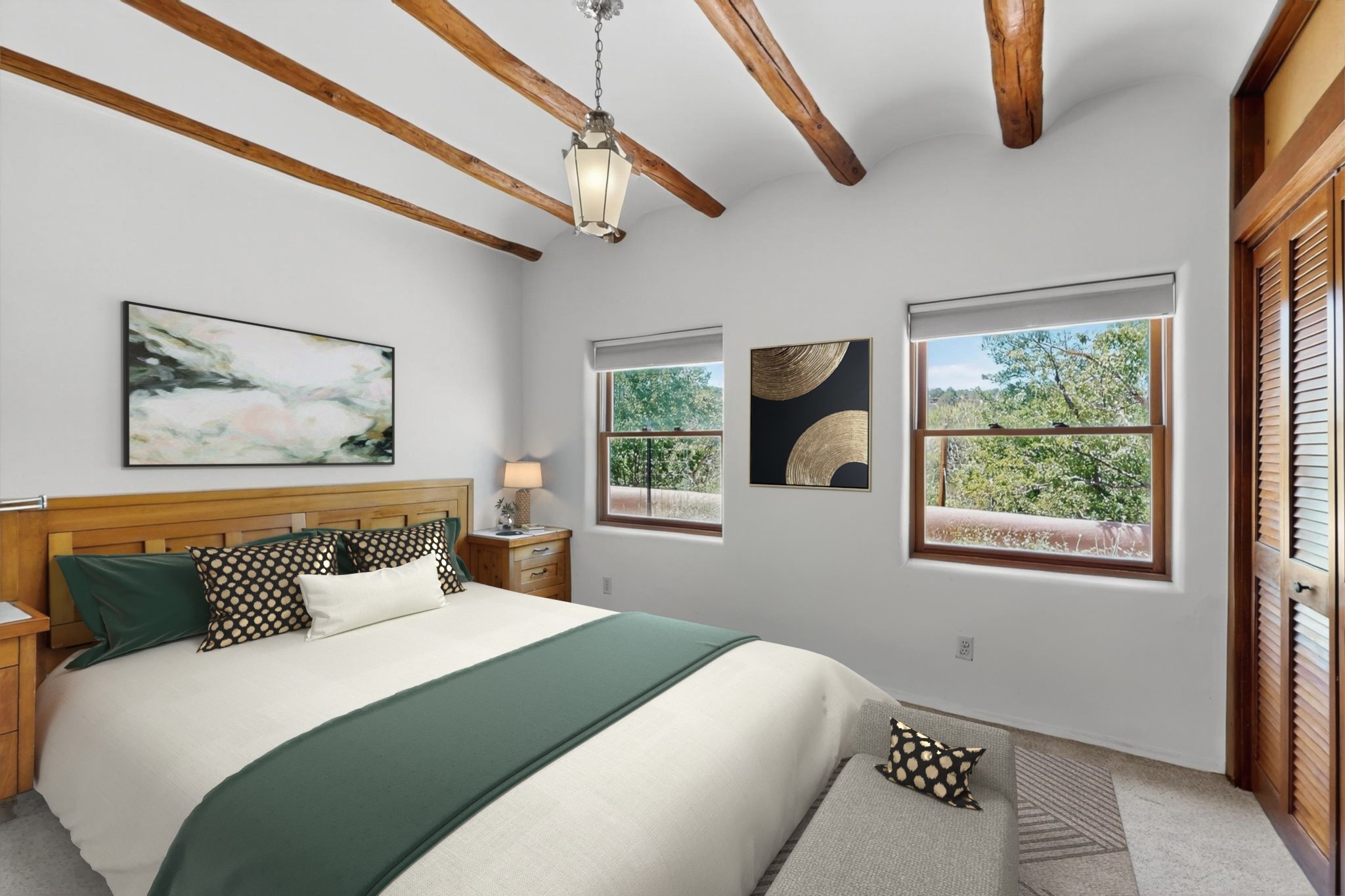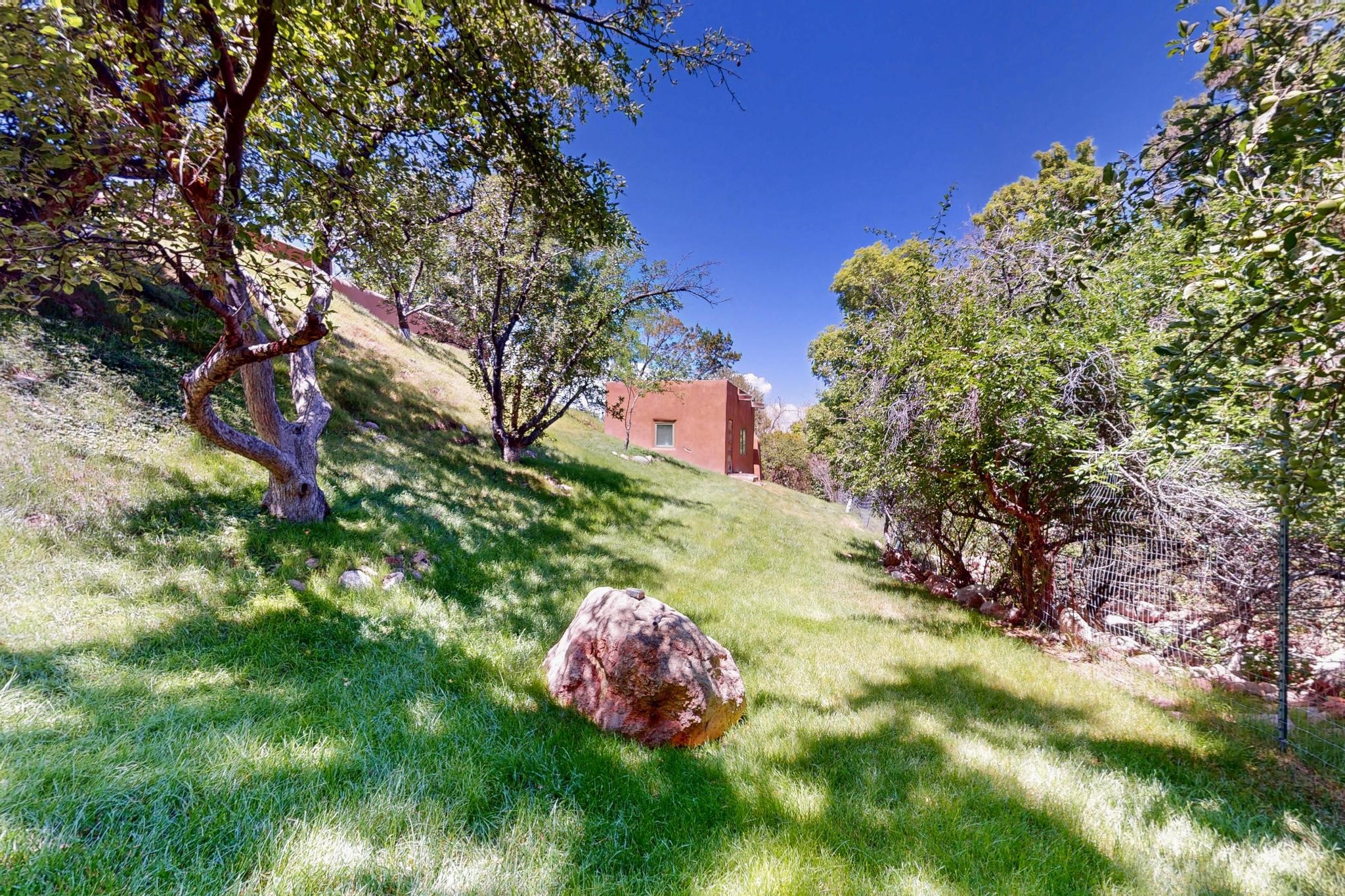 Rare Tesuque Offering & One of the last original Big Tesuque Canyon properties: all adobe and on nearly 9 acres this is a spectacular opportunity! Located at the end of the Canyon and bordering the National Forest, this has unparalleled privacy and quietude. Set in a verdant landscape, this three-bedroom two-bathtwo home is an original, charming adobe pueblo. In addition to this home on the hill, there is an adobe outbuilding which can become a guest house and or studio. There is also a small barn which can be further developed. The home and lovely acreage of sweeping hills, grassy knolls and many fruit trees is irrigated by a private well. Well loved and cared for many years by one family, this is a chance to have an extraordinary piece of beautiful Tesuque. All depictions of furniture are virtually staged.