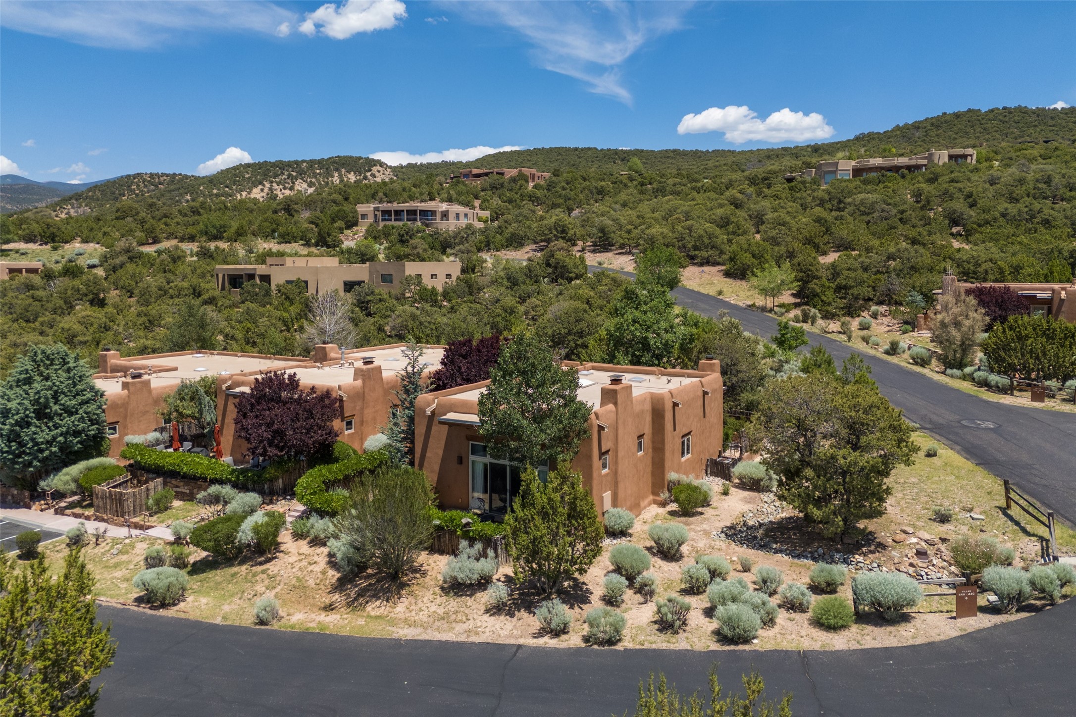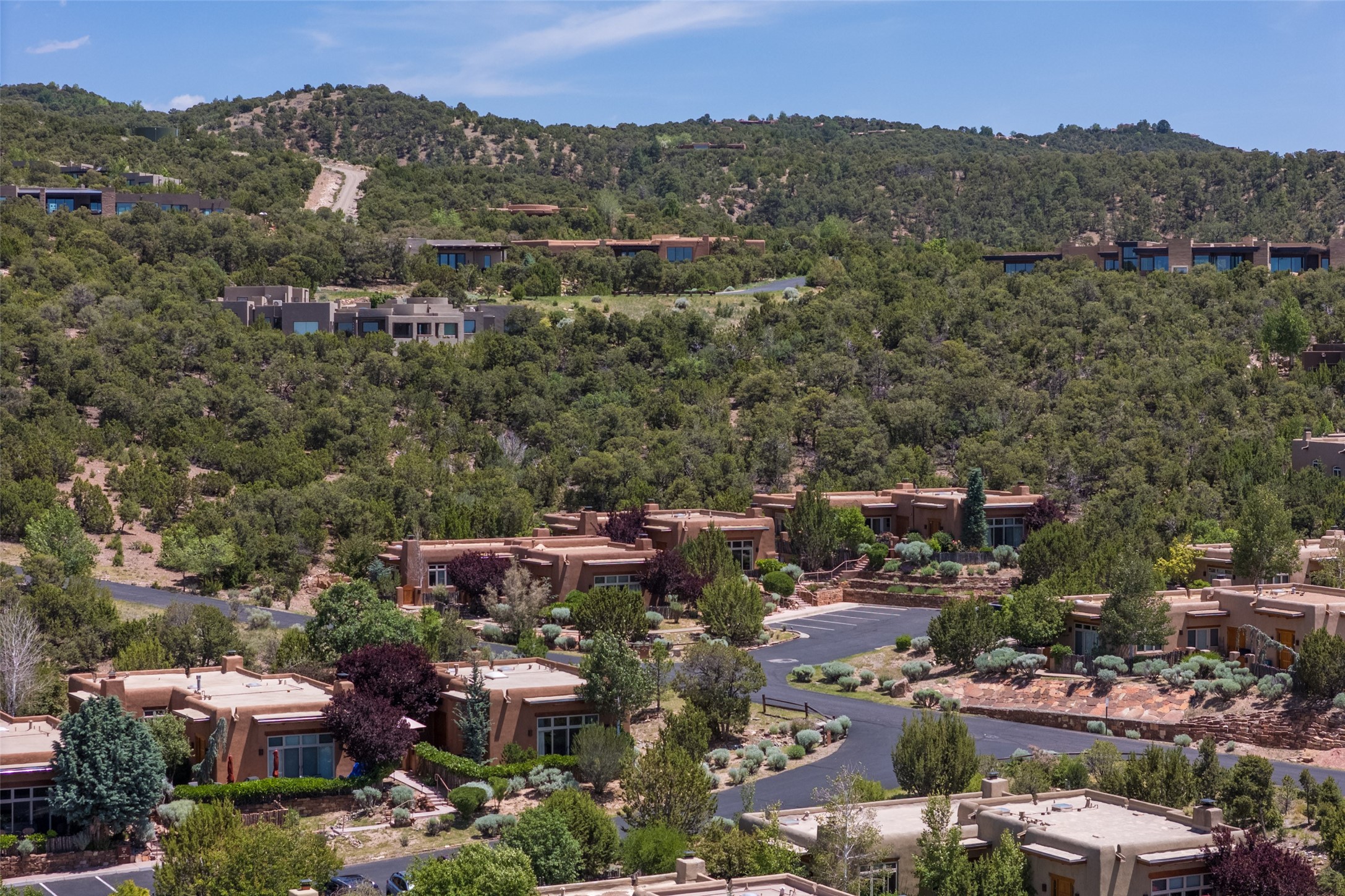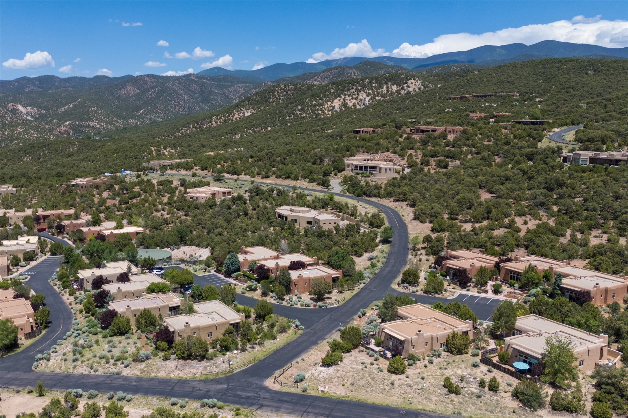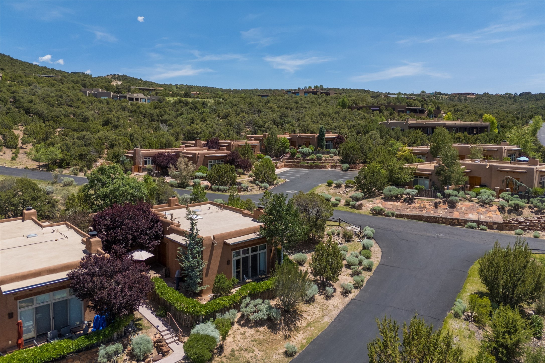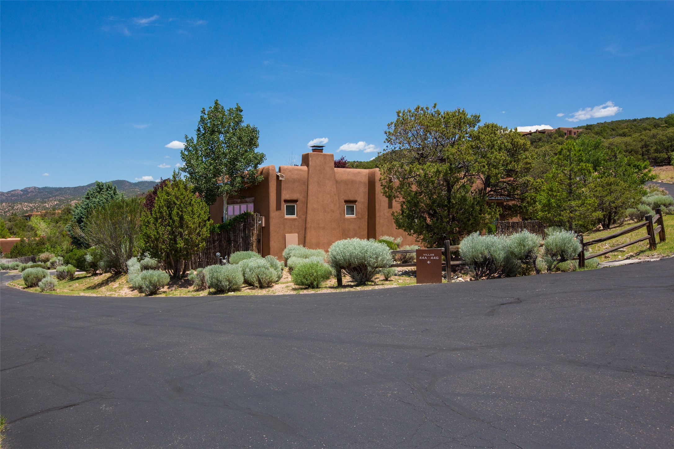 Experience breathtaking vistas of the Jemez mountains and stunning sunsets from this freestanding, 2 bedroom, 2 bath, single level villa. Just a few short minutes north of the historic Santa Fe Plaza, fine art galleries, museums, and world-class dining. Nestled at the base of the Sangre de Cristo Mountains in the exclusive Bishops Lodge Villas gated community, adjacent to the Santa Fe National Forest, offering abundant hiking, biking and walking trails and endless other four-season recreational activities. Featuring an open concept floor plan with high ceilings, traditional vigas, hand-troweled plaster walls, and central a/c, the villa includes two spacious suites, each with a kiva fireplace and private outdoor patio. One of the suites also has a steam shower and jetted tub. Meticulously maintained including new stucco and a 9-year roof warranty. Residents enjoy access to two shared villas pools and can make arrangements to utilize the unparalleled amenities of the world-renowned Bishops Lodge Resort by Auberge, making it an ideal retreat to entertain family and friends. Furnishings package is available.