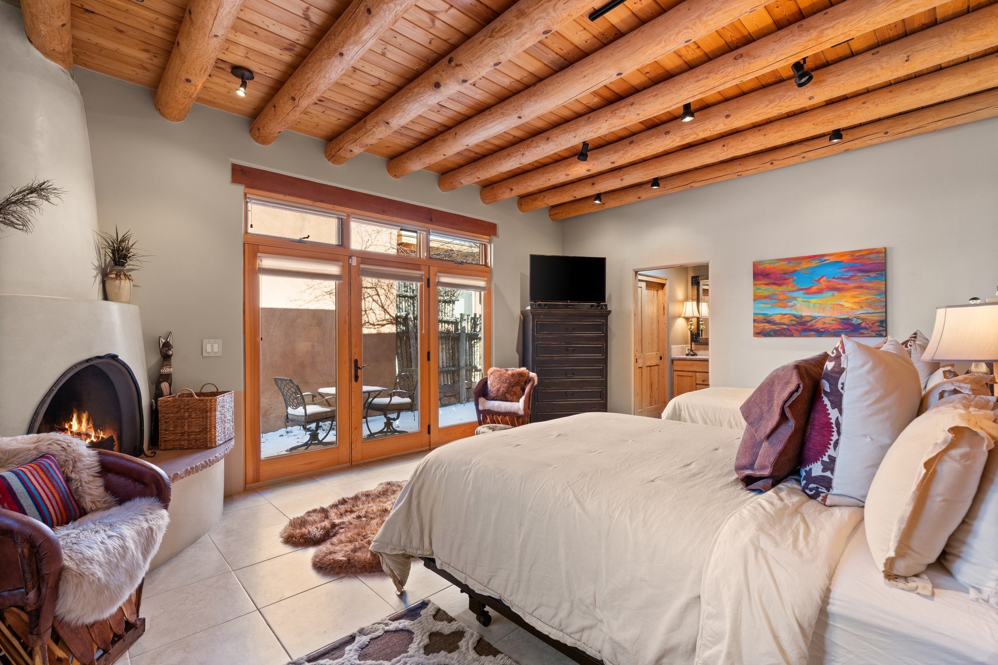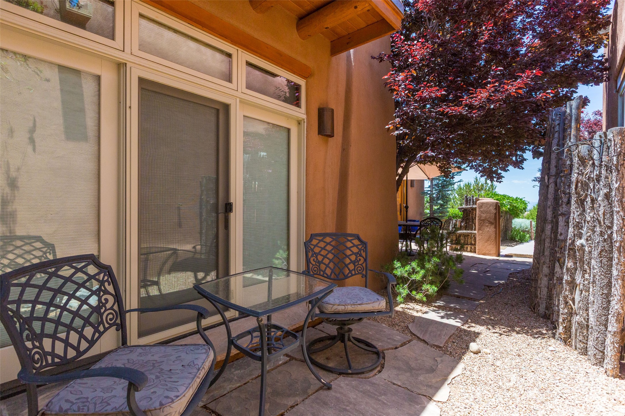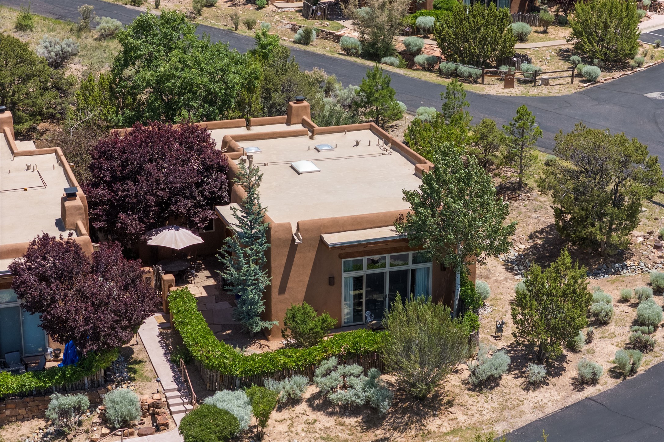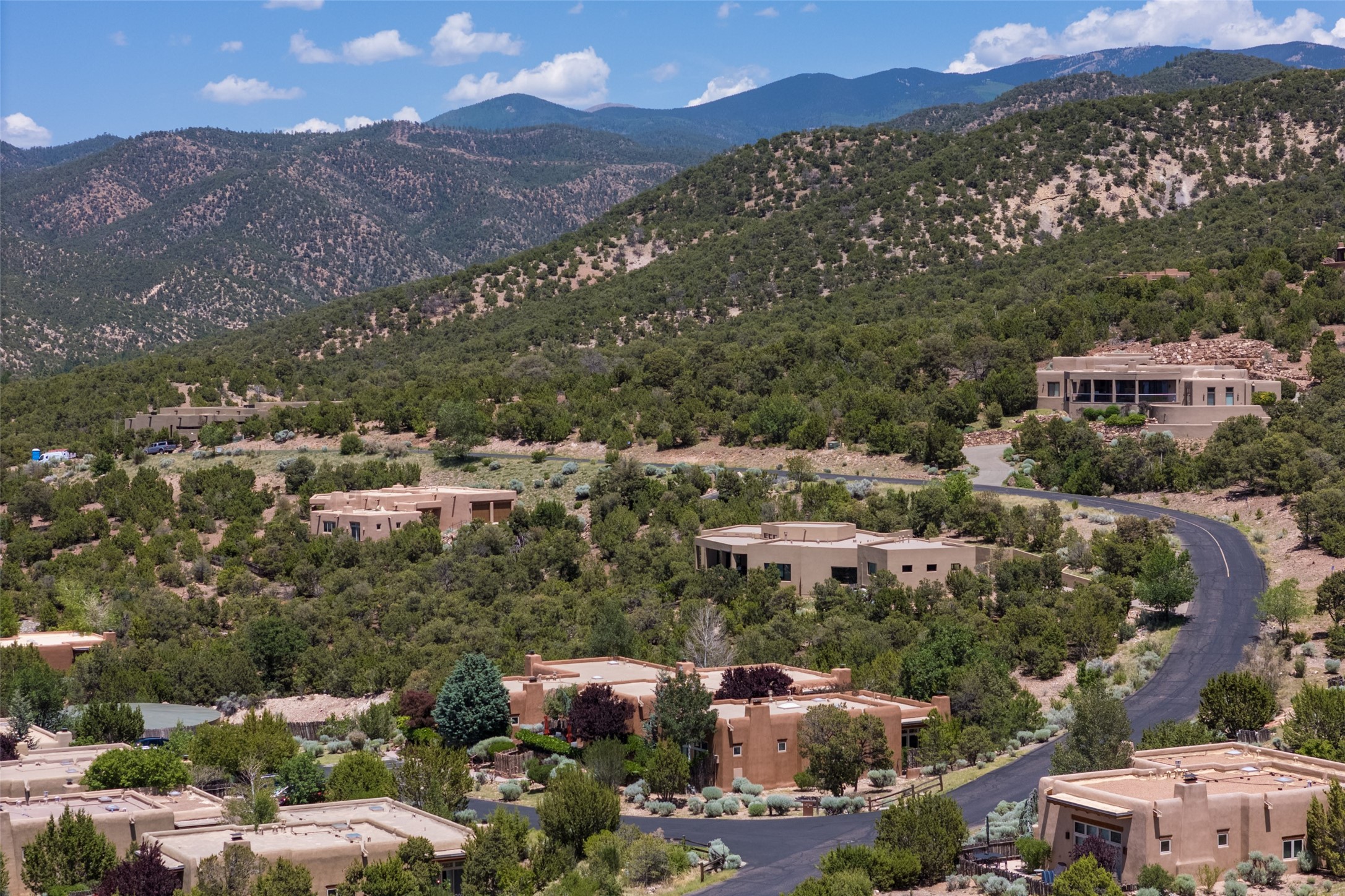 Experience breathtaking vistas of the Jemez mountains and stunning sunsets from this freestanding, 2 bedroom, 2 bath, single level villa. Just a few short minutes north of the historic Santa Fe Plaza, fine art galleries, museums, and world-class dining. Nestled at the base of the Sangre de Cristo Mountains in the exclusive Bishops Lodge Villas gated community, adjacent to the Santa Fe National Forest, offering abundant hiking, biking and walking trails and endless other four-season recreational activities. Featuring an open concept floor plan with high ceilings, traditional vigas, hand-troweled plaster walls, and central a/c, the villa includes two spacious suites, each with a kiva fireplace and private outdoor patio. One of the suites also has a steam shower and jetted tub. Meticulously maintained including new stucco and a 9-year roof warranty. Residents enjoy access to two shared villas pools and can make arrangements to utilize the unparalleled amenities of the world-renowned Bishops Lodge Resort by Auberge, making it an ideal retreat to entertain family and friends. Furnishings package is available.