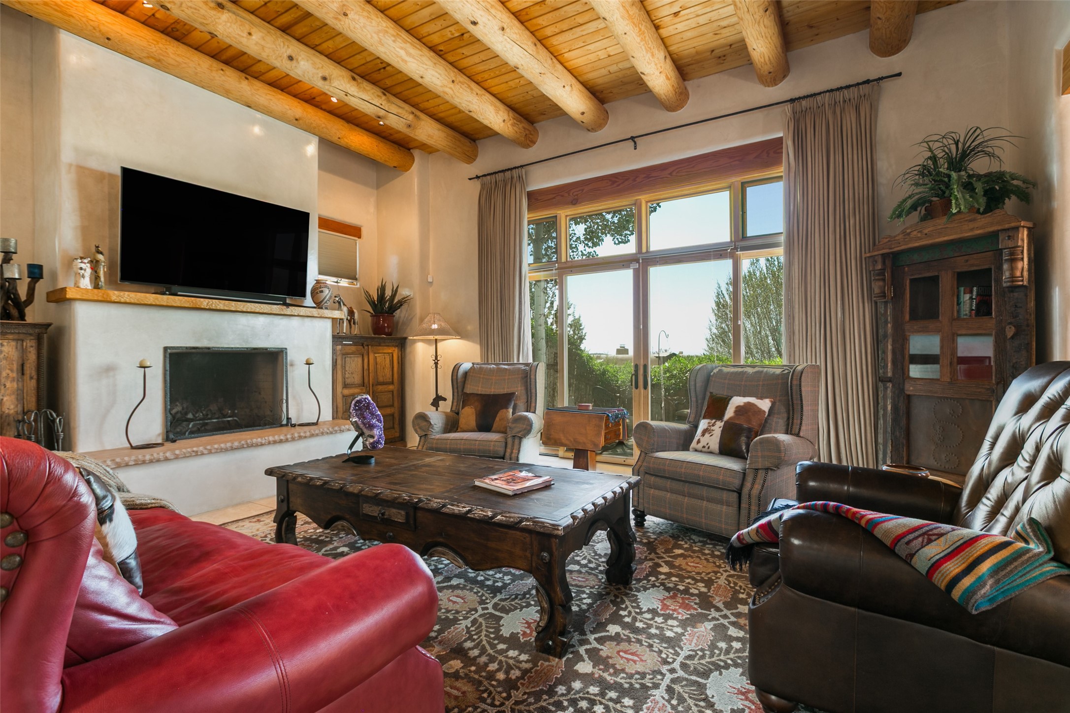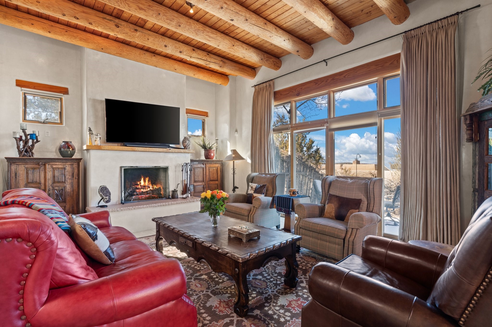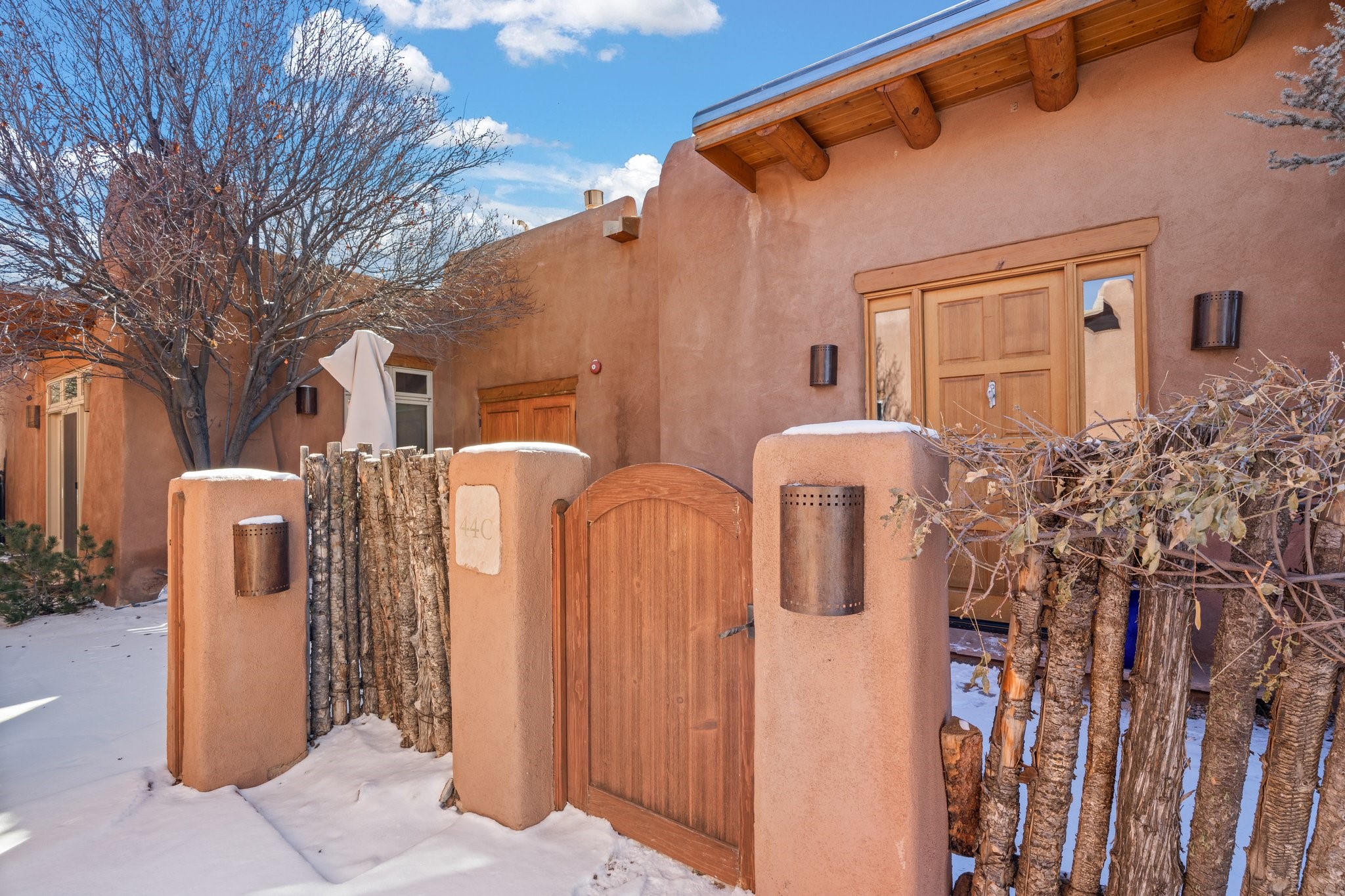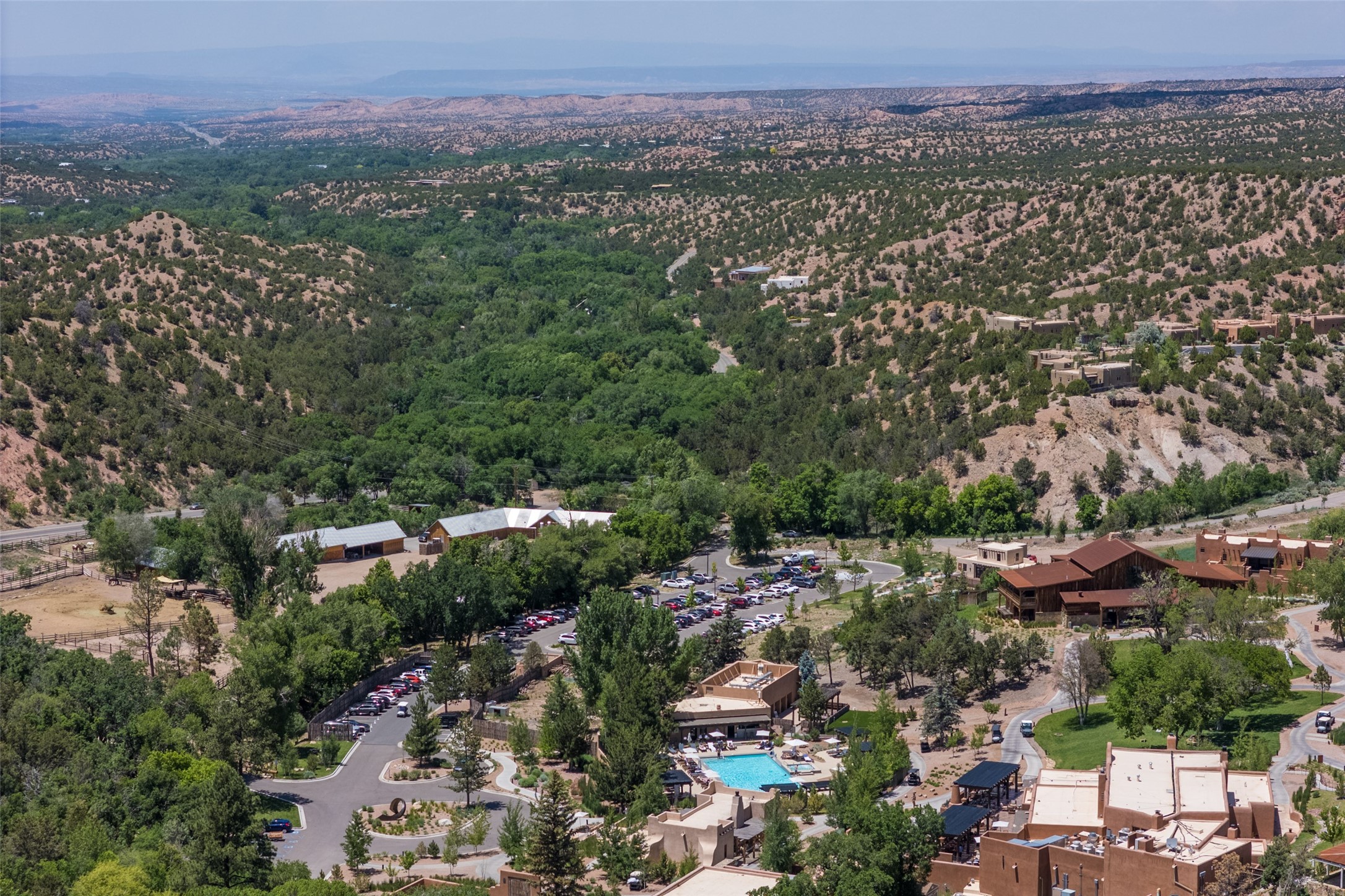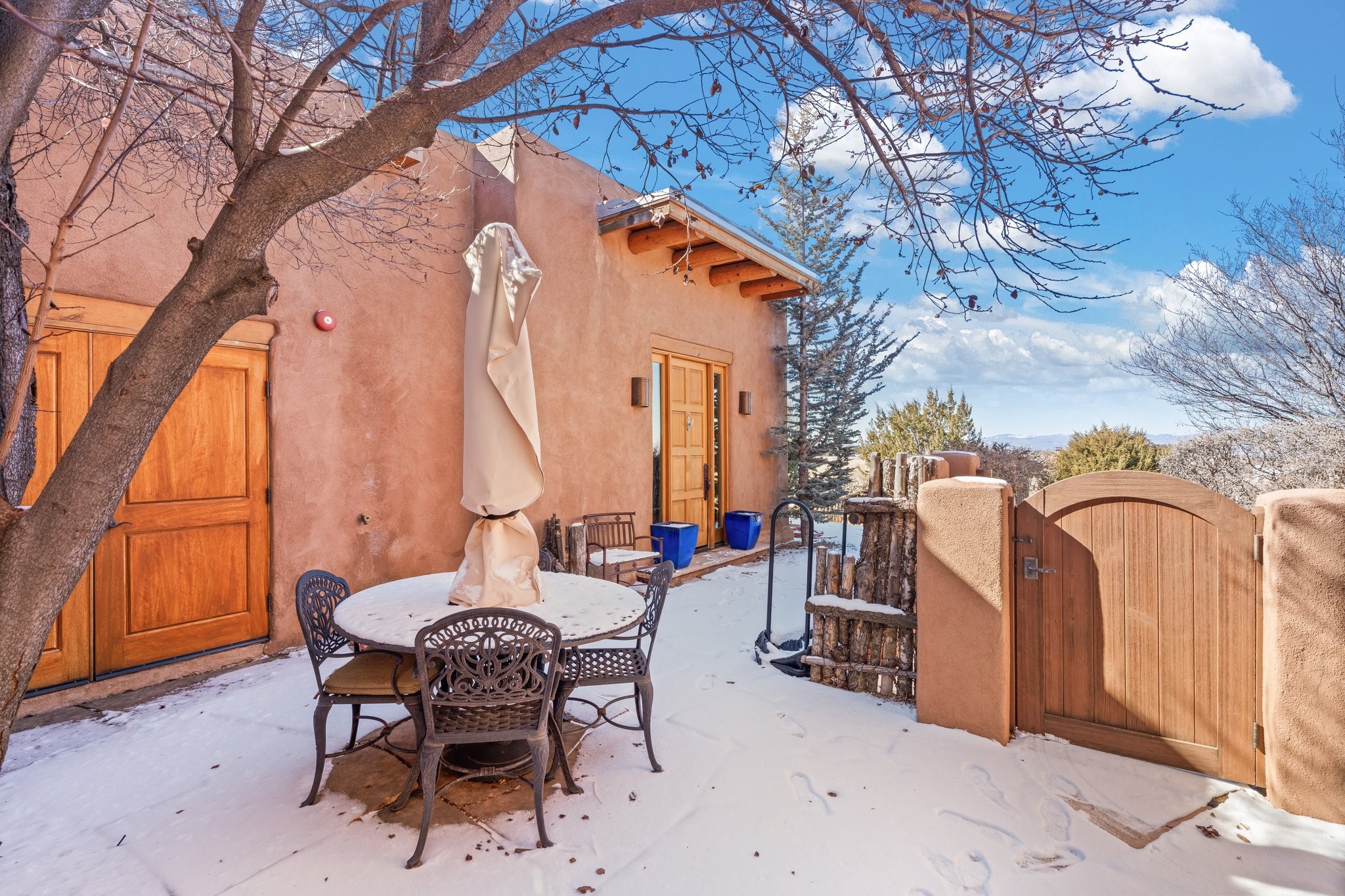 Experience breathtaking vistas of the Jemez mountains and stunning sunsets from this freestanding, 2 bedroom, 2 bath, single level villa. Just a few short minutes north of the historic Santa Fe Plaza, fine art galleries, museums, and world-class dining. Nestled at the base of the Sangre de Cristo Mountains in the exclusive Bishops Lodge Villas gated community, adjacent to the Santa Fe National Forest, offering abundant hiking, biking and walking trails and endless other four-season recreational activities. Featuring an open concept floor plan with high ceilings, traditional vigas, hand-troweled plaster walls, and central a/c, the villa includes two spacious suites, each with a kiva fireplace and private outdoor patio. One of the suites also has a steam shower and jetted tub. Meticulously maintained including new stucco and a 9-year roof warranty. Residents enjoy access to two shared villas pools and can make arrangements to utilize the unparalleled amenities of the world-renowned Bishops Lodge Resort by Auberge, making it an ideal retreat to entertain family and friends. Furnishings package is available.