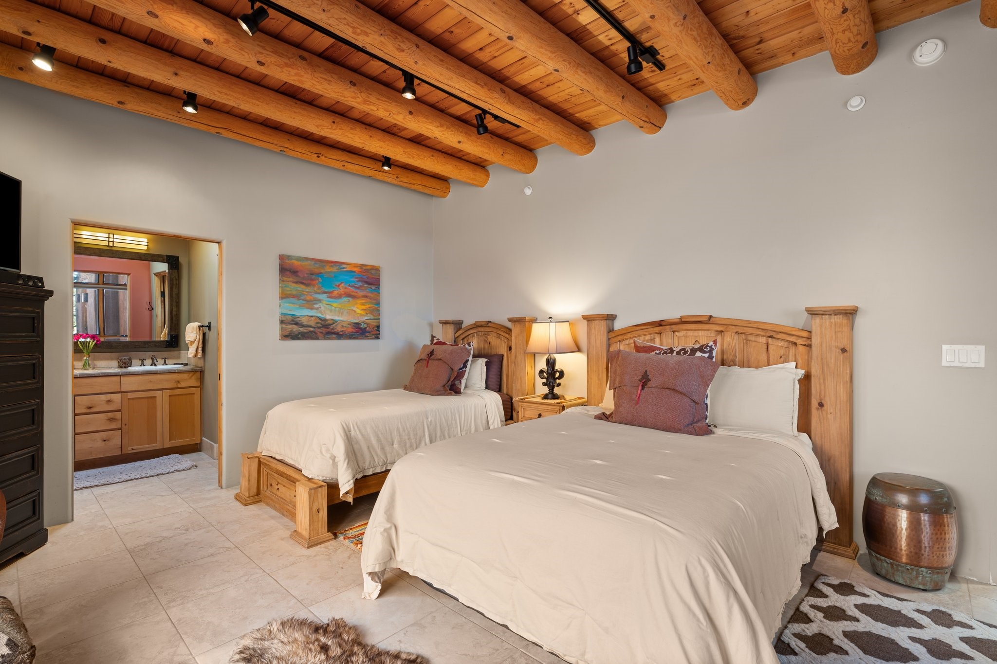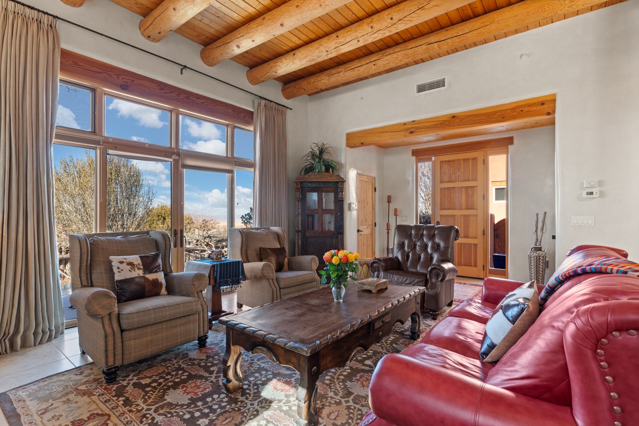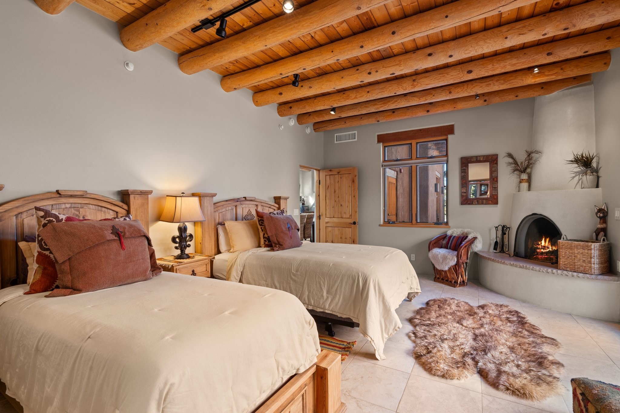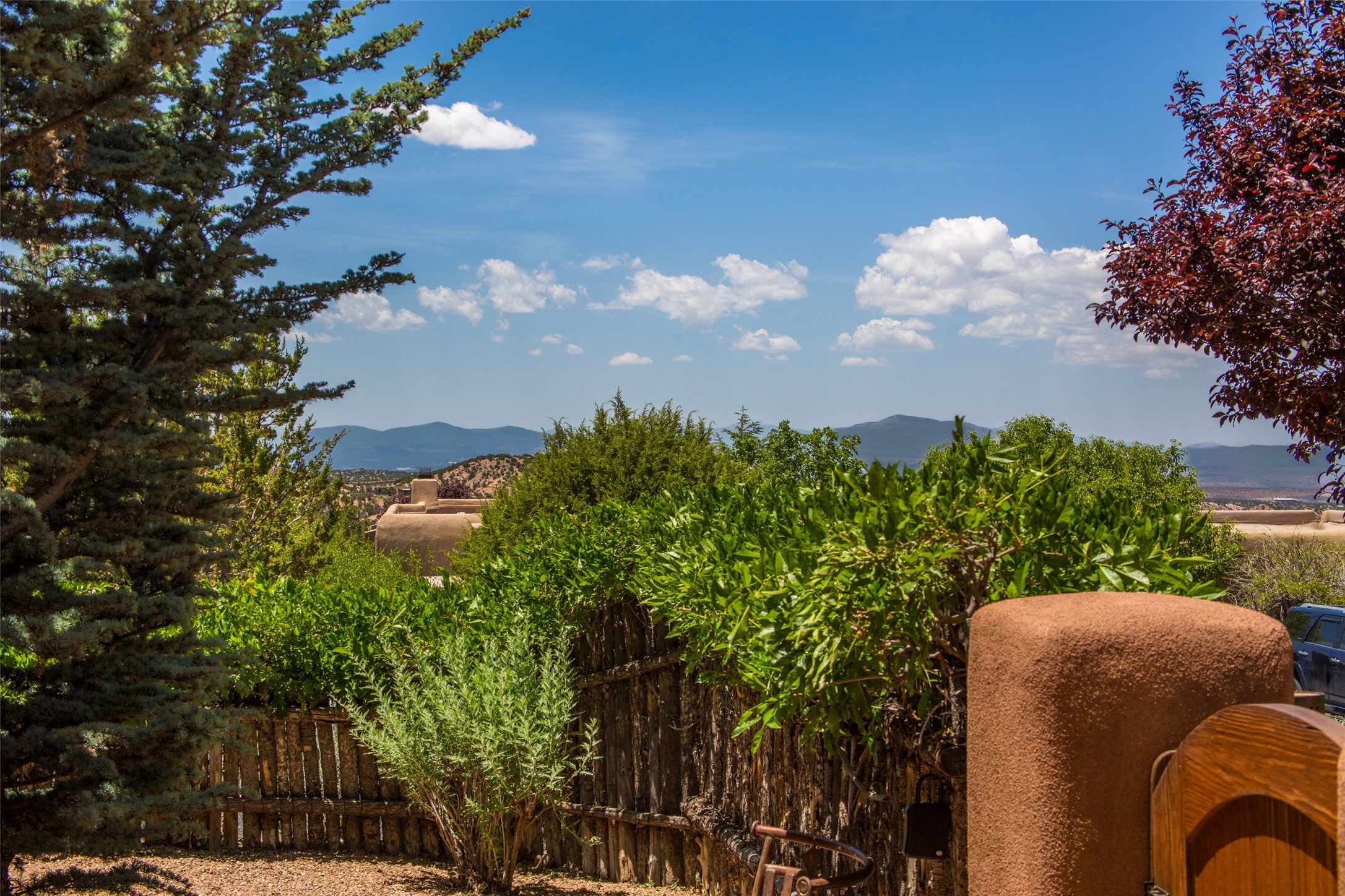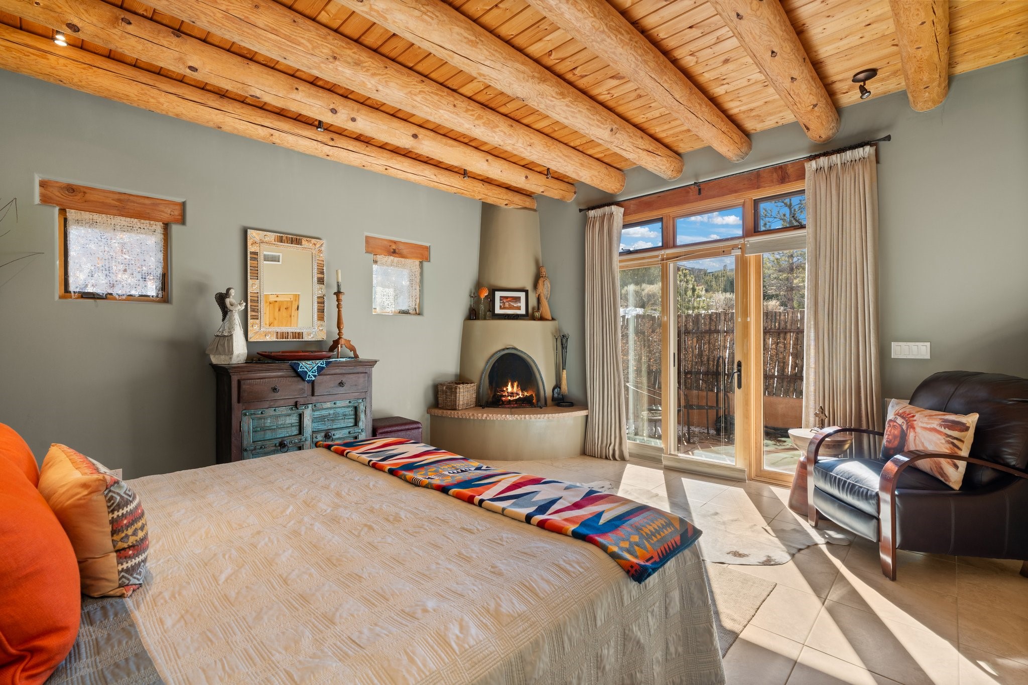 Experience breathtaking vistas of the Jemez mountains and stunning sunsets from this freestanding, 2 bedroom, 2 bath, single level villa. Just a few short minutes north of the historic Santa Fe Plaza, fine art galleries, museums, and world-class dining. Nestled at the base of the Sangre de Cristo Mountains in the exclusive Bishops Lodge Villas gated community, adjacent to the Santa Fe National Forest, offering abundant hiking, biking and walking trails and endless other four-season recreational activities. Featuring an open concept floor plan with high ceilings, traditional vigas, hand-troweled plaster walls, and central a/c, the villa includes two spacious suites, each with a kiva fireplace and private outdoor patio. One of the suites also has a steam shower and jetted tub. Meticulously maintained including new stucco and a 9-year roof warranty. Residents enjoy access to two shared villas pools and can make arrangements to utilize the unparalleled amenities of the world-renowned Bishops Lodge Resort by Auberge, making it an ideal retreat to entertain family and friends. Furnishings package is available.